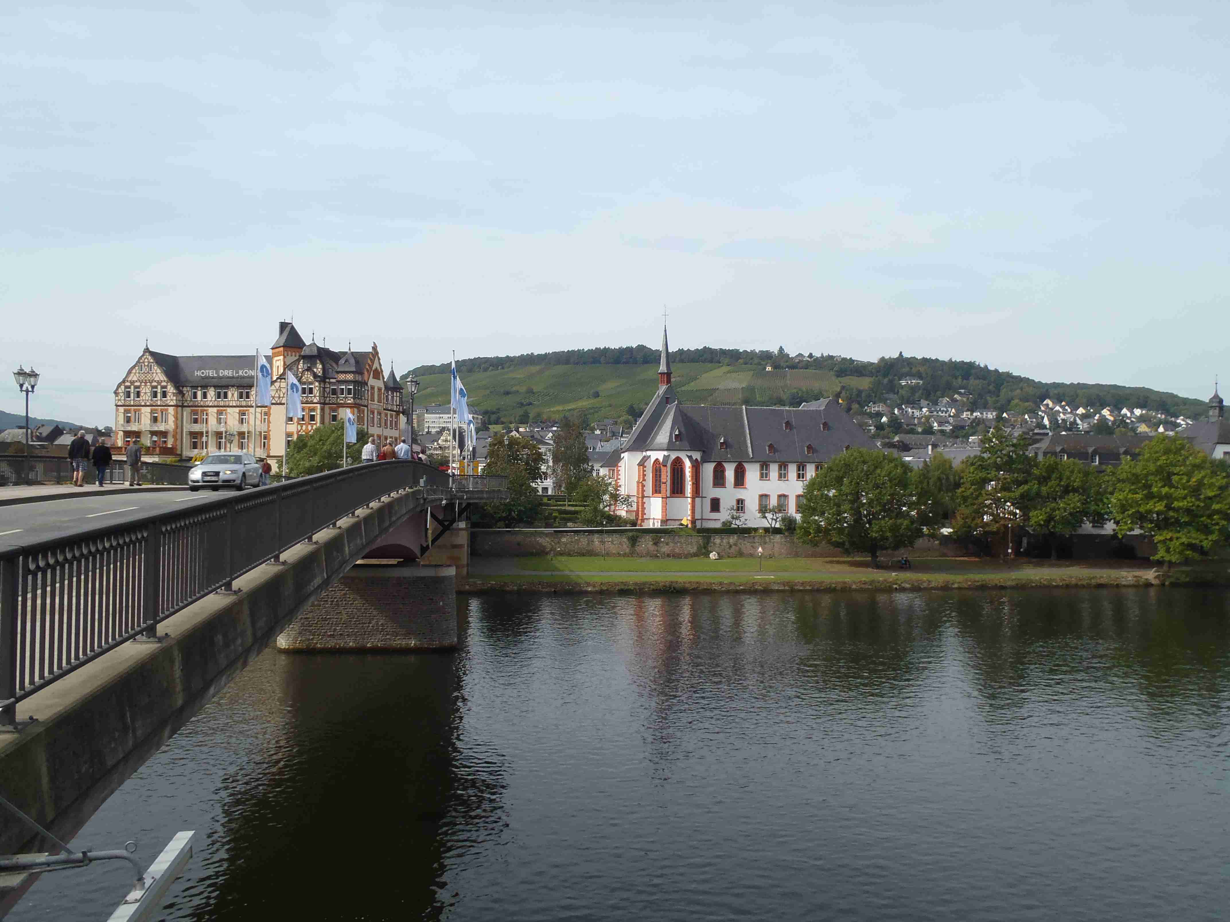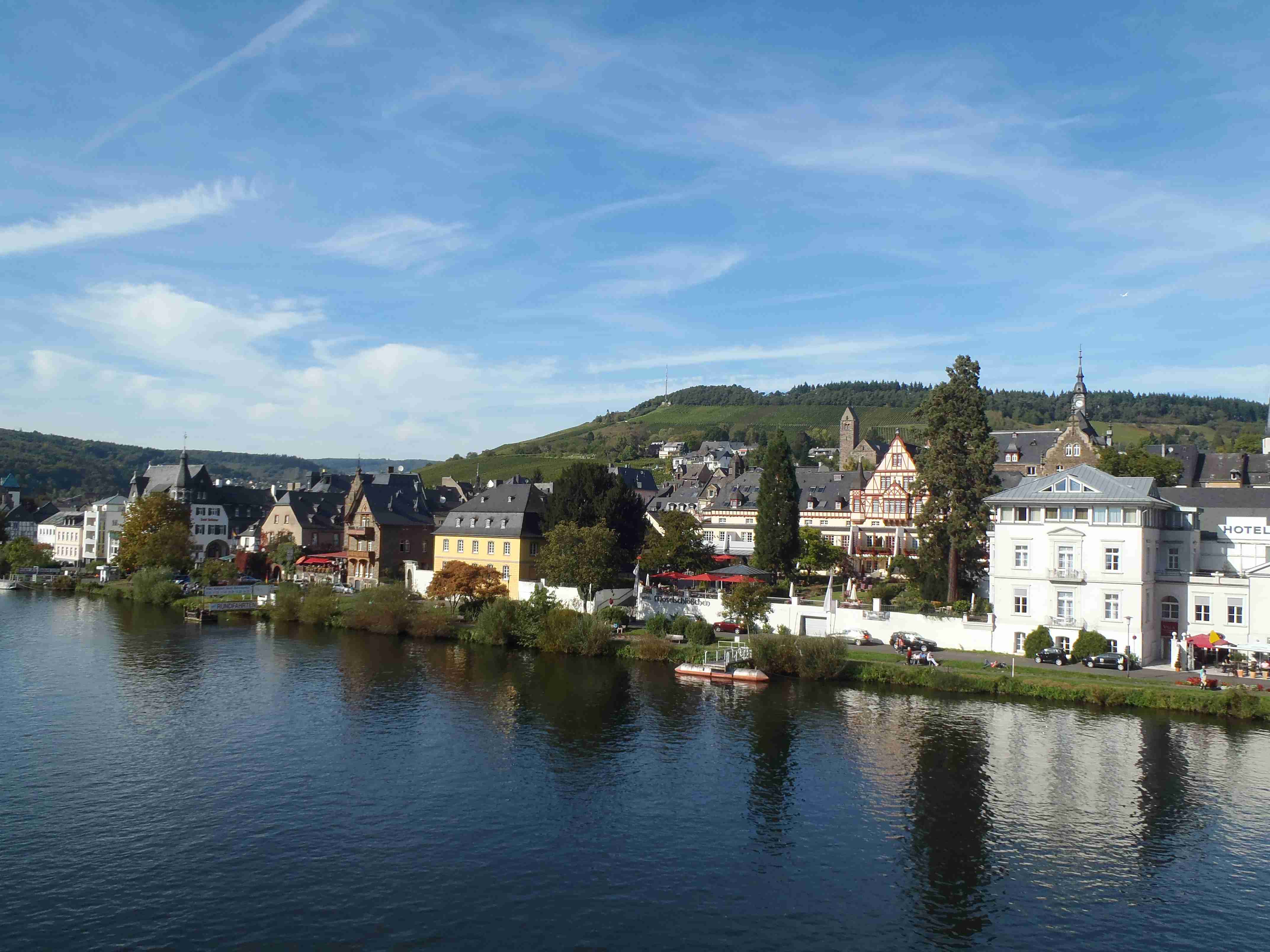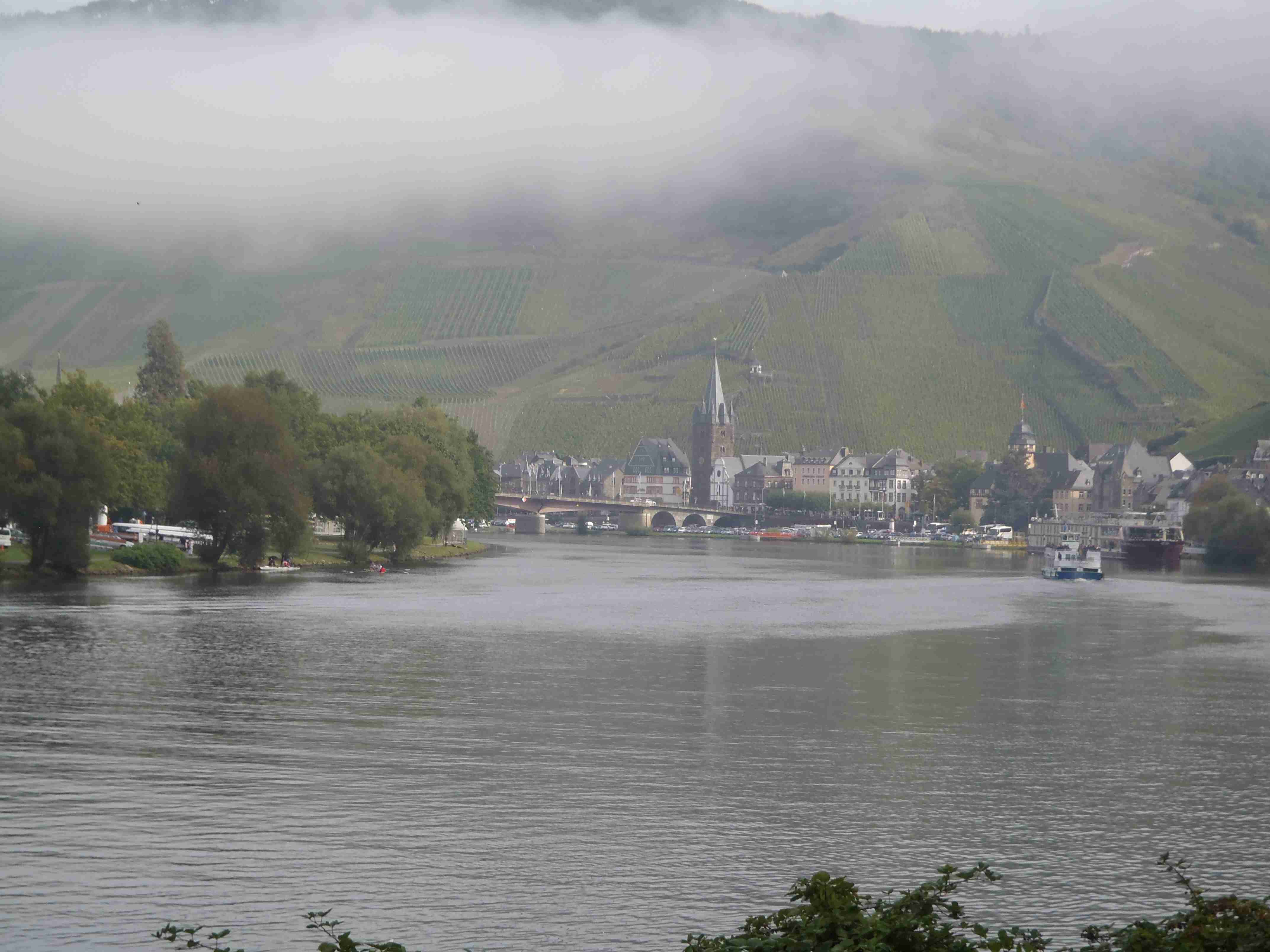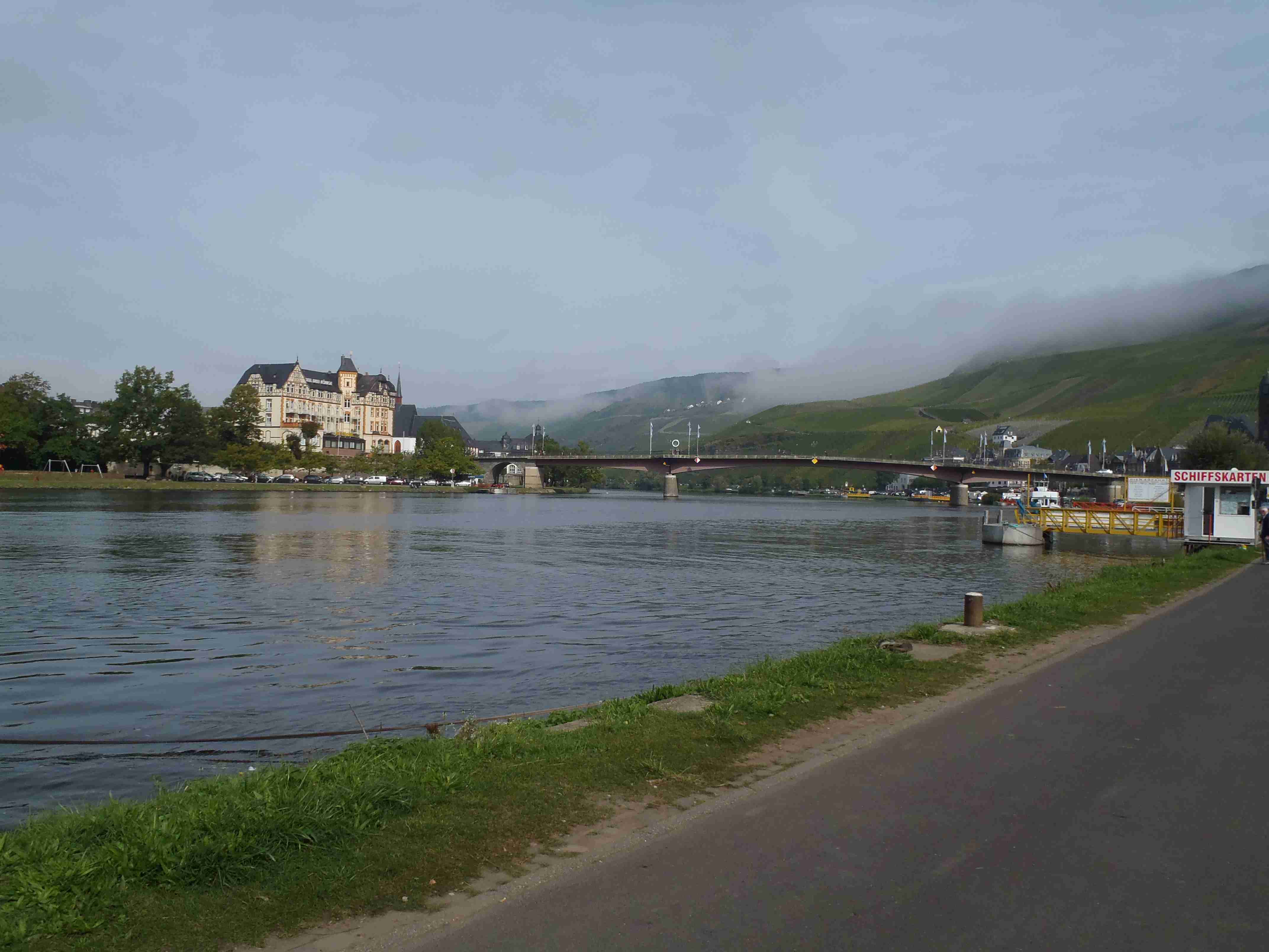 Rozvrh stejný jako včera, snídaně byla v přízemí našeho penzionu. Kolem čtvrt na jedenáct jsme vyrazili od penzionu opět na Brauneberg, kde vinobraní ještě pokračovalo a tak jsme museli sesednout z kol (vinobraní totiž probíhalo v místě cyklostezkyL) a opětovně to projít pěšky. Na mnoha lidech bylo vidět, že ještě nešli spát. Zhruba první hodinu cesty byla mlha, ale postupně se rozplývala a opětovně vylezlo sluníčko. Projeli jsme obcí Andel a před polednem jsme dojeli do dvojměstí Bernkastel-Kues, kde především prvně jmenované místo je opravdu historické – spousta hrázděných domů; ty však spíše svědčí o někdejší relativní chudosti a naopak převážně kamenné domy v dalším městě Trarbach jsou pak důkazem bohatství. Bernkastel jsme si prošli, nafotili, dali si na náměstíčku víno a poté jsme přejeli po mostě na druhou stranu do části Kues do areálu hospice sv.Mikuláše, kde je mimo funkčního hospice i rozsáhlá vinotéka, kterou jsme si prohlédli. Chutě jsme si nechali zajít, neboť nás přeci jenom ještě pár kilometrů čekalo. Po půl druhé jsme se vrátili zpět na pravý břeh a pokračovali jsme v cestě podél řeky obklopeni vinicemi. Kolem půl čtvrté jsme dorazili do dvojměstí Traben-Trarbach, kde jsme se u brány na most posadili ve dvoře a dali si Federweisser, neboť do cíle zbývalo již jenom pár kilometrů. Po občerstvovací pauze jsme přejeli přes most na levý břeh a se zastávkou u zdymadel jsme pokračovali až do obce Kövenig, kde jsme přívozem přejeli na druhou stranu do Enkirchu – bylo to takové malé zpestření pro ty, co chtěli. Ubytováni jsme byli v hotelu Loosen, který zabíral snad polovinu domů v ulici. Tentokrát jsme vyfasovali poslední patro bez výtahu, byl to ale regulérní podkrovní byt, plně vybavený – zase škoda, že jenom na jednu noc. Ubytovali jsme se kolem půl šesté, v nohách cca 45 km, rychle hygienu a dolu do dvora na večeři – naše první teplé jídlo. Poseděli jsme s Luborem, mechanikem Karlem a dalšími kolegy, jídlo jsme měli objednané od rána – Iva guláš s kroketami a já cikánský řízek s hranolky, oboje se salátem. Tentokrát jsem si dal pivo, Iva víno. Poseděli jsme asi do 21:00, odcházeli jsme pomalu jako poslední – žádná veselice.