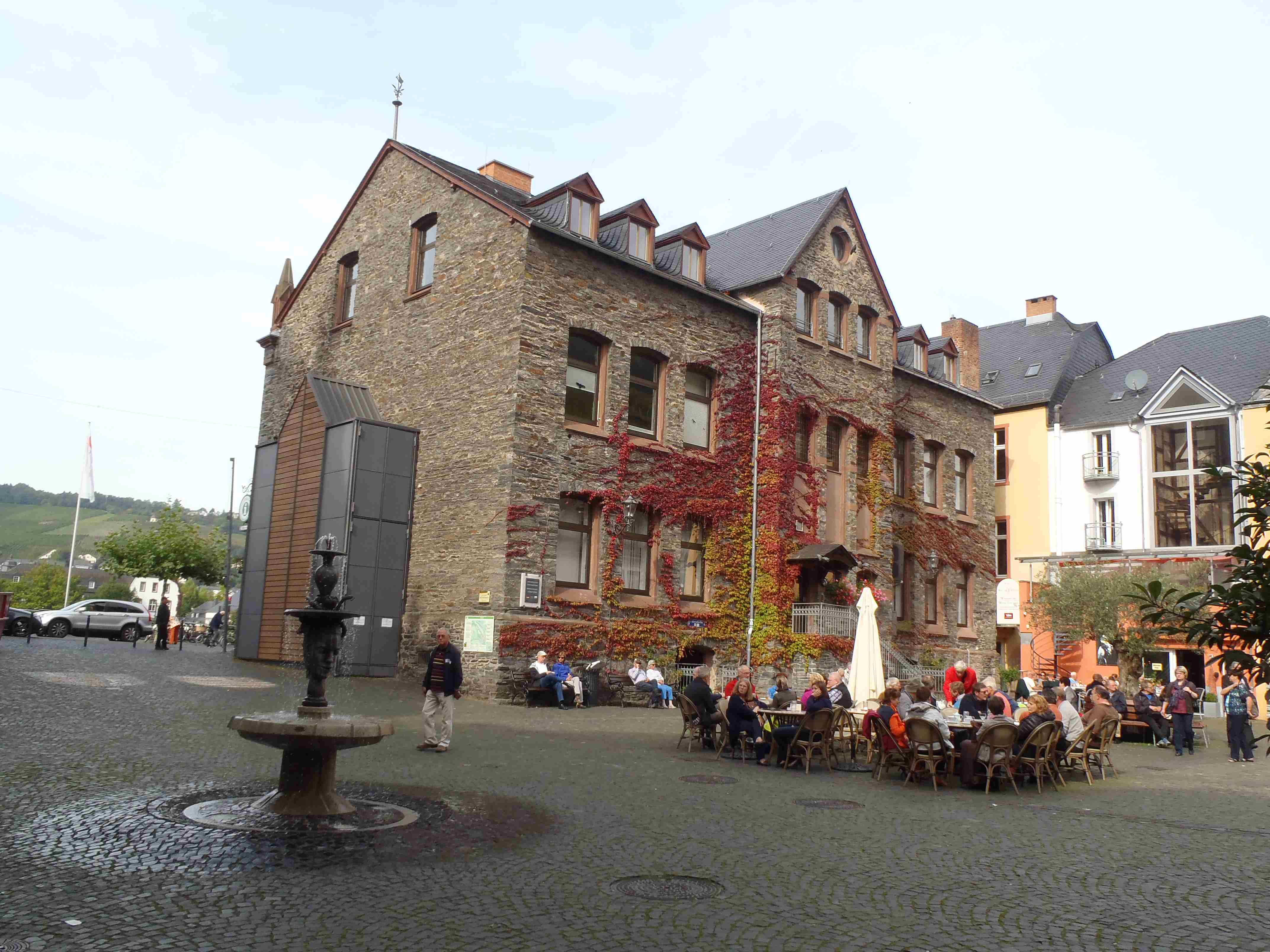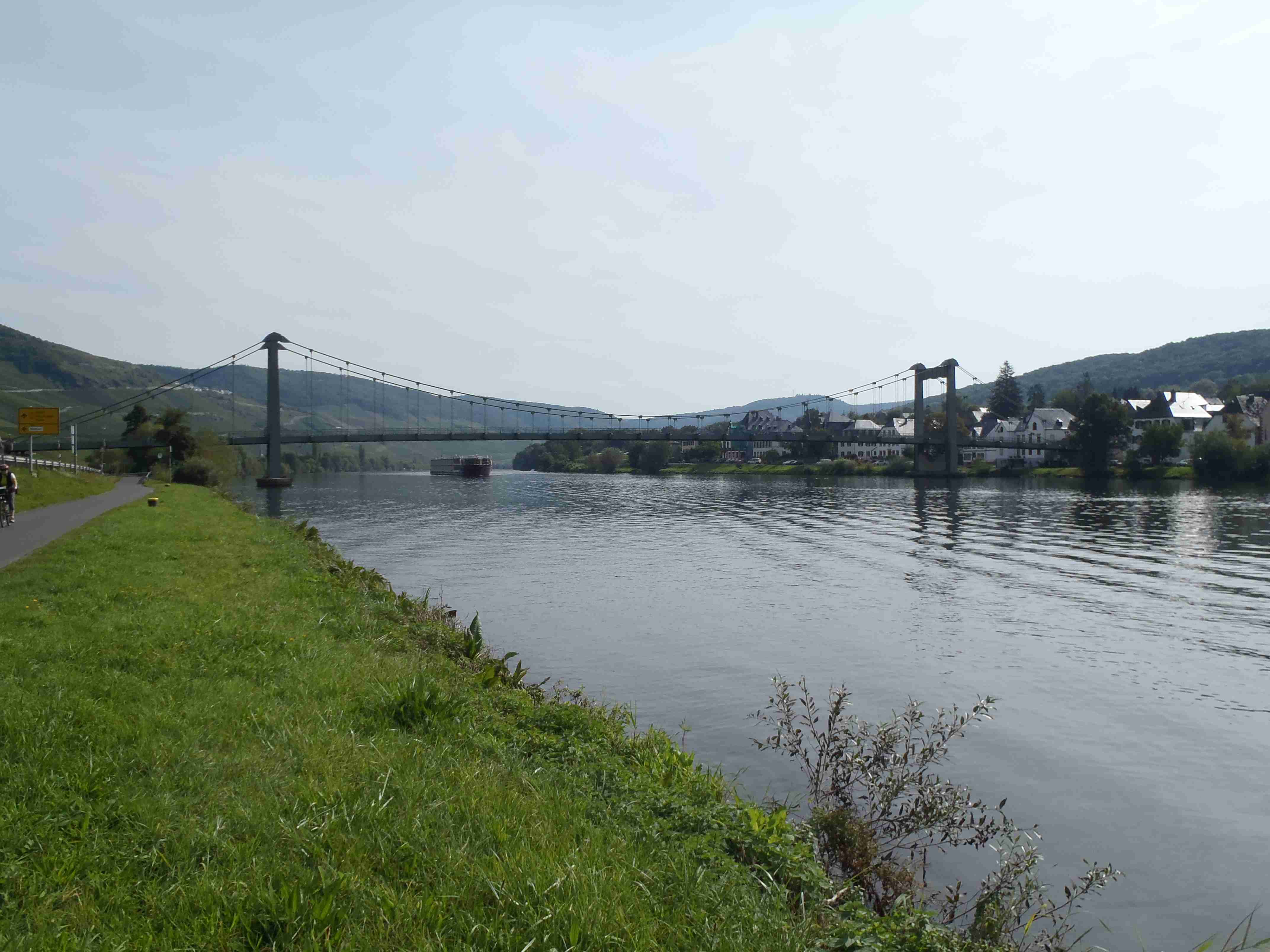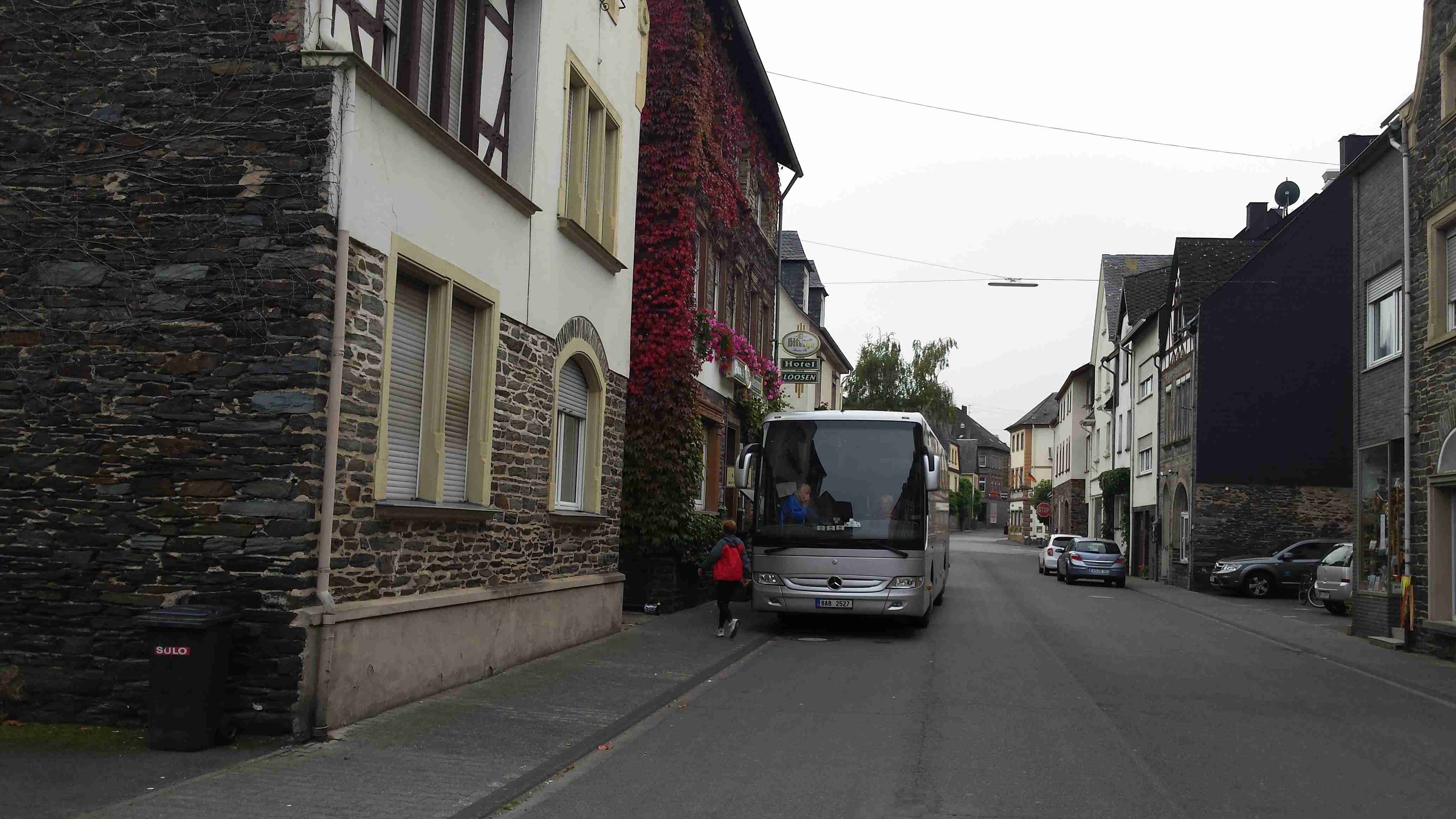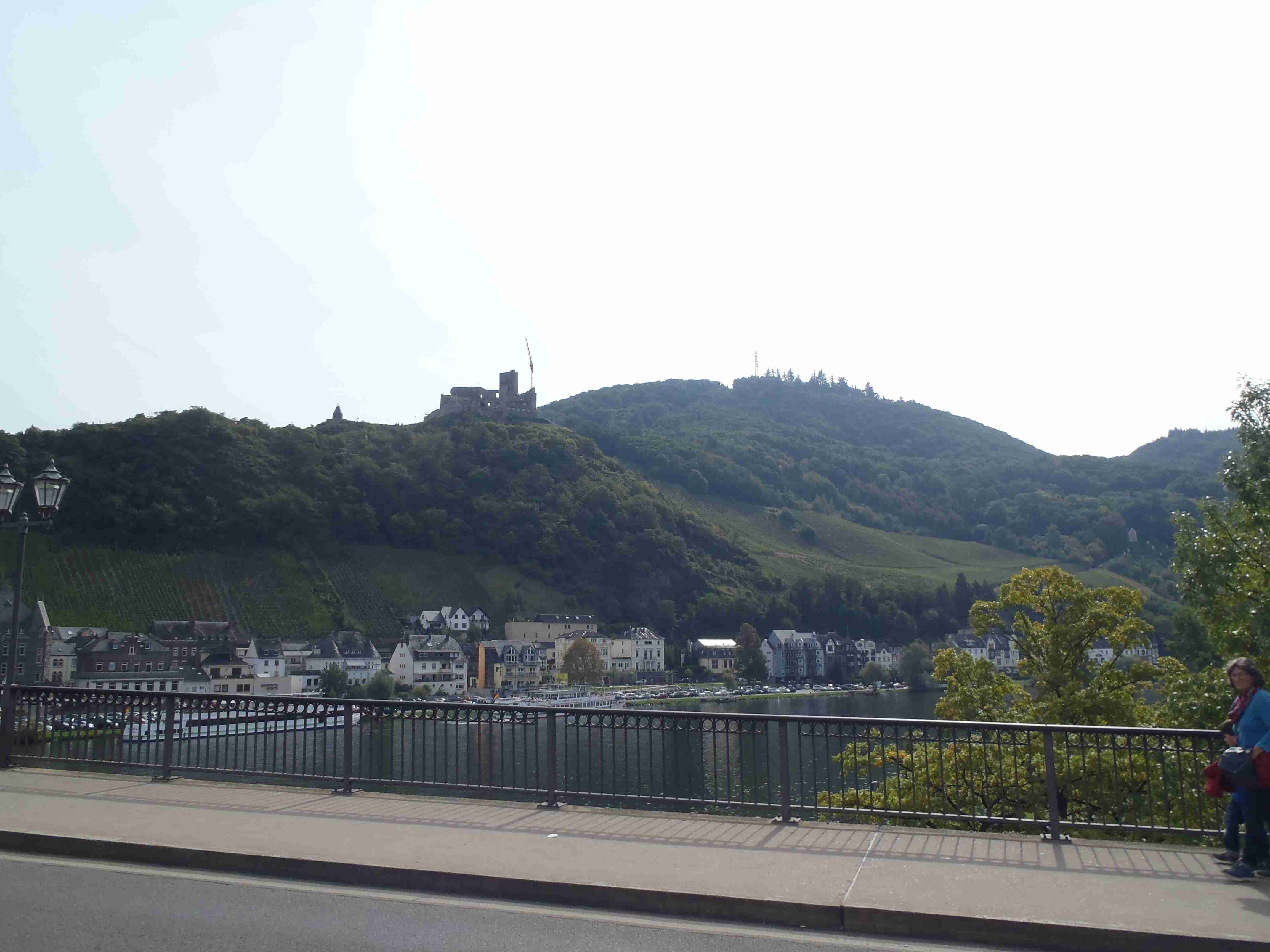 Rozvrh stejný jako včera, snídaně byla v přízemí našeho penzionu. Kolem čtvrt na jedenáct jsme vyrazili od penzionu opět na Brauneberg, kde vinobraní ještě pokračovalo a tak jsme museli sesednout z kol (vinobraní totiž probíhalo v místě cyklostezkyL) a opětovně to projít pěšky. Na mnoha lidech bylo vidět, že ještě nešli spát. Zhruba první hodinu cesty byla mlha, ale postupně se rozplývala a opětovně vylezlo sluníčko. Projeli jsme obcí Andel a před polednem jsme dojeli do dvojměstí Bernkastel-Kues, kde především prvně jmenované místo je opravdu historické – spousta hrázděných domů; ty však spíše svědčí o někdejší relativní chudosti a naopak převážně kamenné domy v dalším městě Trarbach jsou pak důkazem bohatství. Bernkastel jsme si prošli, nafotili, dali si na náměstíčku víno a poté jsme přejeli po mostě na druhou stranu do části Kues do areálu hospice sv.Mikuláše, kde je mimo funkčního hospice i rozsáhlá vinotéka, kterou jsme si prohlédli. Chutě jsme si nechali zajít, neboť nás přeci jenom ještě pár kilometrů čekalo. Po půl druhé jsme se vrátili zpět na pravý břeh a pokračovali jsme v cestě podél řeky obklopeni vinicemi. Kolem půl čtvrté jsme dorazili do dvojměstí Traben-Trarbach, kde jsme se u brány na most posadili ve dvoře a dali si Federweisser, neboť do cíle zbývalo již jenom pár kilometrů. Po občerstvovací pauze jsme přejeli přes most na levý břeh a se zastávkou u zdymadel jsme pokračovali až do obce Kövenig, kde jsme přívozem přejeli na druhou stranu do Enkirchu – bylo to takové malé zpestření pro ty, co chtěli. Ubytováni jsme byli v hotelu Loosen, který zabíral snad polovinu domů v ulici. Tentokrát jsme vyfasovali poslední patro bez výtahu, byl to ale regulérní podkrovní byt, plně vybavený – zase škoda, že jenom na jednu noc. Ubytovali jsme se kolem půl šesté, v nohách cca 45 km, rychle hygienu a dolu do dvora na večeři – naše první teplé jídlo. Poseděli jsme s Luborem, mechanikem Karlem a dalšími kolegy, jídlo jsme měli objednané od rána – Iva guláš s kroketami a já cikánský řízek s hranolky, oboje se salátem. Tentokrát jsem si dal pivo, Iva víno. Poseděli jsme asi do 21:00, odcházeli jsme pomalu jako poslední – žádná veselice.