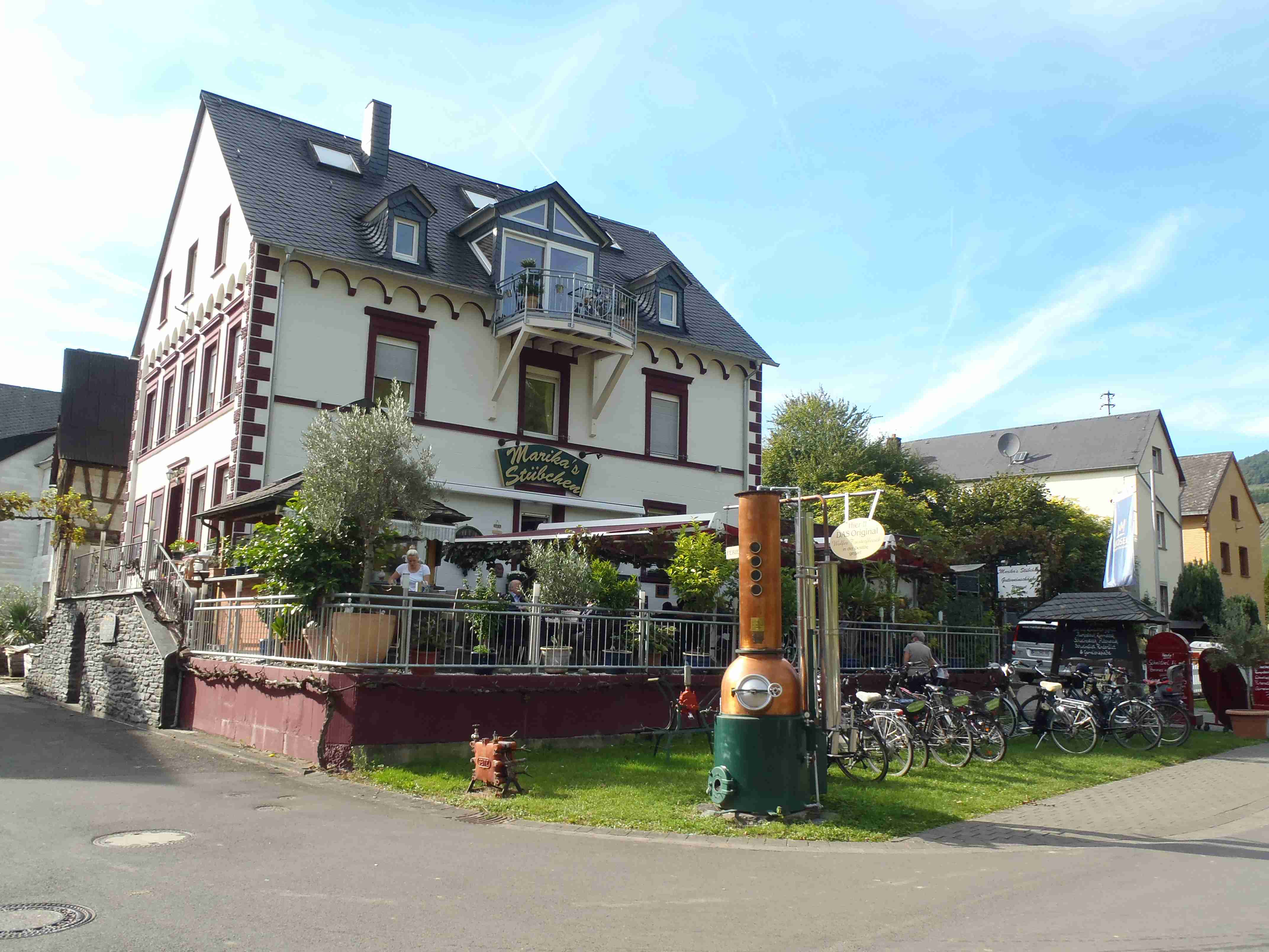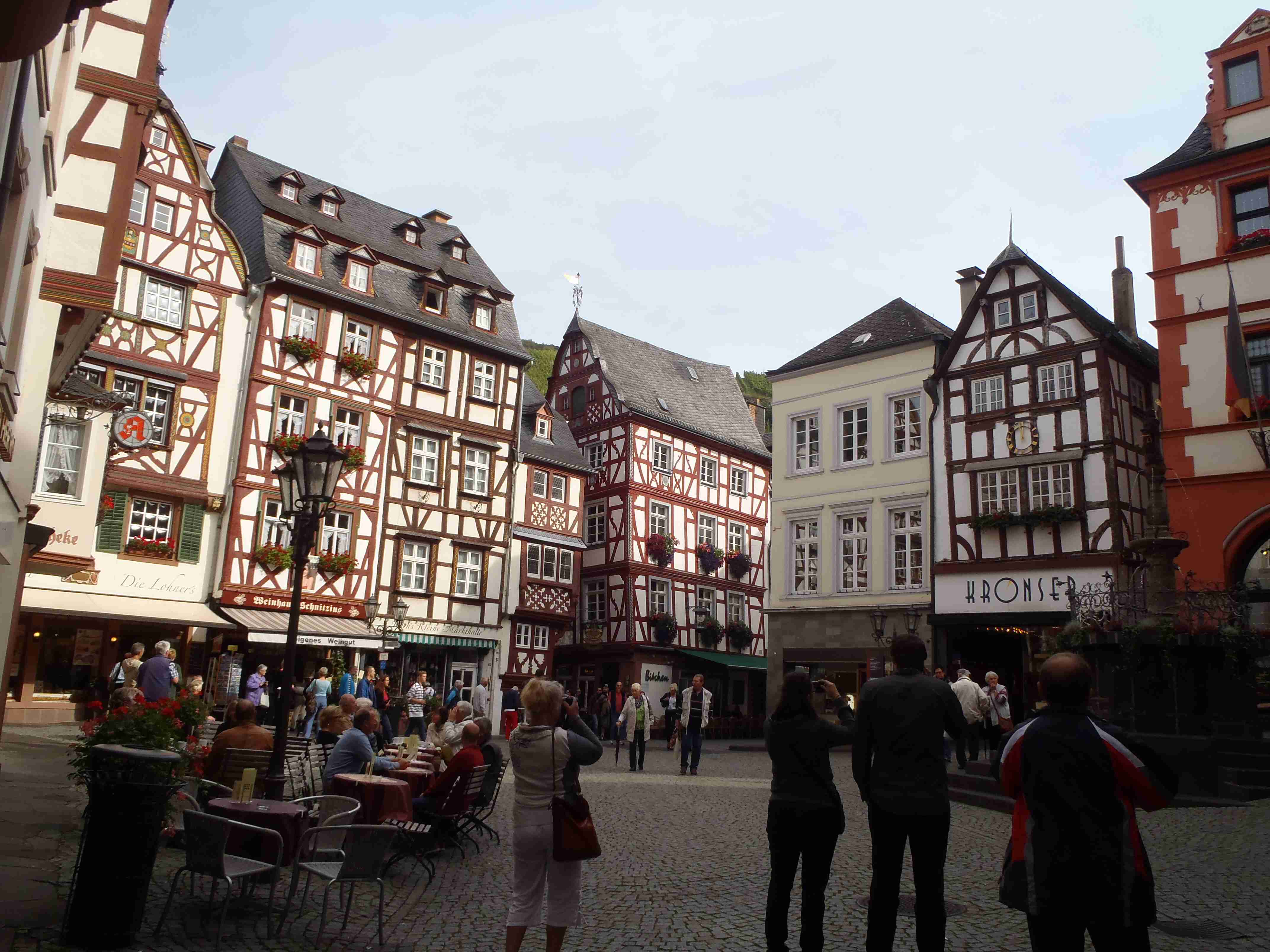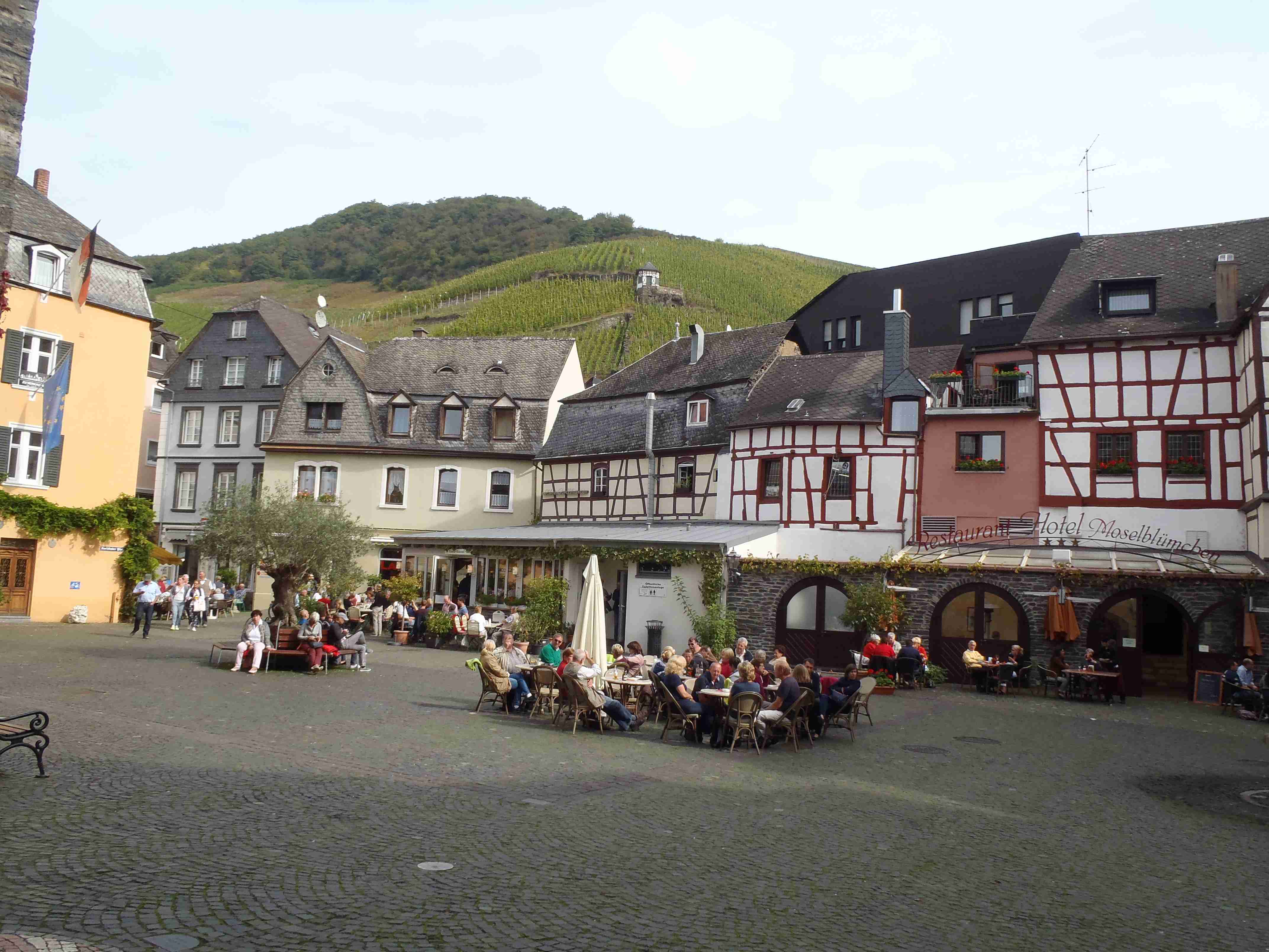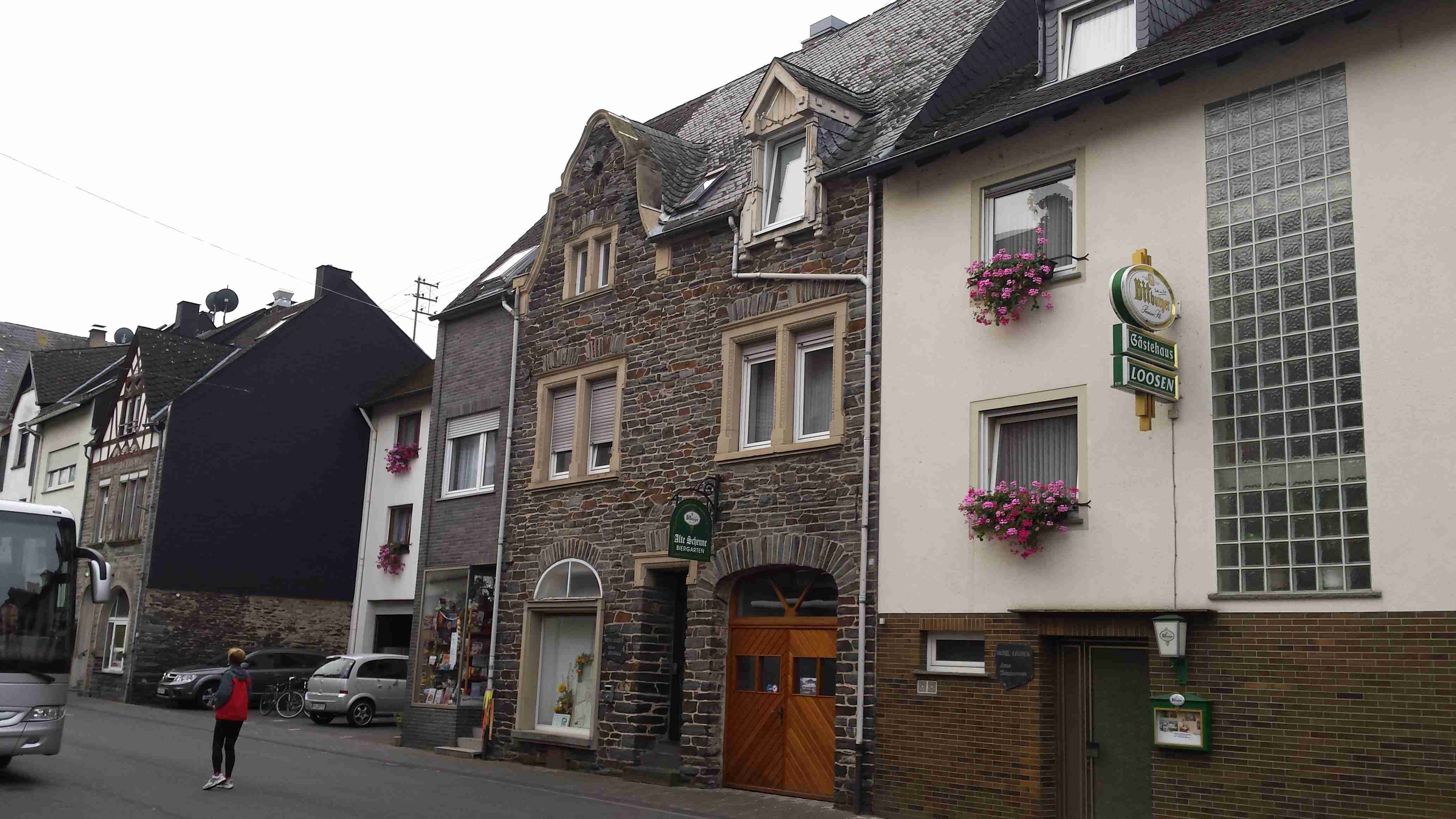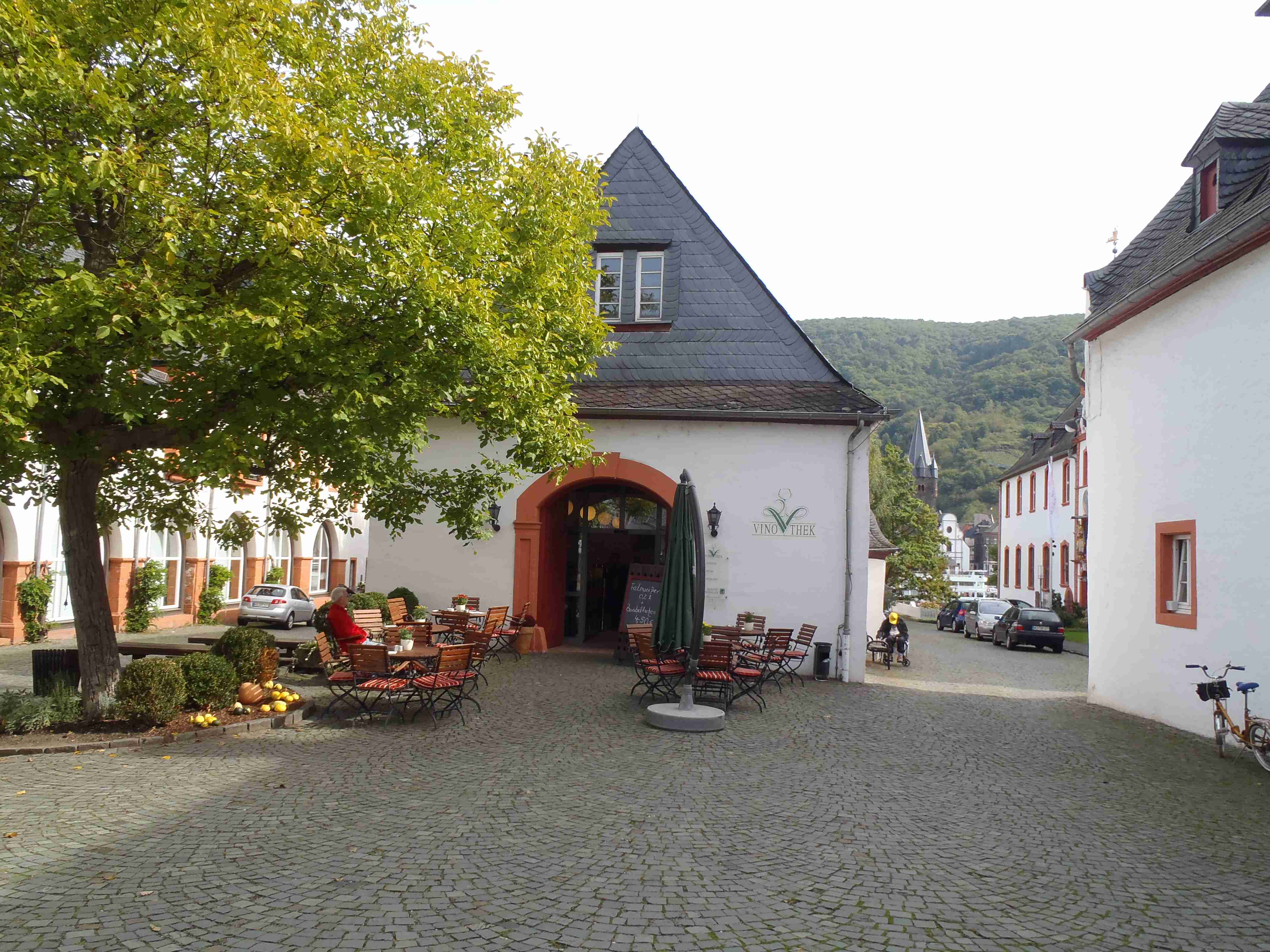 Rozvrh stejný jako včera, snídaně byla v přízemí našeho penzionu. Kolem čtvrt na jedenáct jsme vyrazili od penzionu opět na Brauneberg, kde vinobraní ještě pokračovalo a tak jsme museli sesednout z kol (vinobraní totiž probíhalo v místě cyklostezkyL) a opětovně to projít pěšky. Na mnoha lidech bylo vidět, že ještě nešli spát. Zhruba první hodinu cesty byla mlha, ale postupně se rozplývala a opětovně vylezlo sluníčko. Projeli jsme obcí Andel a před polednem jsme dojeli do dvojměstí Bernkastel-Kues, kde především prvně jmenované místo je opravdu historické – spousta hrázděných domů; ty však spíše svědčí o někdejší relativní chudosti a naopak převážně kamenné domy v dalším městě Trarbach jsou pak důkazem bohatství. Bernkastel jsme si prošli, nafotili, dali si na náměstíčku víno a poté jsme přejeli po mostě na druhou stranu do části Kues do areálu hospice sv.Mikuláše, kde je mimo funkčního hospice i rozsáhlá vinotéka, kterou jsme si prohlédli. Chutě jsme si nechali zajít, neboť nás přeci jenom ještě pár kilometrů čekalo. Po půl druhé jsme se vrátili zpět na pravý břeh a pokračovali jsme v cestě podél řeky obklopeni vinicemi. Kolem půl čtvrté jsme dorazili do dvojměstí Traben-Trarbach, kde jsme se u brány na most posadili ve dvoře a dali si Federweisser, neboť do cíle zbývalo již jenom pár kilometrů. Po občerstvovací pauze jsme přejeli přes most na levý břeh a se zastávkou u zdymadel jsme pokračovali až do obce Kövenig, kde jsme přívozem přejeli na druhou stranu do Enkirchu – bylo to takové malé zpestření pro ty, co chtěli. Ubytováni jsme byli v hotelu Loosen, který zabíral snad polovinu domů v ulici. Tentokrát jsme vyfasovali poslední patro bez výtahu, byl to ale regulérní podkrovní byt, plně vybavený – zase škoda, že jenom na jednu noc. Ubytovali jsme se kolem půl šesté, v nohách cca 45 km, rychle hygienu a dolu do dvora na večeři – naše první teplé jídlo. Poseděli jsme s Luborem, mechanikem Karlem a dalšími kolegy, jídlo jsme měli objednané od rána – Iva guláš s kroketami a já cikánský řízek s hranolky, oboje se salátem. Tentokrát jsem si dal pivo, Iva víno. Poseděli jsme asi do 21:00, odcházeli jsme pomalu jako poslední – žádná veselice.
