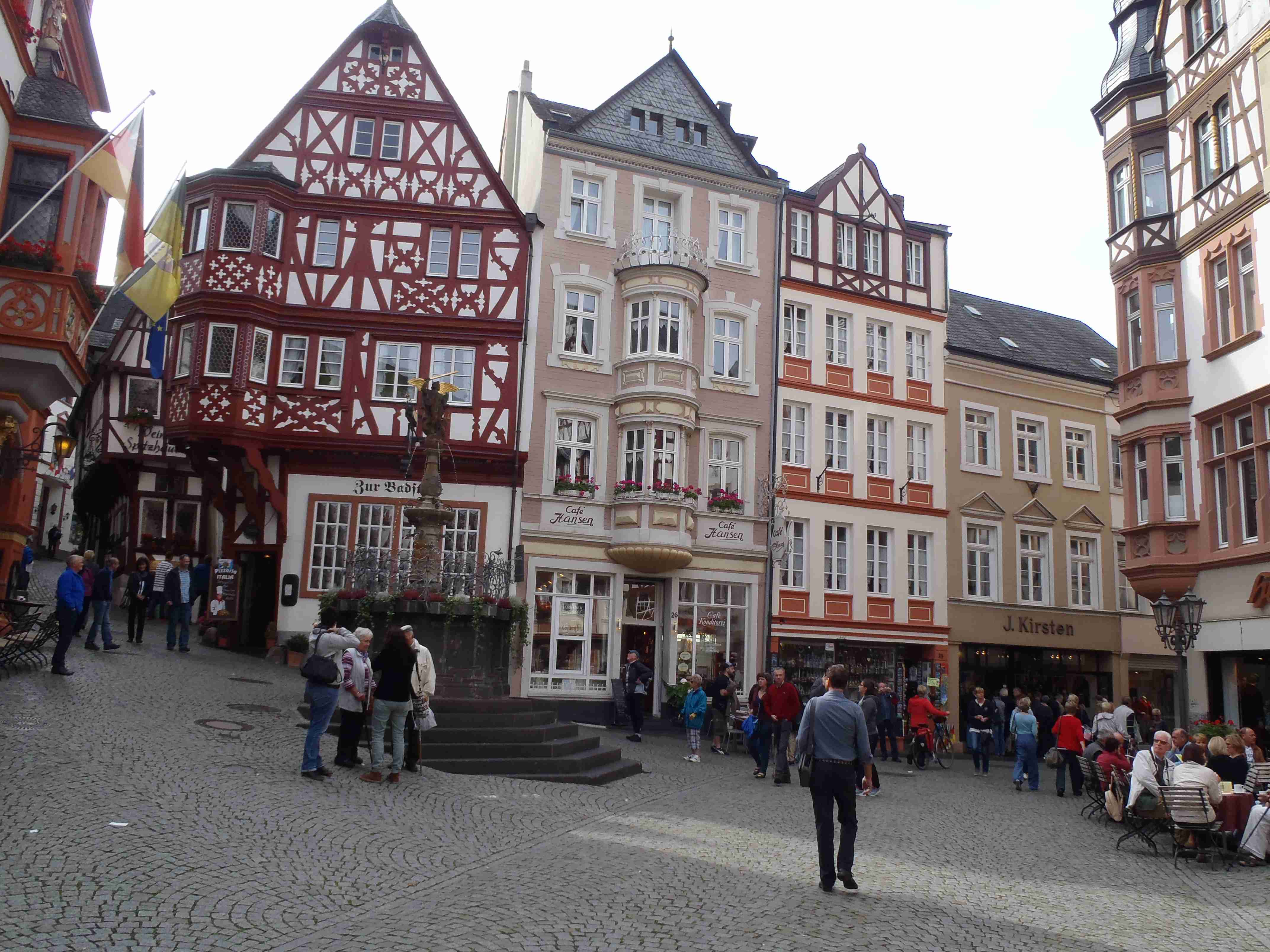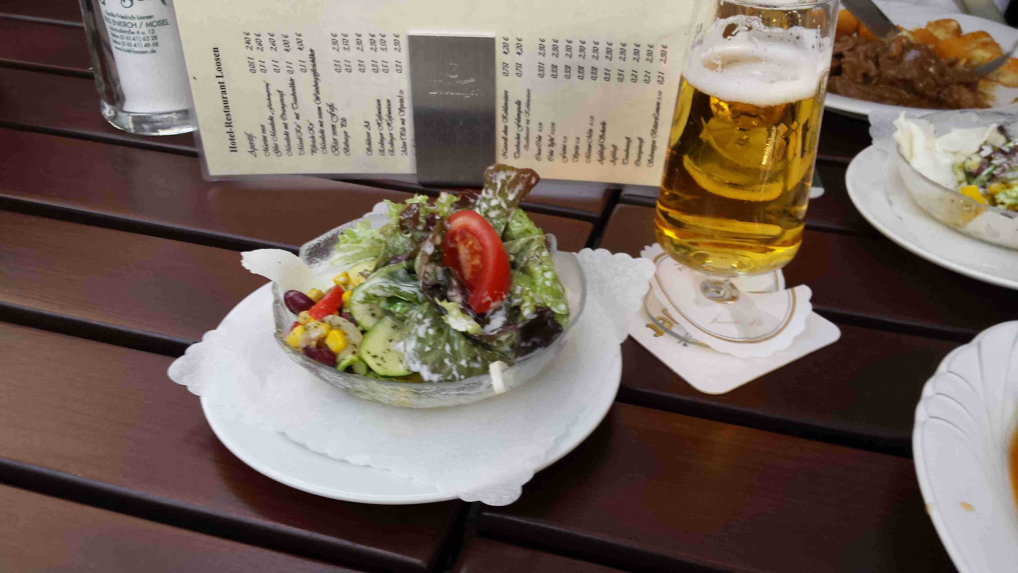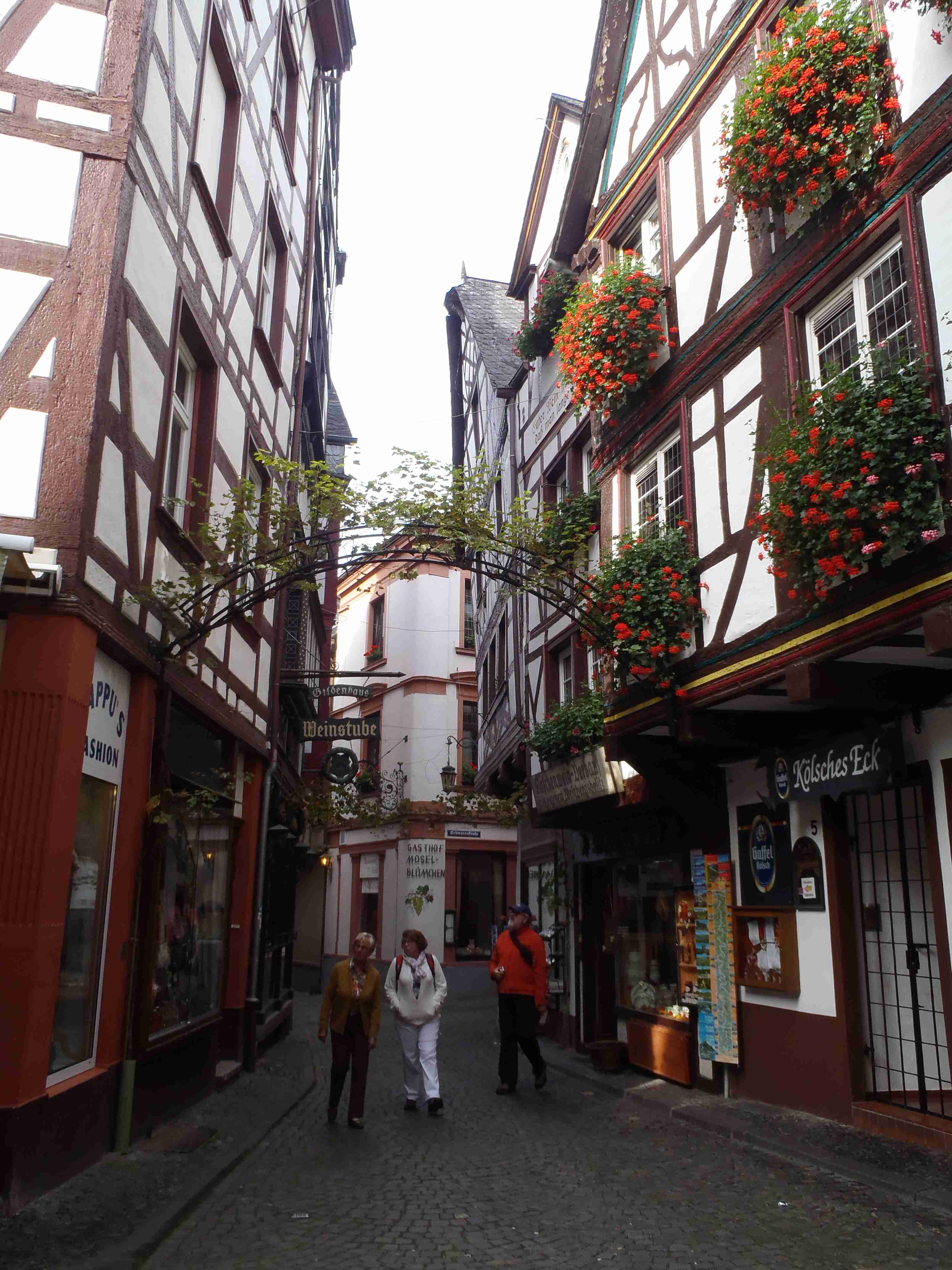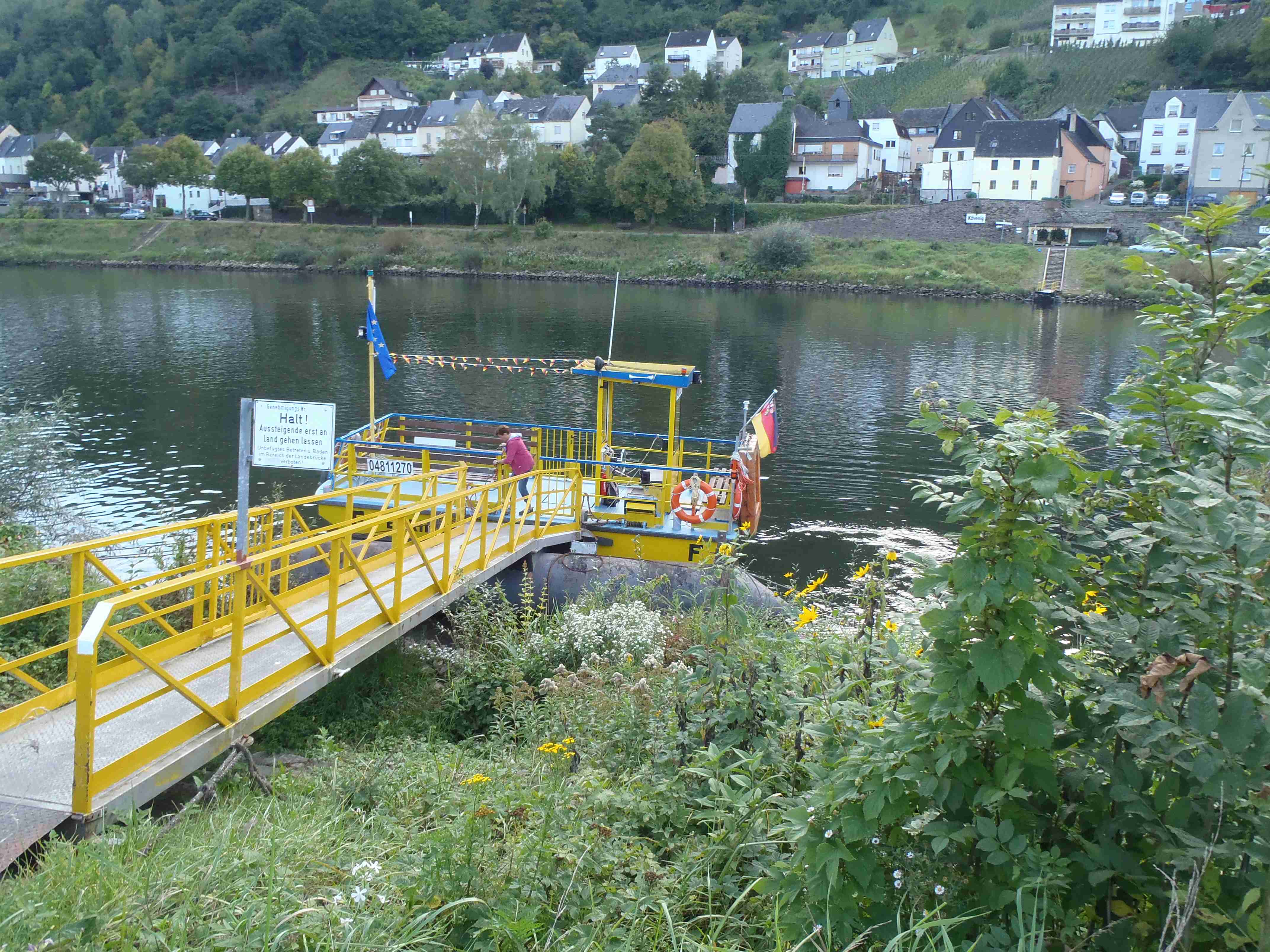 Rozvrh stejný jako včera, snídaně byla v přízemí našeho penzionu. Kolem čtvrt na jedenáct jsme vyrazili od penzionu opět na Brauneberg, kde vinobraní ještě pokračovalo a tak jsme museli sesednout z kol (vinobraní totiž probíhalo v místě cyklostezkyL) a opětovně to projít pěšky. Na mnoha lidech bylo vidět, že ještě nešli spát. Zhruba první hodinu cesty byla mlha, ale postupně se rozplývala a opětovně vylezlo sluníčko. Projeli jsme obcí Andel a před polednem jsme dojeli do dvojměstí Bernkastel-Kues, kde především prvně jmenované místo je opravdu historické – spousta hrázděných domů; ty však spíše svědčí o někdejší relativní chudosti a naopak převážně kamenné domy v dalším městě Trarbach jsou pak důkazem bohatství. Bernkastel jsme si prošli, nafotili, dali si na náměstíčku víno a poté jsme přejeli po mostě na druhou stranu do části Kues do areálu hospice sv.Mikuláše, kde je mimo funkčního hospice i rozsáhlá vinotéka, kterou jsme si prohlédli. Chutě jsme si nechali zajít, neboť nás přeci jenom ještě pár kilometrů čekalo. Po půl druhé jsme se vrátili zpět na pravý břeh a pokračovali jsme v cestě podél řeky obklopeni vinicemi. Kolem půl čtvrté jsme dorazili do dvojměstí Traben-Trarbach, kde jsme se u brány na most posadili ve dvoře a dali si Federweisser, neboť do cíle zbývalo již jenom pár kilometrů. Po občerstvovací pauze jsme přejeli přes most na levý břeh a se zastávkou u zdymadel jsme pokračovali až do obce Kövenig, kde jsme přívozem přejeli na druhou stranu do Enkirchu – bylo to takové malé zpestření pro ty, co chtěli. Ubytováni jsme byli v hotelu Loosen, který zabíral snad polovinu domů v ulici. Tentokrát jsme vyfasovali poslední patro bez výtahu, byl to ale regulérní podkrovní byt, plně vybavený – zase škoda, že jenom na jednu noc. Ubytovali jsme se kolem půl šesté, v nohách cca 45 km, rychle hygienu a dolu do dvora na večeři – naše první teplé jídlo. Poseděli jsme s Luborem, mechanikem Karlem a dalšími kolegy, jídlo jsme měli objednané od rána – Iva guláš s kroketami a já cikánský řízek s hranolky, oboje se salátem. Tentokrát jsem si dal pivo, Iva víno. Poseděli jsme asi do 21:00, odcházeli jsme pomalu jako poslední – žádná veselice.