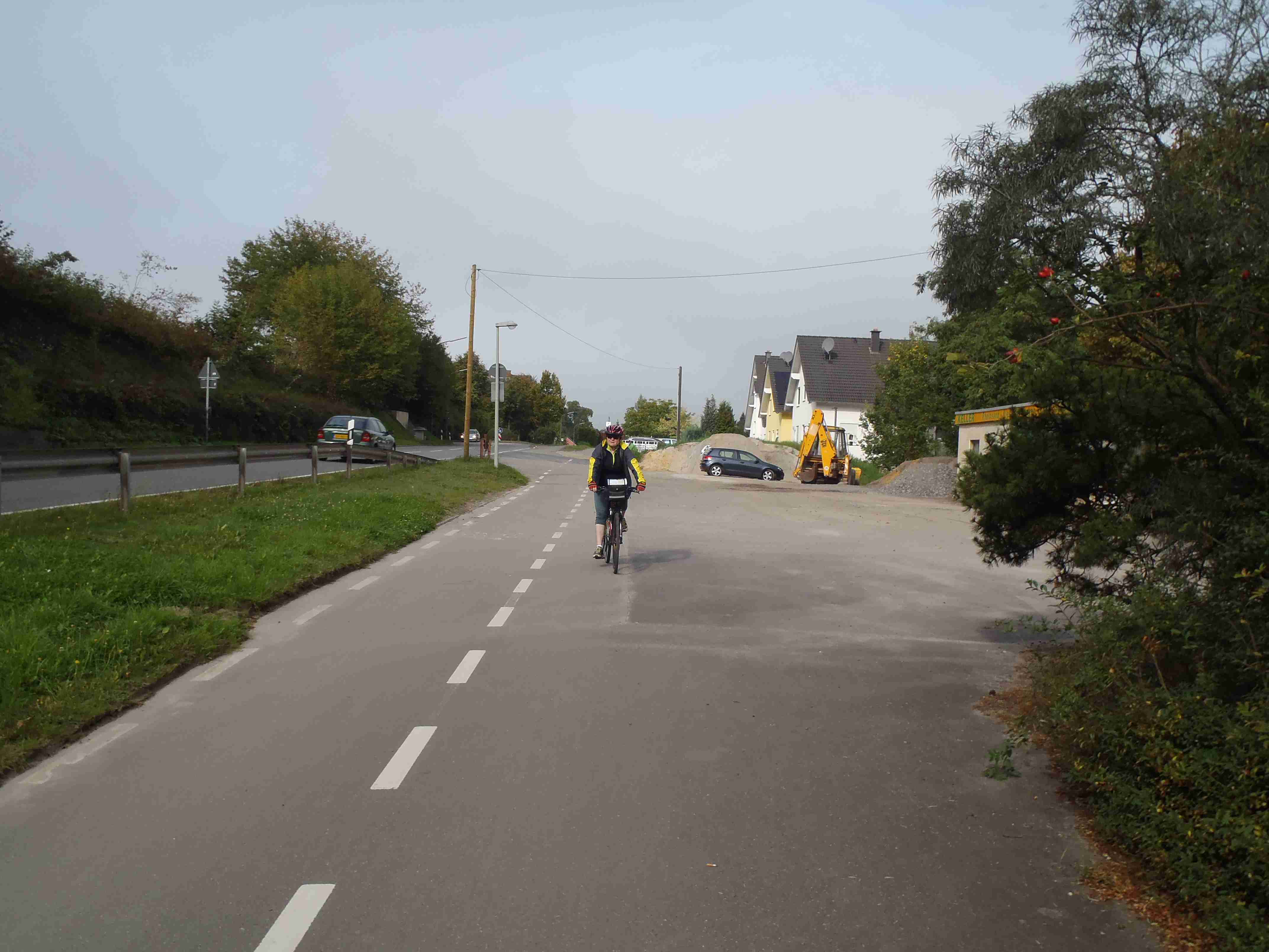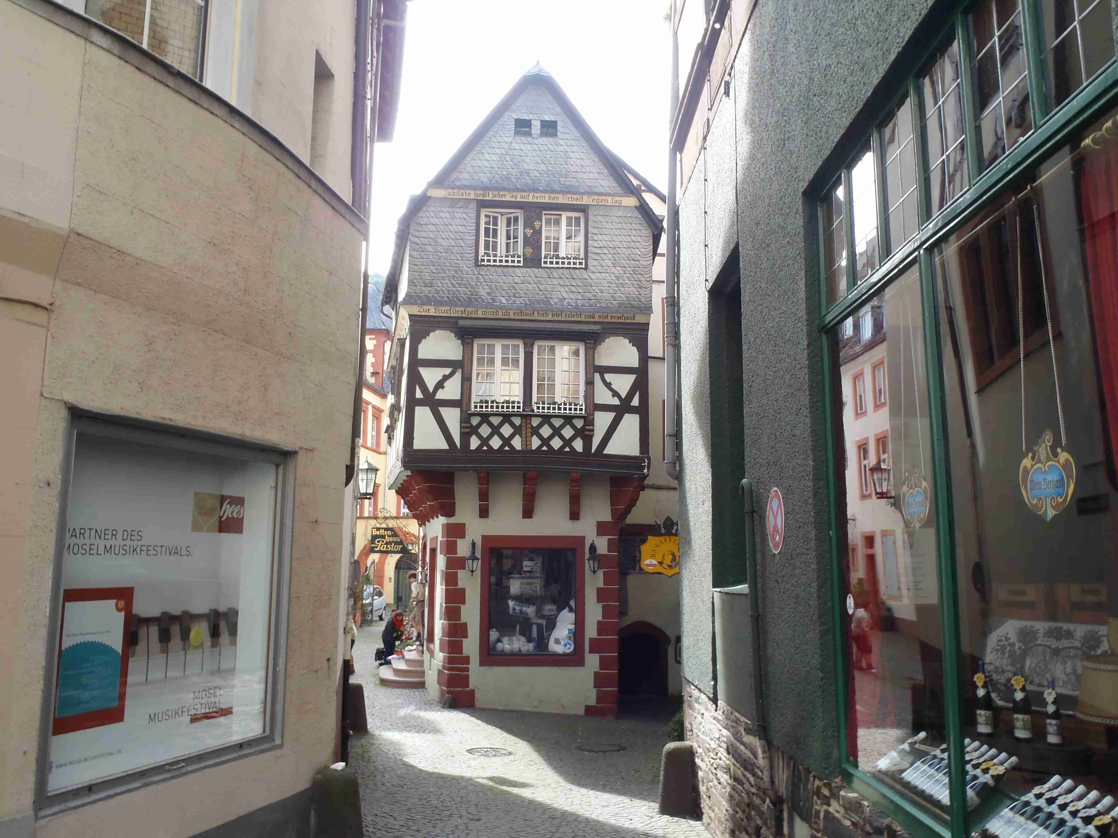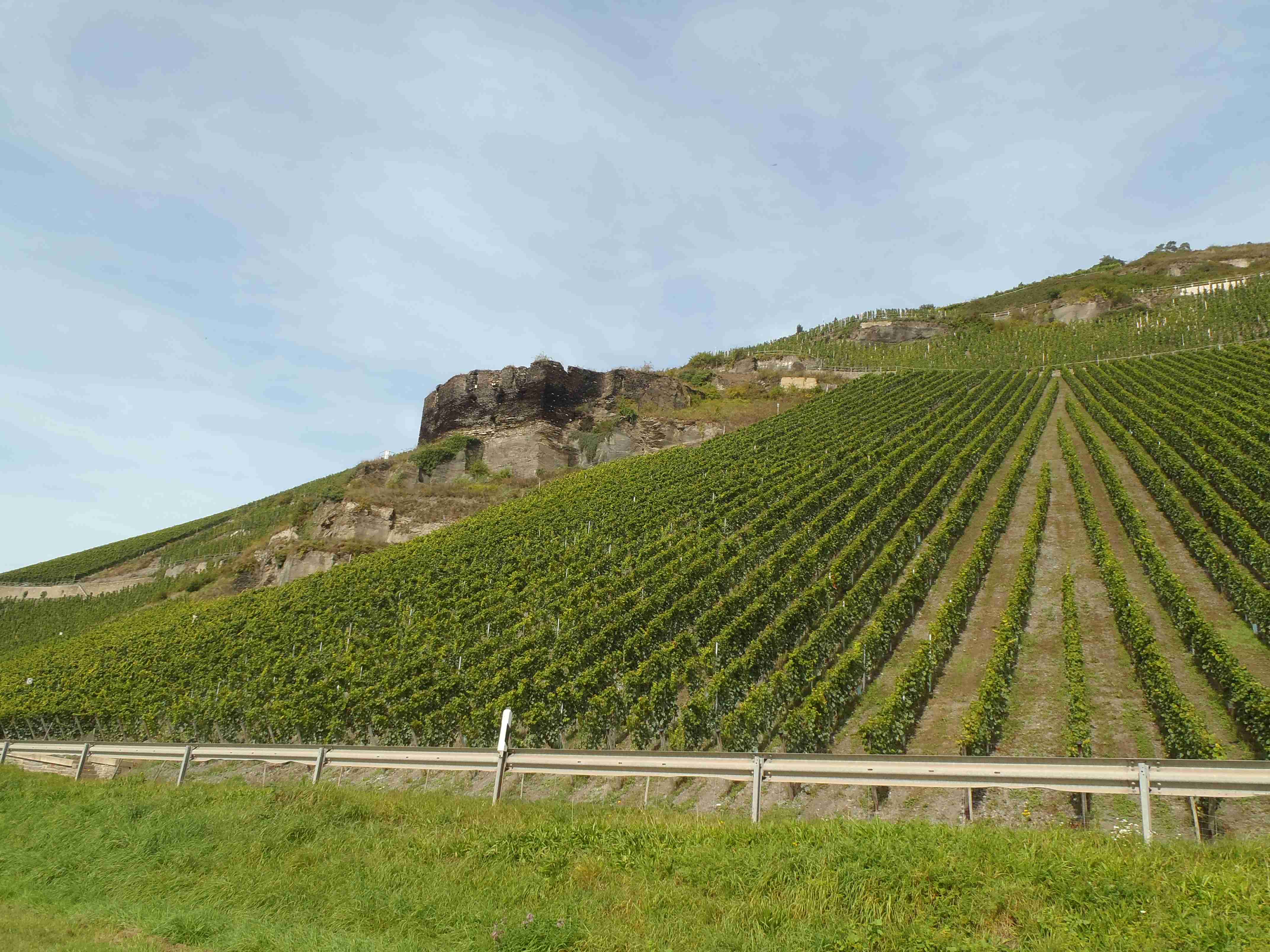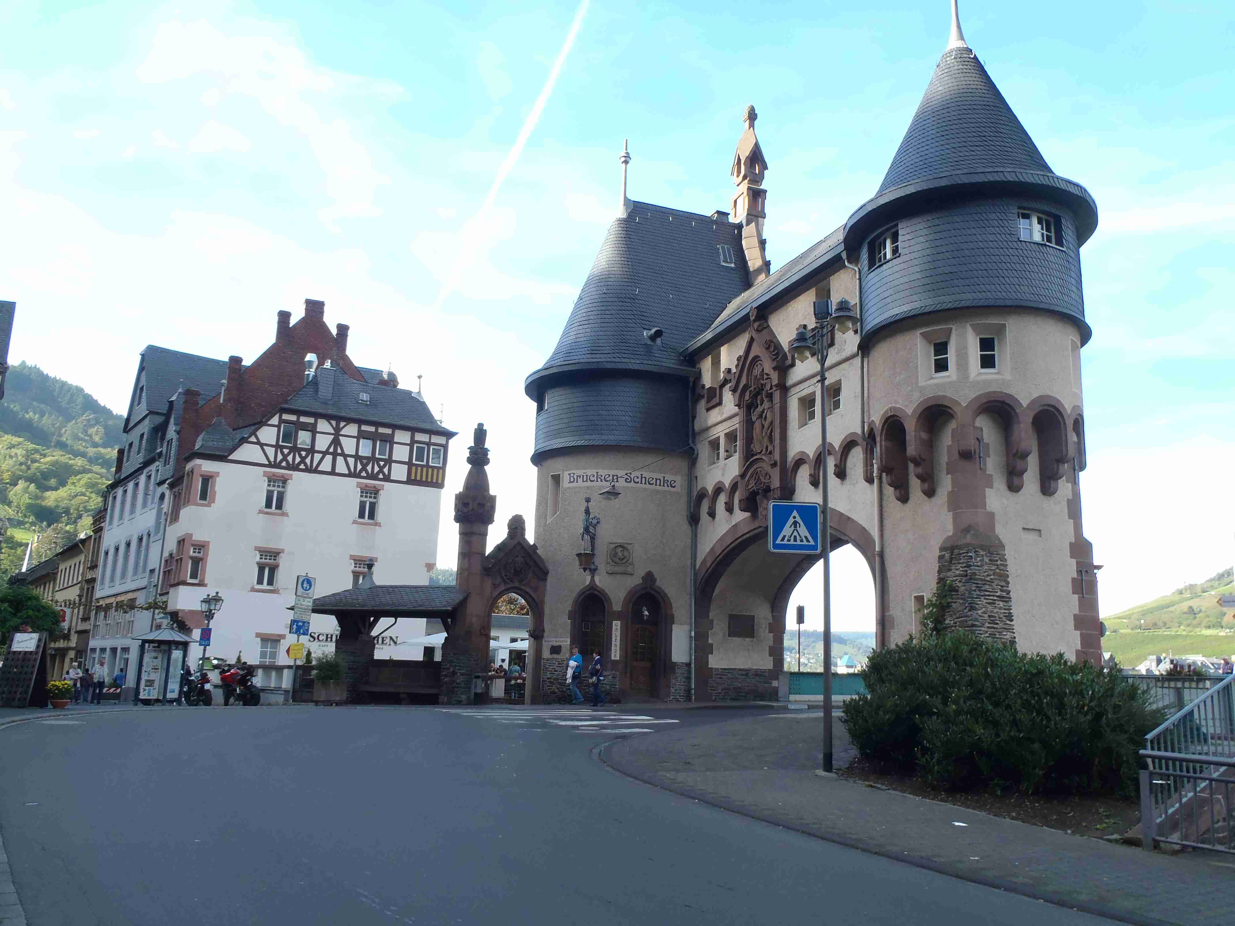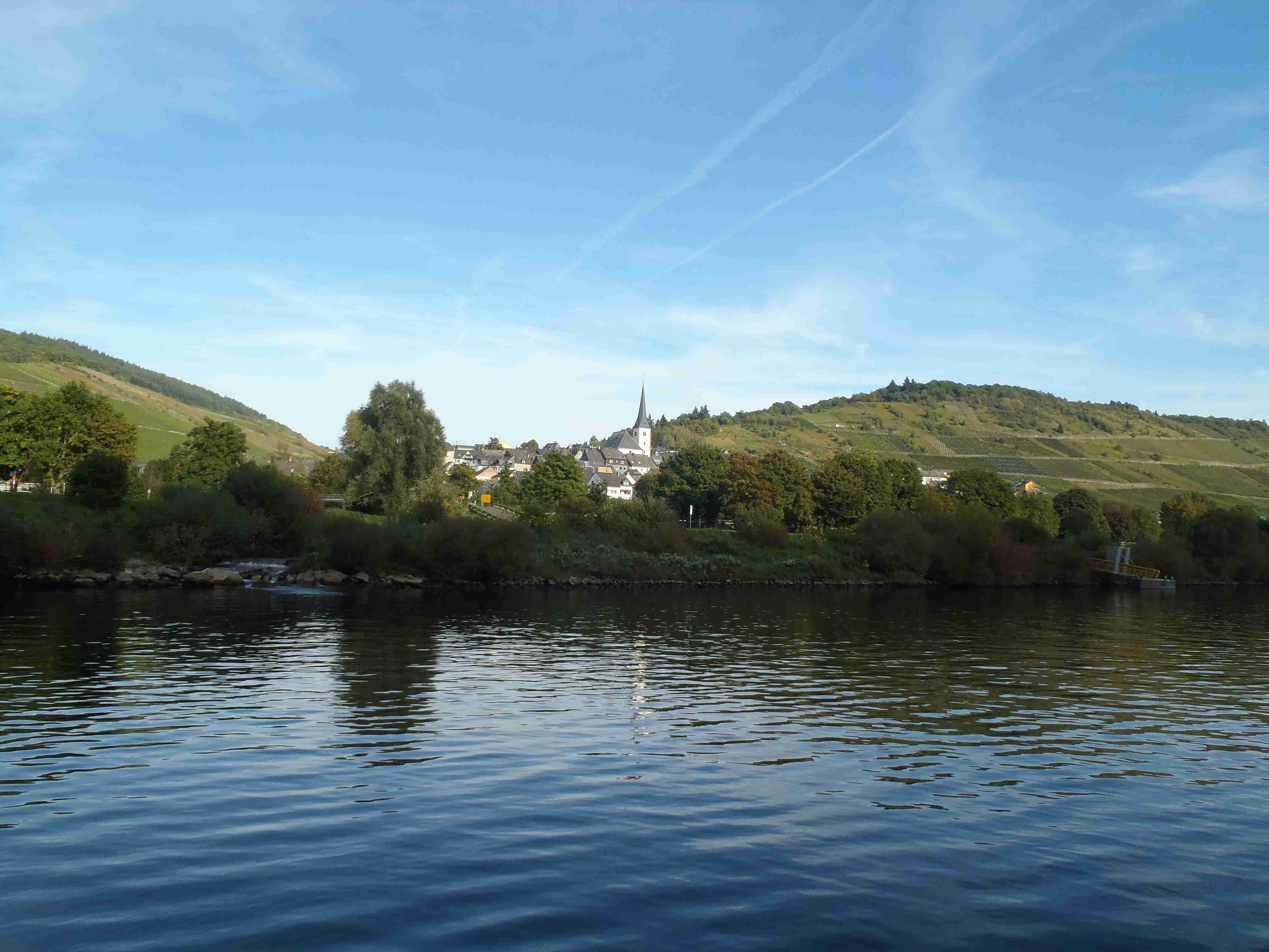 Rozvrh stejný jako včera, snídaně byla v přízemí našeho penzionu. Kolem čtvrt na jedenáct jsme vyrazili od penzionu opět na Brauneberg, kde vinobraní ještě pokračovalo a tak jsme museli sesednout z kol (vinobraní totiž probíhalo v místě cyklostezkyL) a opětovně to projít pěšky. Na mnoha lidech bylo vidět, že ještě nešli spát. Zhruba první hodinu cesty byla mlha, ale postupně se rozplývala a opětovně vylezlo sluníčko. Projeli jsme obcí Andel a před polednem jsme dojeli do dvojměstí Bernkastel-Kues, kde především prvně jmenované místo je opravdu historické – spousta hrázděných domů; ty však spíše svědčí o někdejší relativní chudosti a naopak převážně kamenné domy v dalším městě Trarbach jsou pak důkazem bohatství. Bernkastel jsme si prošli, nafotili, dali si na náměstíčku víno a poté jsme přejeli po mostě na druhou stranu do části Kues do areálu hospice sv.Mikuláše, kde je mimo funkčního hospice i rozsáhlá vinotéka, kterou jsme si prohlédli. Chutě jsme si nechali zajít, neboť nás přeci jenom ještě pár kilometrů čekalo. Po půl druhé jsme se vrátili zpět na pravý břeh a pokračovali jsme v cestě podél řeky obklopeni vinicemi. Kolem půl čtvrté jsme dorazili do dvojměstí Traben-Trarbach, kde jsme se u brány na most posadili ve dvoře a dali si Federweisser, neboť do cíle zbývalo již jenom pár kilometrů. Po občerstvovací pauze jsme přejeli přes most na levý břeh a se zastávkou u zdymadel jsme pokračovali až do obce Kövenig, kde jsme přívozem přejeli na druhou stranu do Enkirchu – bylo to takové malé zpestření pro ty, co chtěli. Ubytováni jsme byli v hotelu Loosen, který zabíral snad polovinu domů v ulici. Tentokrát jsme vyfasovali poslední patro bez výtahu, byl to ale regulérní podkrovní byt, plně vybavený – zase škoda, že jenom na jednu noc. Ubytovali jsme se kolem půl šesté, v nohách cca 45 km, rychle hygienu a dolu do dvora na večeři – naše první teplé jídlo. Poseděli jsme s Luborem, mechanikem Karlem a dalšími kolegy, jídlo jsme měli objednané od rána – Iva guláš s kroketami a já cikánský řízek s hranolky, oboje se salátem. Tentokrát jsem si dal pivo, Iva víno. Poseděli jsme asi do 21:00, odcházeli jsme pomalu jako poslední – žádná veselice.