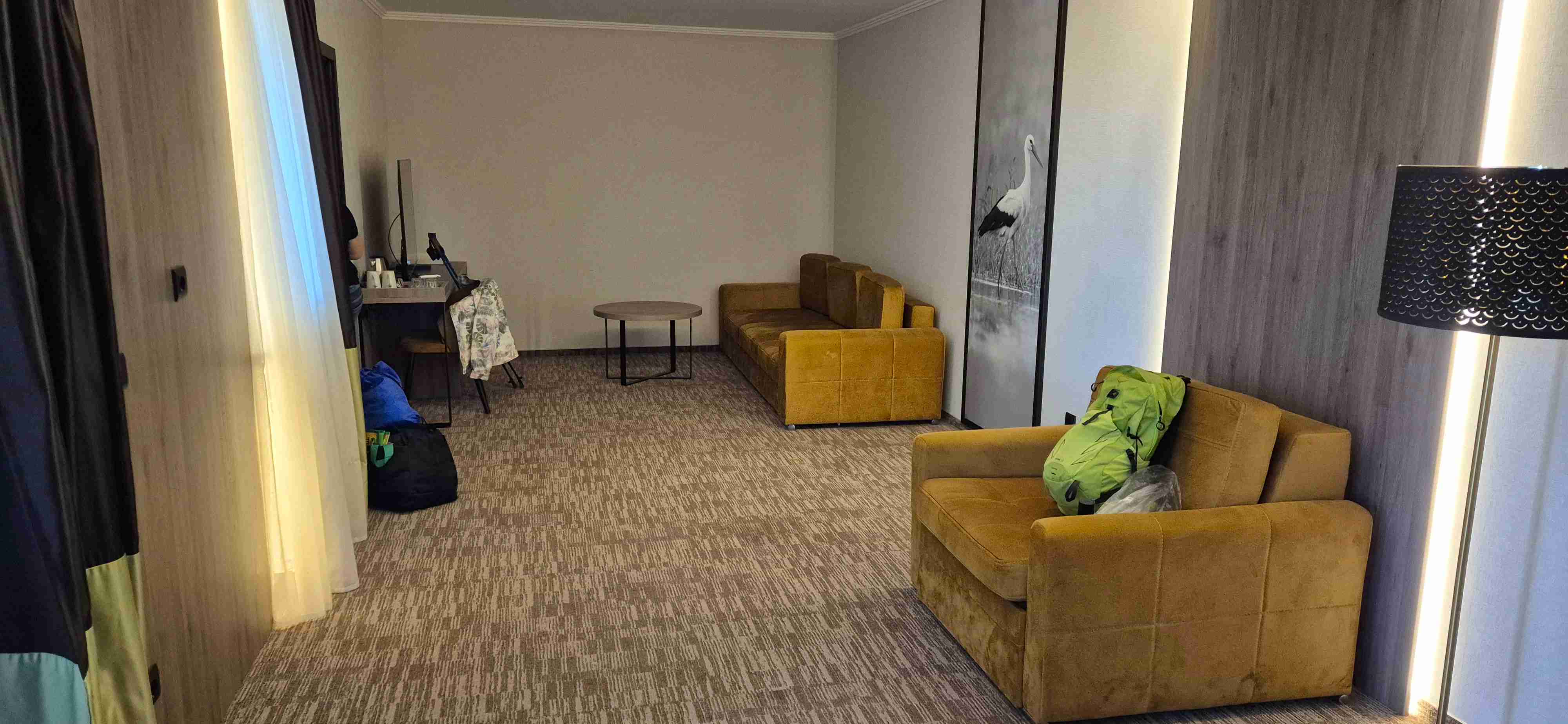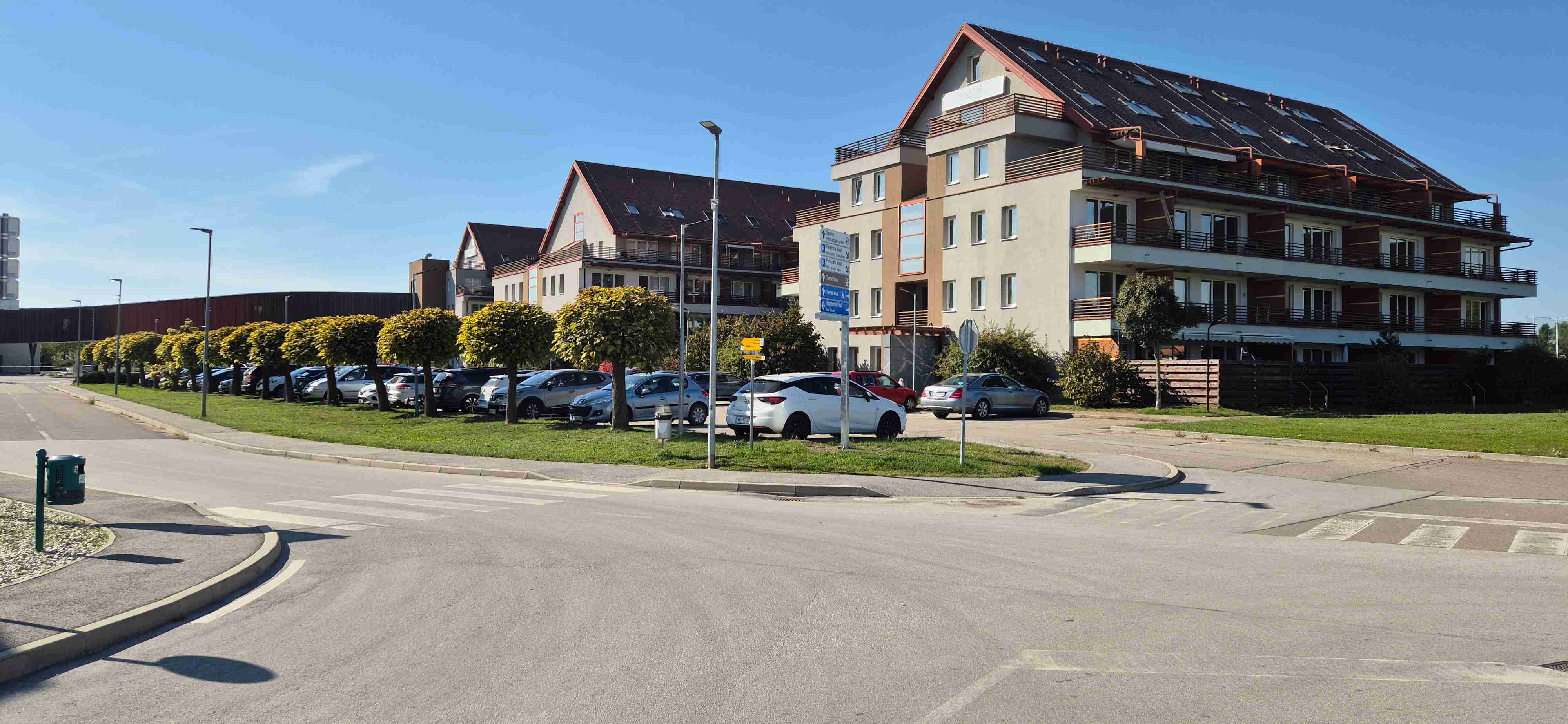 Ještě musím zmínit poněkud zdlouhavé docházení od recepce k pokoji. Hotel je tvořen několika budovami – v jedné je recepce a jídelna, na tu navazuje druhá budova s bazény. Pokud jsme z recepce šli na pokoj museli jsme vyjet do 1. patra, projít spojovacím krčkem, který byl ve vzduchu, do další budovy. Krček je vidět na obrázku č. 6, kde jsou 3 budovy se sedlovou střechou a vlevo je vidět krček a ještě i na foto č. 10. Vzhledem k tomu, že krček byl ve spádu, tak na jeho konci v druhé budově jsme se ocitli ve 2. patře a výtahem jsme museli sjet do přízemí a chodbou až na konec budovy, kde byl náš pokoj. No nachodili jsme se něúrekom.
