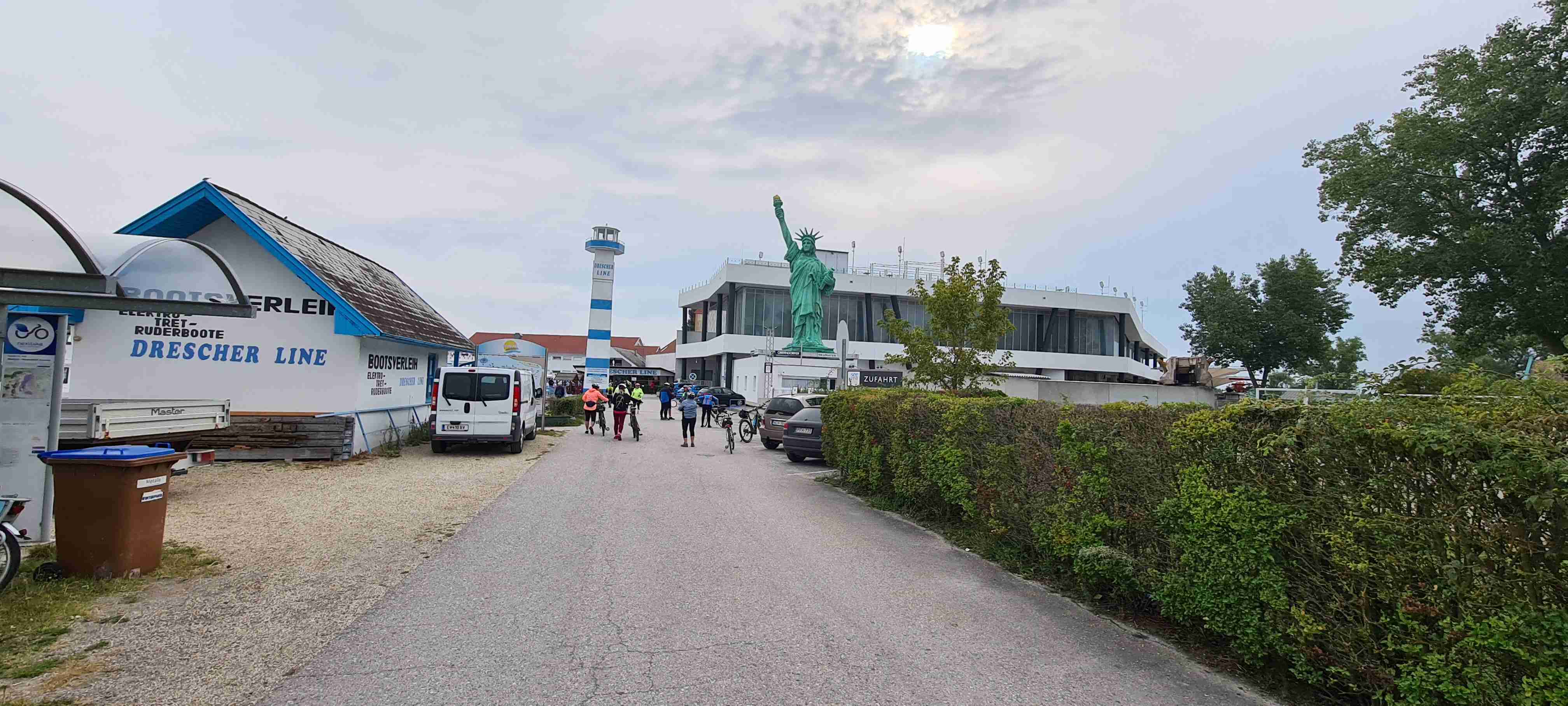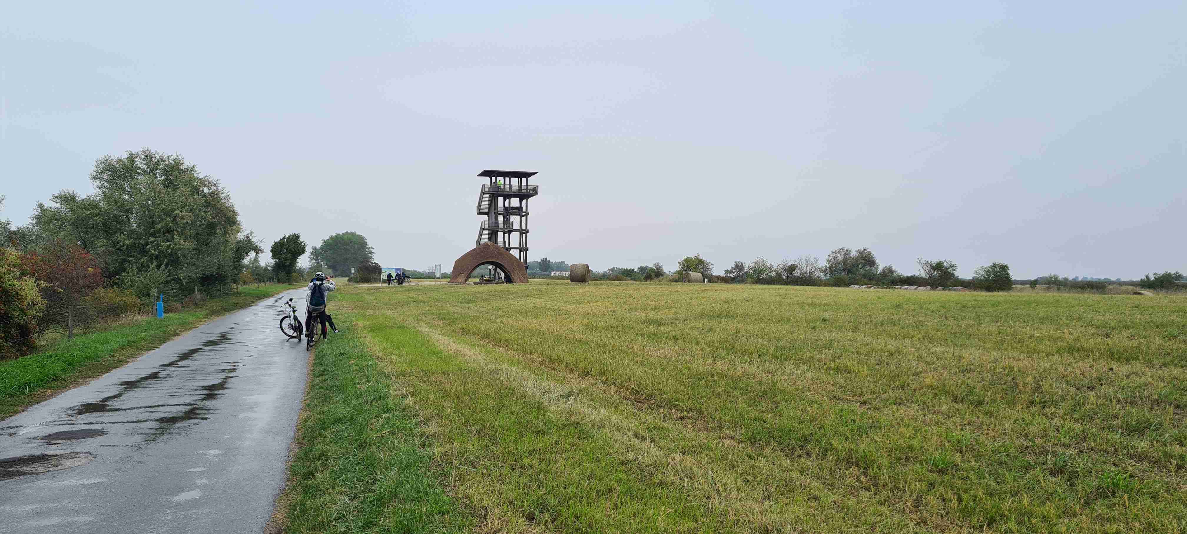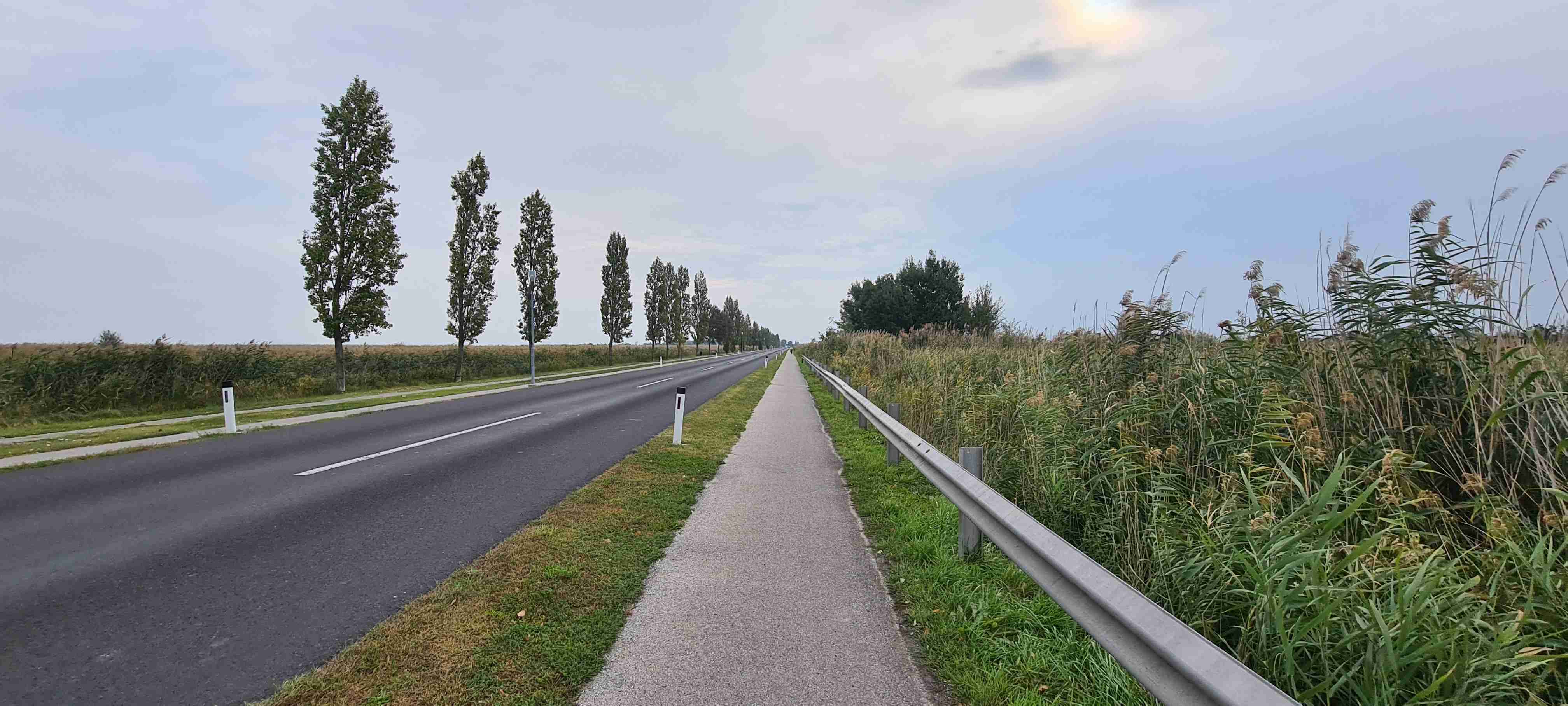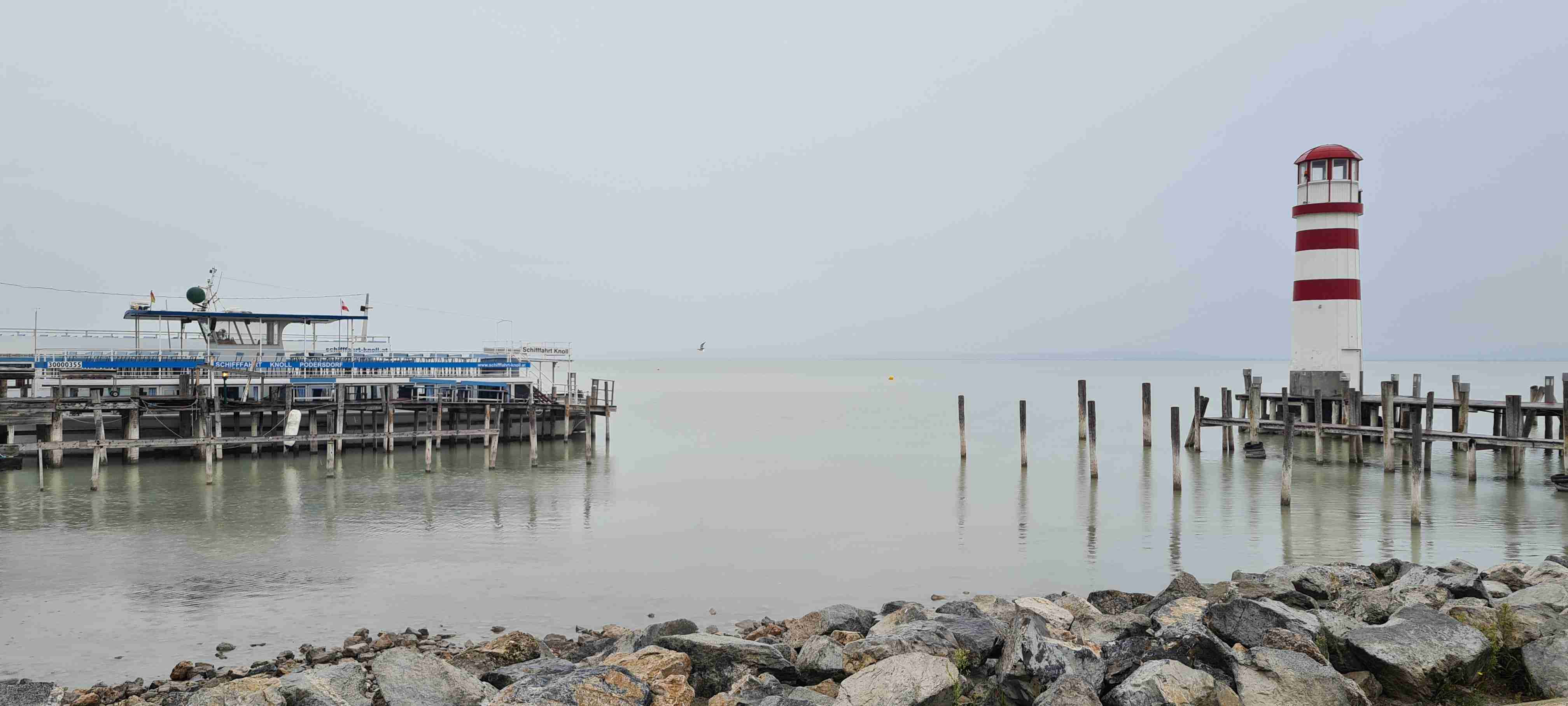 Ráno nás autobus odvezl kousek do Fertörakos, kde jsme nasedli na kola a přejeli asi 7 km do rakouského Mörbische do přístavu, kde jsme měli objednanou loď na přepravu na druhou stranu jezera. Vody bylo málo, samo jezero je poměrně mělké, a tak do přístavu Illmitz zajížděla loď poněkud ze strany. Po vylodění jsme nasedli opět na kola a vydali se po sinici na Illmitz, které jsme projeli a zamířili do Apetlonu. Nejdelší trasa vedla ještě kousek rovně, ale prý tam byla mizerná silnice a vyschlé jezírko tak jsme v Apetlonu odbočili doleva a vydali se k jezeru Darscho. Tady vody také mnoho nebylo. Pomalu začalo mrholit, z opačného směru k nám dorazil jeden z kolegů ze zájezdu Ruda a na další cestu se k nám připojil, protože měl poněkud problém s navigací dle mapy. Nás nyní čekala cesta vinicemi směrem k Neziderskému jezeru a tady svoji roli sehrála moje navigace Garmin, která nás vedla neomylně, značení cyklostezek bylo v této oblasti poněkud chaotické, ale my jsme jeli jako dráha. V této chvíli jsme již jeli v dešti, zastavili jsme u vyhlídky, na které jsme již v minulosti byli a pomalu jsme dojeli do Podersdorfu, ve kterém jsme při poslední návštěvě začínali závěrečnou etapu. Zajeli jsme po molu k majáku a přístavu, udělali jsme pár fotek a vrátili se zpět do městečka a zapadli do první hospody do Seewirt. Dali jsme si pivo, a hlavně hovězí polévku na zahřátí a doufali, že snad přestane pršet. Po cca hodině a půl marného doufání jsme se vydali na posledních 10 km do Neusiedelu, kde čekal autobus a kam jsme v cca 15 hodin po 45 km dorazili. A přestalo pršet.