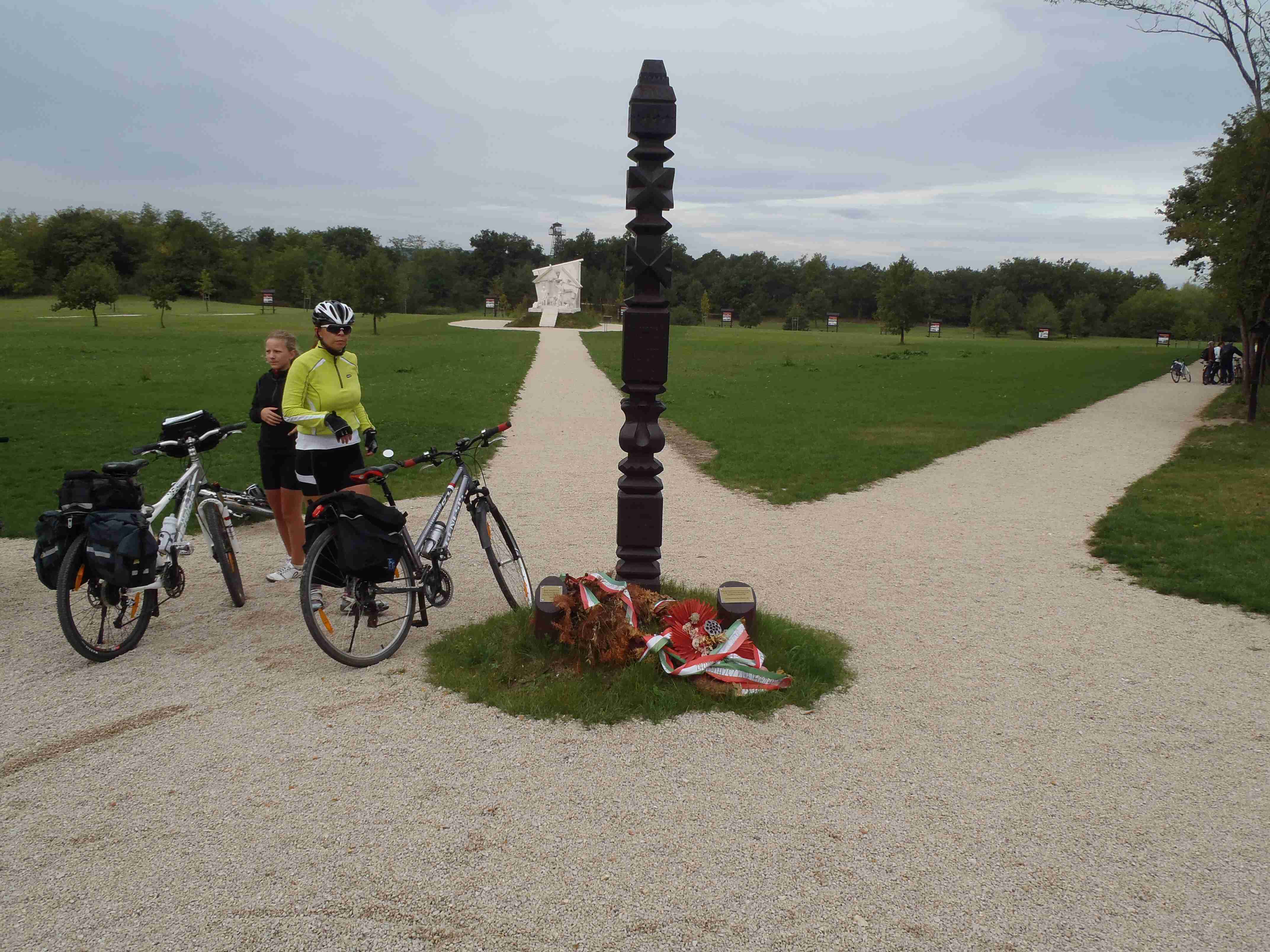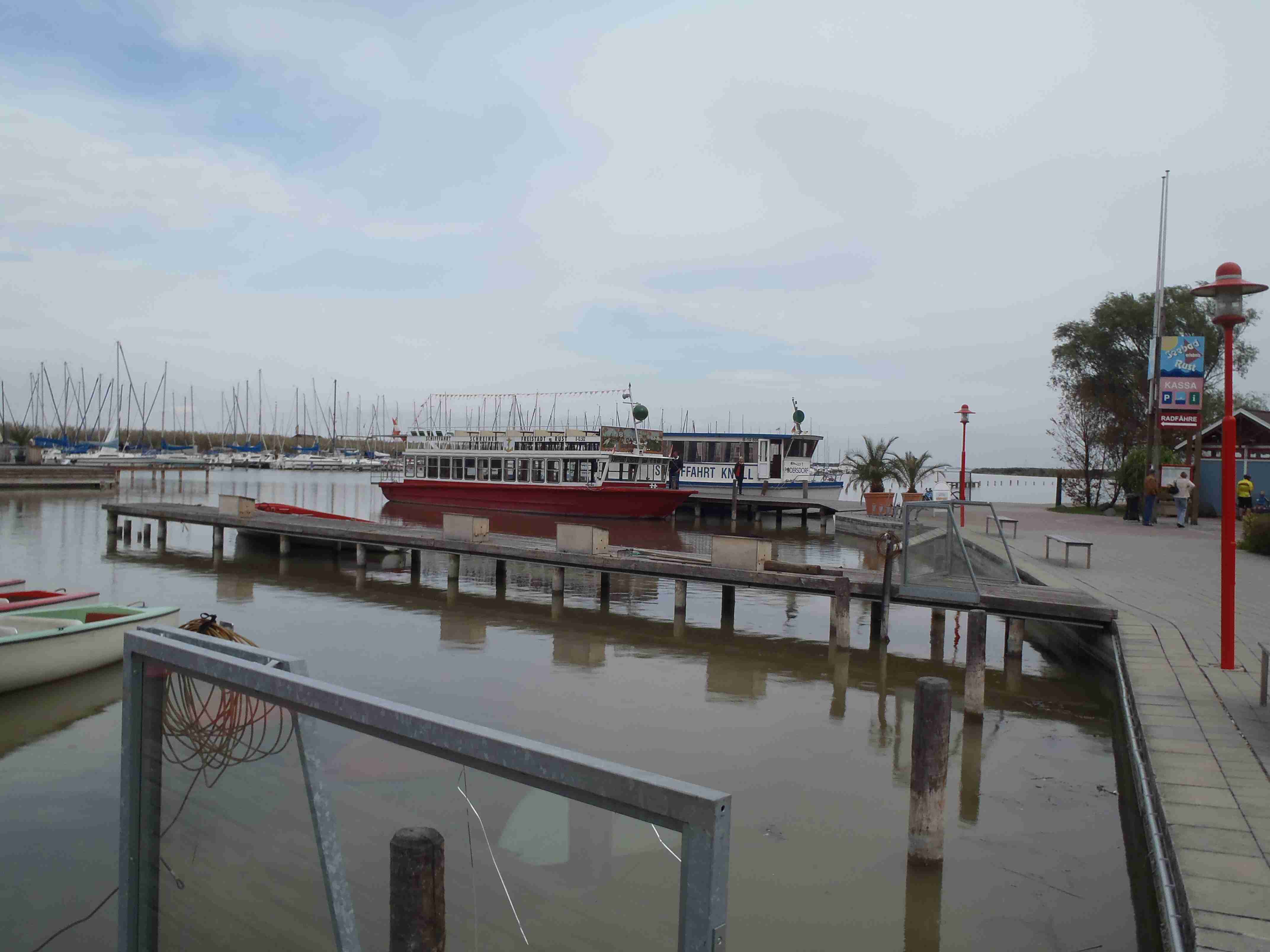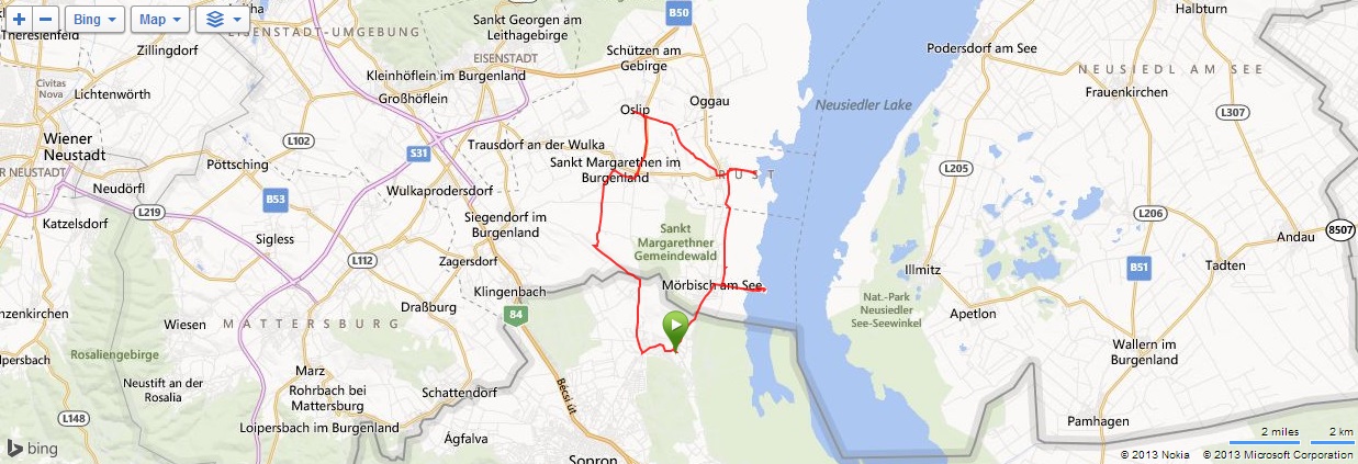V sobotu jsem posnídal řízky z domova, které jsem si ohřál v mikrovlnce a opět kolem osmé malý briefing a v půl deváté odjezd tentokrát na západní břeh Neziderského jezera. Autobus zastavil ještě na maďarské straně ve městě Fertörákos, kde jsme na parkovišti u hotelu složili kola a společně s Markétkou a velkou skupinou kolegů jsme vyrazili směrem na sever k hranici a Rakouskem. Zbytek pak se Štefanem jel trochu jinou cestou, ale sešli jsme se na hranici v místě zvaném Paneuropäisches Piknik, což je památník na rok 1989 a rušení železné opony. Počasí nebylo nic moc, občas spadlo i pár kapek a já se jenom modlil, aby nepršelo, protože jsem si myslel, že bude hezky, jako včera, a tak jsem si nevzal ani bundu do deště. Od památníku jsme se vydali cyklostezkou B 31 vedoucí na severozápad k městečku Siegendorf, po pár kilometrech jsme však odbočili doprava na sever, směr St. Margharethen. Tady jsme si na náměstí prohlédli kostel, opět nás dojel Štefan se svojí skupinou. My jsme pokračovali dál, po chvilce jsme se však oddělili od houfu a s Janou a Mirkem zamířili přímo dál na sever do městečka Oslip, kde nám Štefan doporučil restauraci Storchmühle – Čapí mlýn. Vynechali jsme tedy cestu do kopce do lomu v St. Margarethen a po cca 20 minutách jsme dorazili do Oslipu, kde nalézt restauraci nebyl problém, neboť cesta k ní byla dobře značená. Byla to krásná starobylá budova, nikdo tam nebyl a my si objednali burgenlandské speciality - já měl schpätzle zapékané se šunkou a sýrem, i ostatní si vybrali dobře, bylo to opravdu moc dobré. Mimo cca 5 lidí již nikdo jiný z našeho zájezdu nedorazil, jak jsme se později dozvěděli, tak je Štefan vzal do nějaké restaurace v Rustu. Po dobrém obědě jsme pokračovali v cestě, hned za Oslipem byl kopec jako kráva, pak už to šlo, sjeli jsme do Rustu, projeli jím až na okraj a zamířili do přístavu. Udělali jsme pár fotek a vydali se podél jezera na jih na Mörbich. Cestou jsme se sjeli se Štefanovou skupinou, kterou jsme potkali u ohrady s chlupatými prasátky. Společně jsme pak v Mörbichi navštívili přístaviště, kde kromě trajektů bylo i divadlo na břehu jezera. Z Mörbiche to již bylo k autobusu pár kilometrů, i když občas pěkně do kopce. Časy stejné jako včera, po půl čtvrté odjezd, několik jedinců pokračovalo domů na kole (dalších cca 30 km), nám však dnešních 42 km již stačilo. Po návratu jsme opět vyrazili do lázní, nejteplejší bazén byl narvaný a tak jsme většinu času byli v tom o dva stupně chladnějším (34-36°C). Občas si zapršelo, ale to nám nijak nevadilo, i když bazény byly venkovní – v těch uvnitř se nedalo dýchat. Z lázní jsme zamířili v naší osvědčené čtveřici do restaurace Tornacos, kde jsme si s Ivou dali talíř pro dvě osoby – různé druhy masa, rýže, šťouchané brambory, houbová omáčka. Bylo to výborné, ale bylo toho moc. Po deváté jsme se vydali domů, naštěstí již nepršelo a v noci nám to nevadilo.
