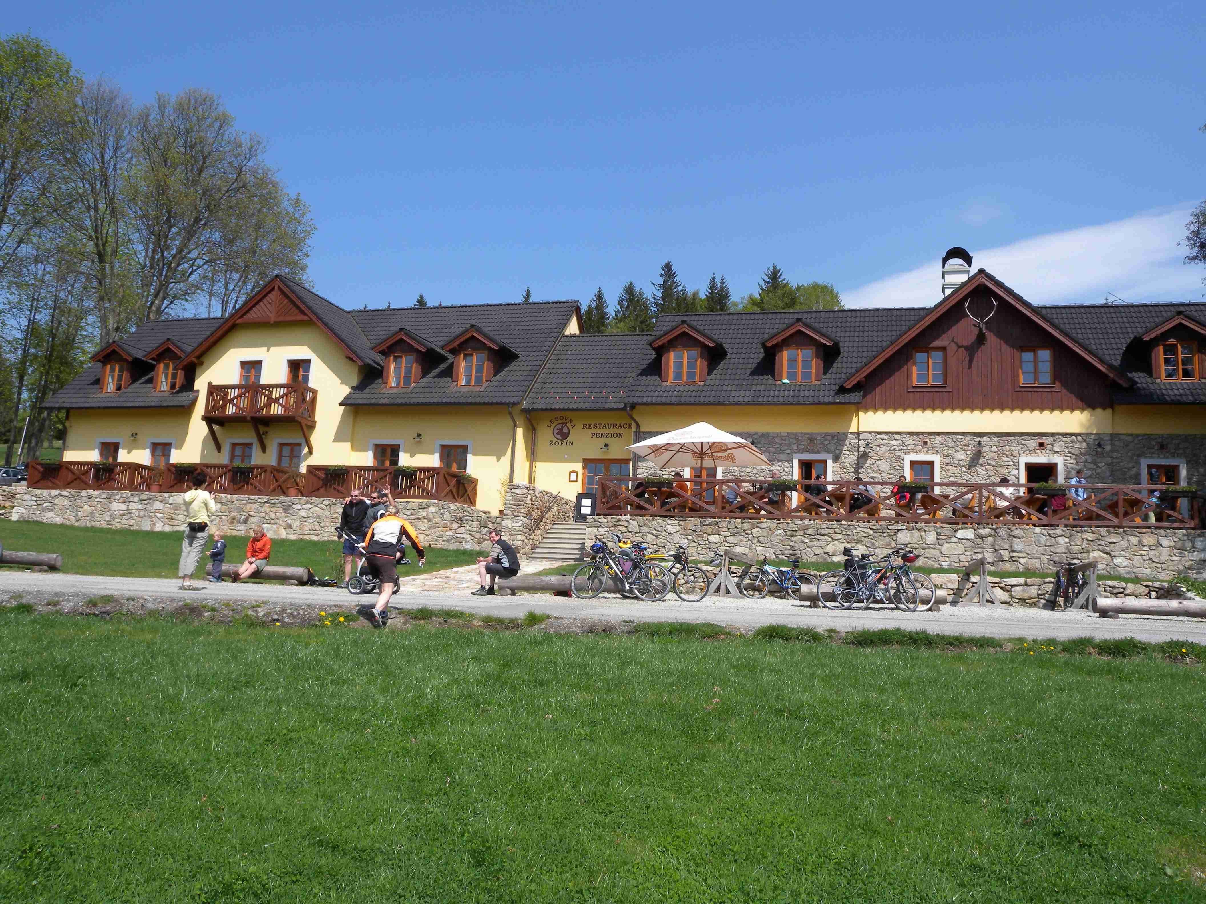 V sobotu jsem ráno vyrazil nakoupit snídani do marketu na náměstí, posnídal jsem a na devátou jsem byl připraven na další cyklistický den. Když jsme se všichni sešli na ulici před penzionem, vyrazili jsme – z kopce dolů kolem Městského Mlýna, první zastávka byla v autokempu Veveří, kde byli kolegové ubytováni při poslední návštěvě, a poté lesem, loukou (místy notně podmáčenou ze včerejšího slejváku) až do obce Šejby. První cíl byl penzion Žofín a cest k němu několik – Vráťa vybral podle cykloatlasu trasu č. 80, tzv. Hovohradský okruh, který právě za obcí Šejby pokračoval lesem prudce do kopce. Když jsem viděl na mapě, jak jsou vrstevnice blízko sebe a cesta vede kolmo na ně, hledal jsem alternativu a našel jsem ji v klidné asfaltované cestě ze Šejb do Dobré Vody (cyklostezka 1048). Zde jsem se napojil na silnici, která byla až do Hojné Vody (cca 1,5 km) docela prudká, ale dalo se. Odtud pak již většinou z kopce přes Staré Hutě do Černého Údolí. Odtud mě navigace hnala dál po hlavní přes most a doleva, takže jsem si ve skutečnosti asi 5 km zajel, protože na Žofín vedla přímá cesta z Černého Údolí. K penzionu Lesovna Žofín jsem dojel těsně po poledni, ostatní již byli usazeni u stolu, ale zatím si objednali pouze pití, takže jsem se o tolik neopozdil. Jídlo bylo dobré a ve srovnání s restaurací na radnici v Nových Hradech i rychlé. Navíc jsme zjistili, že na druhé straně jídelního lístku inzerují možnost objednat si 24 hodin předem krůtu, lososa, sele apod. A tak slovo dalo slovo a na neděli na poledne jsme si objednali sele (cca 10 kg) s knedlíky a se zelím. No hrůza. Po dobrém obědě se již nikomu nechtělo na okruh okolo Žofínského pralesa a tak jsme se vydali na zpáteční cestu. Do Hojné Vody to bylo trochu do kopce, tam jsme se trochu občerstvili a čekal nás sjezd přes Dobrou Vodu až do Horní Stropnice. Odtud jsem pokračoval dle navigace směrem k Humenici, kde jsem se napojil na včerejší trasu; ostatní jeli trochu jinak, z kopce do kopce a po poli, ale kousek za přehradní hrází u Cuknštejnu jsme se zase setkali. Sjeli jsme lázeňským budovám, kde zbytek nejvěrnějších dal poslední občerstvovací – Pavla s Markétou nějaký pohár, a pak jsme pomalu dojeli do města a jako včera prudkou Údolskou ulicí nahoru na náměstí a do penzionu. Tentokrát nepršelo a tak to bylo o to jednodušší. Bylo dost času na provedení očisty, před večeří jsme se sešli ještě na pokoji a popili jsme z lahve Tullamore Dew a pak opět na radnici na večeři. Zbytek večera pak proběhl dle včerejšího scénáře, snad jen s tím rozdílem, že některé tvrdší povahy vyrazili ještě na nějakou diskotéku a v noci měli trochu problémy dostat se do baráku, Ale to znám jenom z doslechu.