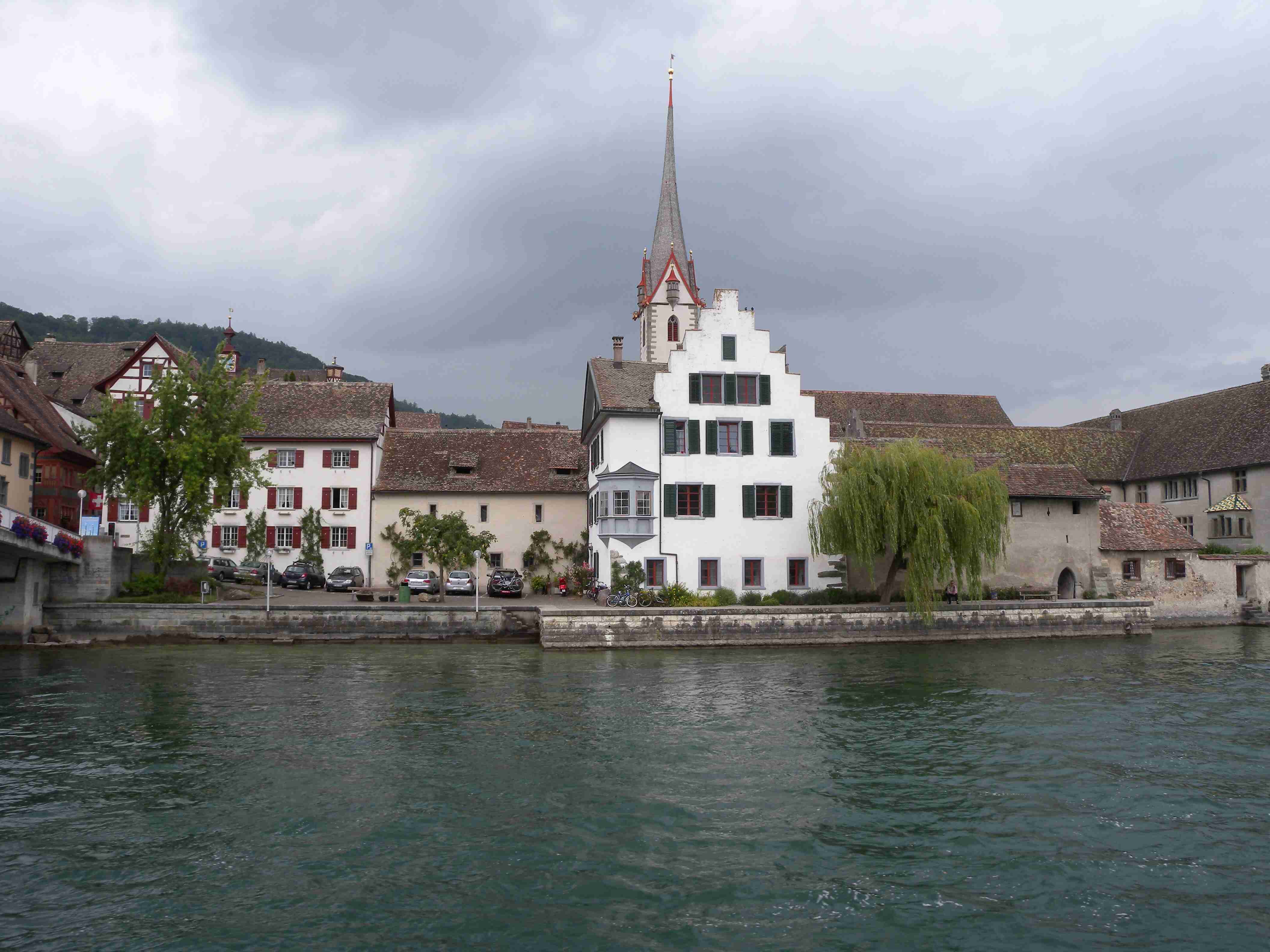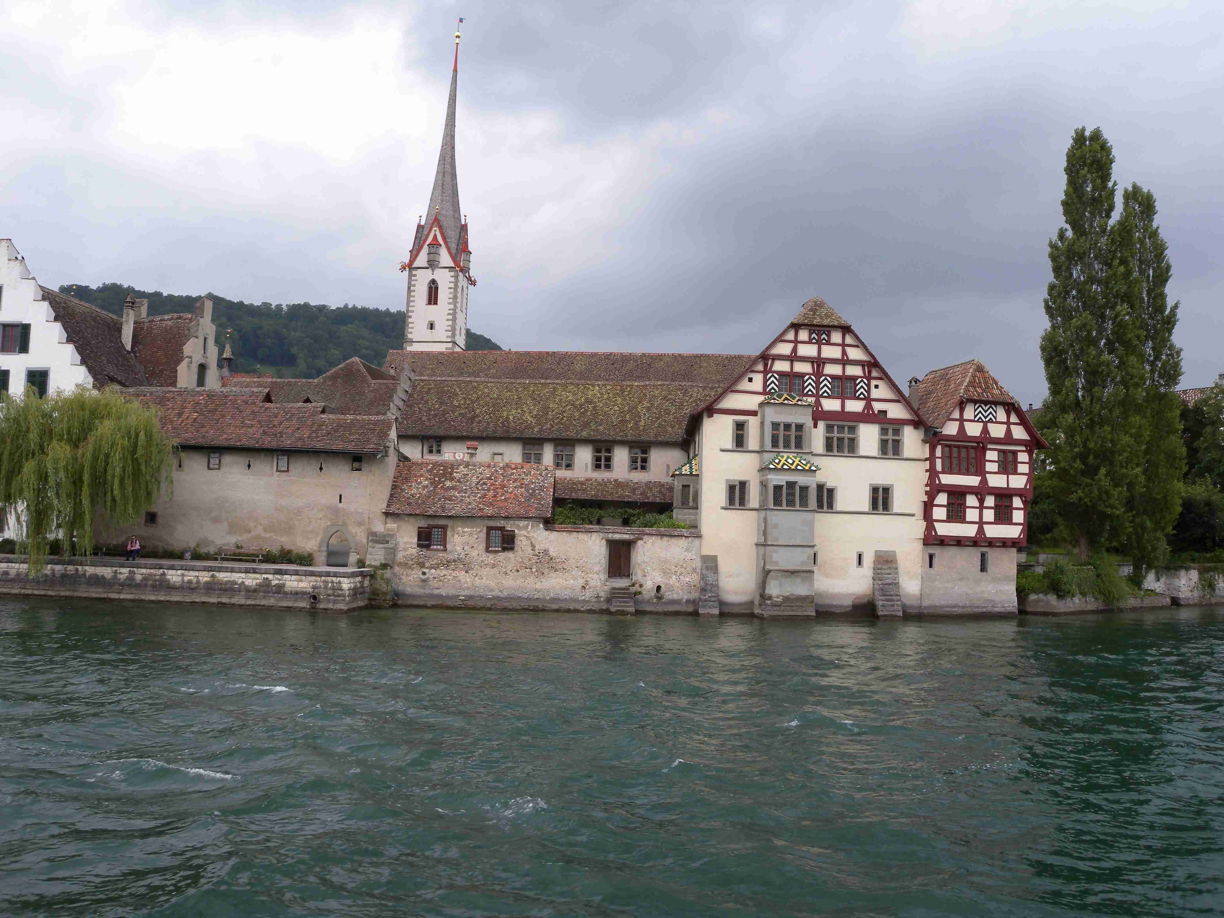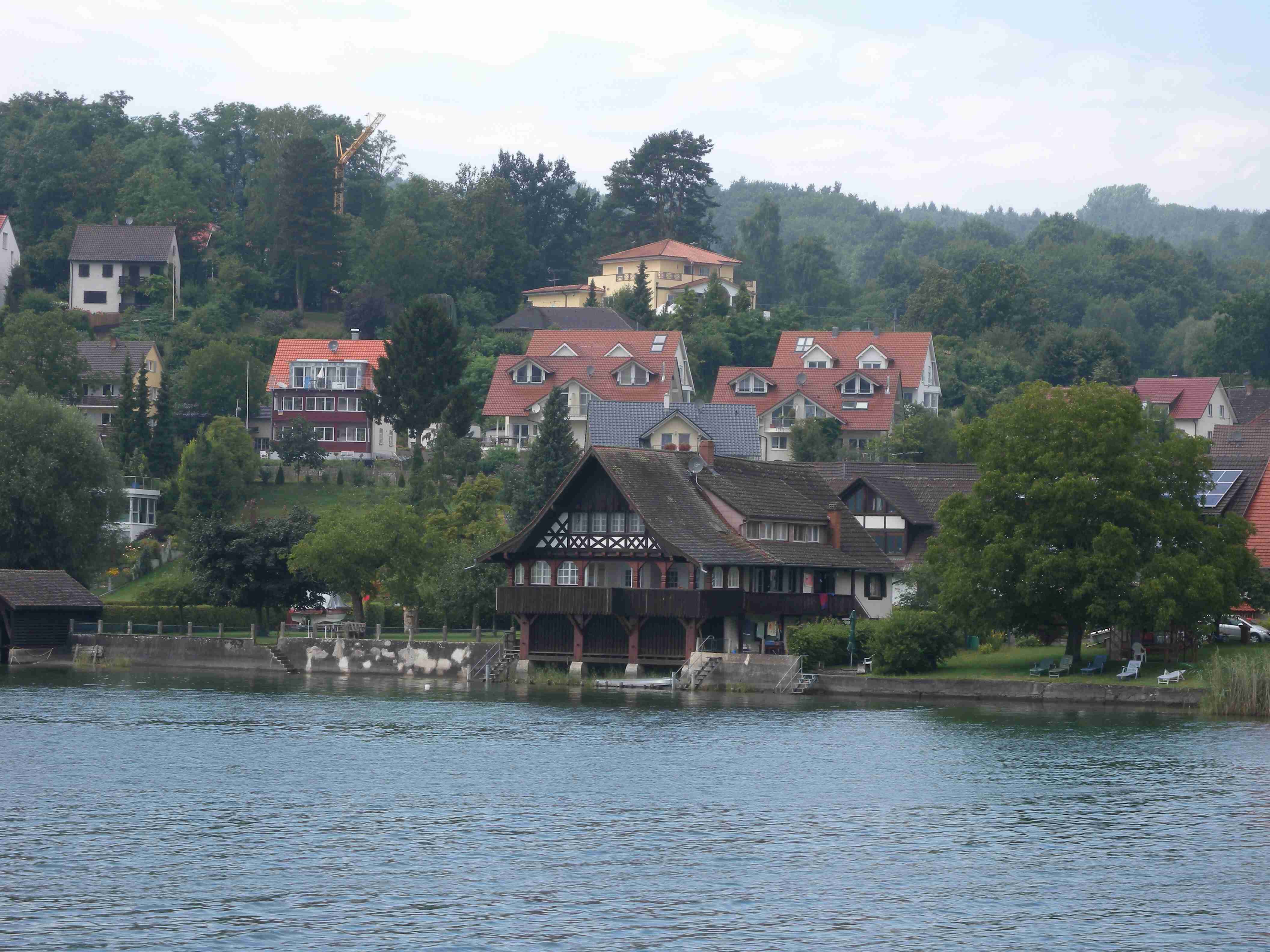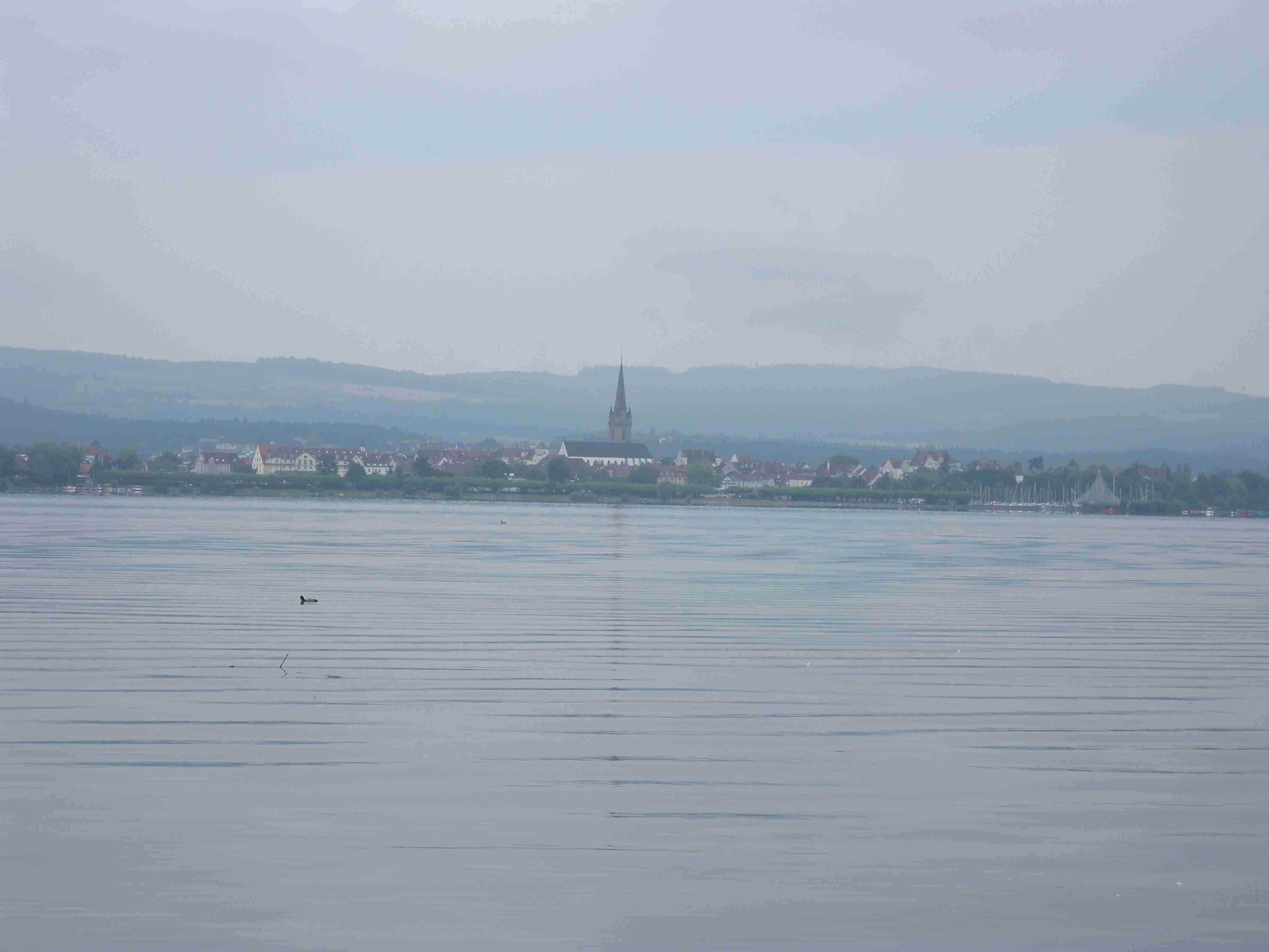 Snídaně byla v 8.00 formou švédského stolu a byla vynikající - čerstvé pečivo, salámy, šunky, zelenina, sýry, no prostě nádhera. Po snídaní breefing, ale počasí nic moc. Přesto jsme se kolem 10.00 vybatolili a asi jako první a jediní jsme vyrazili na dnešní etapu. Drobně pršelo, ale naštěstí, ještě než jsme sjeli dolů do Radolfzell, tak přestalo. Jeli jsme chvíli v opačném směru po včerejsí trase až k nadjezdu nad tratí, pak jsme přejeli na druhou stranu kolejí a kolem nádraží jsme opouštěli město po cyklostezce Radweg lemující jezero, docela dobře značené. Tou jsme jeli na Moos, Iznang, atd., pořád podél jezera. Někde v okolí Gaienhofenu jsme v poledne zastavili na pivo a kafe, právě otvírali a majitelka byla ochotná, upovídaná paní, dozvěděli jsme se, že tady bylo minulý týden také kolem 35°C, současnou teplotu jsem odhadoval na nějakých 22°C. Pokračovali jsme dál, místama jsme museli i do kopce a asi po 13. hodině jsme dorazili do kouzelného, historického městečka Stein am Rhein. Kola jsme zamkli na začátku náměstíčka a prošli jsme se ulicí plnou středověkých domů, boční uličkou jsme došli k jezeru, k přístavu lodí, vzali jsme si jízdní řády a vrátili se ke kolům. Již s koly jsme šli zpět do přístavu s tím, že se naobědváme, ale přád se nám to zdálo docela drahé. Nakonec jsme se i přes tu cenu rozhodli pro hotýlek na konci, kde měli různé druhy salátů. Objednali jsme si pití a jídlo a teprve teď jsme zjistili, že jsme ve Švýcarsku a že ceny jsou ve švýcarských francích. Ne že by to tím tedy bylo levné, ale již to byla přijatelná cena. Já měl salát a rybí prsty, Iva zapečenou zeleninu v kastrůlku - brambory, rajčata a navrchu sýr. Obojí vynikající! Po třetí hodině jsme opustili restauraci, v přístavu akorát otevřeli pokladnu a tak jsme si koupili lístky na ostrov Reichenau. Loď odplouvala v 15.30, seděli jsme na horní, pouze zastřešené palubě, kde se i obsluhovalo a tak jsem si dal pivečko. Cestou to docela foukalo, chvíleni i pršelo, dokonce jsem si vybalil a oblékl nepromokavou bundu, vpředu, kam jsme jeli, to vypadalo černě, ale co se dá dělat. Na Reichenau jsme dorazili přesně v 16.50, je to vlastně poloostrov spojený s pevninou pouze úzkou šíjí a je to ohromná pěstírna zeleniny. Našli jsme cyklostezku a vydali se po ní mezi skleníky a políčky se zeleninou, projeli jsme ostrovem a dlouhou úzkou álejí jsme vjeli zpět na pevninu, kde jsme zatočili doleva. Všude samé louže, což svědčilo o nedávném silném dešti. Dojeli jsme po cyklostezce do městečka Allensbach a odtud jsme již začali stoupat k našemu dočasnému domovu. Ve chvíli, kdy jsme zatáčeli z hlavní silnice k penzionu se opět rozpršelo, takže jsme dorazili právě včas. Bylo 18.18 a měli jsme natočeno 47 km. V penzionu jsme po náležité očistě vyrazili na večeři, já si dal steak se zeleninovým salátem, Iva pouze zeleninový salát - opět bezvadné jídlo. Briefing ve 20.00 byl zhacen autoritativním účastníkem a přesunul se na ráno, večer se dalo do pořádného deště a větru a tak jsme usínali za zvuku tekoucí vody ze střech.