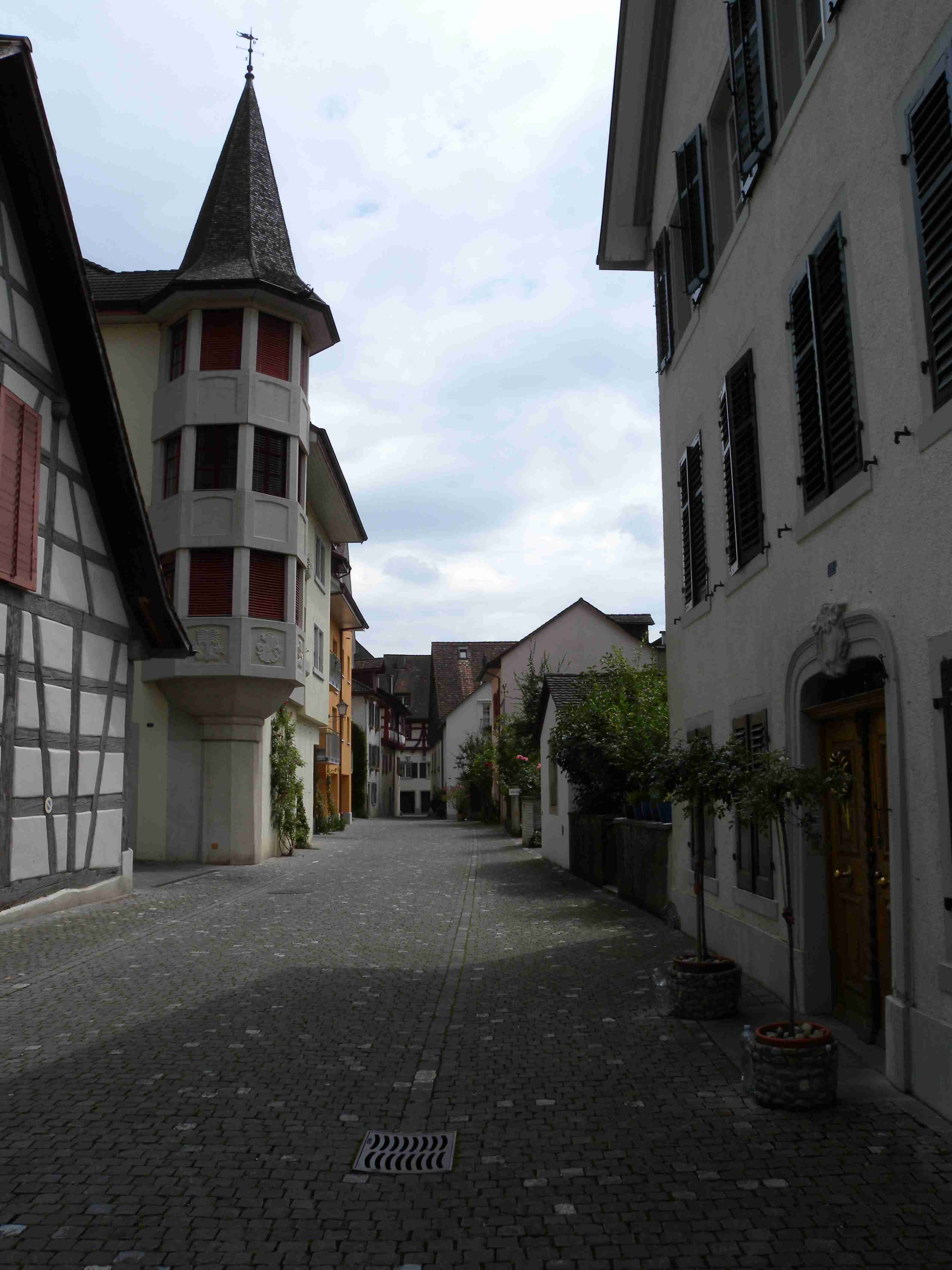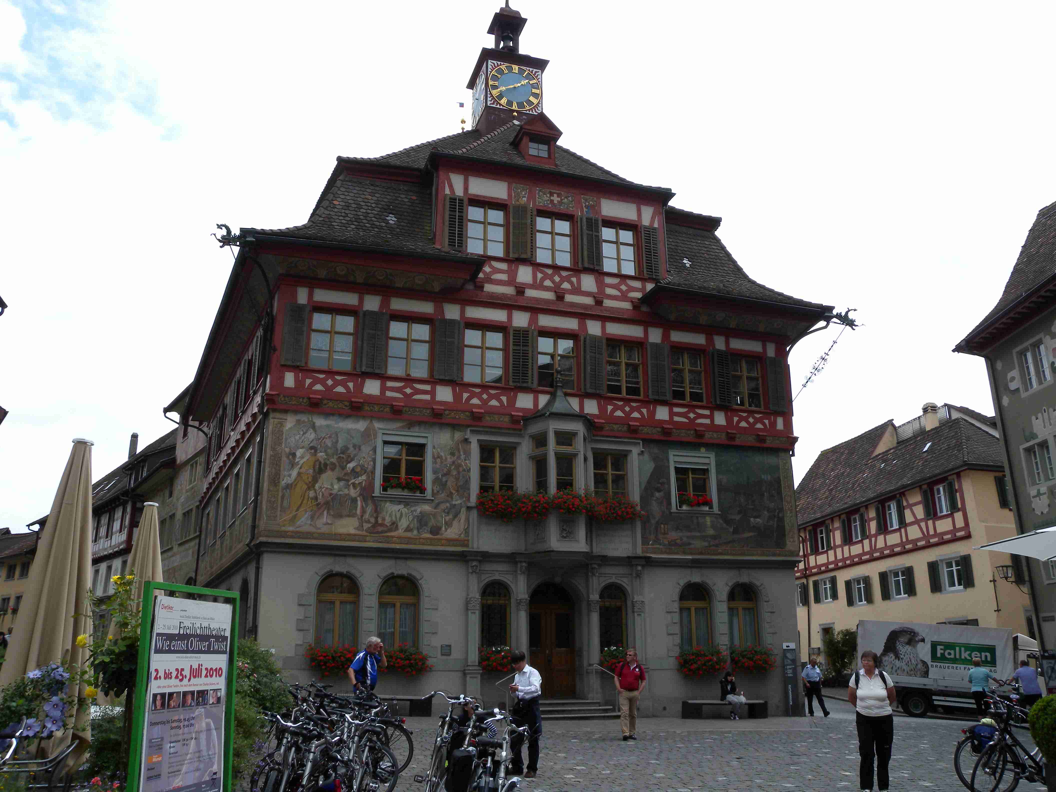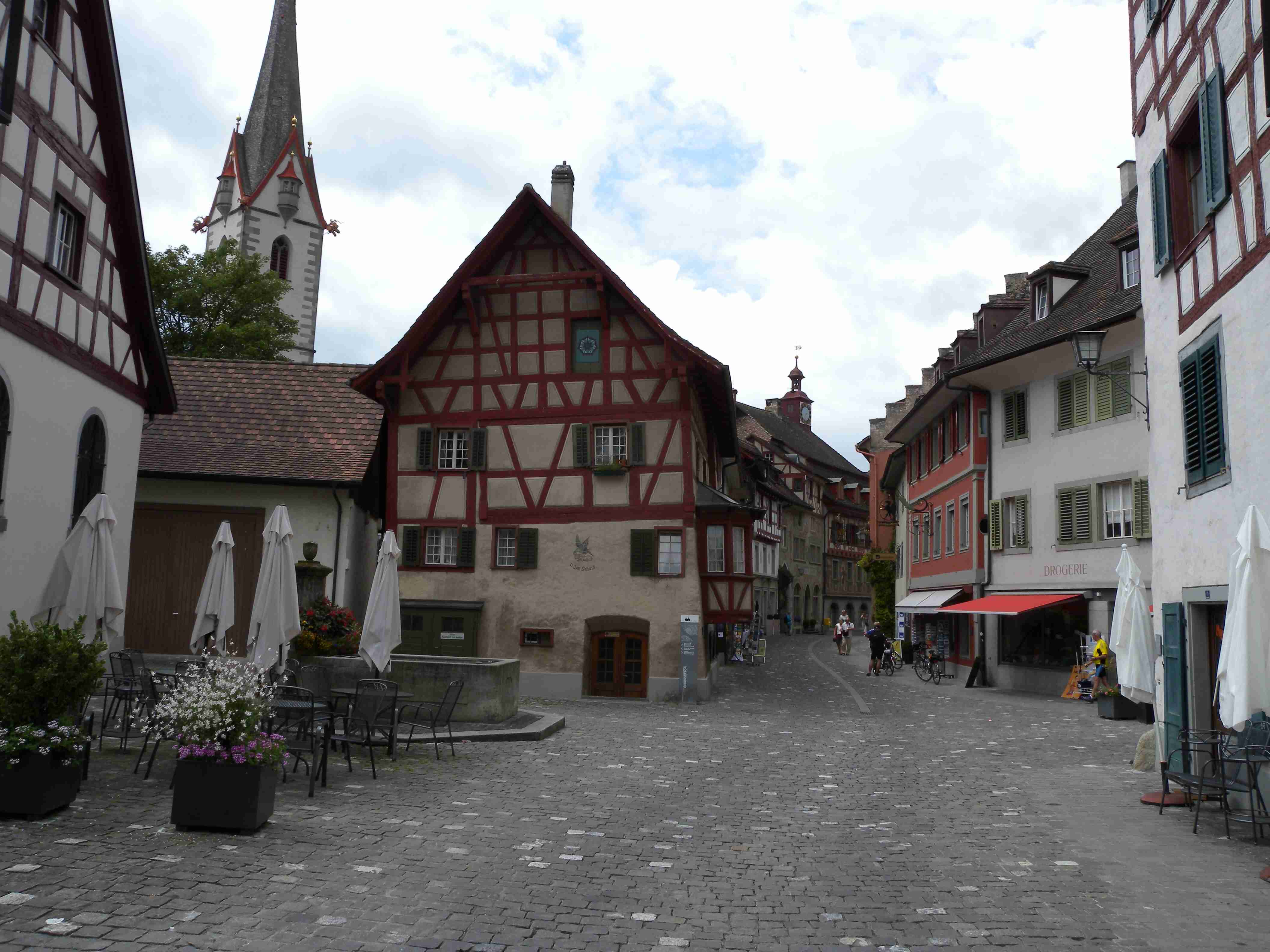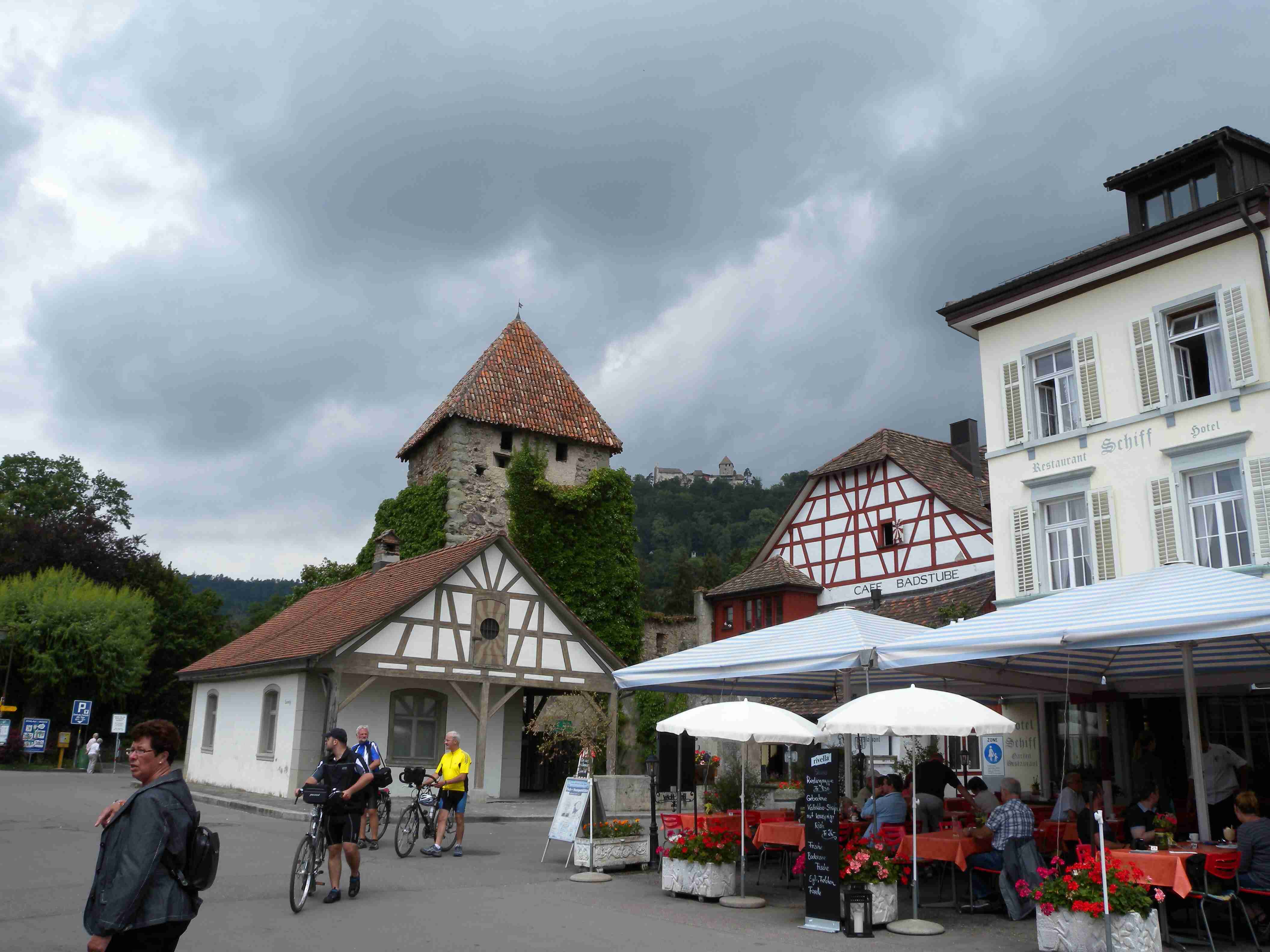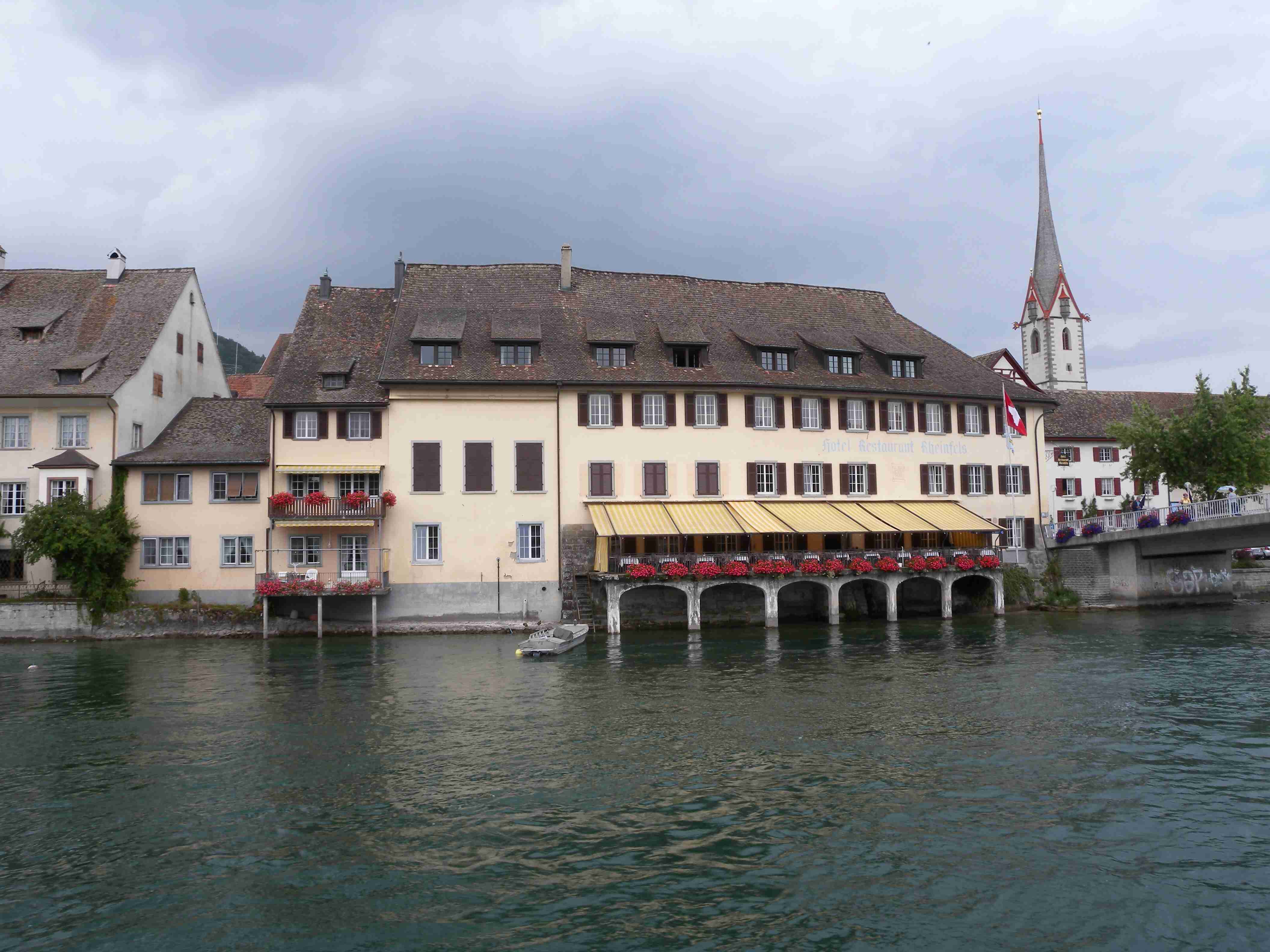 Snídaně byla v 8.00 formou švédského stolu a byla vynikající - čerstvé pečivo, salámy, šunky, zelenina, sýry, no prostě nádhera. Po snídaní breefing, ale počasí nic moc. Přesto jsme se kolem 10.00 vybatolili a asi jako první a jediní jsme vyrazili na dnešní etapu. Drobně pršelo, ale naštěstí, ještě než jsme sjeli dolů do Radolfzell, tak přestalo. Jeli jsme chvíli v opačném směru po včerejsí trase až k nadjezdu nad tratí, pak jsme přejeli na druhou stranu kolejí a kolem nádraží jsme opouštěli město po cyklostezce Radweg lemující jezero, docela dobře značené. Tou jsme jeli na Moos, Iznang, atd., pořád podél jezera. Někde v okolí Gaienhofenu jsme v poledne zastavili na pivo a kafe, právě otvírali a majitelka byla ochotná, upovídaná paní, dozvěděli jsme se, že tady bylo minulý týden také kolem 35°C, současnou teplotu jsem odhadoval na nějakých 22°C. Pokračovali jsme dál, místama jsme museli i do kopce a asi po 13. hodině jsme dorazili do kouzelného, historického městečka Stein am Rhein. Kola jsme zamkli na začátku náměstíčka a prošli jsme se ulicí plnou středověkých domů, boční uličkou jsme došli k jezeru, k přístavu lodí, vzali jsme si jízdní řády a vrátili se ke kolům. Již s koly jsme šli zpět do přístavu s tím, že se naobědváme, ale přád se nám to zdálo docela drahé. Nakonec jsme se i přes tu cenu rozhodli pro hotýlek na konci, kde měli různé druhy salátů. Objednali jsme si pití a jídlo a teprve teď jsme zjistili, že jsme ve Švýcarsku a že ceny jsou ve švýcarských francích. Ne že by to tím tedy bylo levné, ale již to byla přijatelná cena. Já měl salát a rybí prsty, Iva zapečenou zeleninu v kastrůlku - brambory, rajčata a navrchu sýr. Obojí vynikající! Po třetí hodině jsme opustili restauraci, v přístavu akorát otevřeli pokladnu a tak jsme si koupili lístky na ostrov Reichenau. Loď odplouvala v 15.30, seděli jsme na horní, pouze zastřešené palubě, kde se i obsluhovalo a tak jsem si dal pivečko. Cestou to docela foukalo, chvíleni i pršelo, dokonce jsem si vybalil a oblékl nepromokavou bundu, vpředu, kam jsme jeli, to vypadalo černě, ale co se dá dělat. Na Reichenau jsme dorazili přesně v 16.50, je to vlastně poloostrov spojený s pevninou pouze úzkou šíjí a je to ohromná pěstírna zeleniny. Našli jsme cyklostezku a vydali se po ní mezi skleníky a políčky se zeleninou, projeli jsme ostrovem a dlouhou úzkou álejí jsme vjeli zpět na pevninu, kde jsme zatočili doleva. Všude samé louže, což svědčilo o nedávném silném dešti. Dojeli jsme po cyklostezce do městečka Allensbach a odtud jsme již začali stoupat k našemu dočasnému domovu. Ve chvíli, kdy jsme zatáčeli z hlavní silnice k penzionu se opět rozpršelo, takže jsme dorazili právě včas. Bylo 18.18 a měli jsme natočeno 47 km. V penzionu jsme po náležité očistě vyrazili na večeři, já si dal steak se zeleninovým salátem, Iva pouze zeleninový salát - opět bezvadné jídlo. Briefing ve 20.00 byl zhacen autoritativním účastníkem a přesunul se na ráno, večer se dalo do pořádného deště a větru a tak jsme usínali za zvuku tekoucí vody ze střech.