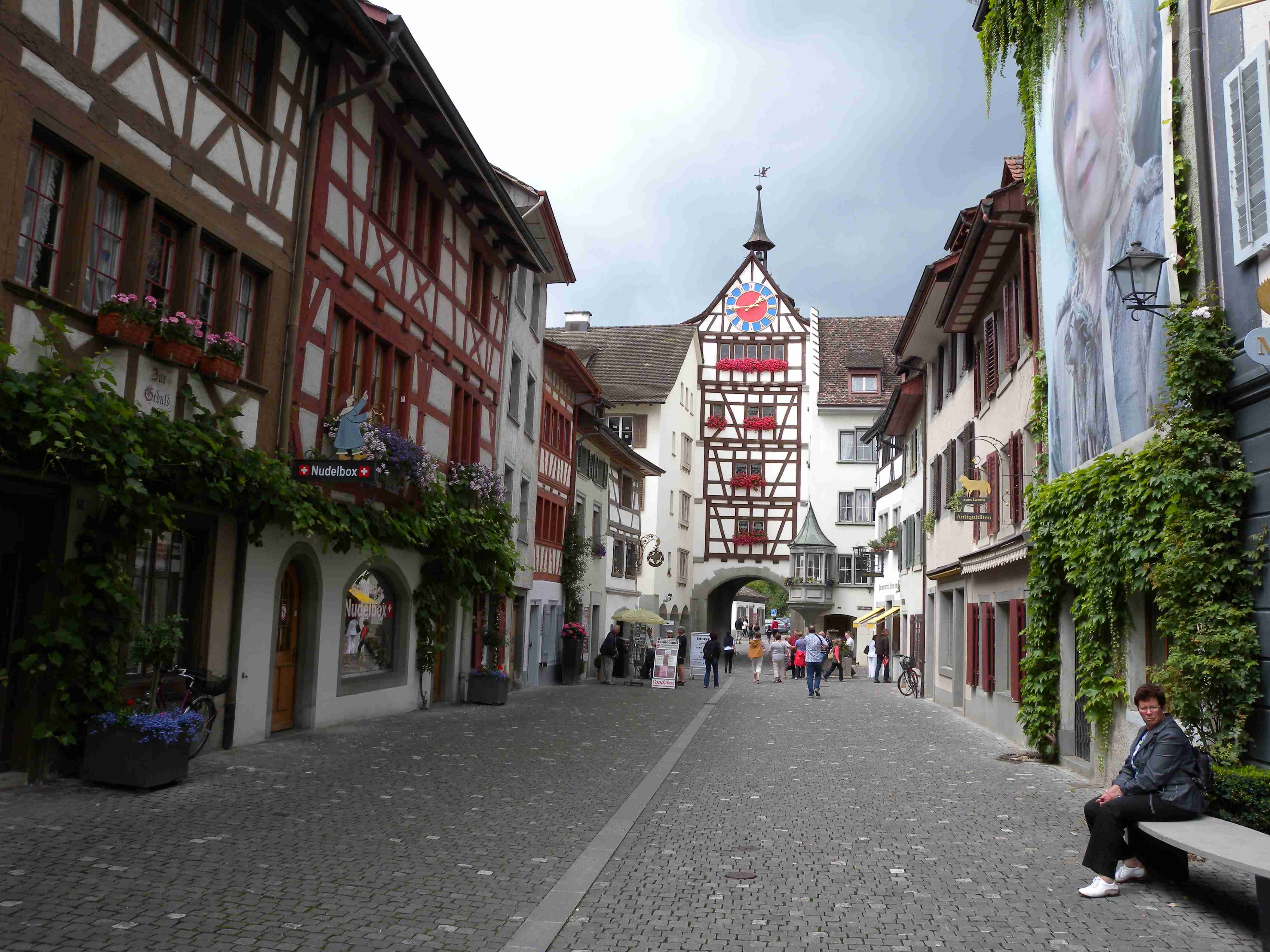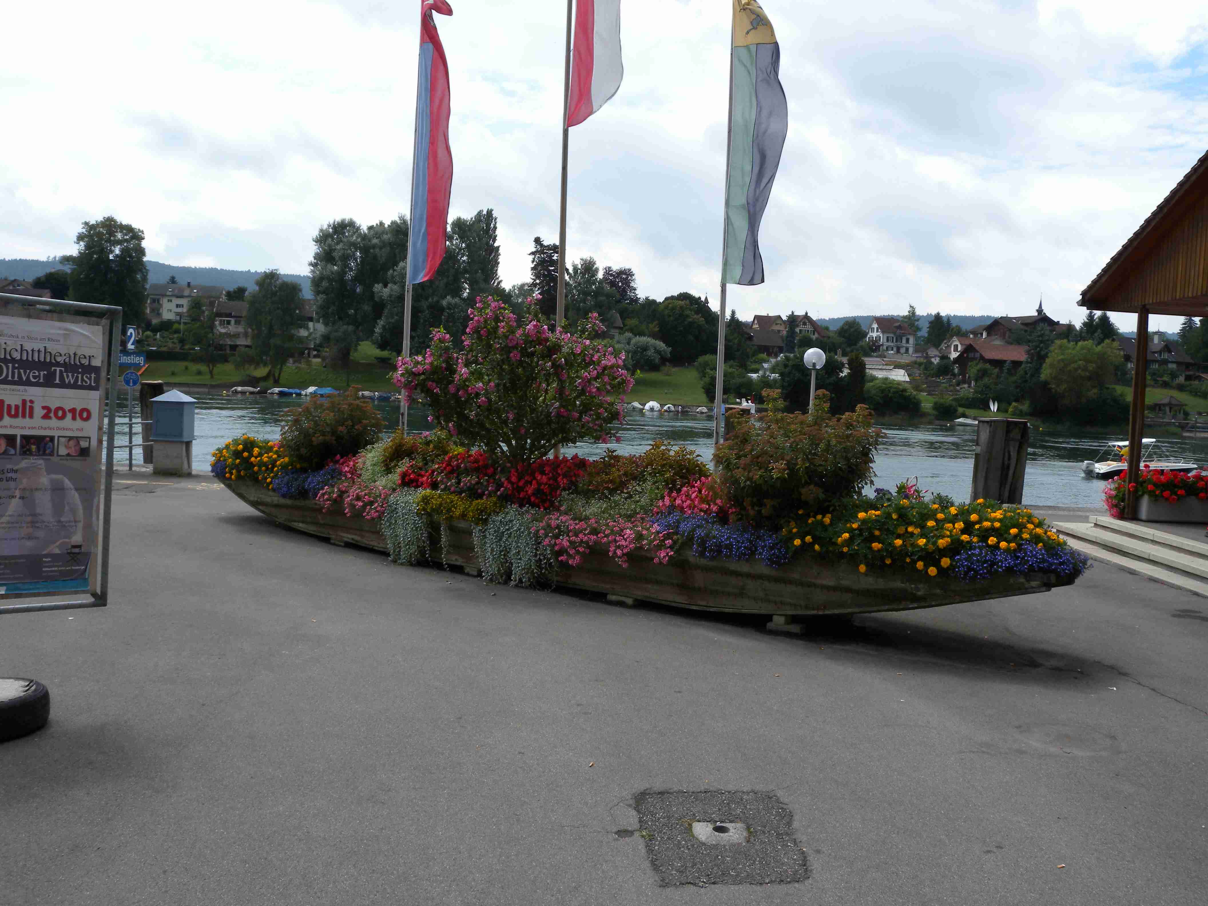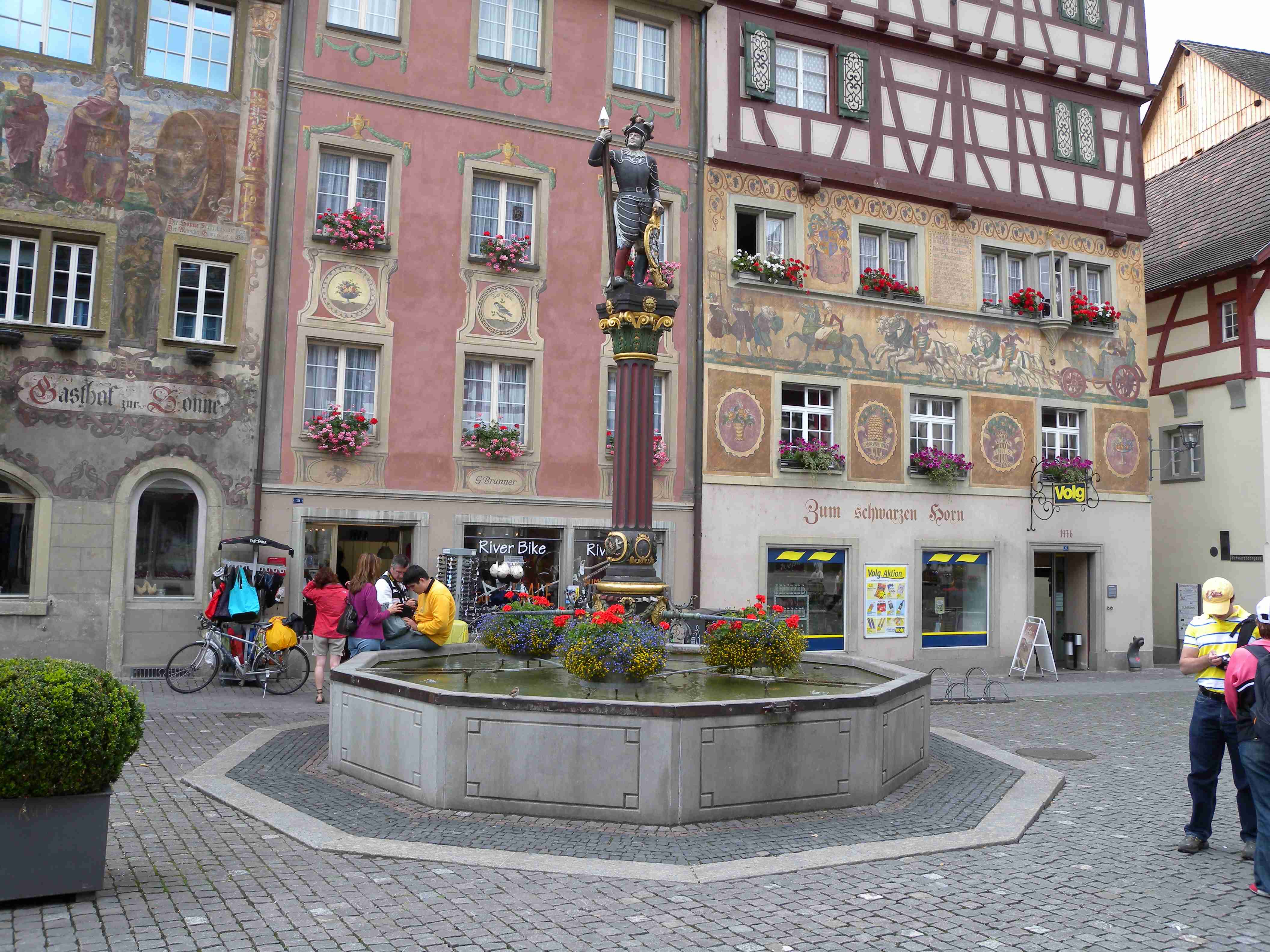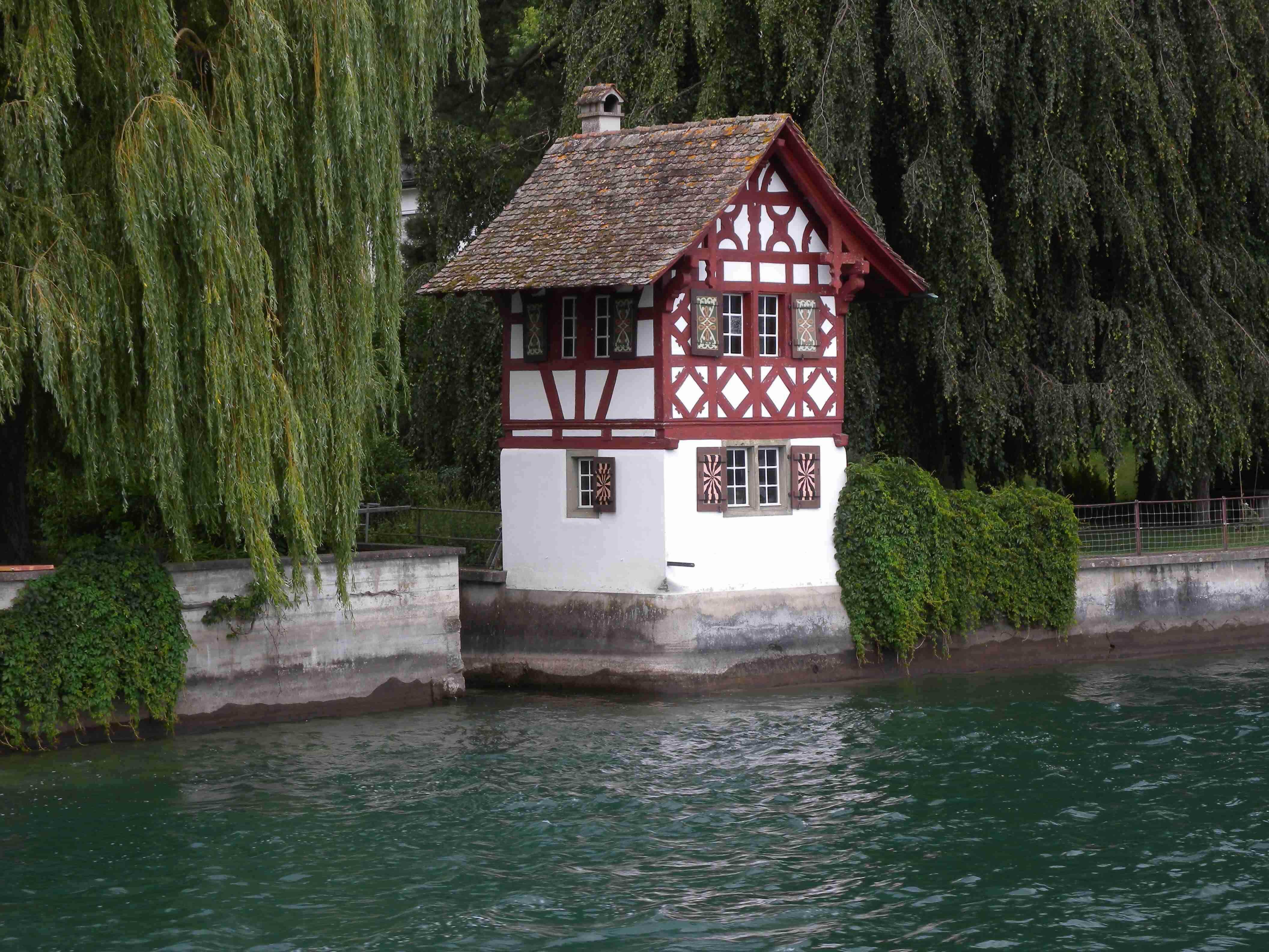 Snídaně byla v 8.00 formou švédského stolu a byla vynikající - čerstvé pečivo, salámy, šunky, zelenina, sýry, no prostě nádhera. Po snídaní breefing, ale počasí nic moc. Přesto jsme se kolem 10.00 vybatolili a asi jako první a jediní jsme vyrazili na dnešní etapu. Drobně pršelo, ale naštěstí, ještě než jsme sjeli dolů do Radolfzell, tak přestalo. Jeli jsme chvíli v opačném směru po včerejsí trase až k nadjezdu nad tratí, pak jsme přejeli na druhou stranu kolejí a kolem nádraží jsme opouštěli město po cyklostezce Radweg lemující jezero, docela dobře značené. Tou jsme jeli na Moos, Iznang, atd., pořád podél jezera. Někde v okolí Gaienhofenu jsme v poledne zastavili na pivo a kafe, právě otvírali a majitelka byla ochotná, upovídaná paní, dozvěděli jsme se, že tady bylo minulý týden také kolem 35°C, současnou teplotu jsem odhadoval na nějakých 22°C. Pokračovali jsme dál, místama jsme museli i do kopce a asi po 13. hodině jsme dorazili do kouzelného, historického městečka Stein am Rhein. Kola jsme zamkli na začátku náměstíčka a prošli jsme se ulicí plnou středověkých domů, boční uličkou jsme došli k jezeru, k přístavu lodí, vzali jsme si jízdní řády a vrátili se ke kolům. Již s koly jsme šli zpět do přístavu s tím, že se naobědváme, ale přád se nám to zdálo docela drahé. Nakonec jsme se i přes tu cenu rozhodli pro hotýlek na konci, kde měli různé druhy salátů. Objednali jsme si pití a jídlo a teprve teď jsme zjistili, že jsme ve Švýcarsku a že ceny jsou ve švýcarských francích. Ne že by to tím tedy bylo levné, ale již to byla přijatelná cena. Já měl salát a rybí prsty, Iva zapečenou zeleninu v kastrůlku - brambory, rajčata a navrchu sýr. Obojí vynikající! Po třetí hodině jsme opustili restauraci, v přístavu akorát otevřeli pokladnu a tak jsme si koupili lístky na ostrov Reichenau. Loď odplouvala v 15.30, seděli jsme na horní, pouze zastřešené palubě, kde se i obsluhovalo a tak jsem si dal pivečko. Cestou to docela foukalo, chvíleni i pršelo, dokonce jsem si vybalil a oblékl nepromokavou bundu, vpředu, kam jsme jeli, to vypadalo černě, ale co se dá dělat. Na Reichenau jsme dorazili přesně v 16.50, je to vlastně poloostrov spojený s pevninou pouze úzkou šíjí a je to ohromná pěstírna zeleniny. Našli jsme cyklostezku a vydali se po ní mezi skleníky a políčky se zeleninou, projeli jsme ostrovem a dlouhou úzkou álejí jsme vjeli zpět na pevninu, kde jsme zatočili doleva. Všude samé louže, což svědčilo o nedávném silném dešti. Dojeli jsme po cyklostezce do městečka Allensbach a odtud jsme již začali stoupat k našemu dočasnému domovu. Ve chvíli, kdy jsme zatáčeli z hlavní silnice k penzionu se opět rozpršelo, takže jsme dorazili právě včas. Bylo 18.18 a měli jsme natočeno 47 km. V penzionu jsme po náležité očistě vyrazili na večeři, já si dal steak se zeleninovým salátem, Iva pouze zeleninový salát - opět bezvadné jídlo. Briefing ve 20.00 byl zhacen autoritativním účastníkem a přesunul se na ráno, večer se dalo do pořádného deště a větru a tak jsme usínali za zvuku tekoucí vody ze střech.