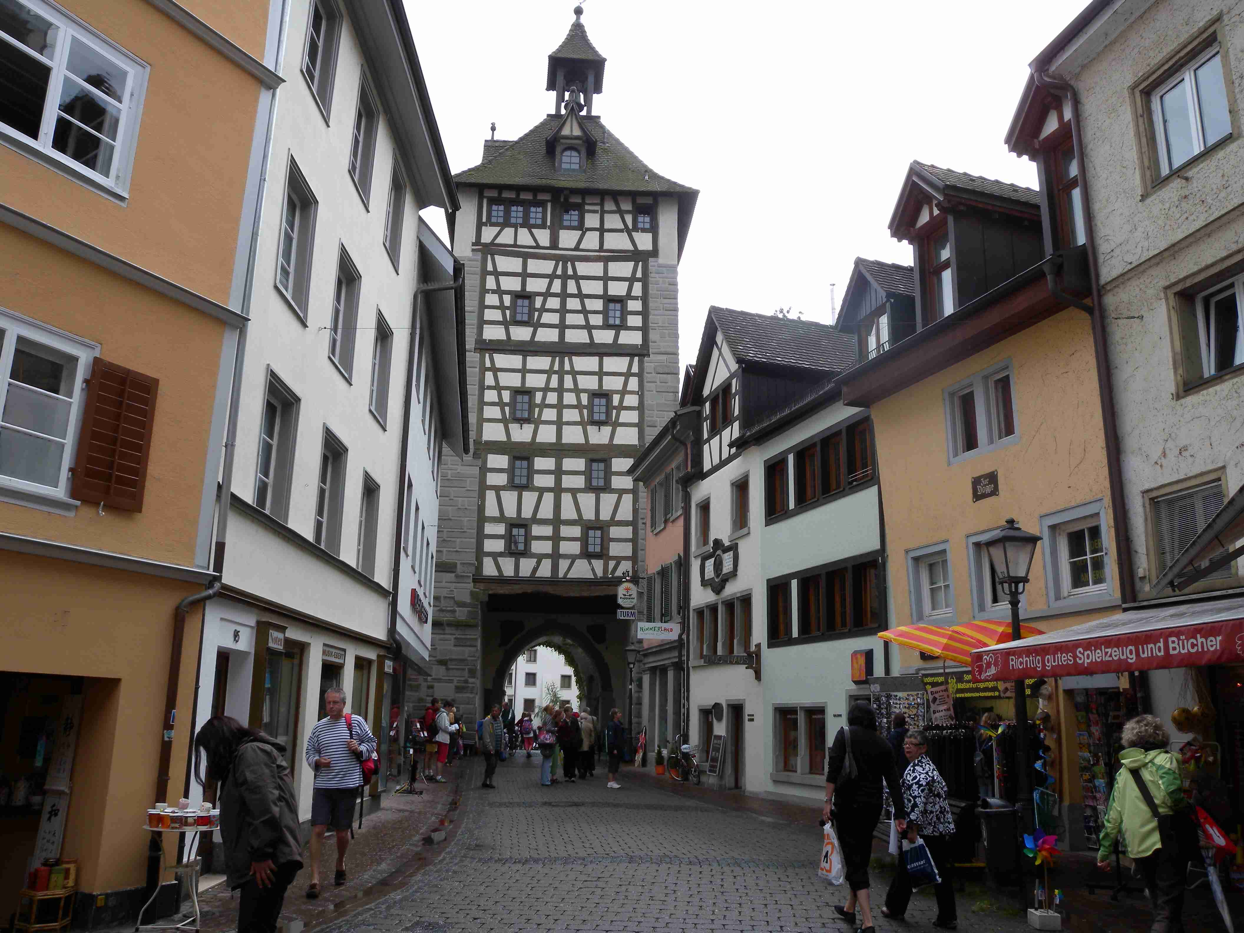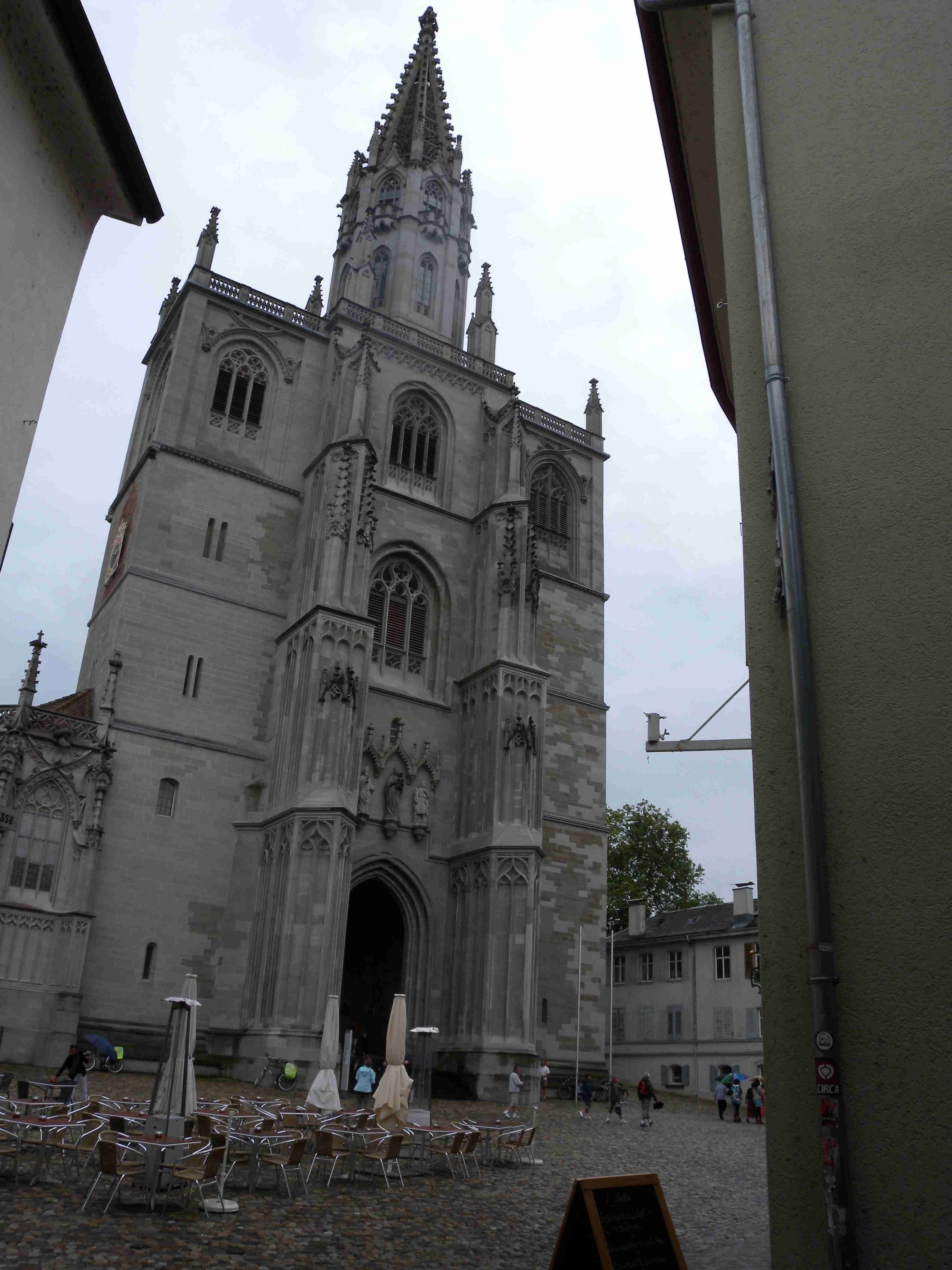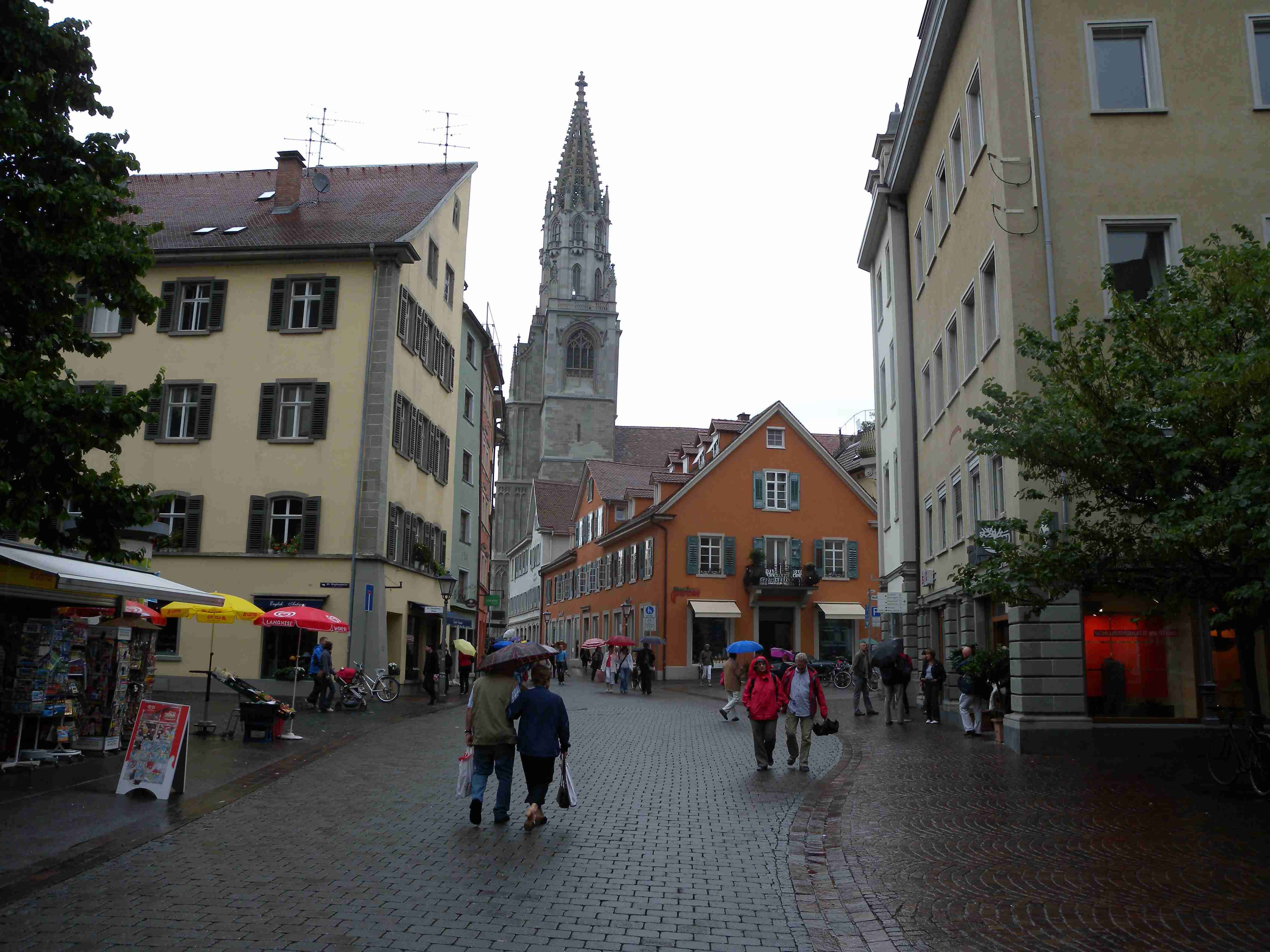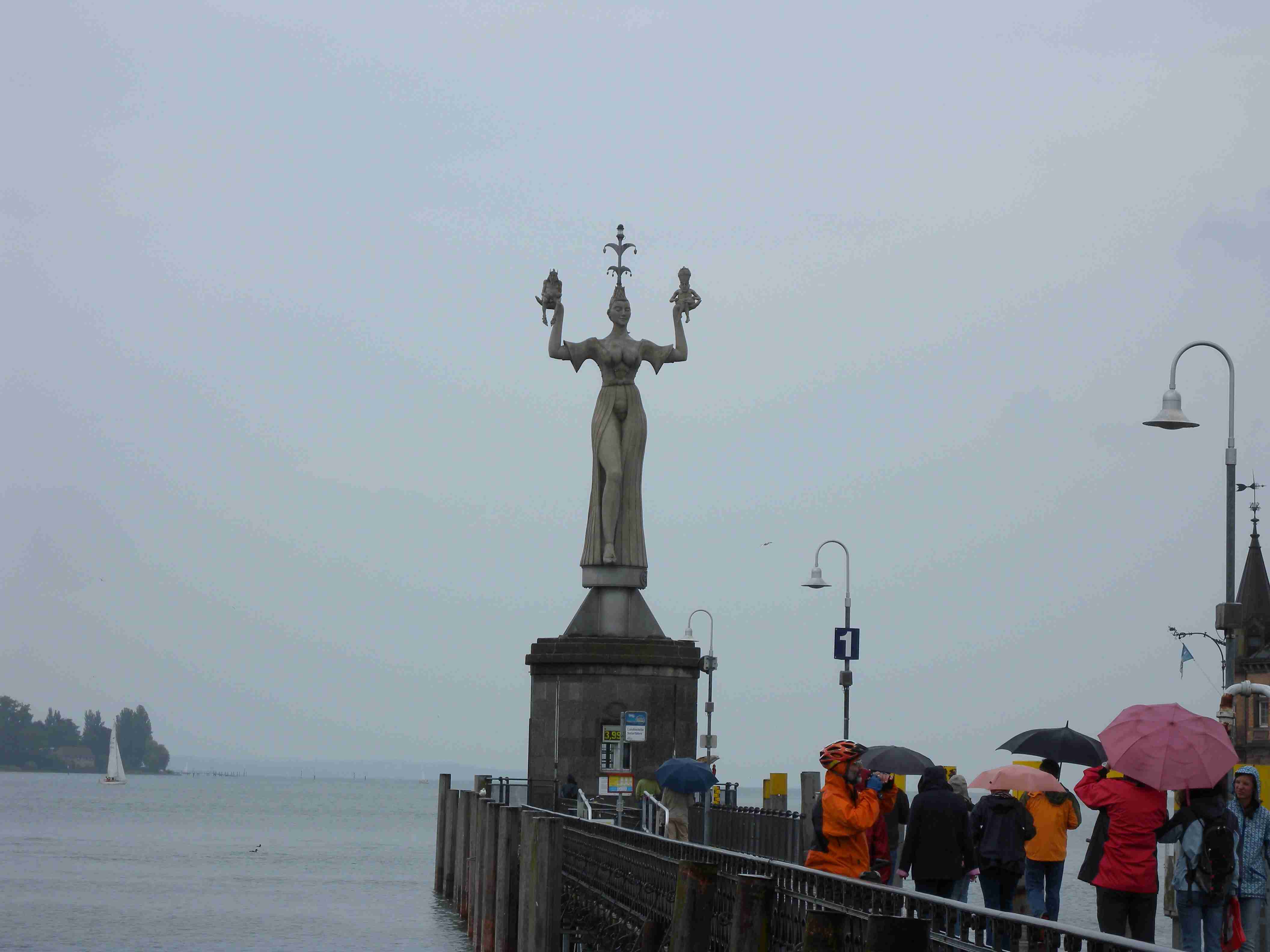 Dnešní den měl být tzv. ostrovní, čekala nás návštěva ostrovů Mainau a Reichenau a mezitím i Konstanz. Po vydatné snídani a nezbytném briefingu jsme po 10. hod. vyrazili na kolech na Kaltbrun, dále na Dettingen, kde se mi podařilo trefit na správnou silničku a v podstatě nejkratší cestou jsme z kopečků sjeli na pobřeží do obce Dingelsdorf a po cyklostezce, která vedla přes největší kopec v okolí, jsme pokračovali na Litzelstetten. Tady jsme již jeli po silnice a přejeli jsme odbočku na cyklostezku na Mainau, takže jsme se kousek museli vracet, abychom dál nejeli po docela frekventované silnici. Ve chvíli, kdy jsme najeli na správnou cyklostezku, narazili jsme na kolegy, kteří trochu bloudili - doteď najeli již 20 km oproti našim 15 km. To už začalo poprchávat a než jsme dojeli na Mainau, tak už slušně pršelo. Ostavili jsme kola a rozhodli se, že chvilku počkáme pod velikou střechou u vstupu, než přestane pršet, protože ostrov Mainau, květinový ostrov, je soukromý a platí se tam vstup 16 Euro za osobu, a to se nám v dešti nechtělo. Koupili jsme si tedy v bufíku pivo a kafe, opět se setkali s našimi kolegy a společně čekali na konec deště. Jenže ten nepřicházel, tak jsme dali ještě jedno, kolegové to vzdali s tím, že jedou přímo domů, a my jsme nakonec návštěvu ostrova rovněž zavrhli a za deště se vydali směrem na Konstanz. Pršelo celou cestu, vjeli jsme do města, náhodou se mi podařilo sjet z hlavní ulice tam, kde jsme potřebovali a v tu chvíli ustal i déšť. Z náměstí Markstätte vedle Münzgasse jsme podešli jak sinici, tak i železnici a ocitli jsme se na molu, na jehož konci stojí symbol Konstanz - socha Imperia. Popošli jsme kousek k ní, setkali se s několika kolegy ze zájezdu, udělali pár fotek a vydali se zpět na náměstí. V centru se lze pohybovat pouze pěšky, nikoliv na kole a tak jsme je celou cestu vedli. Z Münzgasse jsme zamířili na Münsterplatz, kde stojí katedrála. Když jsme již opouštěli i Münster, vzpoměla si Iva na Husův dům a tak jsme se museli vrátit až k Münzgasse, kde jsme již byli a kde začíná Husova ulice. Husův dům je skoro až na konci, našli jsme jej bez problémů, udělali pár fotek a cestou zpět jsme ještě v Husovce chvíli poseděli v hospodě v průjezdu, dali obligátní pivo a kafe a vraceli jsme se ke katedrále. Kousek za ní končila pěší zóna a tak jsme mohli nasednout na kola a dojet k lávce přes průliv, kterým se jezero vlévá do své části zvané Untersee. Přejeli jsme na druhou stranu a zatočili doleva směrem na Reichenau. To jsme již věděli, že Reichenau nestíháme a tak jsme jeli po cyklostezce až k odbočce na ostrov, odkud jsme pokračovali již nám známou stezkou přes Allensbach a poté nahoru do kopečků k penzionu. Cestou občas sprchlo, do penzionu jsme dorazili po 18. hodině, natočeno něco málo přes 40 km. Protože to byl náš poslední večer v tomto penzionu, dali jsme si na rozloučenou dobrou večeři i vzhledem k tomu, že jsme přes den skoro nic nejedli. Já zůstal věren klasice - steak se zeleninovým salátem a Iva si dala místní specialitu - spätzle, oboje bylo vynikající. Večer kolem 20. hodiny byl ještě briefing ohledně zítřejšího přesunu do jiného penzionu a po briefingu jsme ještě poseděli s kolegy u pivečka.
