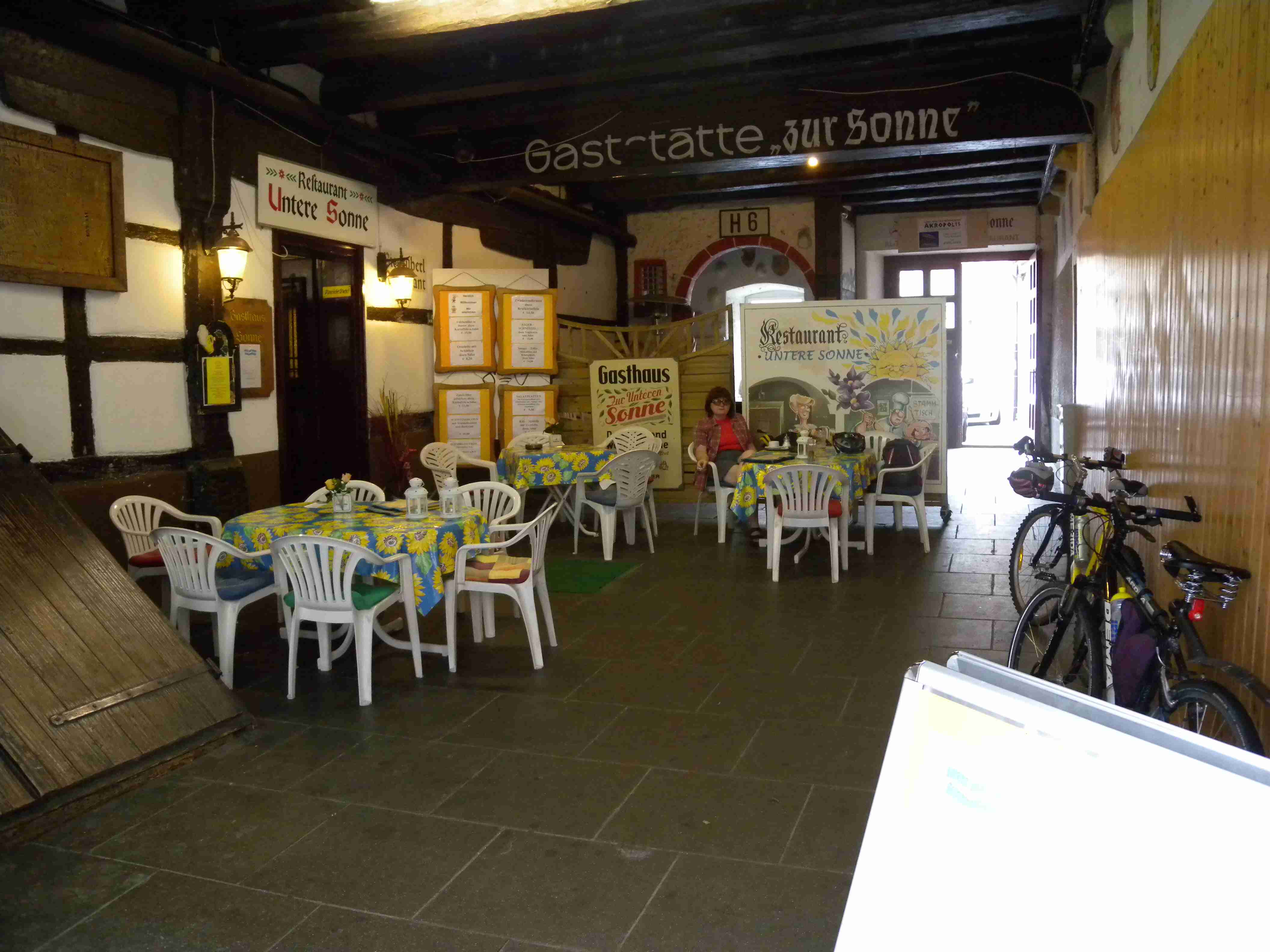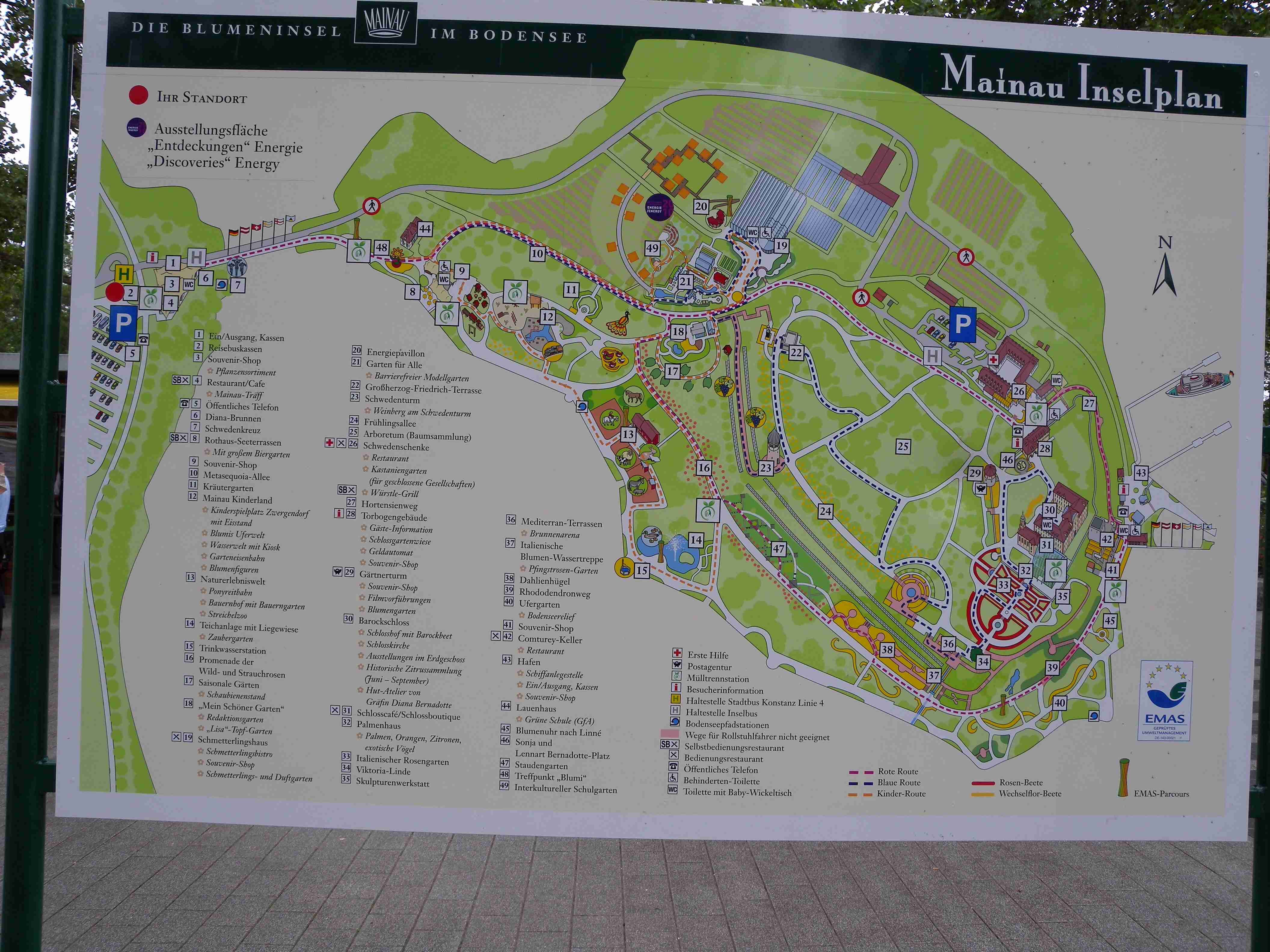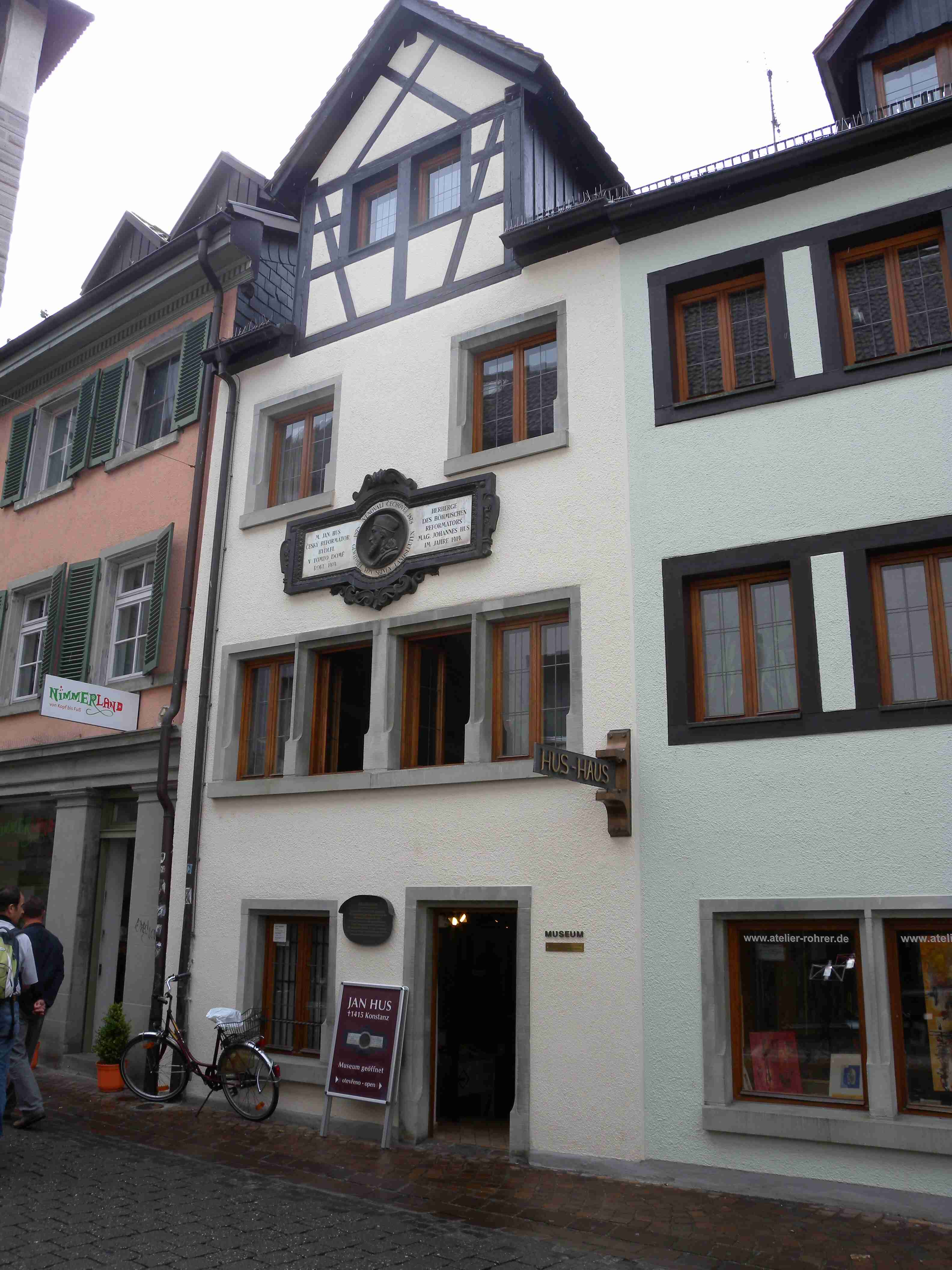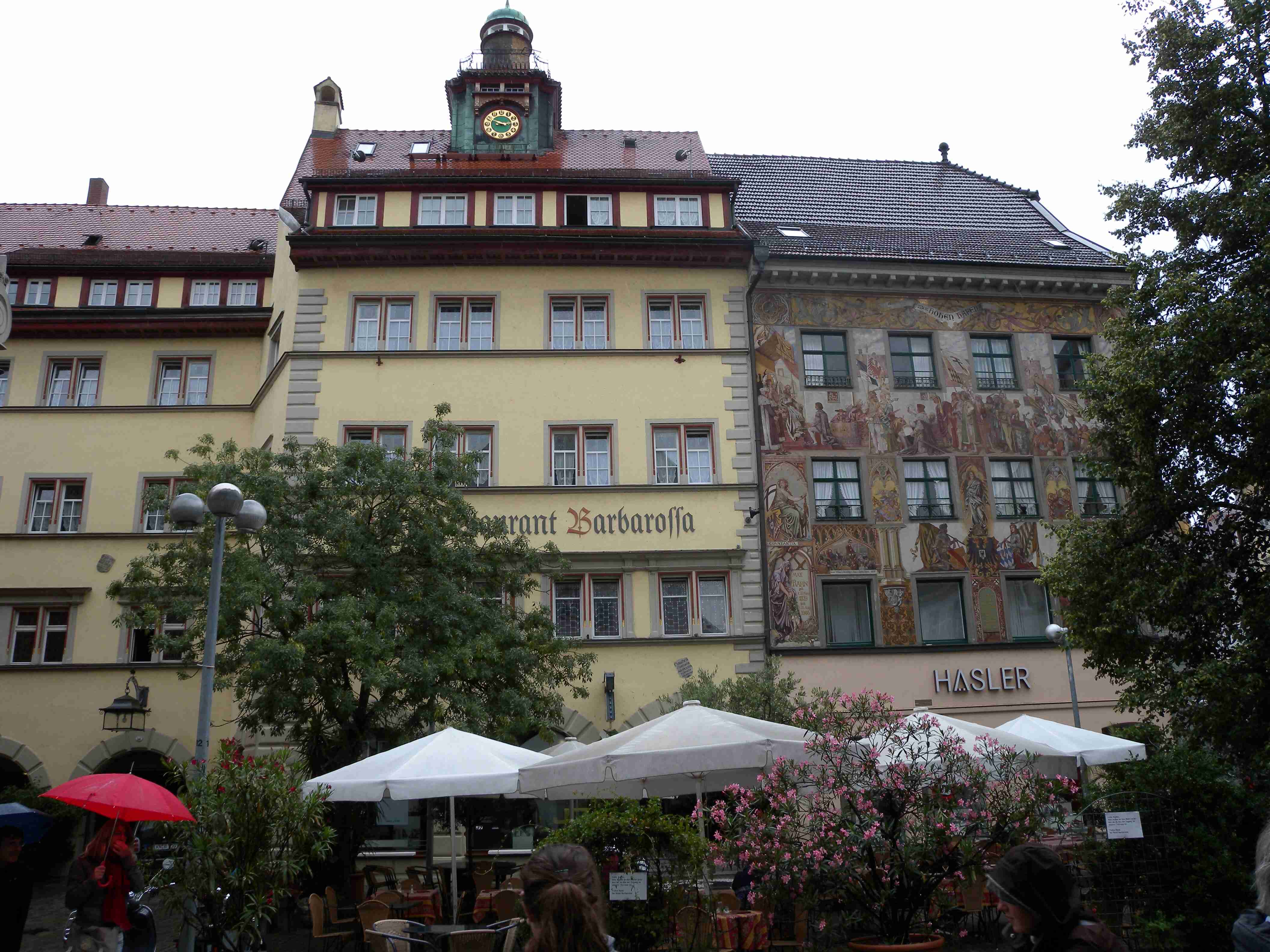 Dnešní den měl být tzv. ostrovní, čekala nás návštěva ostrovů Mainau a Reichenau a mezitím i Konstanz. Po vydatné snídani a nezbytném briefingu jsme po 10. hod. vyrazili na kolech na Kaltbrun, dále na Dettingen, kde se mi podařilo trefit na správnou silničku a v podstatě nejkratší cestou jsme z kopečků sjeli na pobřeží do obce Dingelsdorf a po cyklostezce, která vedla přes největší kopec v okolí, jsme pokračovali na Litzelstetten. Tady jsme již jeli po silnice a přejeli jsme odbočku na cyklostezku na Mainau, takže jsme se kousek museli vracet, abychom dál nejeli po docela frekventované silnici. Ve chvíli, kdy jsme najeli na správnou cyklostezku, narazili jsme na kolegy, kteří trochu bloudili - doteď najeli již 20 km oproti našim 15 km. To už začalo poprchávat a než jsme dojeli na Mainau, tak už slušně pršelo. Ostavili jsme kola a rozhodli se, že chvilku počkáme pod velikou střechou u vstupu, než přestane pršet, protože ostrov Mainau, květinový ostrov, je soukromý a platí se tam vstup 16 Euro za osobu, a to se nám v dešti nechtělo. Koupili jsme si tedy v bufíku pivo a kafe, opět se setkali s našimi kolegy a společně čekali na konec deště. Jenže ten nepřicházel, tak jsme dali ještě jedno, kolegové to vzdali s tím, že jedou přímo domů, a my jsme nakonec návštěvu ostrova rovněž zavrhli a za deště se vydali směrem na Konstanz. Pršelo celou cestu, vjeli jsme do města, náhodou se mi podařilo sjet z hlavní ulice tam, kde jsme potřebovali a v tu chvíli ustal i déšť. Z náměstí Markstätte vedle Münzgasse jsme podešli jak sinici, tak i železnici a ocitli jsme se na molu, na jehož konci stojí symbol Konstanz - socha Imperia. Popošli jsme kousek k ní, setkali se s několika kolegy ze zájezdu, udělali pár fotek a vydali se zpět na náměstí. V centru se lze pohybovat pouze pěšky, nikoliv na kole a tak jsme je celou cestu vedli. Z Münzgasse jsme zamířili na Münsterplatz, kde stojí katedrála. Když jsme již opouštěli i Münster, vzpoměla si Iva na Husův dům a tak jsme se museli vrátit až k Münzgasse, kde jsme již byli a kde začíná Husova ulice. Husův dům je skoro až na konci, našli jsme jej bez problémů, udělali pár fotek a cestou zpět jsme ještě v Husovce chvíli poseděli v hospodě v průjezdu, dali obligátní pivo a kafe a vraceli jsme se ke katedrále. Kousek za ní končila pěší zóna a tak jsme mohli nasednout na kola a dojet k lávce přes průliv, kterým se jezero vlévá do své části zvané Untersee. Přejeli jsme na druhou stranu a zatočili doleva směrem na Reichenau. To jsme již věděli, že Reichenau nestíháme a tak jsme jeli po cyklostezce až k odbočce na ostrov, odkud jsme pokračovali již nám známou stezkou přes Allensbach a poté nahoru do kopečků k penzionu. Cestou občas sprchlo, do penzionu jsme dorazili po 18. hodině, natočeno něco málo přes 40 km. Protože to byl náš poslední večer v tomto penzionu, dali jsme si na rozloučenou dobrou večeři i vzhledem k tomu, že jsme přes den skoro nic nejedli. Já zůstal věren klasice - steak se zeleninovým salátem a Iva si dala místní specialitu - spätzle, oboje bylo vynikající. Večer kolem 20. hodiny byl ještě briefing ohledně zítřejšího přesunu do jiného penzionu a po briefingu jsme ještě poseděli s kolegy u pivečka.