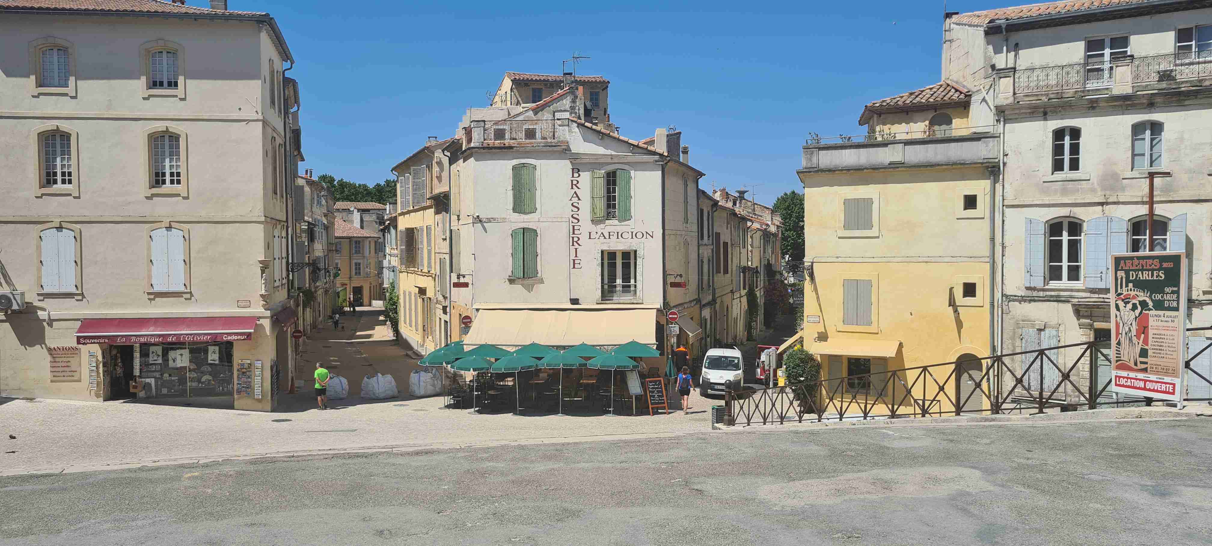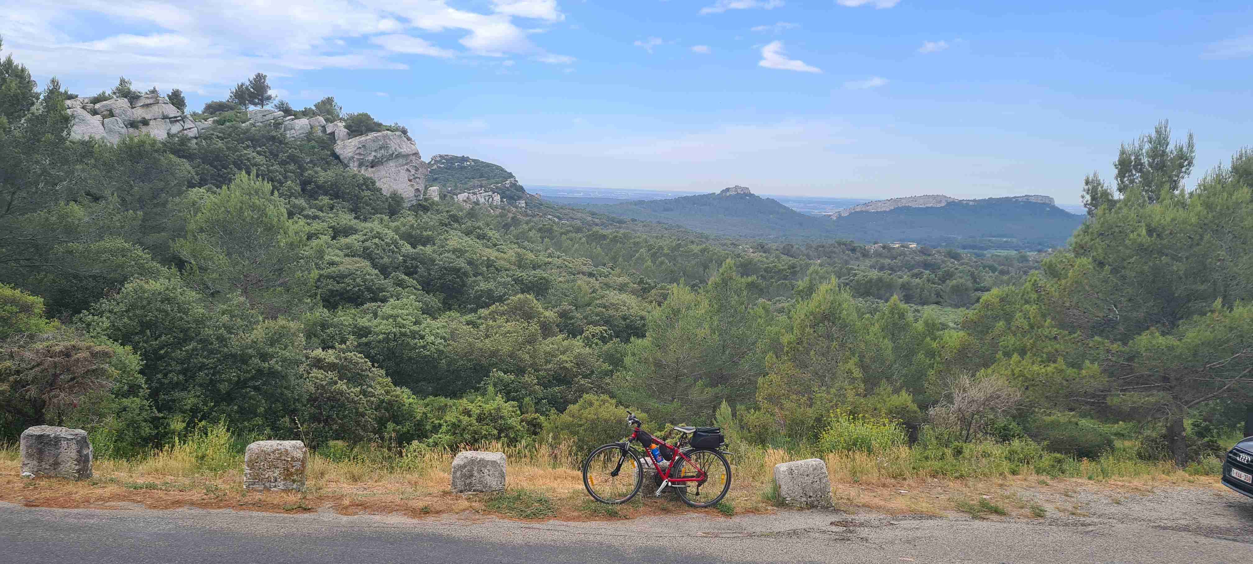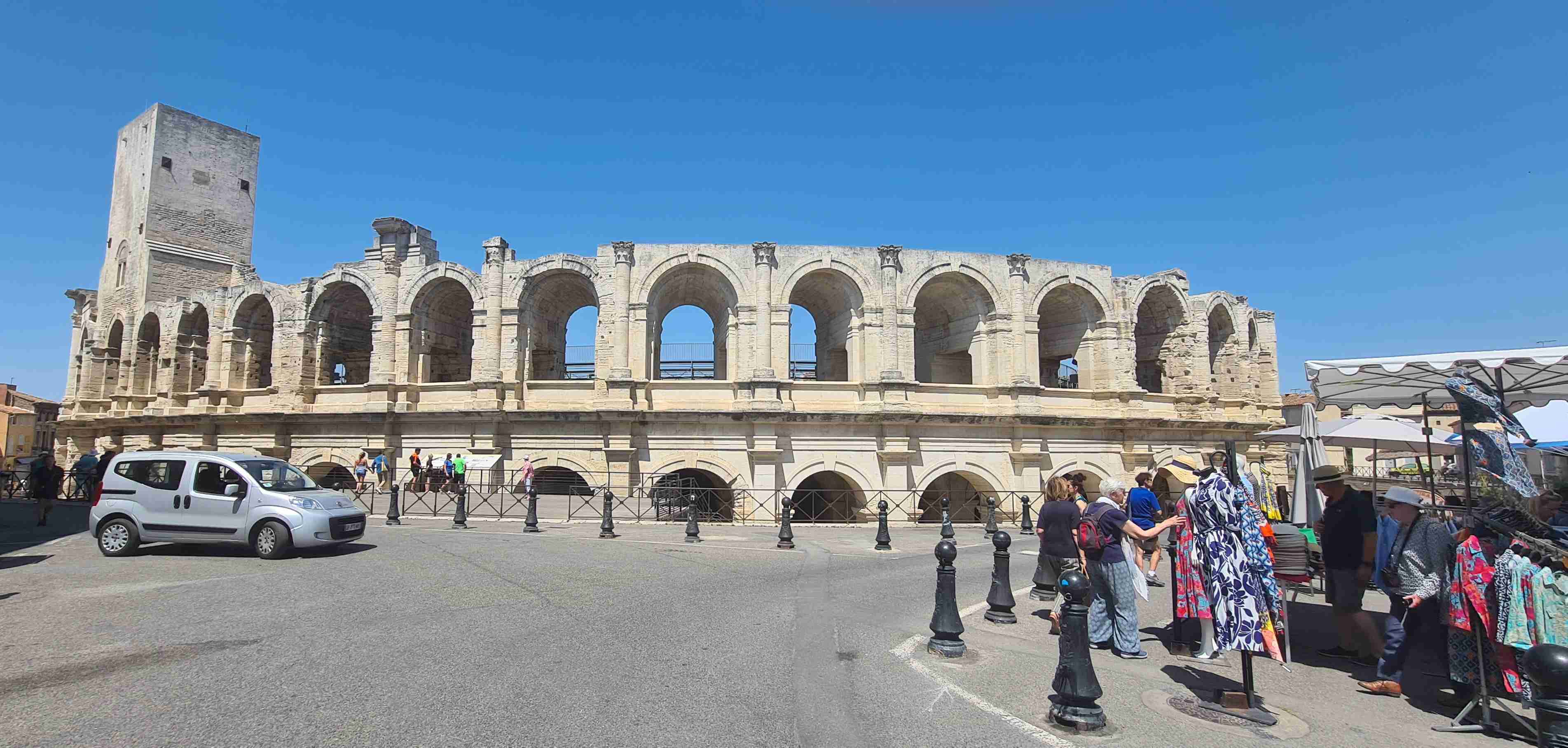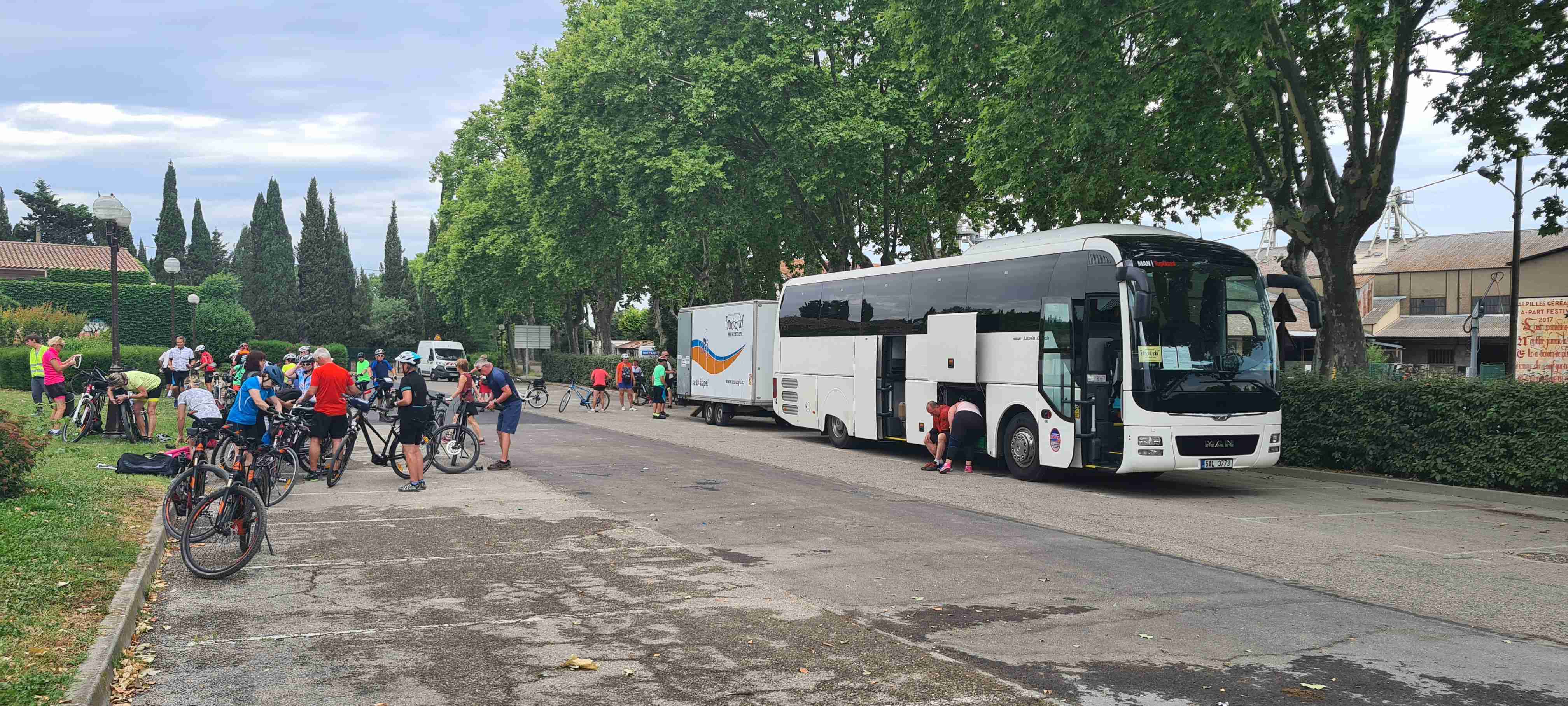 Asi hodinu jsme jeli do městečka Saint Etienne du Gres, tady jsme nasedli na kola a prvních 5 km do mírného kopečka po cestě lemované stromy a občas i pěknými usedlostmi. Když jsme dorazili k hlavní sinici zatočili jsme doprava a začali stoupat až do sedla, kde jsme ještě odbočili na vyhlídku a asi 1 km vyšlapali do prudkého kopce. Pár fotek a zpět na hlavní a z kopečka do městečka Les Baux de Provence. Kola jsme zamknuli hned u vstupu do městečka a šli jsme jenom kousek – tady jsme byli již potřetí, ale na hradě ještě nikdy, a i tentokrát jsme si ho odpustili. Ani jsme si nikde nic nedali, vrátili jsme se ke kolům a sjeli jsme z kopce dolů do Paradou, kde měla být hospoda. Tu jsme sice našli, ale zavřenou, a tak jsme po rovině pomalu pokračovali k autobusu, který na nás čekal na parkovišti u Daudetova mlýna. Zašli jsme si ho vyfotit, i tady jsme již dvakrát byli, stejně jako v Arles, kam jsme se přesunuli autobusem. Já vyrazil na prohlídku dle mapky. Iva šla něco málo nakoupit do obchoďáku nedaleko autobusu. Prošel jsme trasu dle pokynů, kolem katedrály sv. Trofima na Náměstí Republiky, kolem vykopávek a antického divadla, v parku vedle jsem vyfotil bustu Vincenta van Gogha, zastavil jsme se před jeho oblíbenou kavárnou a vrcholem pak byla římská aréna, dodnes používaná jak pro býčí zápasy, tak i pro různá kulturní představení. Od arény jsem pak již zamířil k autobusu, zavolal jsem Ivě, která končila nákup a sešli jsme se v zahradní restauraci a dali si pivo. Na nábřeží čekal rozpálený autobus, bazén jsem v pohodě stíhal, najeto cca 26 km, nachozeno cca 5 km, k večeři jsme měli lososa s rizotem.