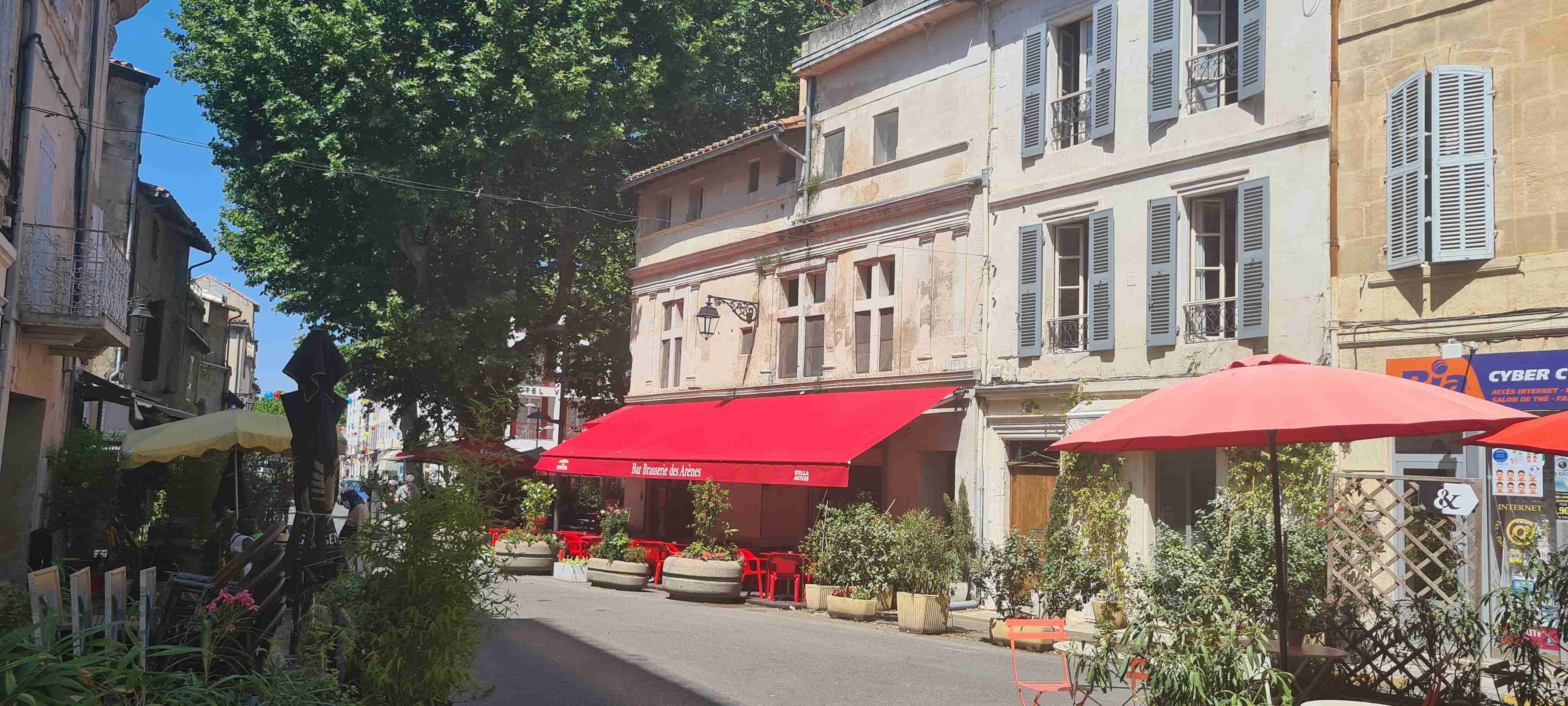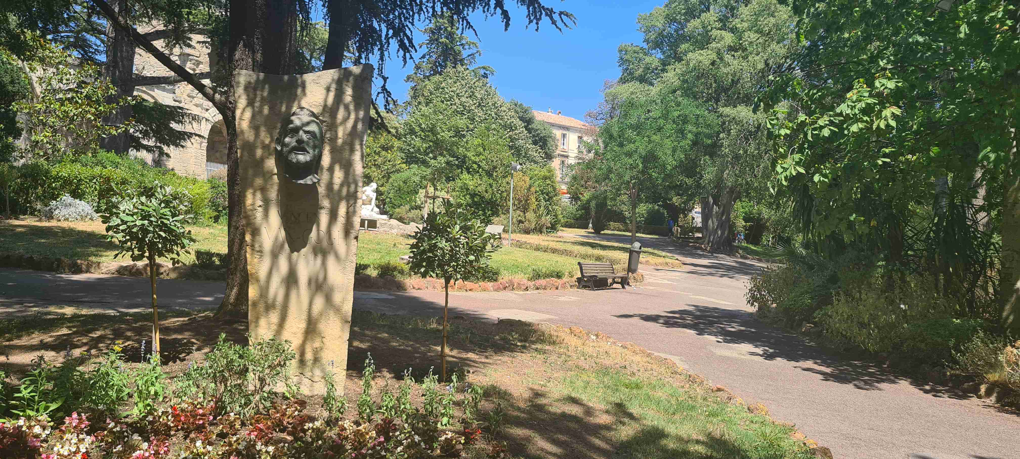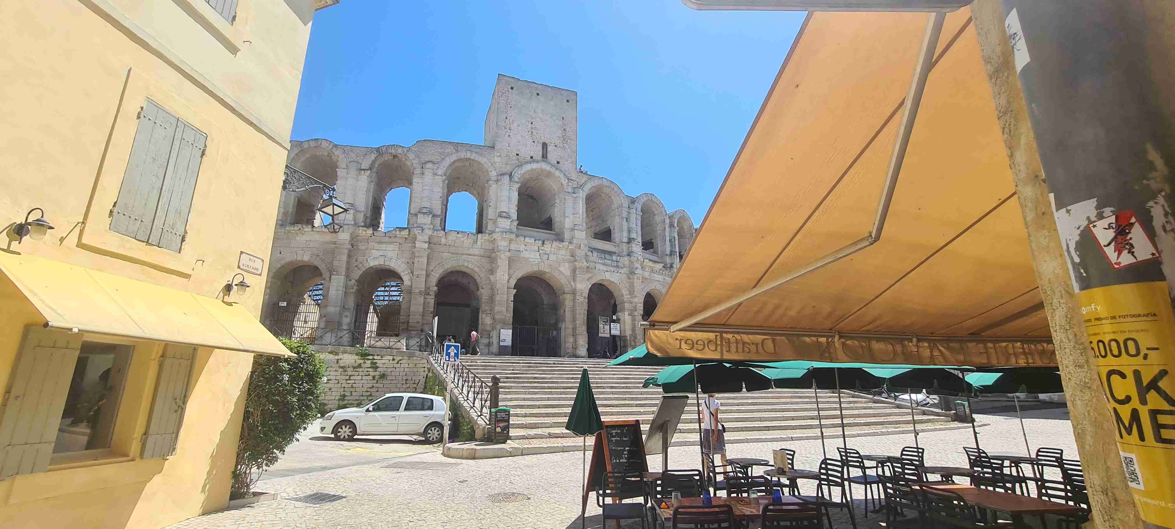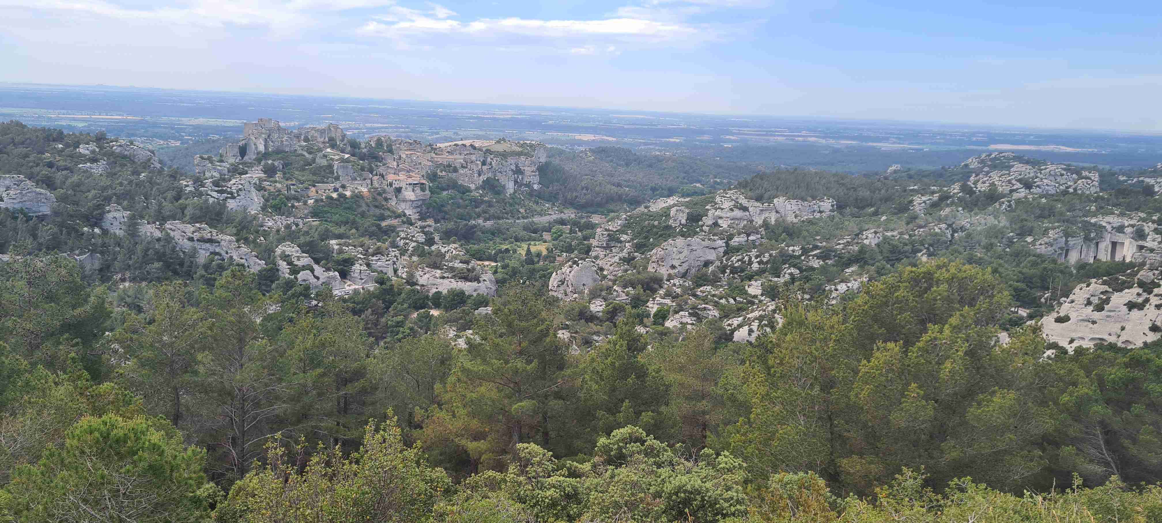 Asi hodinu jsme jeli do městečka Saint Etienne du Gres, tady jsme nasedli na kola a prvních 5 km do mírného kopečka po cestě lemované stromy a občas i pěknými usedlostmi. Když jsme dorazili k hlavní sinici zatočili jsme doprava a začali stoupat až do sedla, kde jsme ještě odbočili na vyhlídku a asi 1 km vyšlapali do prudkého kopce. Pár fotek a zpět na hlavní a z kopečka do městečka Les Baux de Provence. Kola jsme zamknuli hned u vstupu do městečka a šli jsme jenom kousek – tady jsme byli již potřetí, ale na hradě ještě nikdy, a i tentokrát jsme si ho odpustili. Ani jsme si nikde nic nedali, vrátili jsme se ke kolům a sjeli jsme z kopce dolů do Paradou, kde měla být hospoda. Tu jsme sice našli, ale zavřenou, a tak jsme po rovině pomalu pokračovali k autobusu, který na nás čekal na parkovišti u Daudetova mlýna. Zašli jsme si ho vyfotit, i tady jsme již dvakrát byli, stejně jako v Arles, kam jsme se přesunuli autobusem. Já vyrazil na prohlídku dle mapky. Iva šla něco málo nakoupit do obchoďáku nedaleko autobusu. Prošel jsme trasu dle pokynů, kolem katedrály sv. Trofima na Náměstí Republiky, kolem vykopávek a antického divadla, v parku vedle jsem vyfotil bustu Vincenta van Gogha, zastavil jsme se před jeho oblíbenou kavárnou a vrcholem pak byla římská aréna, dodnes používaná jak pro býčí zápasy, tak i pro různá kulturní představení. Od arény jsem pak již zamířil k autobusu, zavolal jsem Ivě, která končila nákup a sešli jsme se v zahradní restauraci a dali si pivo. Na nábřeží čekal rozpálený autobus, bazén jsem v pohodě stíhal, najeto cca 26 km, nachozeno cca 5 km, k večeři jsme měli lososa s rizotem.