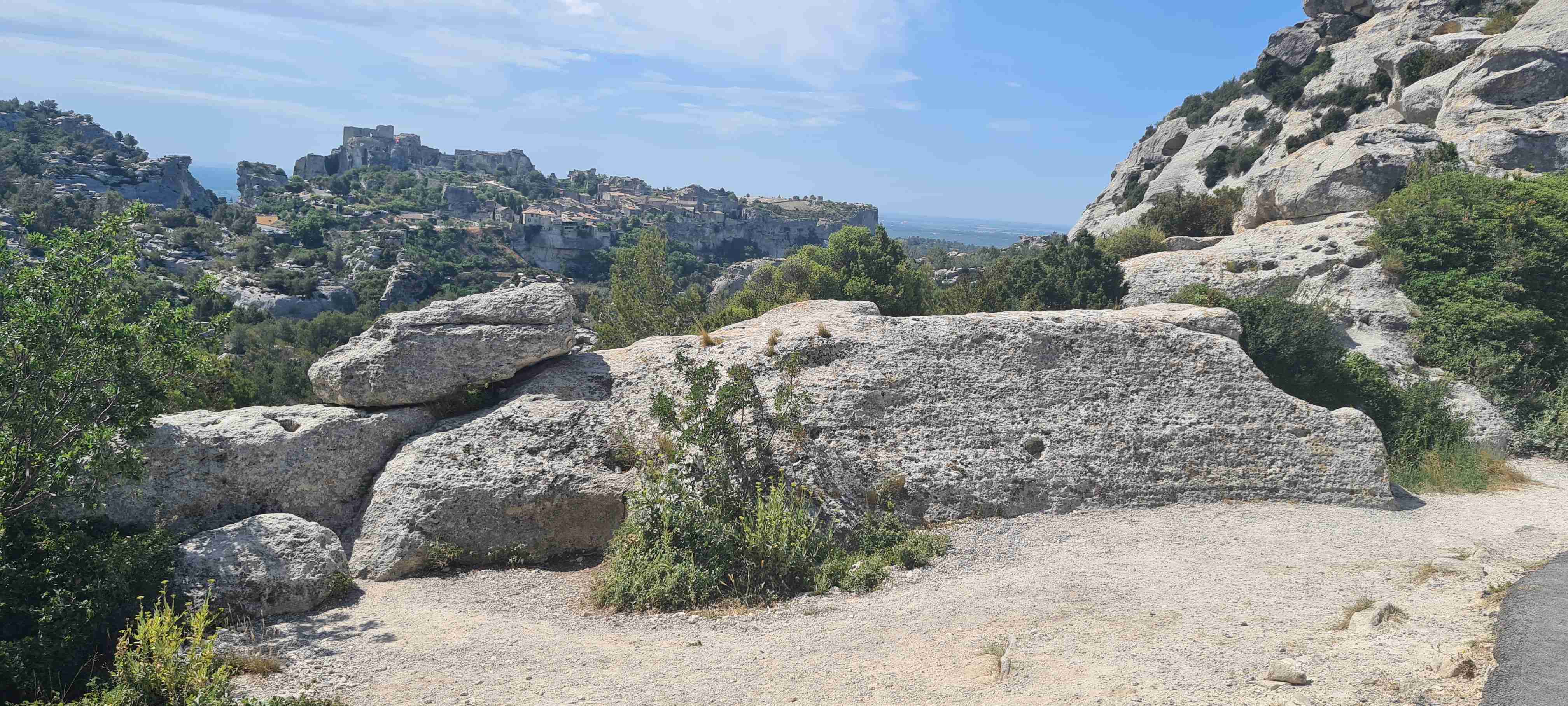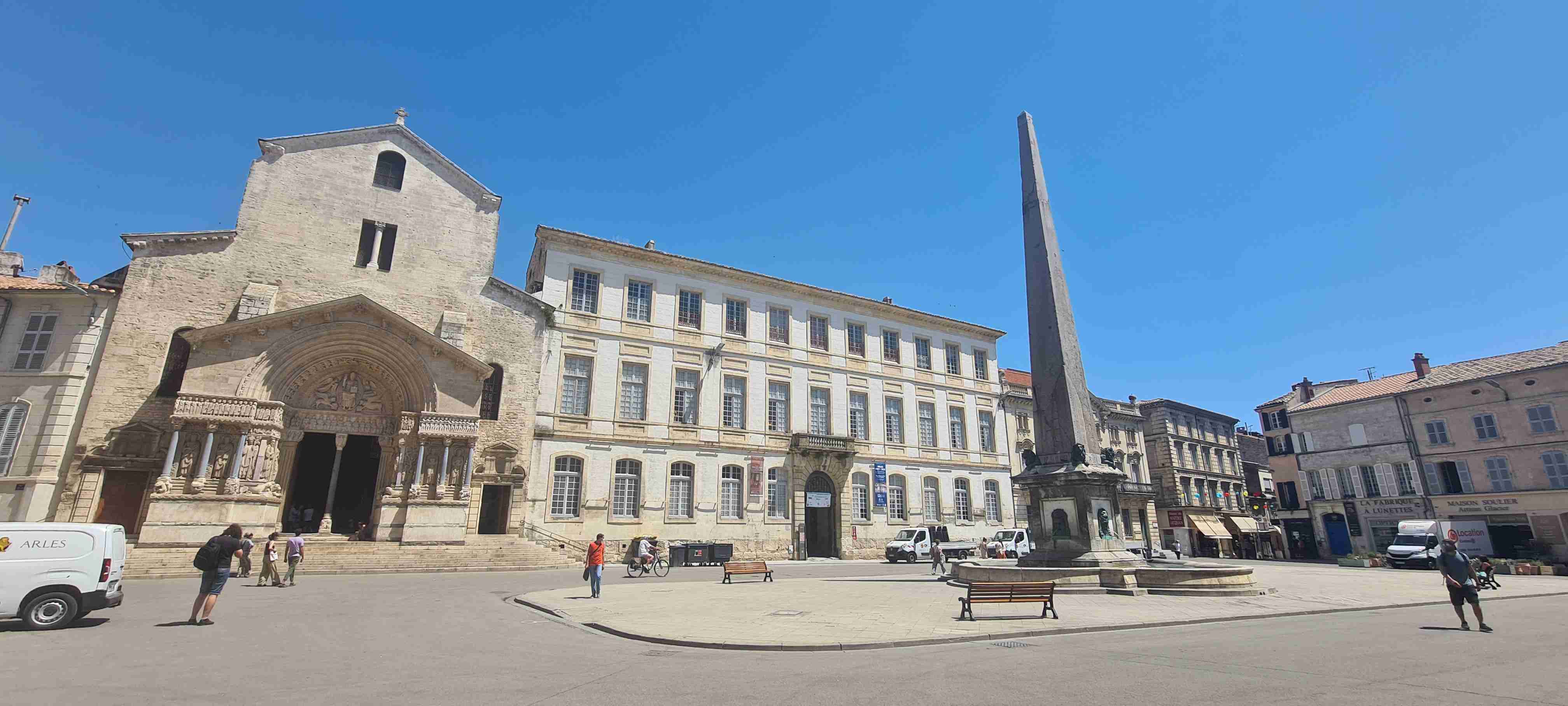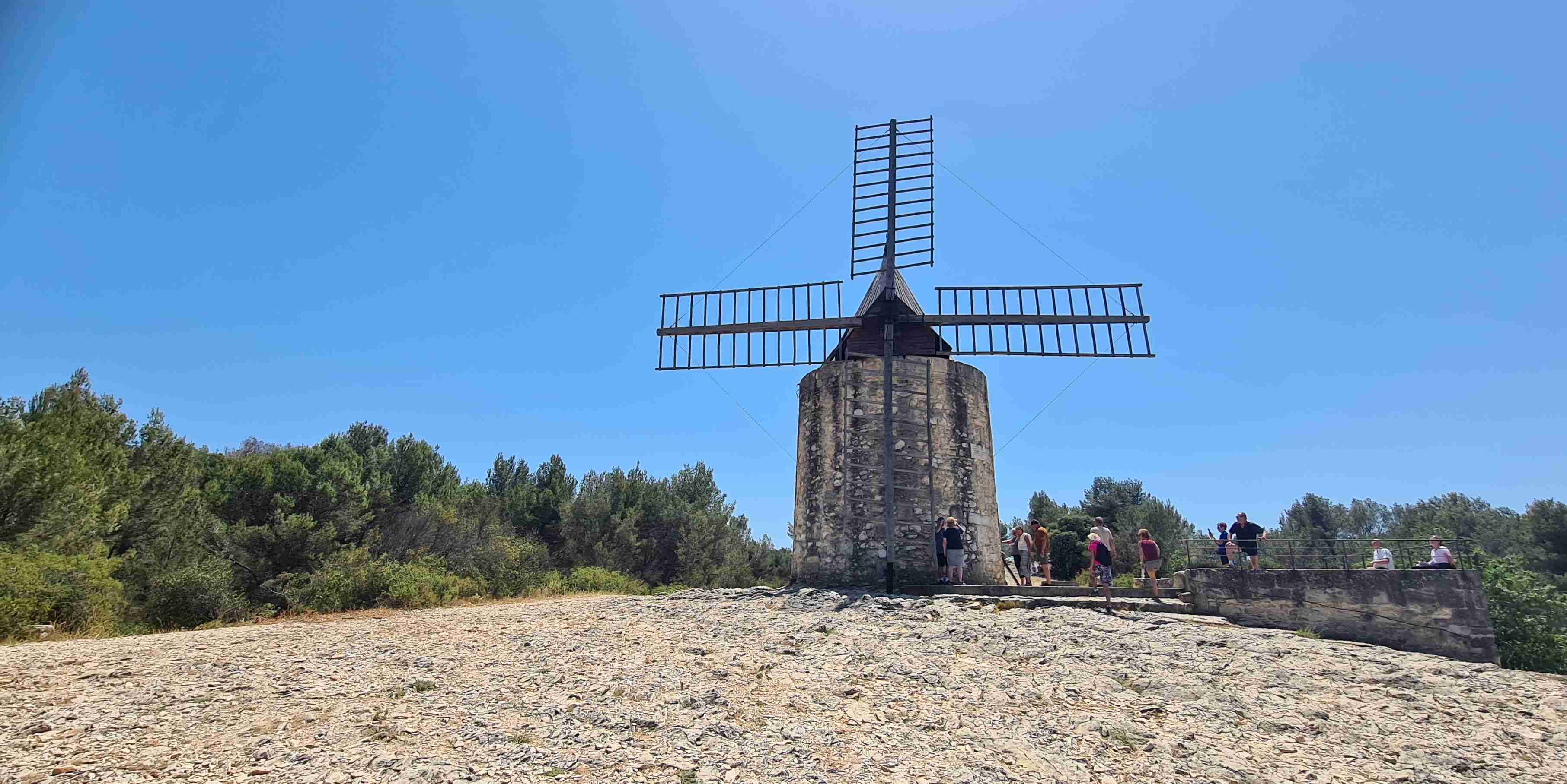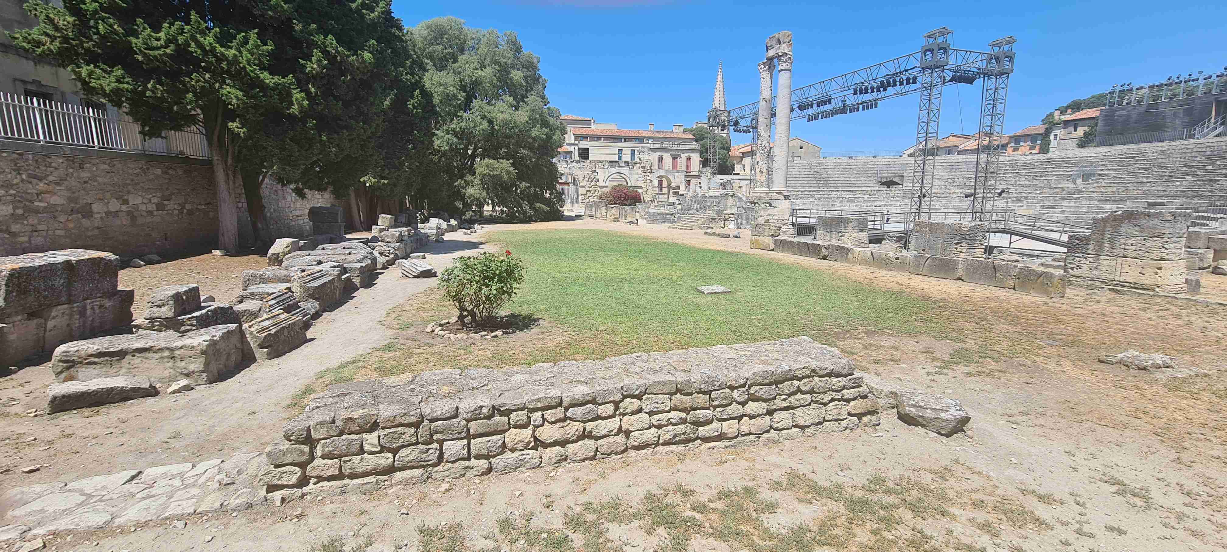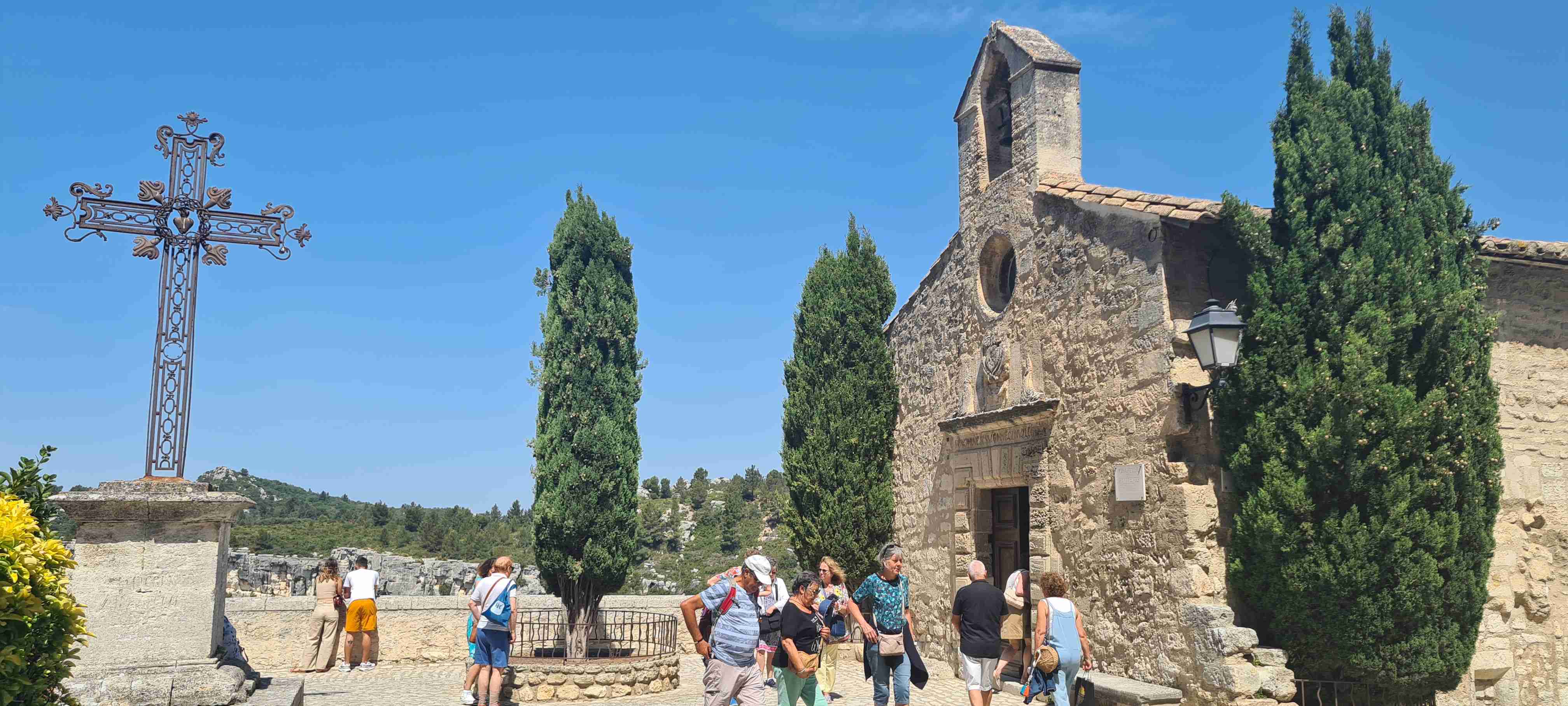 Asi hodinu jsme jeli do městečka Saint Etienne du Gres, tady jsme nasedli na kola a prvních 5 km do mírného kopečka po cestě lemované stromy a občas i pěknými usedlostmi. Když jsme dorazili k hlavní sinici zatočili jsme doprava a začali stoupat až do sedla, kde jsme ještě odbočili na vyhlídku a asi 1 km vyšlapali do prudkého kopce. Pár fotek a zpět na hlavní a z kopečka do městečka Les Baux de Provence. Kola jsme zamknuli hned u vstupu do městečka a šli jsme jenom kousek – tady jsme byli již potřetí, ale na hradě ještě nikdy, a i tentokrát jsme si ho odpustili. Ani jsme si nikde nic nedali, vrátili jsme se ke kolům a sjeli jsme z kopce dolů do Paradou, kde měla být hospoda. Tu jsme sice našli, ale zavřenou, a tak jsme po rovině pomalu pokračovali k autobusu, který na nás čekal na parkovišti u Daudetova mlýna. Zašli jsme si ho vyfotit, i tady jsme již dvakrát byli, stejně jako v Arles, kam jsme se přesunuli autobusem. Já vyrazil na prohlídku dle mapky. Iva šla něco málo nakoupit do obchoďáku nedaleko autobusu. Prošel jsme trasu dle pokynů, kolem katedrály sv. Trofima na Náměstí Republiky, kolem vykopávek a antického divadla, v parku vedle jsem vyfotil bustu Vincenta van Gogha, zastavil jsme se před jeho oblíbenou kavárnou a vrcholem pak byla římská aréna, dodnes používaná jak pro býčí zápasy, tak i pro různá kulturní představení. Od arény jsem pak již zamířil k autobusu, zavolal jsem Ivě, která končila nákup a sešli jsme se v zahradní restauraci a dali si pivo. Na nábřeží čekal rozpálený autobus, bazén jsem v pohodě stíhal, najeto cca 26 km, nachozeno cca 5 km, k večeři jsme měli lososa s rizotem.