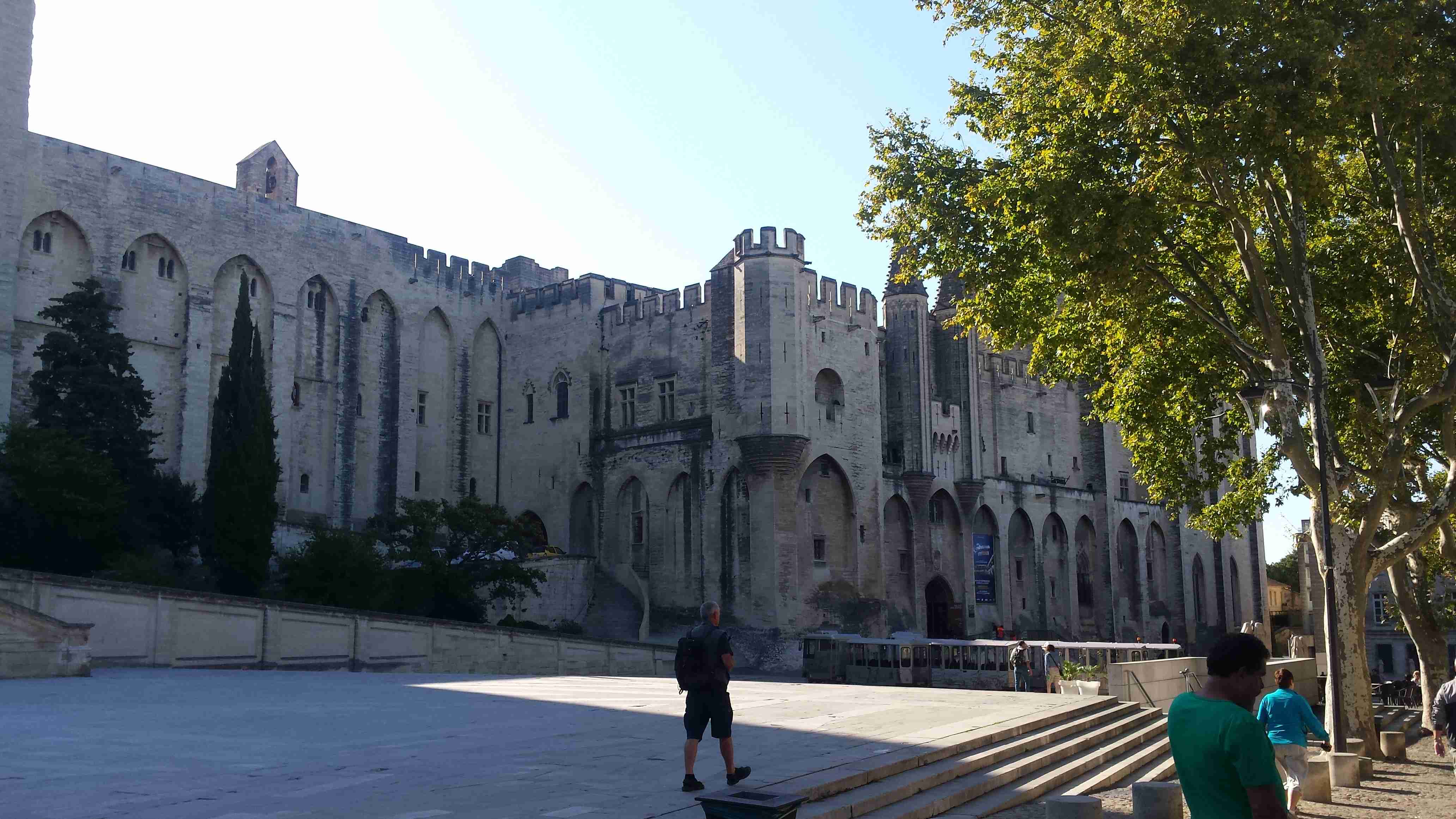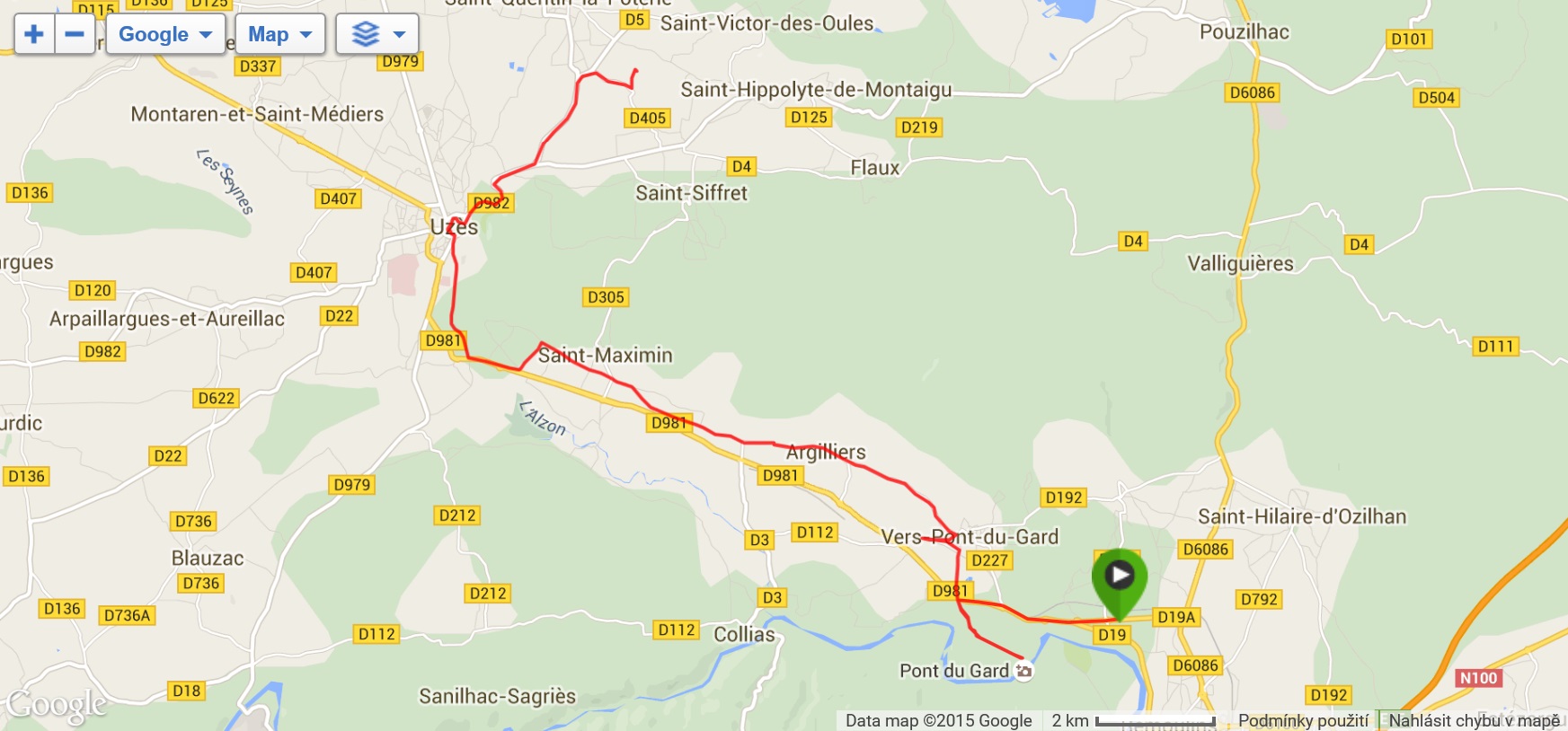 Ráno jsme vyjeli autobusem až v 9 hodin oblečeni do civilu, neboť nás čekala jako první návštěva Avignonu. Autobus zaparkoval u hradeb, do města jsme vstoupili branou Porte du Rhone, došli jsme společně uličkami k ještě nezaplněnému Place du Palais před papežským palácem, odtud potom po schodech nahoru do zahrad, odkud je vidět jak avignonský most sv. Benezeta, tak i v dáli Chateauneuf du Pape. Vrátili jsme se k paláci a po rozchodu jsme s Ivou zamířili po Rue de la Republique na Guinesse do Irish Pubu O’Neil’s abychom zavzpomínali na naší minulou návštěvu na stejném místě před 8 roky, tehdy ještě se Zdeňkem a Marcelou. Cestou zpět jsme se zastavili v infocentru, ve veliké prodejně kosmetiky, koupili jsme ještě nějaké drobnosti a pak již cesta autobusem na start dnešní krátké etapy. Autobus nás vysadil kousek před obcí Les Codes, pár kilometrů jsme museli jet po hlavní silnici, ze které jsme odbočili doleva na utajenou cestu vedoucí k Pont du Gard – oficiální vstup k akvaduktu je nehorázně zpoplatněn, proto ta boční silnička z jiné strany. U akvaduktu jsme již také byli při naší minulé návštěvě, přesto jsme se po něm prošli a udělali spoustu fotek ze všech stran. Když jsme se dost pokochali, vzali jsme si kola a vyrazili na cestu. Vrátili jsme se k hlavní silnici, tu jsme však přejeli na druhou stranu a po vesnických silničkách rovnoběžných s hlavní jsme se blížili k Uzés. Těsně před městem jsme se na chvilku vrátili na hlavní, ale jen co jsme po mostě přejeli přes řeku, hned jsme zase odbočili na vedlejší silničku. Do města jsme museli vyjet do poměrně prudkého kopce, ale nebylo to naštěstí dlouhé. Město samotné je středověké a lehce se v něm zabloudí. Na náměstí pod platany jsme si dali víno, připojili se k nám i naši sousedi z autobusu. Po posezení jsme ještě prošli městem, našli jsme tu správnou silnici a vyrazili do kempu, který byl vzdálen cca 5 km. Pouze 25 km, ale hodně poznávací. K večeři byla paella a bylo to žrádlo.