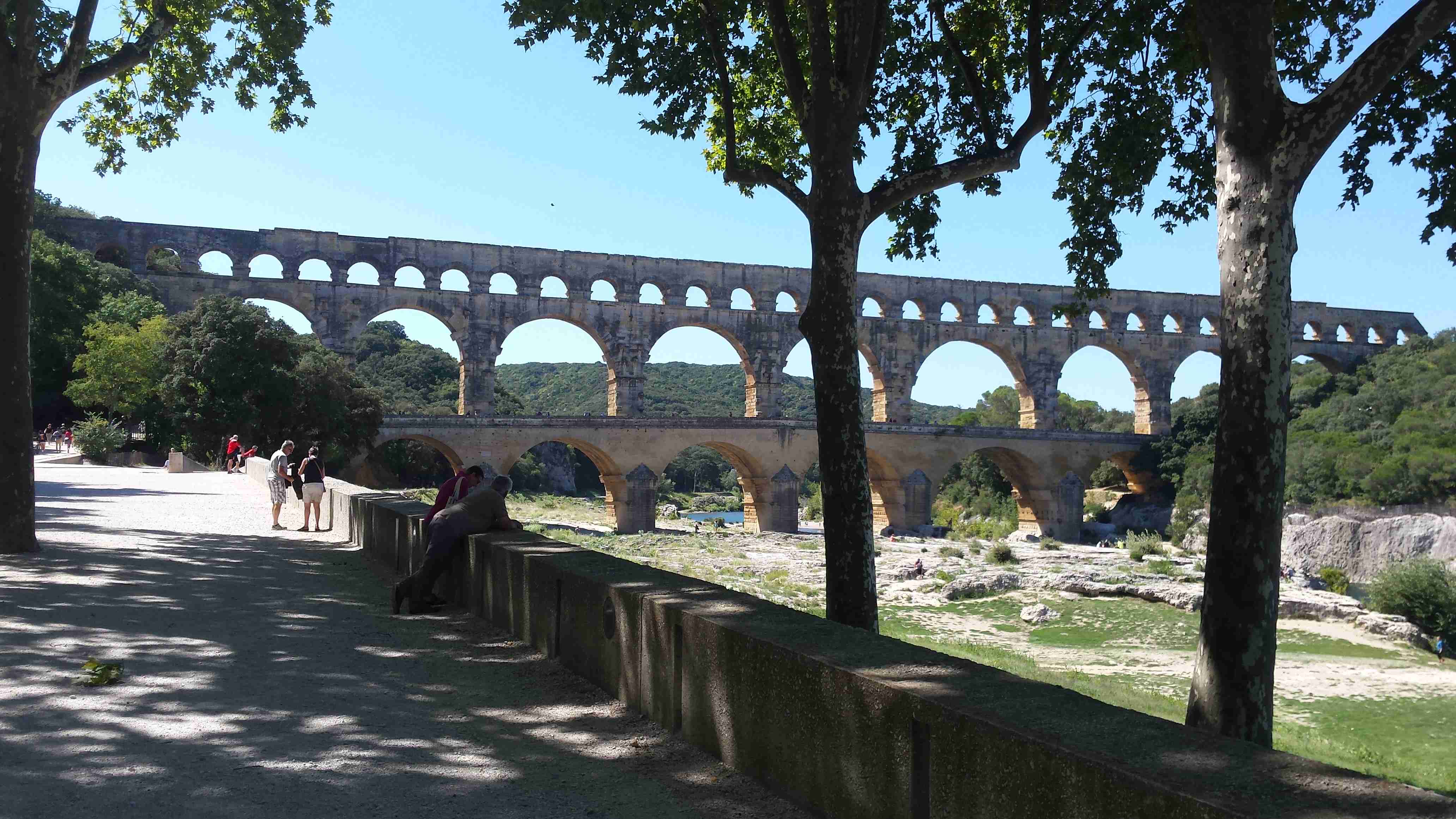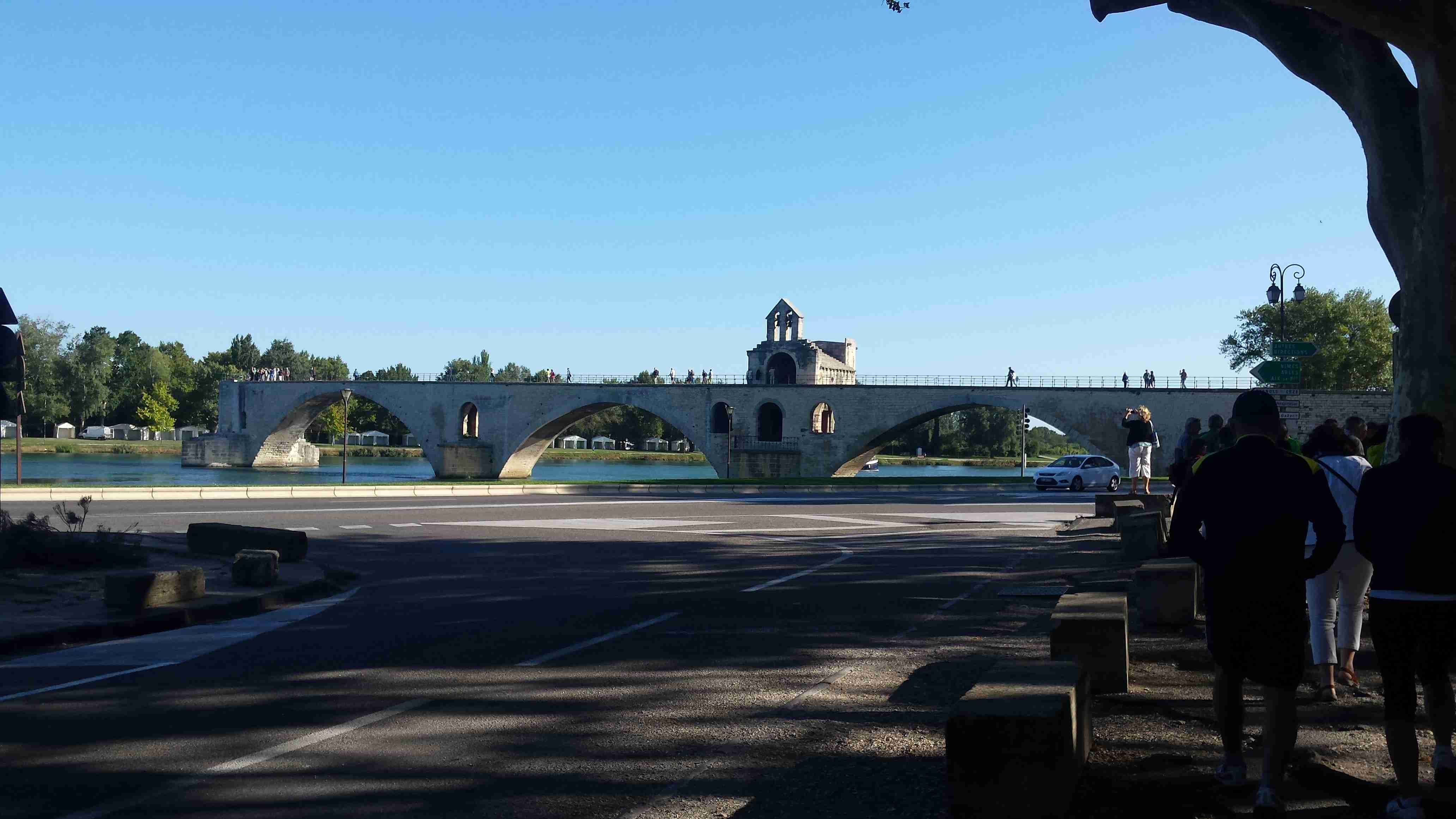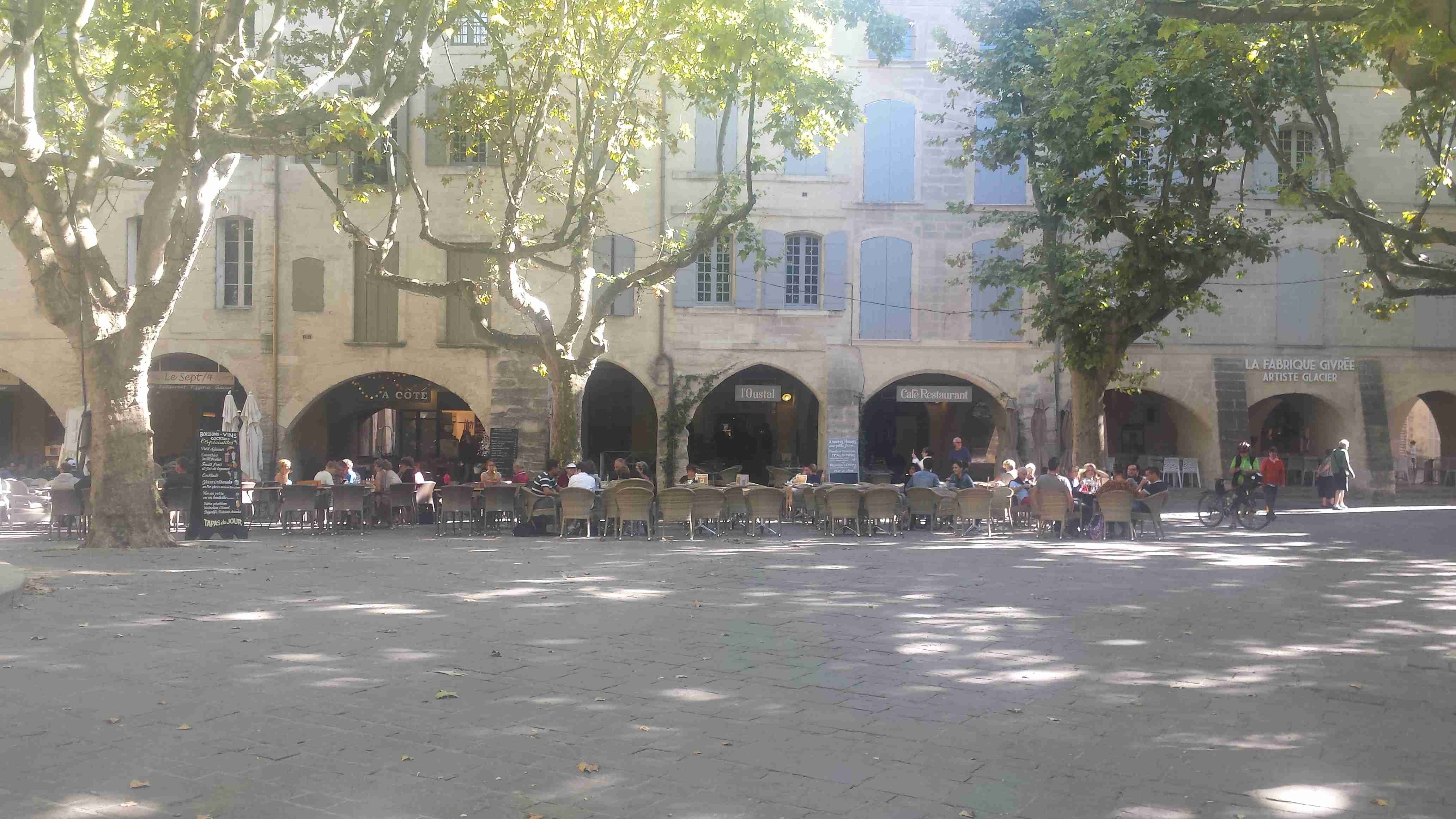 Ráno jsme vyjeli autobusem až v 9 hodin oblečeni do civilu, neboť nás čekala jako první návštěva Avignonu. Autobus zaparkoval u hradeb, do města jsme vstoupili branou Porte du Rhone, došli jsme společně uličkami k ještě nezaplněnému Place du Palais před papežským palácem, odtud potom po schodech nahoru do zahrad, odkud je vidět jak avignonský most sv. Benezeta, tak i v dáli Chateauneuf du Pape. Vrátili jsme se k paláci a po rozchodu jsme s Ivou zamířili po Rue de la Republique na Guinesse do Irish Pubu O’Neil’s abychom zavzpomínali na naší minulou návštěvu na stejném místě před 8 roky, tehdy ještě se Zdeňkem a Marcelou. Cestou zpět jsme se zastavili v infocentru, ve veliké prodejně kosmetiky, koupili jsme ještě nějaké drobnosti a pak již cesta autobusem na start dnešní krátké etapy. Autobus nás vysadil kousek před obcí Les Codes, pár kilometrů jsme museli jet po hlavní silnici, ze které jsme odbočili doleva na utajenou cestu vedoucí k Pont du Gard – oficiální vstup k akvaduktu je nehorázně zpoplatněn, proto ta boční silnička z jiné strany. U akvaduktu jsme již také byli při naší minulé návštěvě, přesto jsme se po něm prošli a udělali spoustu fotek ze všech stran. Když jsme se dost pokochali, vzali jsme si kola a vyrazili na cestu. Vrátili jsme se k hlavní silnici, tu jsme však přejeli na druhou stranu a po vesnických silničkách rovnoběžných s hlavní jsme se blížili k Uzés. Těsně před městem jsme se na chvilku vrátili na hlavní, ale jen co jsme po mostě přejeli přes řeku, hned jsme zase odbočili na vedlejší silničku. Do města jsme museli vyjet do poměrně prudkého kopce, ale nebylo to naštěstí dlouhé. Město samotné je středověké a lehce se v něm zabloudí. Na náměstí pod platany jsme si dali víno, připojili se k nám i naši sousedi z autobusu. Po posezení jsme ještě prošli městem, našli jsme tu správnou silnici a vyrazili do kempu, který byl vzdálen cca 5 km. Pouze 25 km, ale hodně poznávací. K večeři byla paella a bylo to žrádlo.