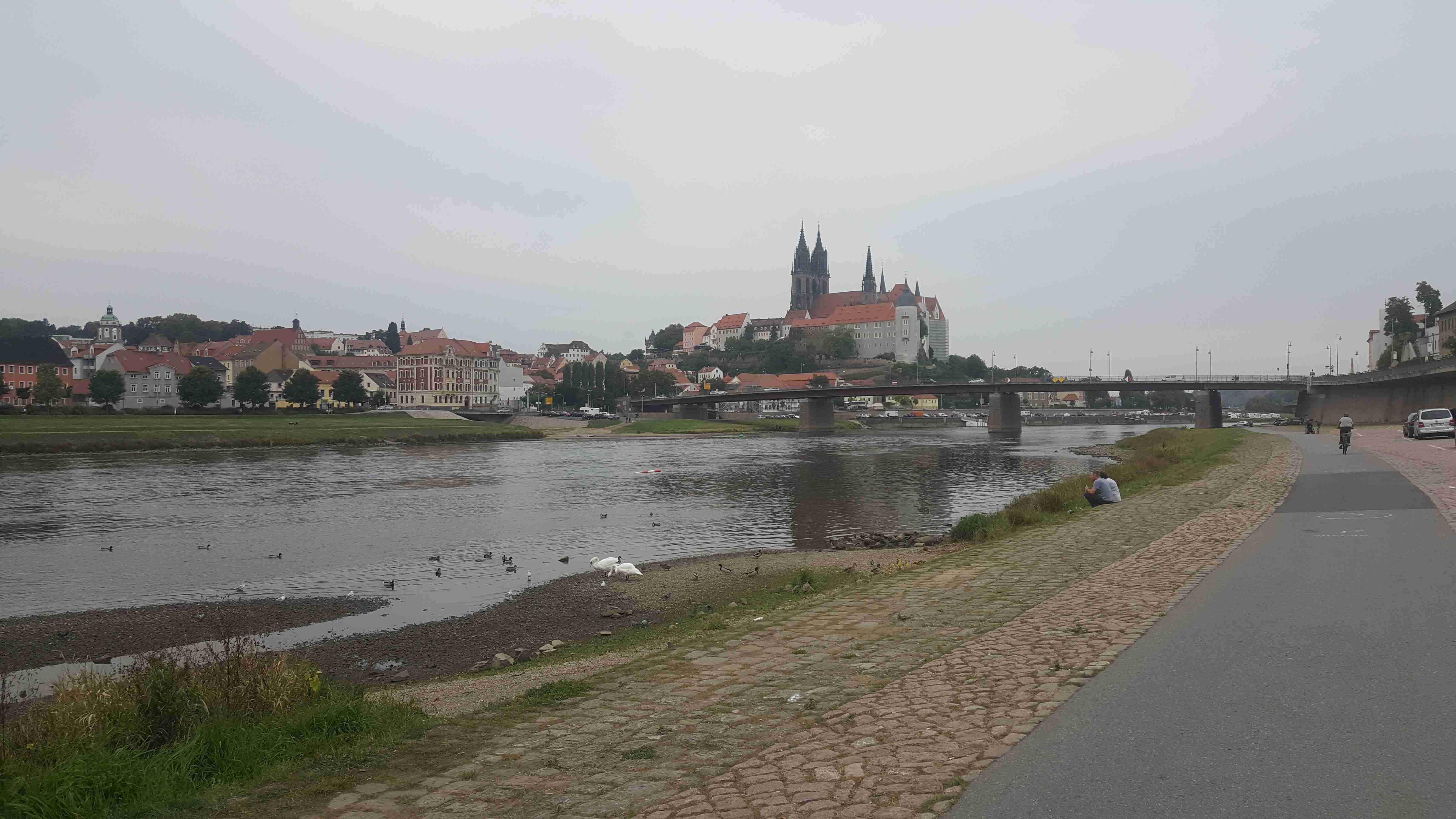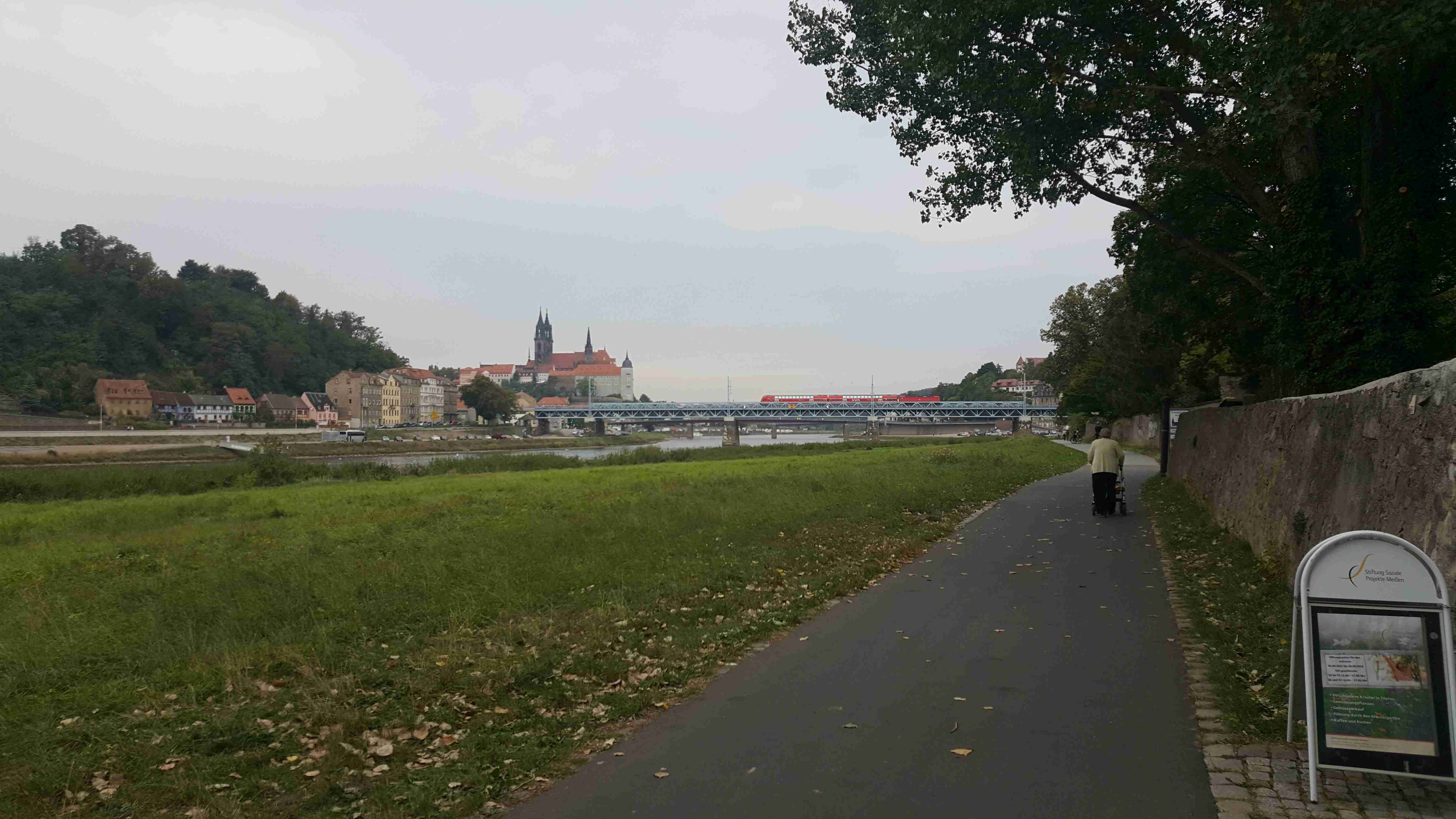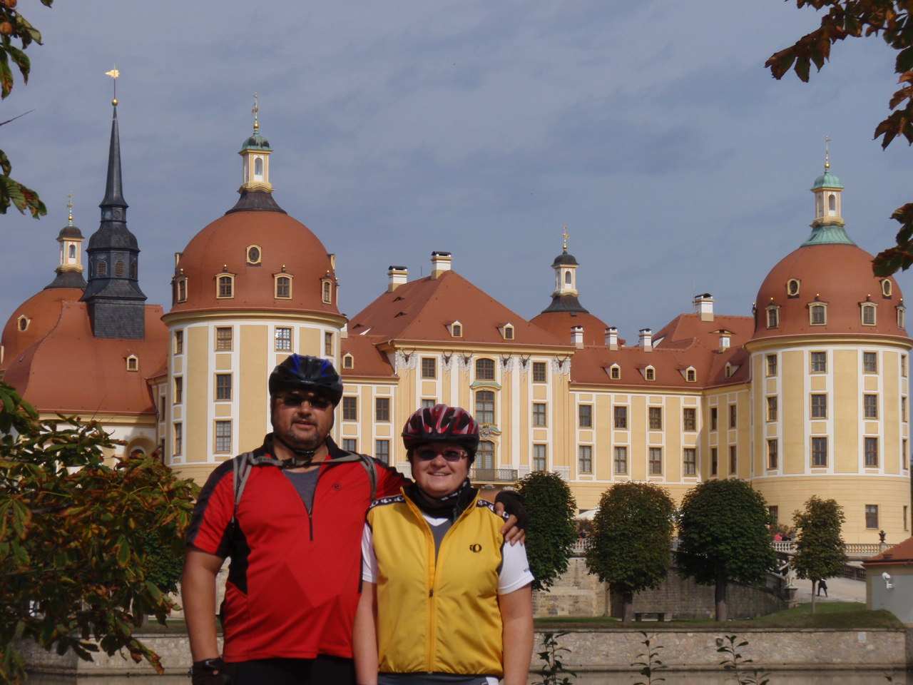 A je tady derniéra letošní cyklistické sezóny. Tak jako vloni jsme i letos vyrazili s Rubikonem na saské vinobraní, které se odehrává kousek za hranicemi a tím pádem i kousek od našeho domova. V sobotu ráno nás měl autobus vyzvednout na parkovišti na D8 v 9 hodin, ale protože na cestě z Prahy píchnul, odjížděli jsme až kolem půl jedenácté. Následovala asi hodinová jízda na zámek Moritzburg. Vzhledem k tomu, že na zámku jsme byli vloni, vyrazili jsme na cestu dolů do Radebeulu k řece na cyklostezku. Vloni jsme trochu bloudili, ale na letošní rok jsme se Lubor i já dobře připravili a k Labi jsme se dostali po správné trase bez jakýchkoliv problémů. Na zahrádce hotelu Goldener Anker ještě v Radebeulu jsme si dali klobásu s bramborovým salátem a pokračovali v cestě. Projeli jsme Míšní, místy jsme museli sesednout z kol, protože na stezce probíhalo vinobraní a byly tam stánky a spousta lidí. Tak jako vloni jsme zastavili v Diesbar-Seusslich , kde jsme si ve stánku chtěli dát klobásu, ale měli jenom ty bílé a ty moc nemusíme. Během okukování stánků se spustil déšť a tak jsme ho přestáli pod střechou u piva. Po dešti jsme si dali housky s rybami a pokračovali v cestě. Občas spadla nějaká kapka, ale vcelku to šlo. Minuli jsme náš loňský hotel Moritz a pár kilometrů za ním jsme přejeli po mostě do Riesy, kde jsme bydleli v hotelu Mercure kousek za mostem. Dojeli jsme kolem půl sedmé, pomalu se smrákalo, najeto cca 60 km. Špičkový hotel měl i špičkovou restauraci, dali jsme si do nosu.