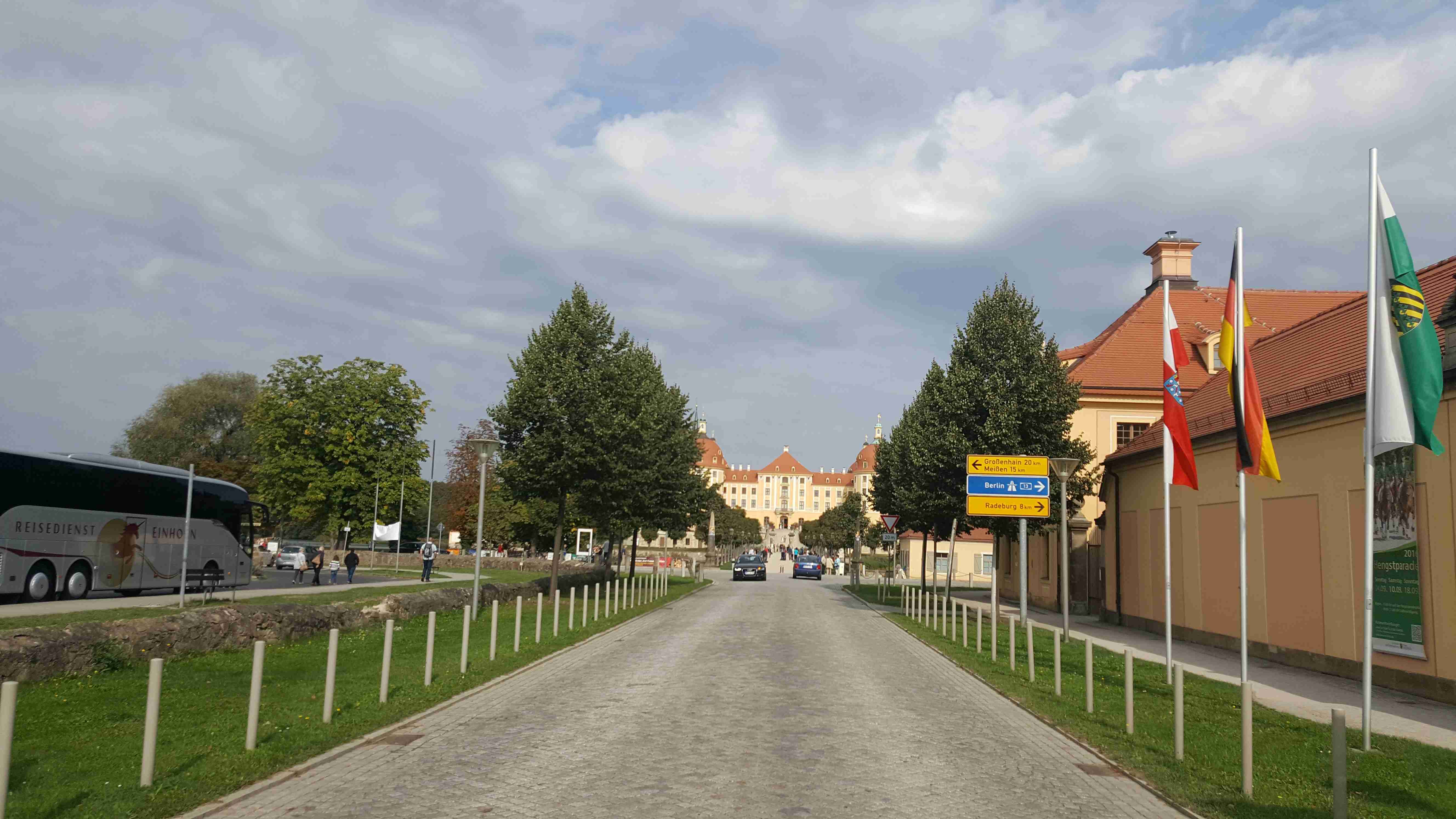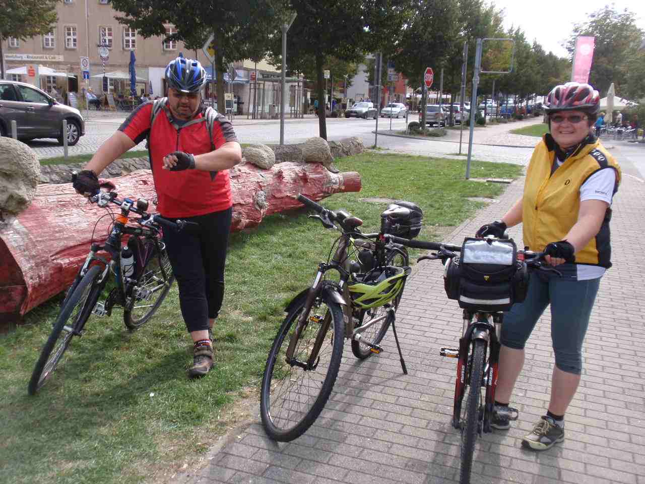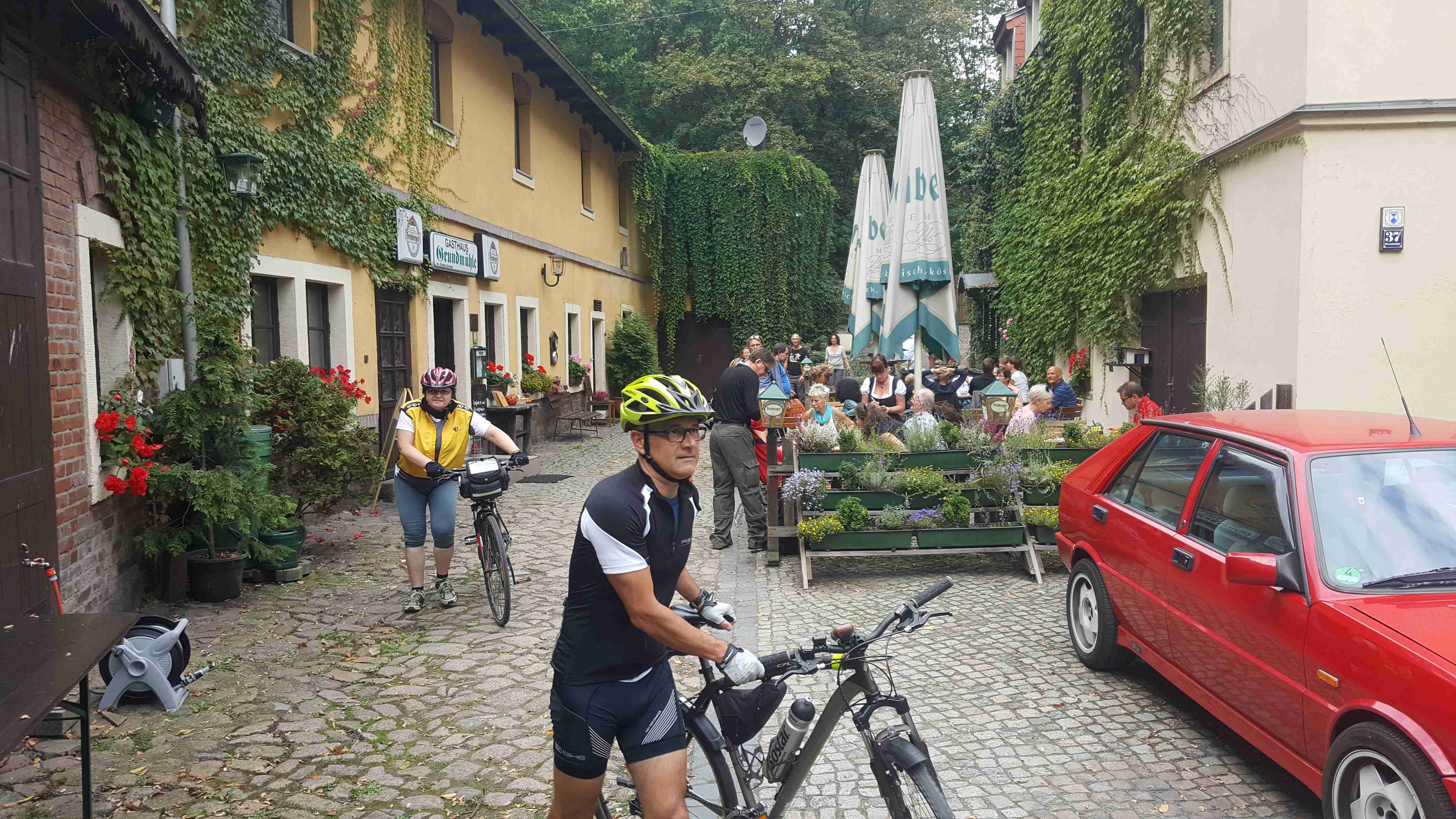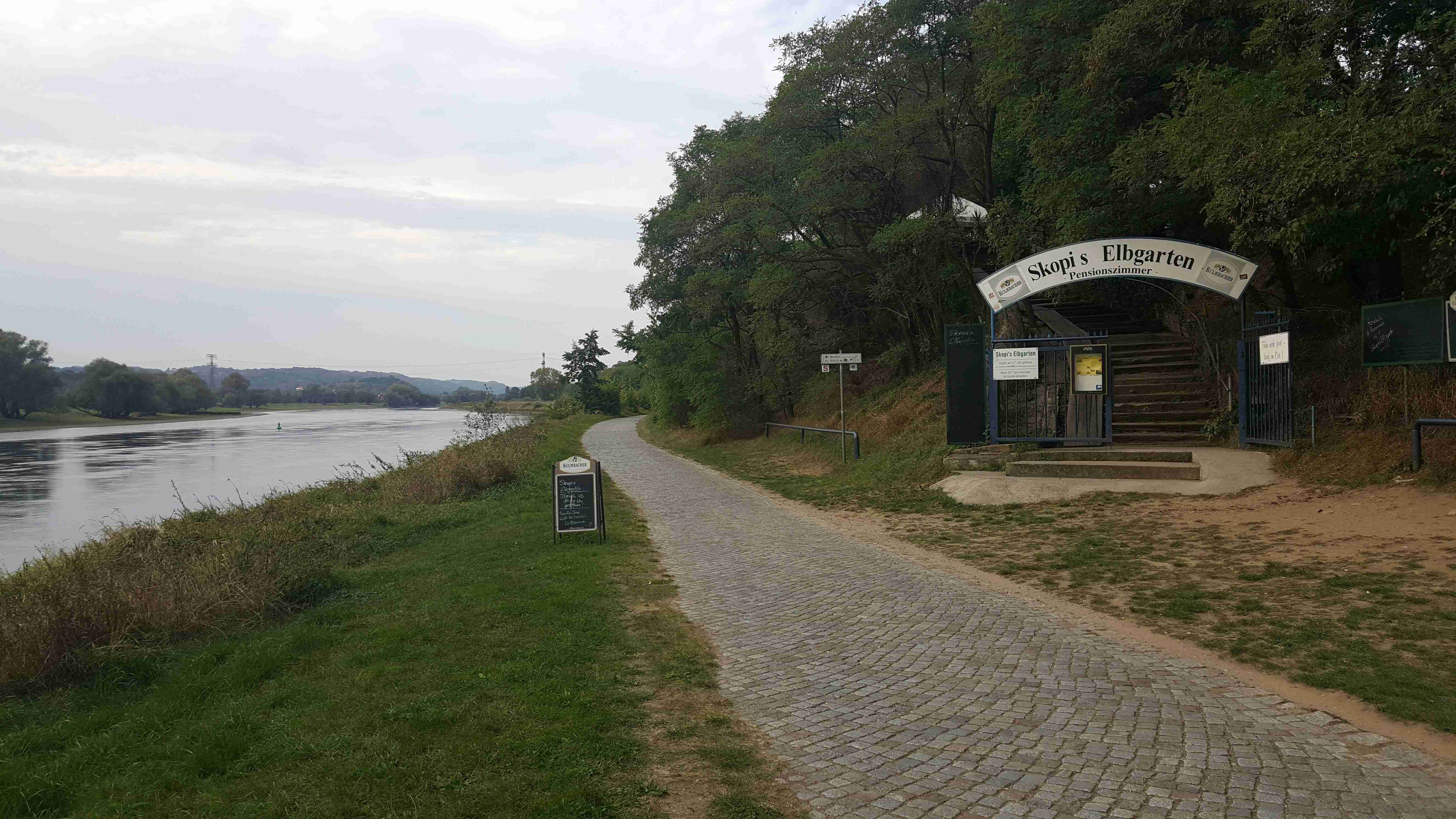 A je tady derniéra letošní cyklistické sezóny. Tak jako vloni jsme i letos vyrazili s Rubikonem na saské vinobraní, které se odehrává kousek za hranicemi a tím pádem i kousek od našeho domova. V sobotu ráno nás měl autobus vyzvednout na parkovišti na D8 v 9 hodin, ale protože na cestě z Prahy píchnul, odjížděli jsme až kolem půl jedenácté. Následovala asi hodinová jízda na zámek Moritzburg. Vzhledem k tomu, že na zámku jsme byli vloni, vyrazili jsme na cestu dolů do Radebeulu k řece na cyklostezku. Vloni jsme trochu bloudili, ale na letošní rok jsme se Lubor i já dobře připravili a k Labi jsme se dostali po správné trase bez jakýchkoliv problémů. Na zahrádce hotelu Goldener Anker ještě v Radebeulu jsme si dali klobásu s bramborovým salátem a pokračovali v cestě. Projeli jsme Míšní, místy jsme museli sesednout z kol, protože na stezce probíhalo vinobraní a byly tam stánky a spousta lidí. Tak jako vloni jsme zastavili v Diesbar-Seusslich , kde jsme si ve stánku chtěli dát klobásu, ale měli jenom ty bílé a ty moc nemusíme. Během okukování stánků se spustil déšť a tak jsme ho přestáli pod střechou u piva. Po dešti jsme si dali housky s rybami a pokračovali v cestě. Občas spadla nějaká kapka, ale vcelku to šlo. Minuli jsme náš loňský hotel Moritz a pár kilometrů za ním jsme přejeli po mostě do Riesy, kde jsme bydleli v hotelu Mercure kousek za mostem. Dojeli jsme kolem půl sedmé, pomalu se smrákalo, najeto cca 60 km. Špičkový hotel měl i špičkovou restauraci, dali jsme si do nosu.