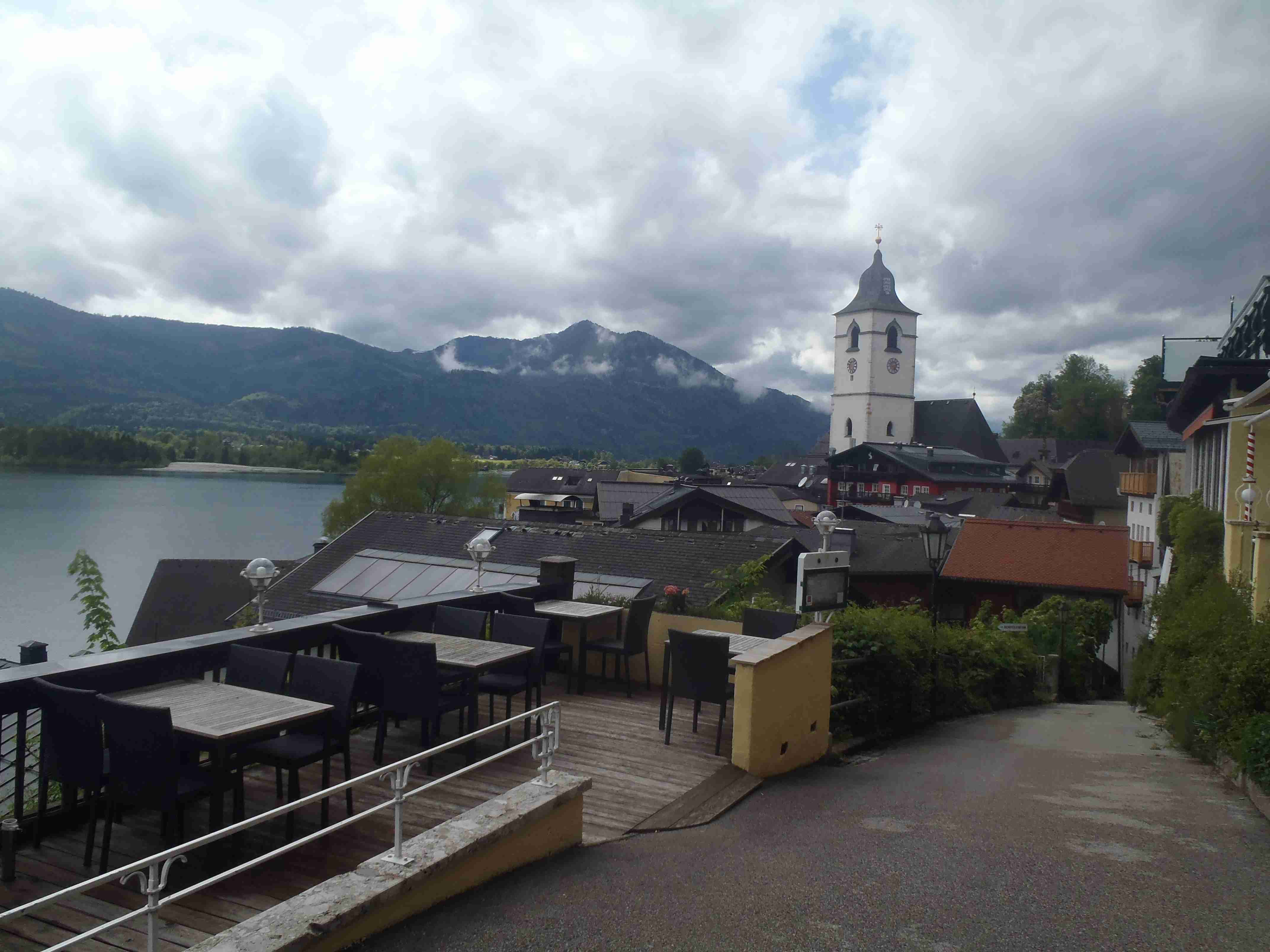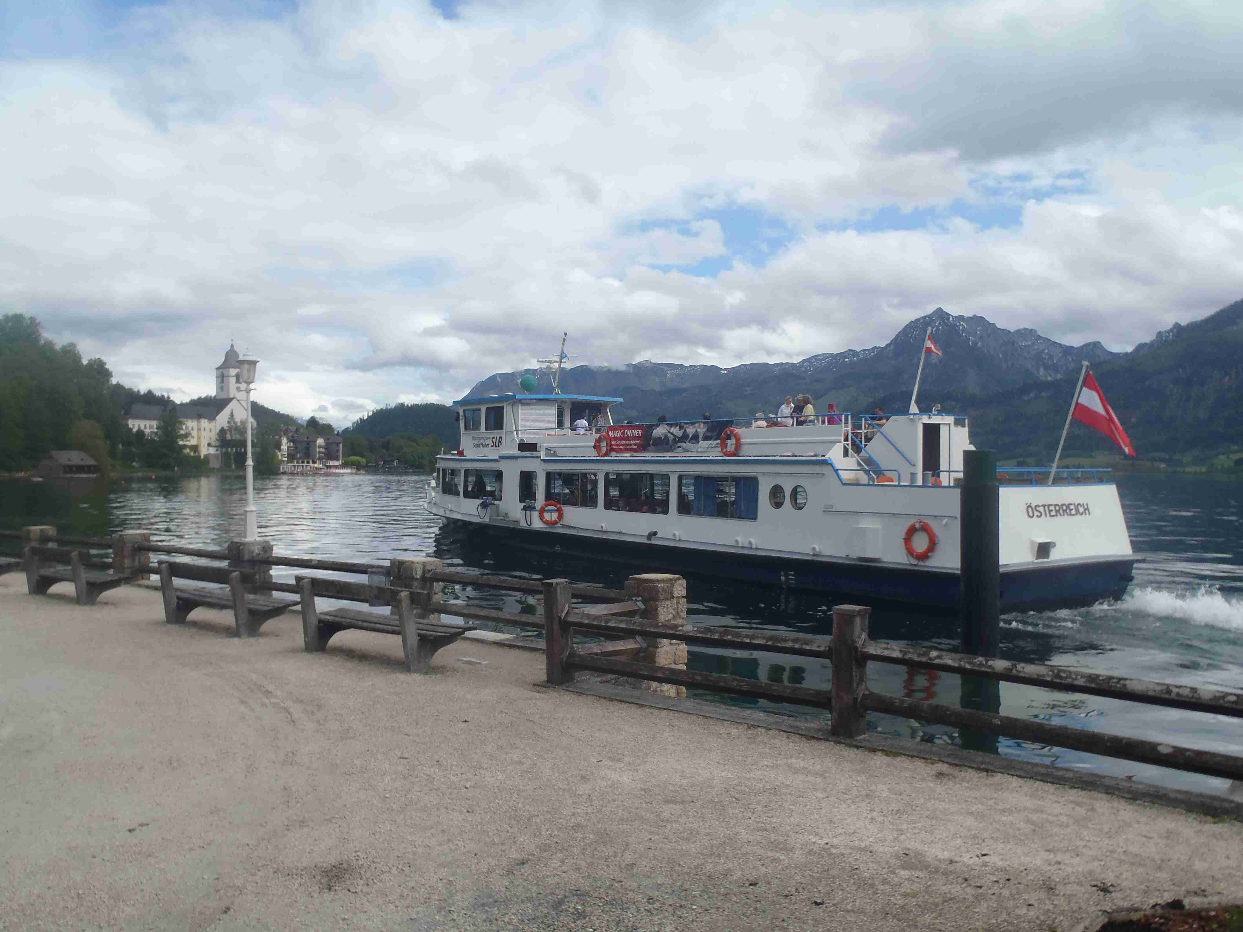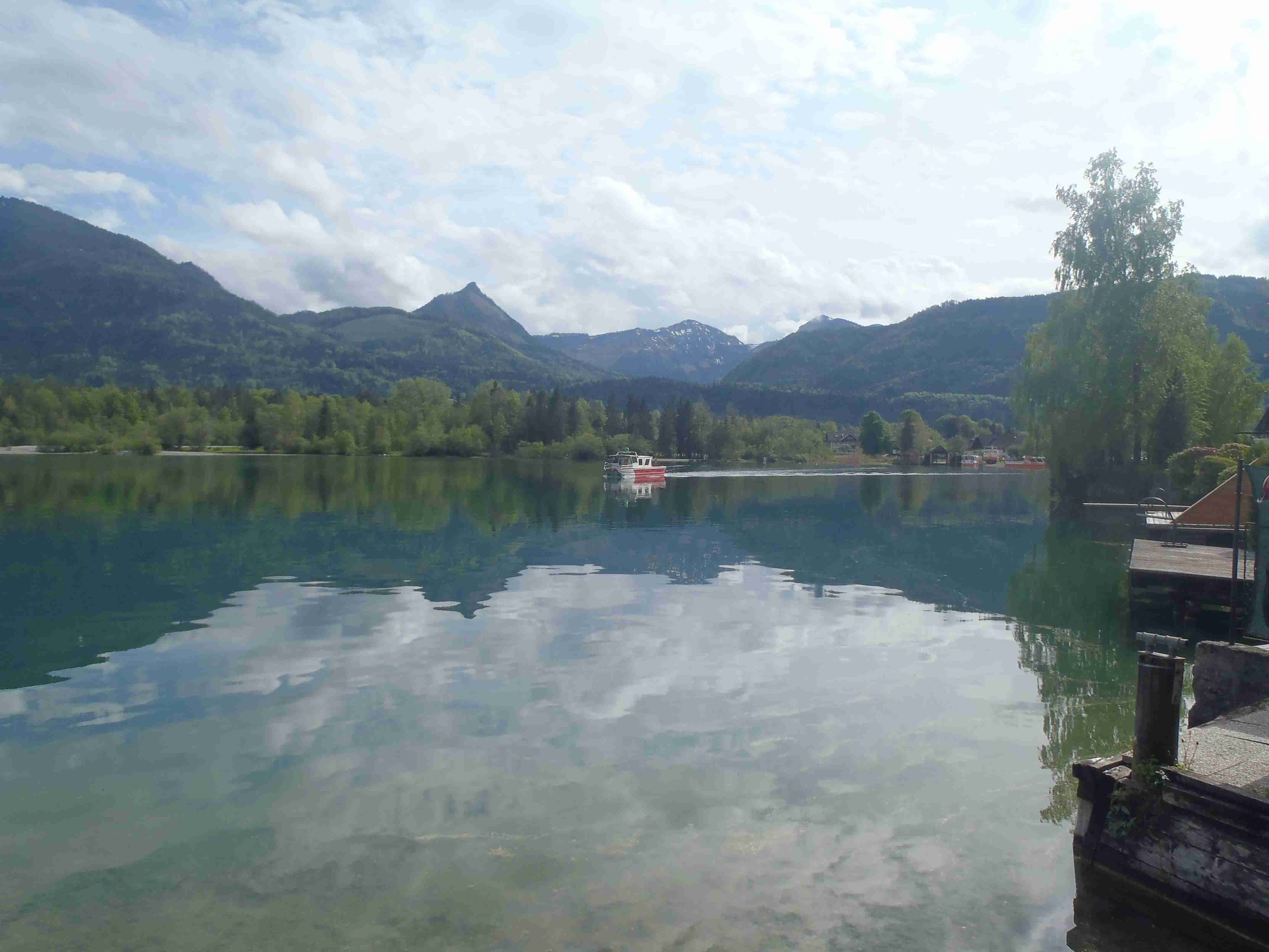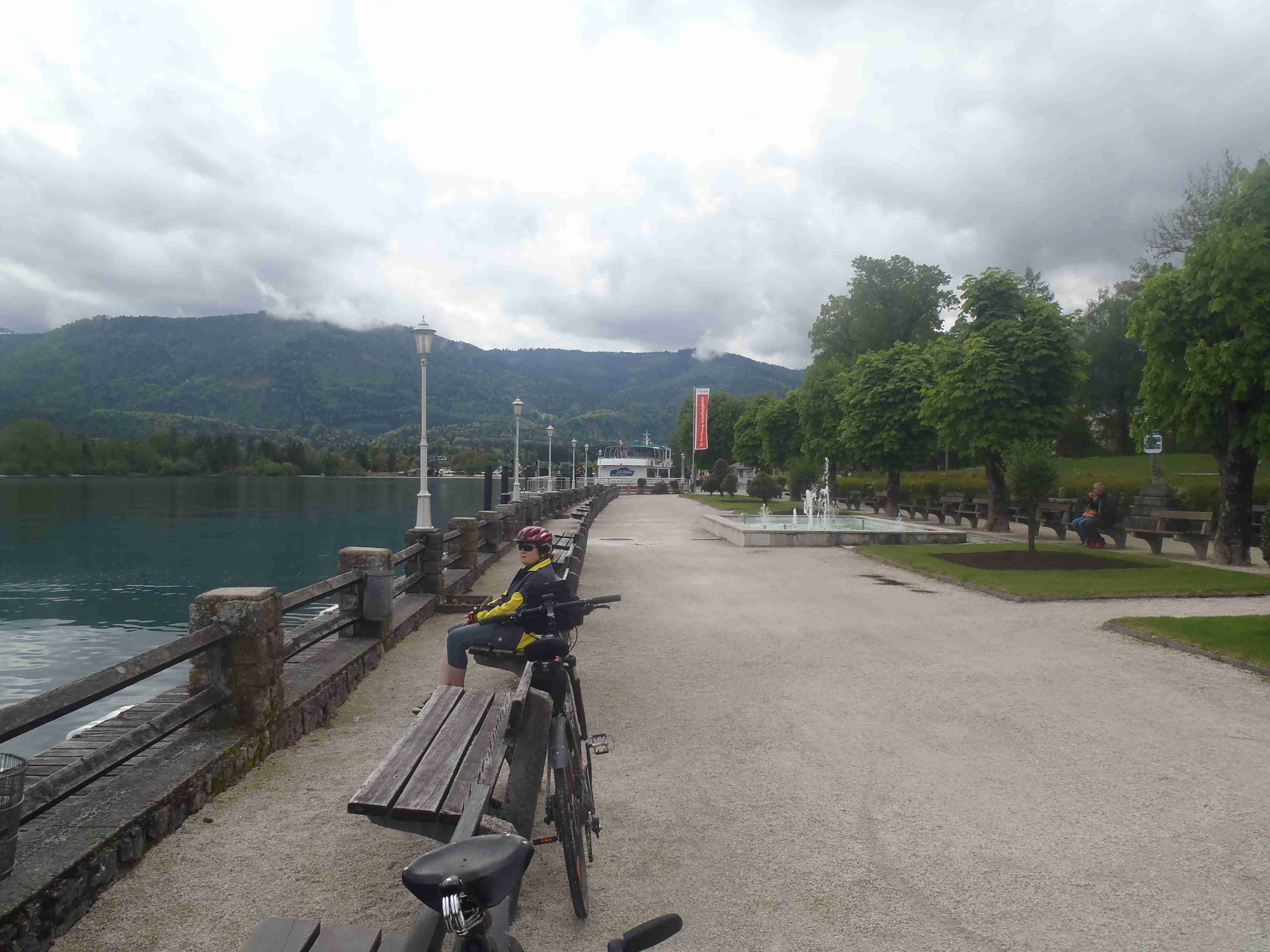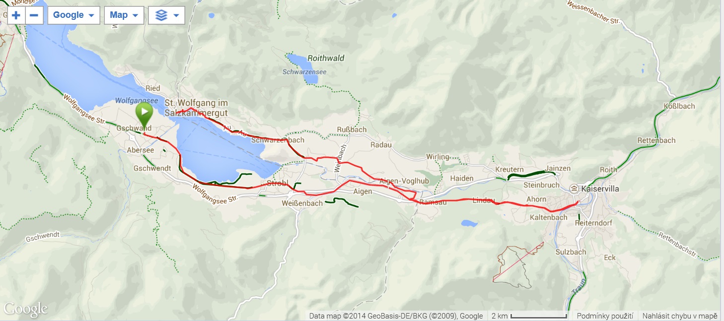 Snídaně v 8:00, vydatná, velký výběr salámů, v 9:00 briefing, venku bylo právě po dešti. Lubor prohodil denní program s ohledem na počasí a královskou etapu přesunul na sobotu, kdy by mělo být nejlepší počasí. Na pátek jsme si mohli naplánovat okružní cestu kolem jezera a okolí dle chutě a nálady, dostalo se nám několik variant. My jsme si vybrali cestu do Bad Ischl a odtud do St. Wolfgang. Vyrazili jsme cca v 10:45 po cyklostezce kolem jezera směrem na Strobl. Cestou jsem Ivě opravoval padající zadní blatník, kde však byla stržená matka a tak se oprava příliš nevydařila a to se jí stalo osudným – kousek před Stroblem se podívala na zadní kolo a přehlédla ocelovou závoru přes cestu. Já jel ve předu, strašná rána a když jsem se otočil, Iva ležela i s kolem na zemi. Oddychl jsem si, když se začala hýbat, po chvilce se i zvedla. Naštěstí si nic nezlomila, pouze nějaké naraženiny a trochu roztržené kalhoty. Ještě, že tak. Stroblem jsme projeli a pokračovali stále dál na východ po stezce podél silnice na jedné straně a řeky Ischl na druhé. Po projetí Aigenu zhruba na úrovni obce Ramsau cyklostezka podjede hlavní silnici, odkloní se od ní a začne stoupat směrem k Lindau. Nahoře se jede pár kilometrů mírně zvlněnou vesnickou krajinou se spoustou statků, cedule Bad Ischl je ještě na kopci, ale pak se sjíždí krátký prudký sjezd dolu do města k řece. Podél řeky promenádou jsme dojeli do centra, kde se mohutně opravuje před nastávající letní sezonou, a pěší zónou jsme došli na Sparkasseplatz, kde jsme si pod slunečníkem dali kafe a pivo. Musím podotknout, že bylo podstatně chladněji, než včera, a většinu cesty i mrholilo, ale pořád to ještě šlo. Po občerstvení jsme se v cca 13:00 vydali zpět, prudký úsek jsme statečně vytlačili, po kopečkách se pěkně pohoupali a po sjezdu zpět do Ramsau a podjetí silnice jsme uhnuli z předchozí trasy, sjeli jsme blíže k řece a snažili se najít nějaký most, abychom se dostali na druhou stranu a našli cyklostezku do St. Wolfgangu. Po jednom zeptání jsme most opravdu našli, posléze i cyklostezku a pohodovou jízdou mírně zvlněnou krajinou jsme projeli obce Windhag a Weinbach, severně minuli Strobl a u obce Schwarzenbach jsme se ocitli opět na břehu jezera Wolfgangsee. Cyklostezkou na břehu jezera jsme projeli další obcí s názvem Au a krátce po 15. hodině jsme dojeli do St. Wolfgang. Udělali jsme pár fotek, sesedli z kol a na chvíli je odstavili, abychom si prohlédli městečko. Prošli jsme středem a poté sjeli ke břehu k přístavišti lodí. Iva si poseděla na lavičce, já mezitím zjišťoval odjezdy lodí, abychom se přepravili na druhou stranu, protože náš hotel byl přímo naproti přes vodu. Loď jsem zjistil, ale pak jsem si uvědomil, že musí jezdit ještě i pouhý přívoz mimo parníku jezdícího po celém jezeru - a opravdu, kousek za přístavištěm ukrytý v křoví byl sjezd k přívozu, který „premával“ na znamení do 17 hodin. Po cestě k Ivě hovící si na lavičce jsem si nafotil mašinky zubačky Schaftbergbahn, která vyváží lidi z nějakých 550 m n. m. do cca 1750m n. m. na horu Schaftberg. Jelikož byl ještě čas, vrátil jsem se kousek do centra a v obchodě koupil pro každého láhev vína, abychom ho nekonzumovali v restauraci, kde bylo poměrně drahé. Kolem půl páté jsem vyzvednul Ivu na nábřeží a dojeli jsme k přívozu, kde již čekalo několik našich kolegů. Za 3,5 Eura za osobu jsme se přepravili na druhou stranu a po pár set metrech jsme dojeli krátce před sedmnáctou hodinou zpět do hotelu. Najeto pohodových 35 km, cestou z Bad Ischl již skoro vůbec nepršelo. Sprchování bylo, co se týče teplé vody, bez problémů, avšak voda ze sprchy dotekla tentokrát až na koberec ložnice. Po sprchování samozřejmě následoval rituál vytírání a ždímaní ručníku. Na večeři jsme vyrazili po 19. hodině, dal jsem si klasický Wienerschnitzel s bramborem a salátem, Iva si vybrala nudle a jako klasicky její volba nevyšla – bylo toho hodně, ale bez chuti a bez zápachu a tak jsem jí dal alespoň kousek řízku. Již někdy po deváté jsme šli na pokoj, přeci jenom nás čekala zítra královská etapa.