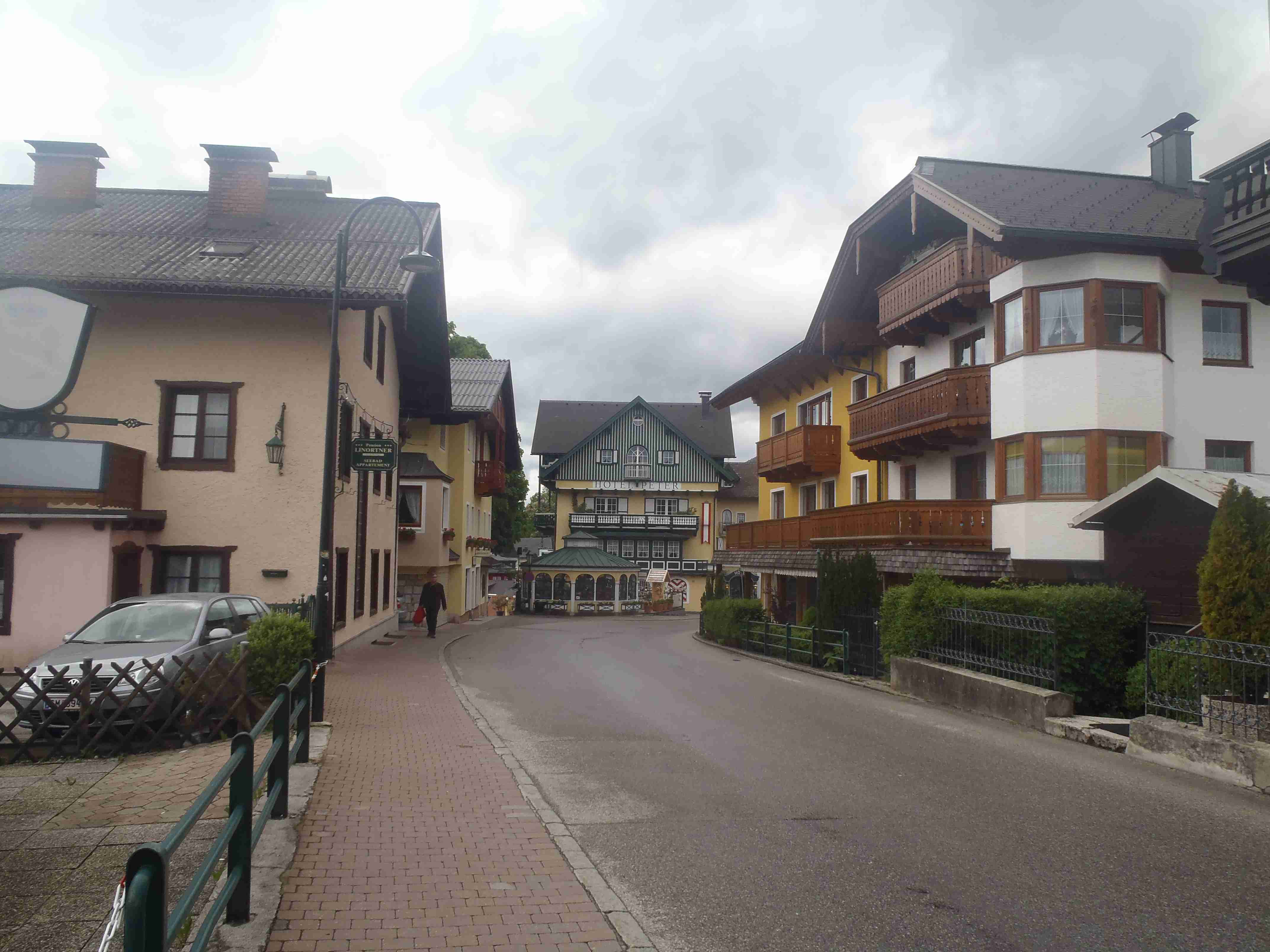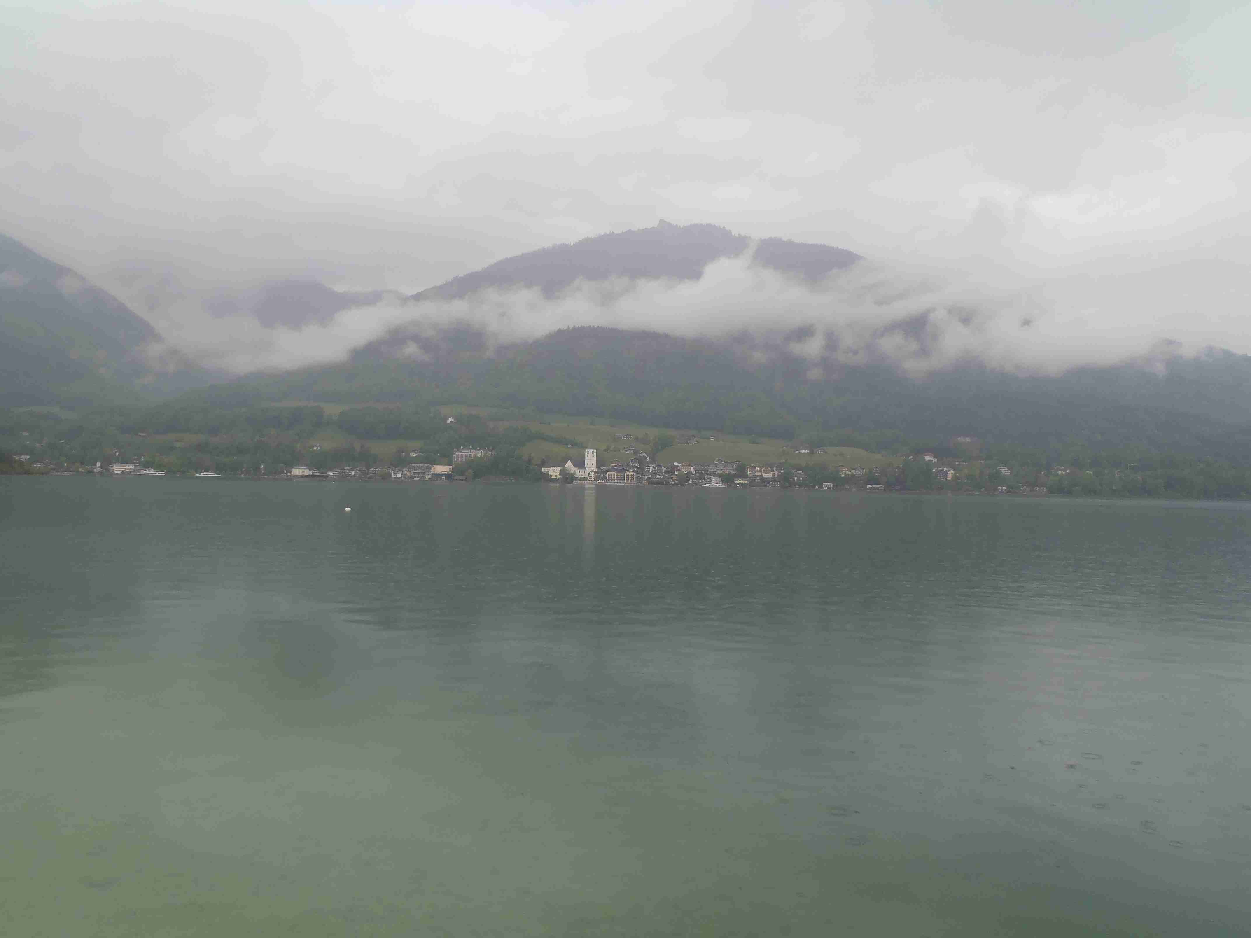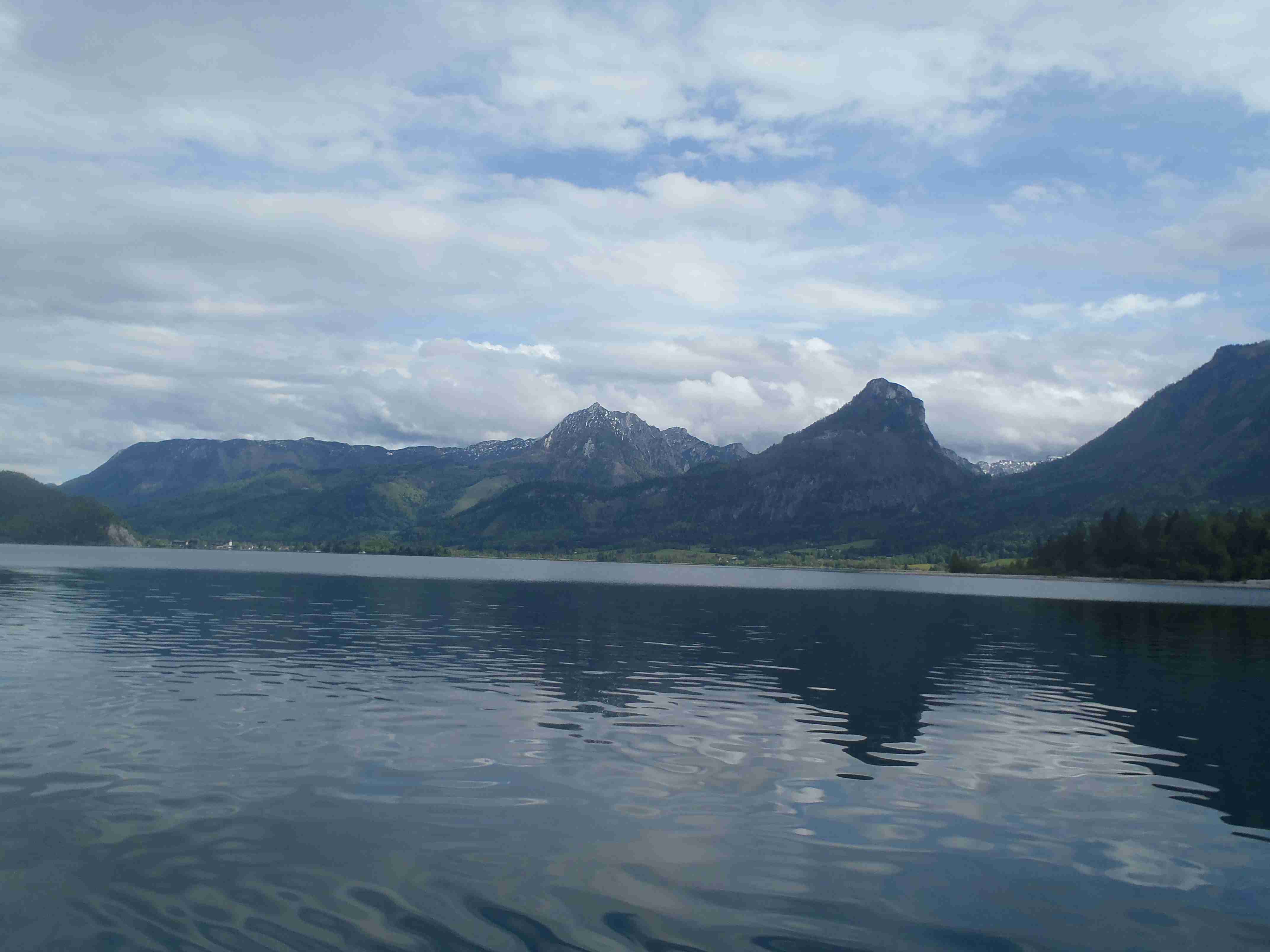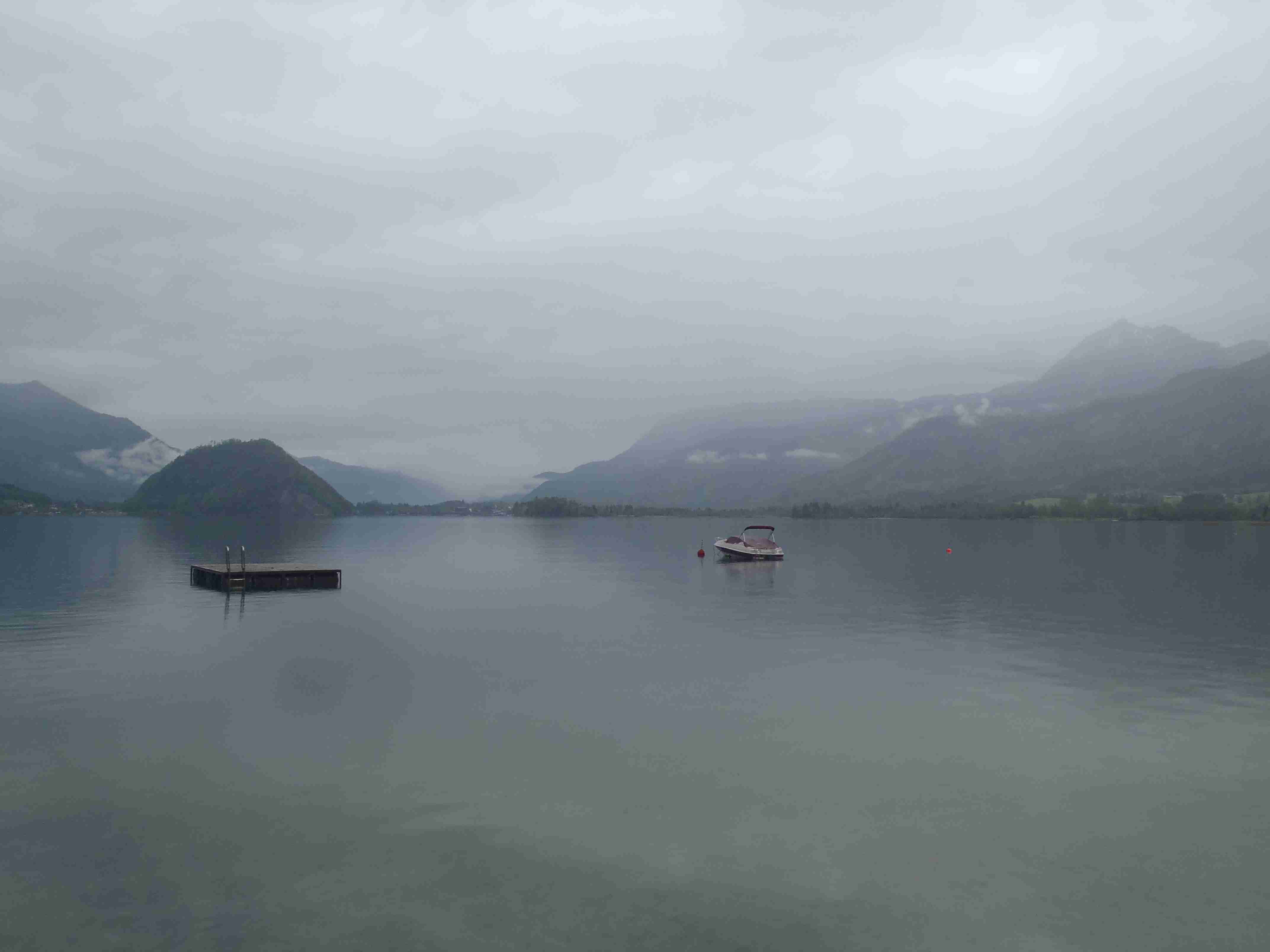 Snídaně v 8:00, vydatná, velký výběr salámů, v 9:00 briefing, venku bylo právě po dešti. Lubor prohodil denní program s ohledem na počasí a královskou etapu přesunul na sobotu, kdy by mělo být nejlepší počasí. Na pátek jsme si mohli naplánovat okružní cestu kolem jezera a okolí dle chutě a nálady, dostalo se nám několik variant. My jsme si vybrali cestu do Bad Ischl a odtud do St. Wolfgang. Vyrazili jsme cca v 10:45 po cyklostezce kolem jezera směrem na Strobl. Cestou jsem Ivě opravoval padající zadní blatník, kde však byla stržená matka a tak se oprava příliš nevydařila a to se jí stalo osudným – kousek před Stroblem se podívala na zadní kolo a přehlédla ocelovou závoru přes cestu. Já jel ve předu, strašná rána a když jsem se otočil, Iva ležela i s kolem na zemi. Oddychl jsem si, když se začala hýbat, po chvilce se i zvedla. Naštěstí si nic nezlomila, pouze nějaké naraženiny a trochu roztržené kalhoty. Ještě, že tak. Stroblem jsme projeli a pokračovali stále dál na východ po stezce podél silnice na jedné straně a řeky Ischl na druhé. Po projetí Aigenu zhruba na úrovni obce Ramsau cyklostezka podjede hlavní silnici, odkloní se od ní a začne stoupat směrem k Lindau. Nahoře se jede pár kilometrů mírně zvlněnou vesnickou krajinou se spoustou statků, cedule Bad Ischl je ještě na kopci, ale pak se sjíždí krátký prudký sjezd dolu do města k řece. Podél řeky promenádou jsme dojeli do centra, kde se mohutně opravuje před nastávající letní sezonou, a pěší zónou jsme došli na Sparkasseplatz, kde jsme si pod slunečníkem dali kafe a pivo. Musím podotknout, že bylo podstatně chladněji, než včera, a většinu cesty i mrholilo, ale pořád to ještě šlo. Po občerstvení jsme se v cca 13:00 vydali zpět, prudký úsek jsme statečně vytlačili, po kopečkách se pěkně pohoupali a po sjezdu zpět do Ramsau a podjetí silnice jsme uhnuli z předchozí trasy, sjeli jsme blíže k řece a snažili se najít nějaký most, abychom se dostali na druhou stranu a našli cyklostezku do St. Wolfgangu. Po jednom zeptání jsme most opravdu našli, posléze i cyklostezku a pohodovou jízdou mírně zvlněnou krajinou jsme projeli obce Windhag a Weinbach, severně minuli Strobl a u obce Schwarzenbach jsme se ocitli opět na břehu jezera Wolfgangsee. Cyklostezkou na břehu jezera jsme projeli další obcí s názvem Au a krátce po 15. hodině jsme dojeli do St. Wolfgang. Udělali jsme pár fotek, sesedli z kol a na chvíli je odstavili, abychom si prohlédli městečko. Prošli jsme středem a poté sjeli ke břehu k přístavišti lodí. Iva si poseděla na lavičce, já mezitím zjišťoval odjezdy lodí, abychom se přepravili na druhou stranu, protože náš hotel byl přímo naproti přes vodu. Loď jsem zjistil, ale pak jsem si uvědomil, že musí jezdit ještě i pouhý přívoz mimo parníku jezdícího po celém jezeru - a opravdu, kousek za přístavištěm ukrytý v křoví byl sjezd k přívozu, který „premával“ na znamení do 17 hodin. Po cestě k Ivě hovící si na lavičce jsem si nafotil mašinky zubačky Schaftbergbahn, která vyváží lidi z nějakých 550 m n. m. do cca 1750m n. m. na horu Schaftberg. Jelikož byl ještě čas, vrátil jsem se kousek do centra a v obchodě koupil pro každého láhev vína, abychom ho nekonzumovali v restauraci, kde bylo poměrně drahé. Kolem půl páté jsem vyzvednul Ivu na nábřeží a dojeli jsme k přívozu, kde již čekalo několik našich kolegů. Za 3,5 Eura za osobu jsme se přepravili na druhou stranu a po pár set metrech jsme dojeli krátce před sedmnáctou hodinou zpět do hotelu. Najeto pohodových 35 km, cestou z Bad Ischl již skoro vůbec nepršelo. Sprchování bylo, co se týče teplé vody, bez problémů, avšak voda ze sprchy dotekla tentokrát až na koberec ložnice. Po sprchování samozřejmě následoval rituál vytírání a ždímaní ručníku. Na večeři jsme vyrazili po 19. hodině, dal jsem si klasický Wienerschnitzel s bramborem a salátem, Iva si vybrala nudle a jako klasicky její volba nevyšla – bylo toho hodně, ale bez chuti a bez zápachu a tak jsem jí dal alespoň kousek řízku. Již někdy po deváté jsme šli na pokoj, přeci jenom nás čekala zítra královská etapa.