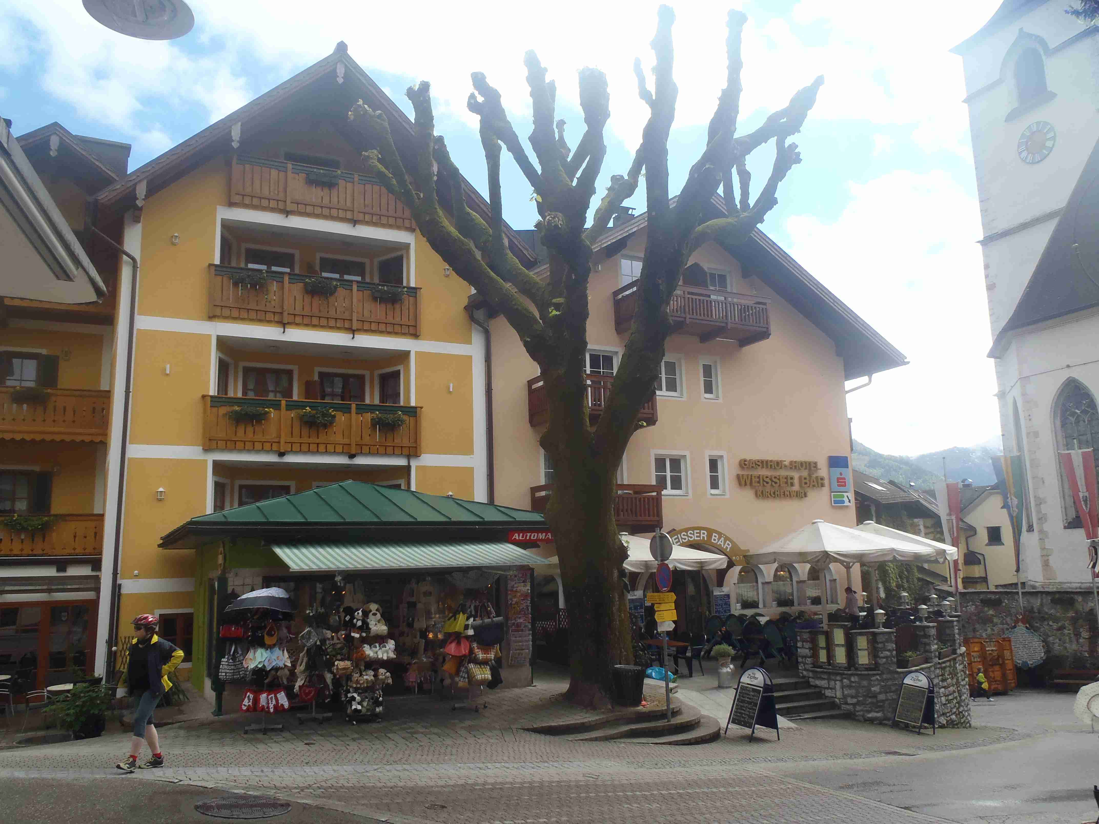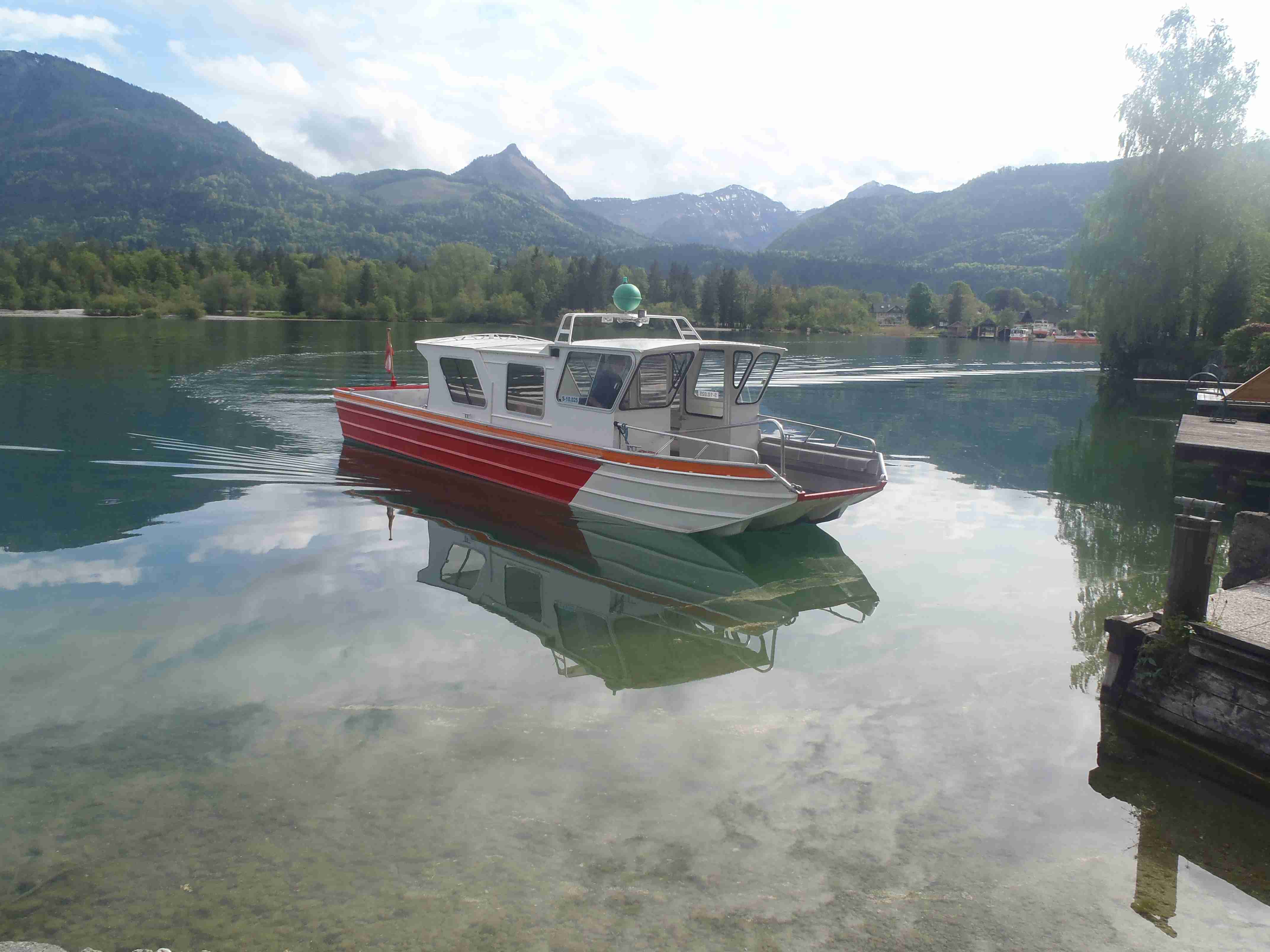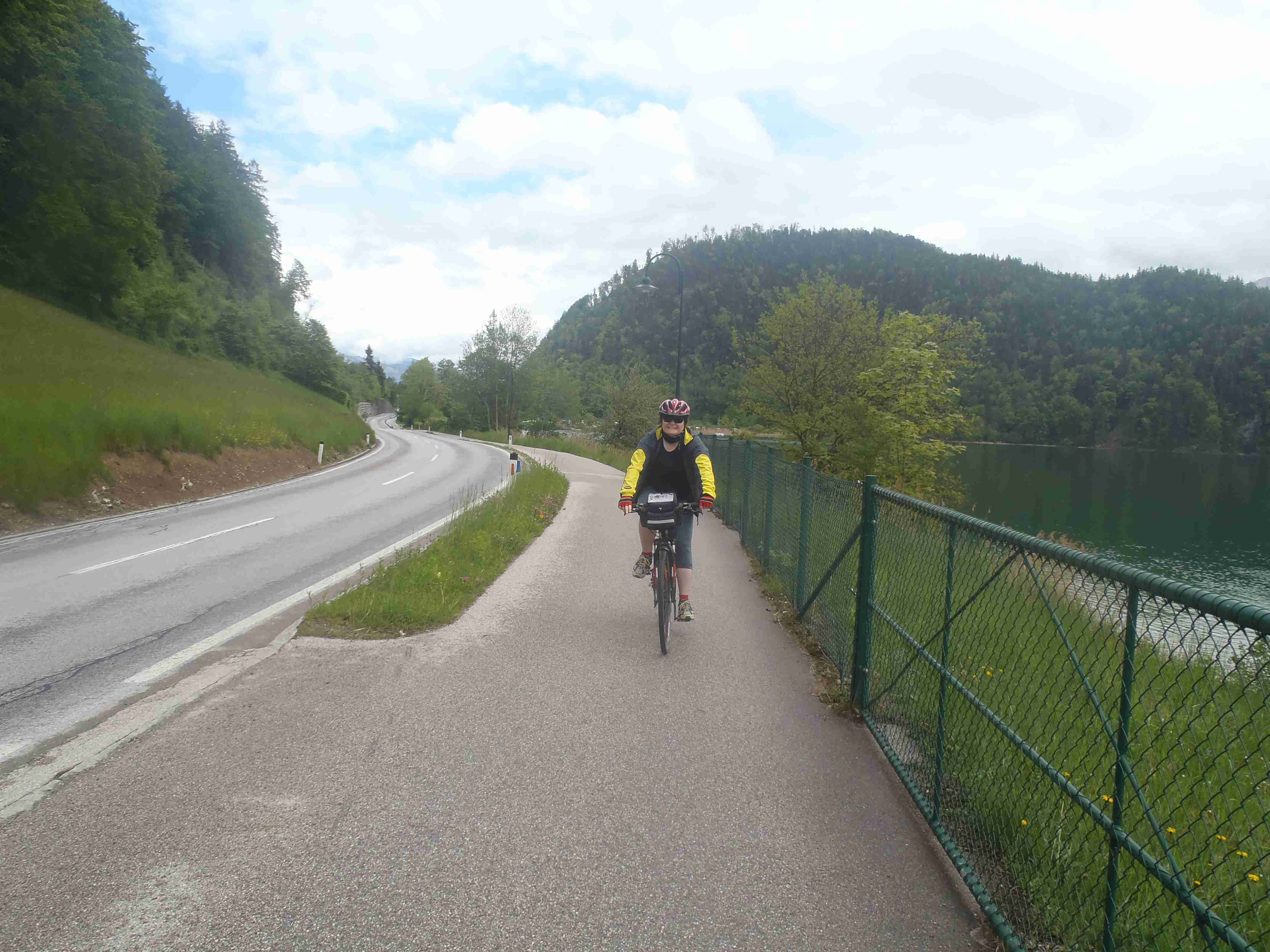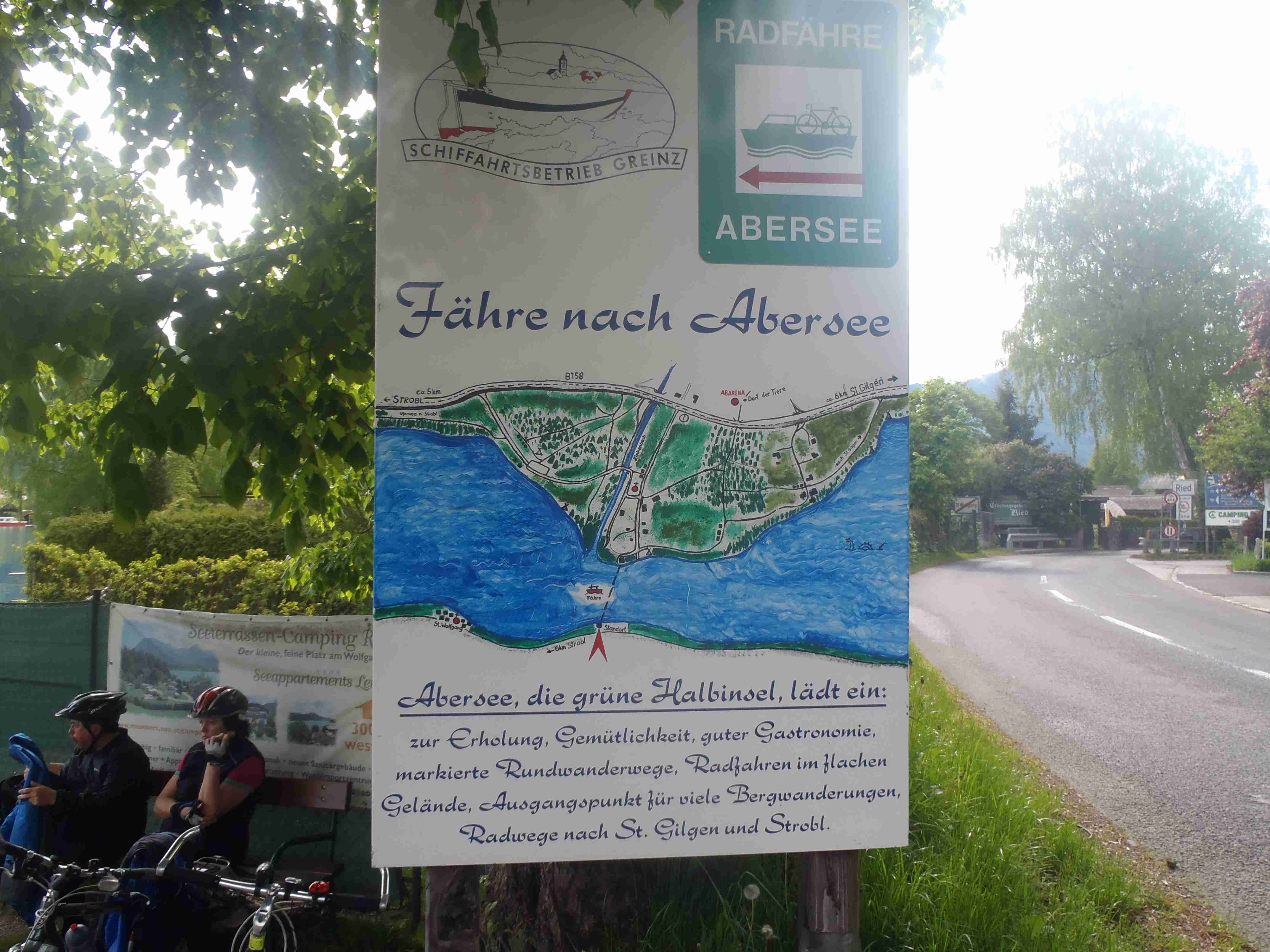Snídaně v 8:00, vydatná, velký výběr salámů, v 9:00 briefing, venku bylo právě po dešti. Lubor prohodil denní program s ohledem na počasí a královskou etapu přesunul na sobotu, kdy by mělo být nejlepší počasí. Na pátek jsme si mohli naplánovat okružní cestu kolem jezera a okolí dle chutě a nálady, dostalo se nám několik variant. My jsme si vybrali cestu do Bad Ischl a odtud do St. Wolfgang. Vyrazili jsme cca v 10:45 po cyklostezce kolem jezera směrem na Strobl. Cestou jsem Ivě opravoval padající zadní blatník, kde však byla stržená matka a tak se oprava příliš nevydařila a to se jí stalo osudným – kousek před Stroblem se podívala na zadní kolo a přehlédla ocelovou závoru přes cestu. Já jel ve předu, strašná rána a když jsem se otočil, Iva ležela i s kolem na zemi. Oddychl jsem si, když se začala hýbat, po chvilce se i zvedla. Naštěstí si nic nezlomila, pouze nějaké naraženiny a trochu roztržené kalhoty. Ještě, že tak. Stroblem jsme projeli a pokračovali stále dál na východ po stezce podél silnice na jedné straně a řeky Ischl na druhé. Po projetí Aigenu zhruba na úrovni obce Ramsau cyklostezka podjede hlavní silnici, odkloní se od ní a začne stoupat směrem k Lindau. Nahoře se jede pár kilometrů mírně zvlněnou vesnickou krajinou se spoustou statků, cedule Bad Ischl je ještě na kopci, ale pak se sjíždí krátký prudký sjezd dolu do města k řece. Podél řeky promenádou jsme dojeli do centra, kde se mohutně opravuje před nastávající letní sezonou, a pěší zónou jsme došli na Sparkasseplatz, kde jsme si pod slunečníkem dali kafe a pivo. Musím podotknout, že bylo podstatně chladněji, než včera, a většinu cesty i mrholilo, ale pořád to ještě šlo. Po občerstvení jsme se v cca 13:00 vydali zpět, prudký úsek jsme statečně vytlačili, po kopečkách se pěkně pohoupali a po sjezdu zpět do Ramsau a podjetí silnice jsme uhnuli z předchozí trasy, sjeli jsme blíže k řece a snažili se najít nějaký most, abychom se dostali na druhou stranu a našli cyklostezku do St. Wolfgangu. Po jednom zeptání jsme most opravdu našli, posléze i cyklostezku a pohodovou jízdou mírně zvlněnou krajinou jsme projeli obce Windhag a Weinbach, severně minuli Strobl a u obce Schwarzenbach jsme se ocitli opět na břehu jezera Wolfgangsee. Cyklostezkou na břehu jezera jsme projeli další obcí s názvem Au a krátce po 15. hodině jsme dojeli do St. Wolfgang. Udělali jsme pár fotek, sesedli z kol a na chvíli je odstavili, abychom si prohlédli městečko. Prošli jsme středem a poté sjeli ke břehu k přístavišti lodí. Iva si poseděla na lavičce, já mezitím zjišťoval odjezdy lodí, abychom se přepravili na druhou stranu, protože náš hotel byl přímo naproti přes vodu. Loď jsem zjistil, ale pak jsem si uvědomil, že musí jezdit ještě i pouhý přívoz mimo parníku jezdícího po celém jezeru - a opravdu, kousek za přístavištěm ukrytý v křoví byl sjezd k přívozu, který „premával“ na znamení do 17 hodin. Po cestě k Ivě hovící si na lavičce jsem si nafotil mašinky zubačky Schaftbergbahn, která vyváží lidi z nějakých 550 m n. m. do cca 1750m n. m. na horu Schaftberg. Jelikož byl ještě čas, vrátil jsem se kousek do centra a v obchodě koupil pro každého láhev vína, abychom ho nekonzumovali v restauraci, kde bylo poměrně drahé. Kolem půl páté jsem vyzvednul Ivu na nábřeží a dojeli jsme k přívozu, kde již čekalo několik našich kolegů. Za 3,5 Eura za osobu jsme se přepravili na druhou stranu a po pár set metrech jsme dojeli krátce před sedmnáctou hodinou zpět do hotelu. Najeto pohodových 35 km, cestou z Bad Ischl již skoro vůbec nepršelo. Sprchování bylo, co se týče teplé vody, bez problémů, avšak voda ze sprchy dotekla tentokrát až na koberec ložnice. Po sprchování samozřejmě následoval rituál vytírání a ždímaní ručníku. Na večeři jsme vyrazili po 19. hodině, dal jsem si klasický Wienerschnitzel s bramborem a salátem, Iva si vybrala nudle a jako klasicky její volba nevyšla – bylo toho hodně, ale bez chuti a bez zápachu a tak jsem jí dal alespoň kousek řízku. Již někdy po deváté jsme šli na pokoj, přeci jenom nás čekala zítra královská etapa.