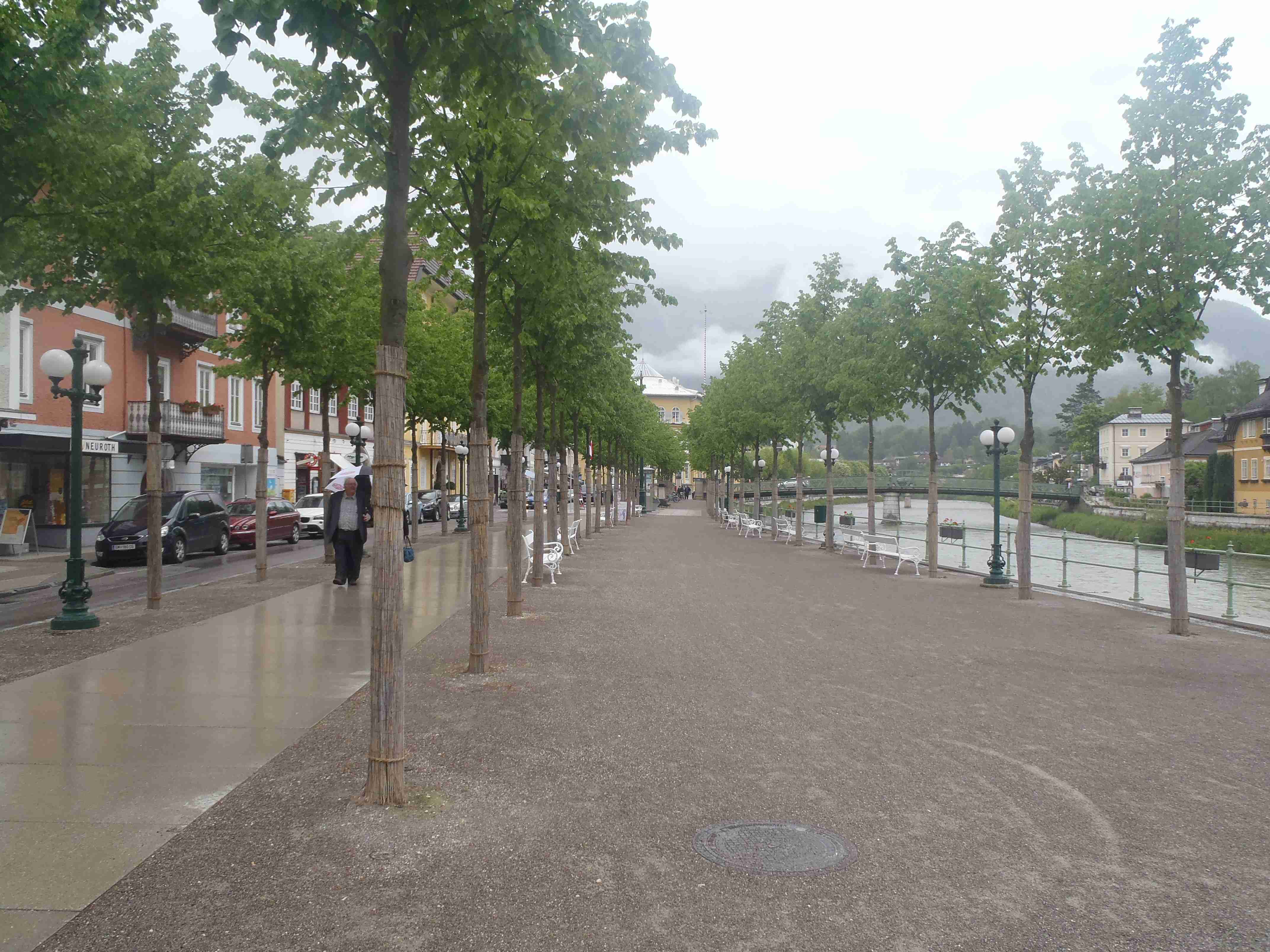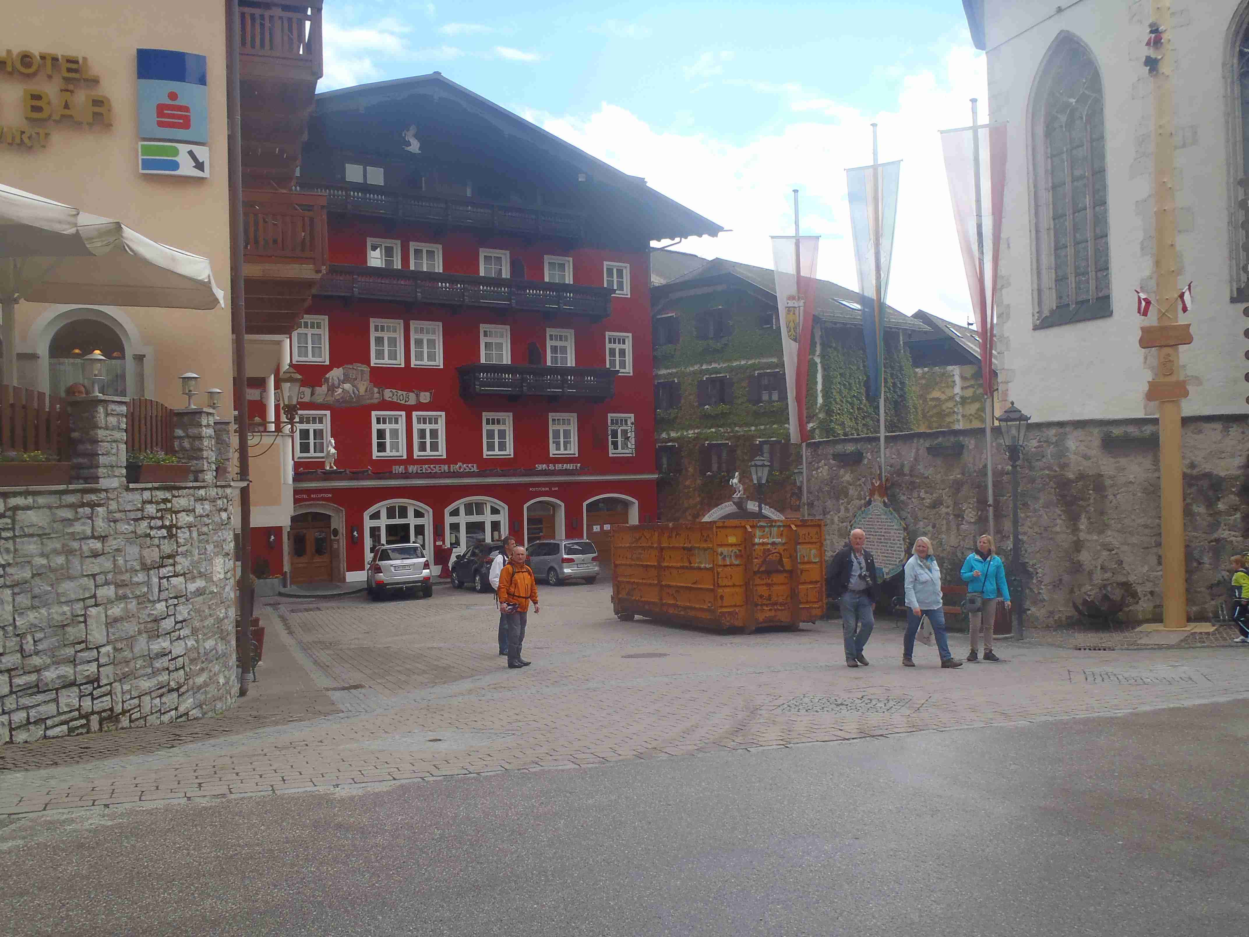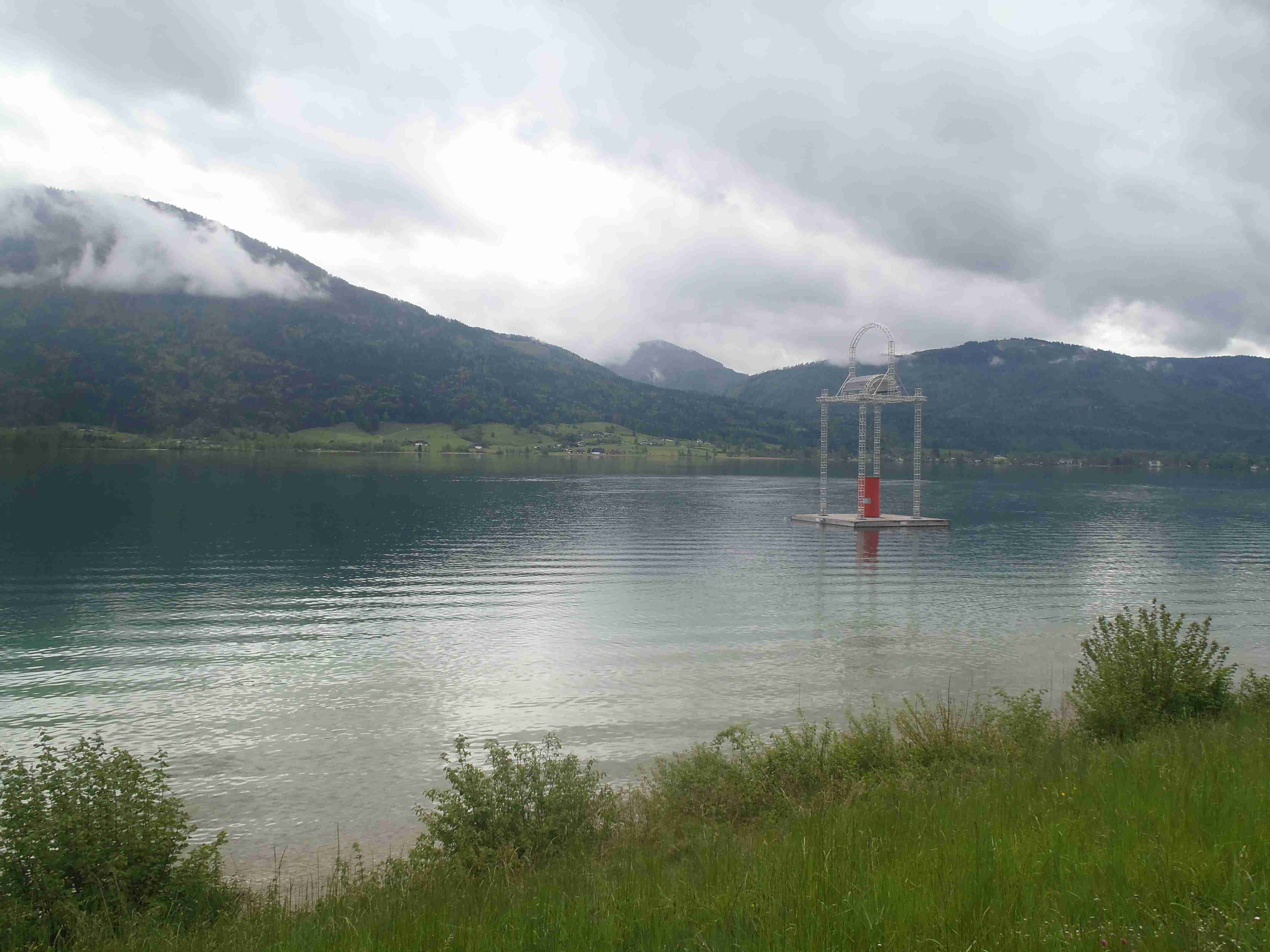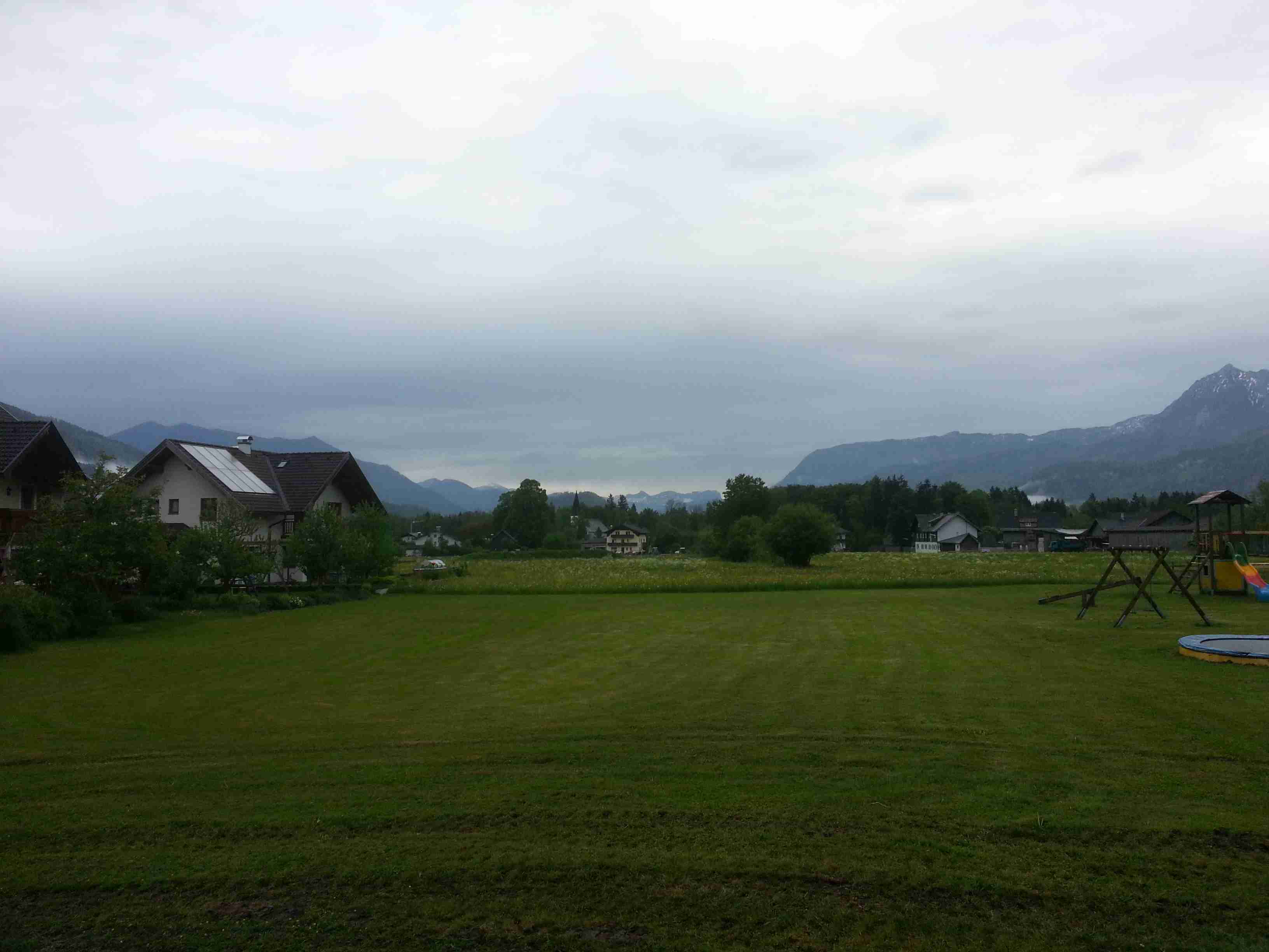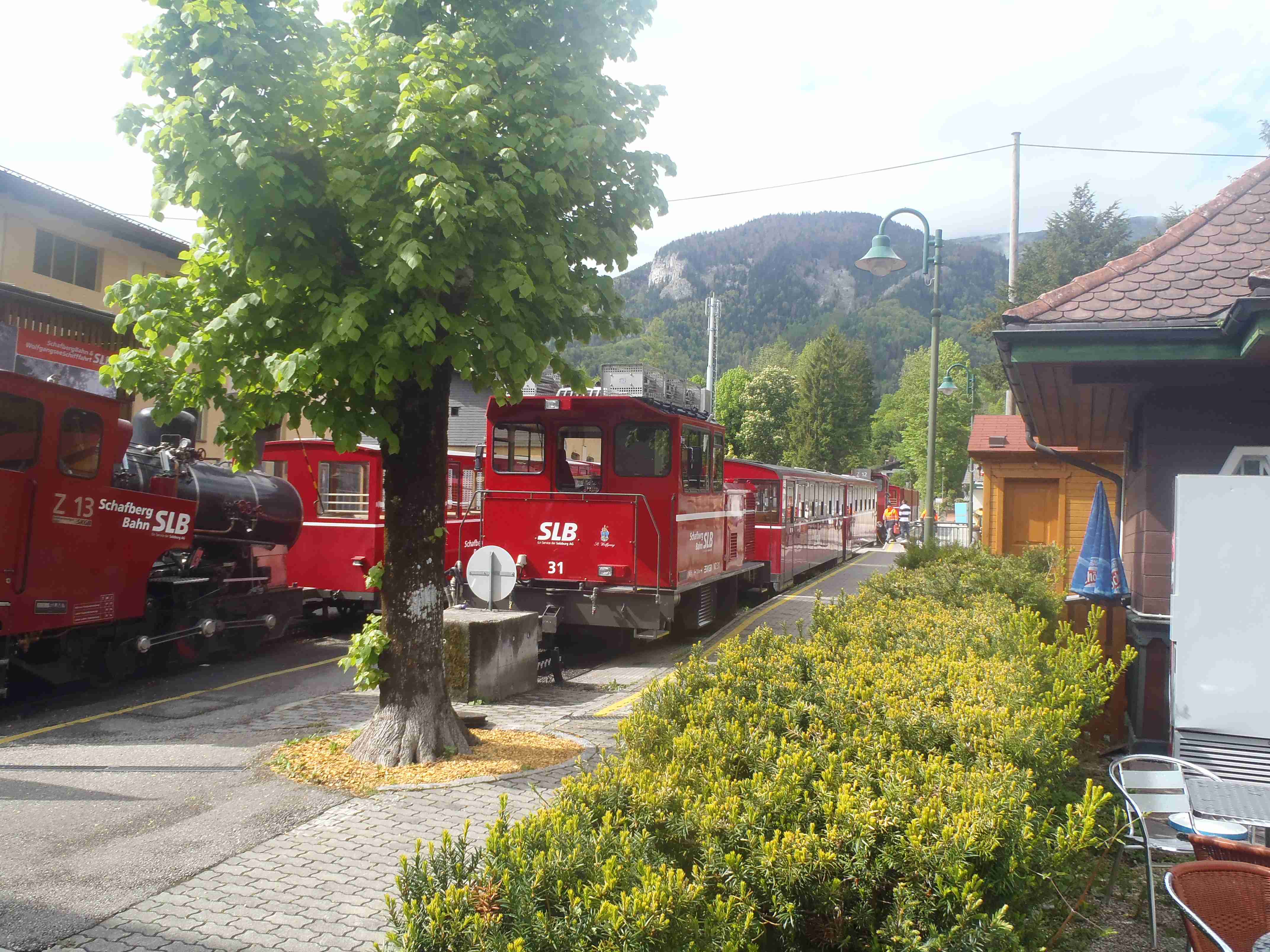 Snídaně v 8:00, vydatná, velký výběr salámů, v 9:00 briefing, venku bylo právě po dešti. Lubor prohodil denní program s ohledem na počasí a královskou etapu přesunul na sobotu, kdy by mělo být nejlepší počasí. Na pátek jsme si mohli naplánovat okružní cestu kolem jezera a okolí dle chutě a nálady, dostalo se nám několik variant. My jsme si vybrali cestu do Bad Ischl a odtud do St. Wolfgang. Vyrazili jsme cca v 10:45 po cyklostezce kolem jezera směrem na Strobl. Cestou jsem Ivě opravoval padající zadní blatník, kde však byla stržená matka a tak se oprava příliš nevydařila a to se jí stalo osudným – kousek před Stroblem se podívala na zadní kolo a přehlédla ocelovou závoru přes cestu. Já jel ve předu, strašná rána a když jsem se otočil, Iva ležela i s kolem na zemi. Oddychl jsem si, když se začala hýbat, po chvilce se i zvedla. Naštěstí si nic nezlomila, pouze nějaké naraženiny a trochu roztržené kalhoty. Ještě, že tak. Stroblem jsme projeli a pokračovali stále dál na východ po stezce podél silnice na jedné straně a řeky Ischl na druhé. Po projetí Aigenu zhruba na úrovni obce Ramsau cyklostezka podjede hlavní silnici, odkloní se od ní a začne stoupat směrem k Lindau. Nahoře se jede pár kilometrů mírně zvlněnou vesnickou krajinou se spoustou statků, cedule Bad Ischl je ještě na kopci, ale pak se sjíždí krátký prudký sjezd dolu do města k řece. Podél řeky promenádou jsme dojeli do centra, kde se mohutně opravuje před nastávající letní sezonou, a pěší zónou jsme došli na Sparkasseplatz, kde jsme si pod slunečníkem dali kafe a pivo. Musím podotknout, že bylo podstatně chladněji, než včera, a většinu cesty i mrholilo, ale pořád to ještě šlo. Po občerstvení jsme se v cca 13:00 vydali zpět, prudký úsek jsme statečně vytlačili, po kopečkách se pěkně pohoupali a po sjezdu zpět do Ramsau a podjetí silnice jsme uhnuli z předchozí trasy, sjeli jsme blíže k řece a snažili se najít nějaký most, abychom se dostali na druhou stranu a našli cyklostezku do St. Wolfgangu. Po jednom zeptání jsme most opravdu našli, posléze i cyklostezku a pohodovou jízdou mírně zvlněnou krajinou jsme projeli obce Windhag a Weinbach, severně minuli Strobl a u obce Schwarzenbach jsme se ocitli opět na břehu jezera Wolfgangsee. Cyklostezkou na břehu jezera jsme projeli další obcí s názvem Au a krátce po 15. hodině jsme dojeli do St. Wolfgang. Udělali jsme pár fotek, sesedli z kol a na chvíli je odstavili, abychom si prohlédli městečko. Prošli jsme středem a poté sjeli ke břehu k přístavišti lodí. Iva si poseděla na lavičce, já mezitím zjišťoval odjezdy lodí, abychom se přepravili na druhou stranu, protože náš hotel byl přímo naproti přes vodu. Loď jsem zjistil, ale pak jsem si uvědomil, že musí jezdit ještě i pouhý přívoz mimo parníku jezdícího po celém jezeru - a opravdu, kousek za přístavištěm ukrytý v křoví byl sjezd k přívozu, který „premával“ na znamení do 17 hodin. Po cestě k Ivě hovící si na lavičce jsem si nafotil mašinky zubačky Schaftbergbahn, která vyváží lidi z nějakých 550 m n. m. do cca 1750m n. m. na horu Schaftberg. Jelikož byl ještě čas, vrátil jsem se kousek do centra a v obchodě koupil pro každého láhev vína, abychom ho nekonzumovali v restauraci, kde bylo poměrně drahé. Kolem půl páté jsem vyzvednul Ivu na nábřeží a dojeli jsme k přívozu, kde již čekalo několik našich kolegů. Za 3,5 Eura za osobu jsme se přepravili na druhou stranu a po pár set metrech jsme dojeli krátce před sedmnáctou hodinou zpět do hotelu. Najeto pohodových 35 km, cestou z Bad Ischl již skoro vůbec nepršelo. Sprchování bylo, co se týče teplé vody, bez problémů, avšak voda ze sprchy dotekla tentokrát až na koberec ložnice. Po sprchování samozřejmě následoval rituál vytírání a ždímaní ručníku. Na večeři jsme vyrazili po 19. hodině, dal jsem si klasický Wienerschnitzel s bramborem a salátem, Iva si vybrala nudle a jako klasicky její volba nevyšla – bylo toho hodně, ale bez chuti a bez zápachu a tak jsem jí dal alespoň kousek řízku. Již někdy po deváté jsme šli na pokoj, přeci jenom nás čekala zítra královská etapa.