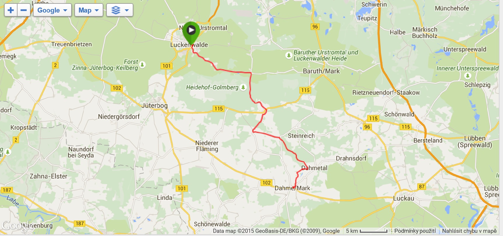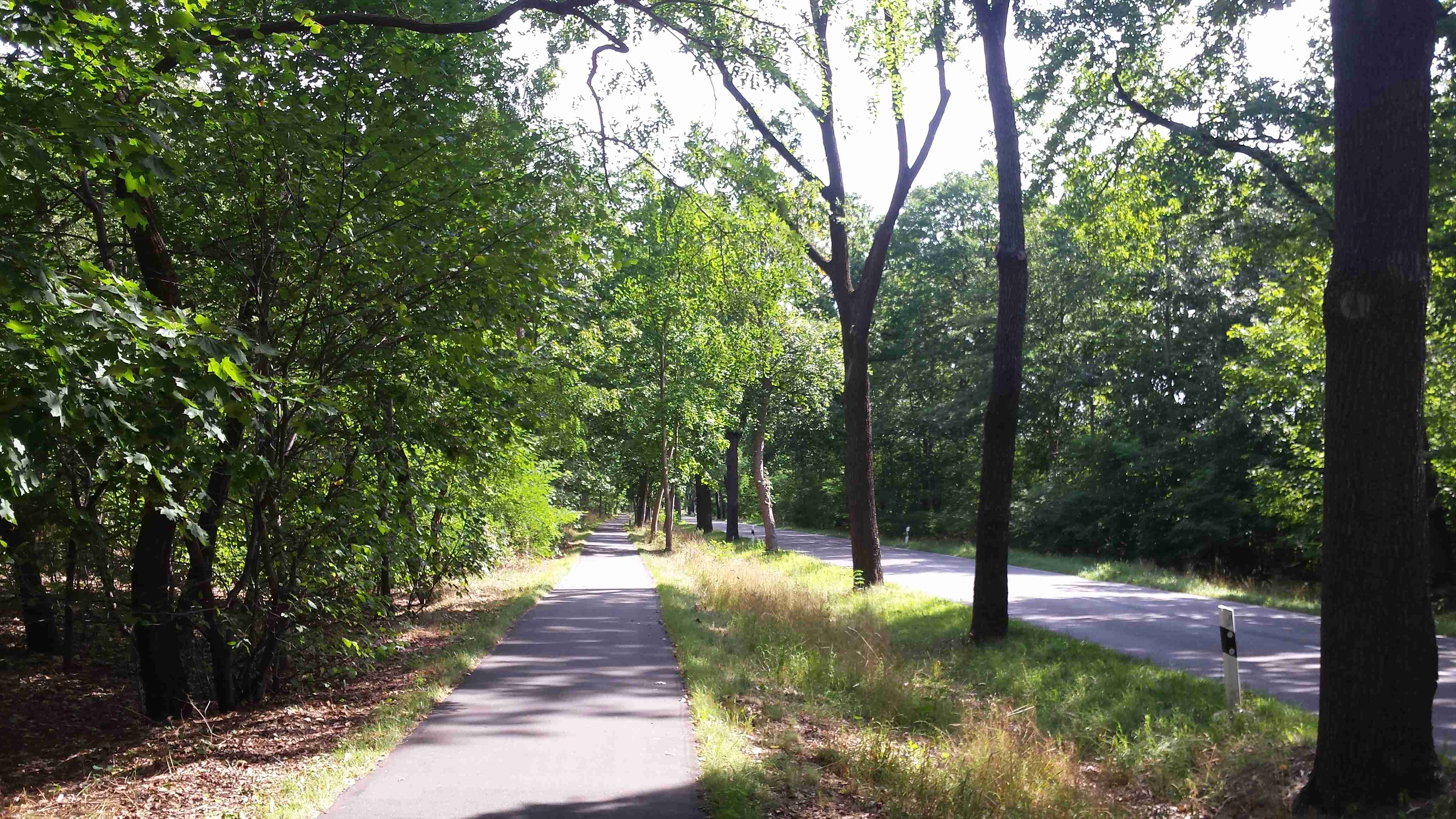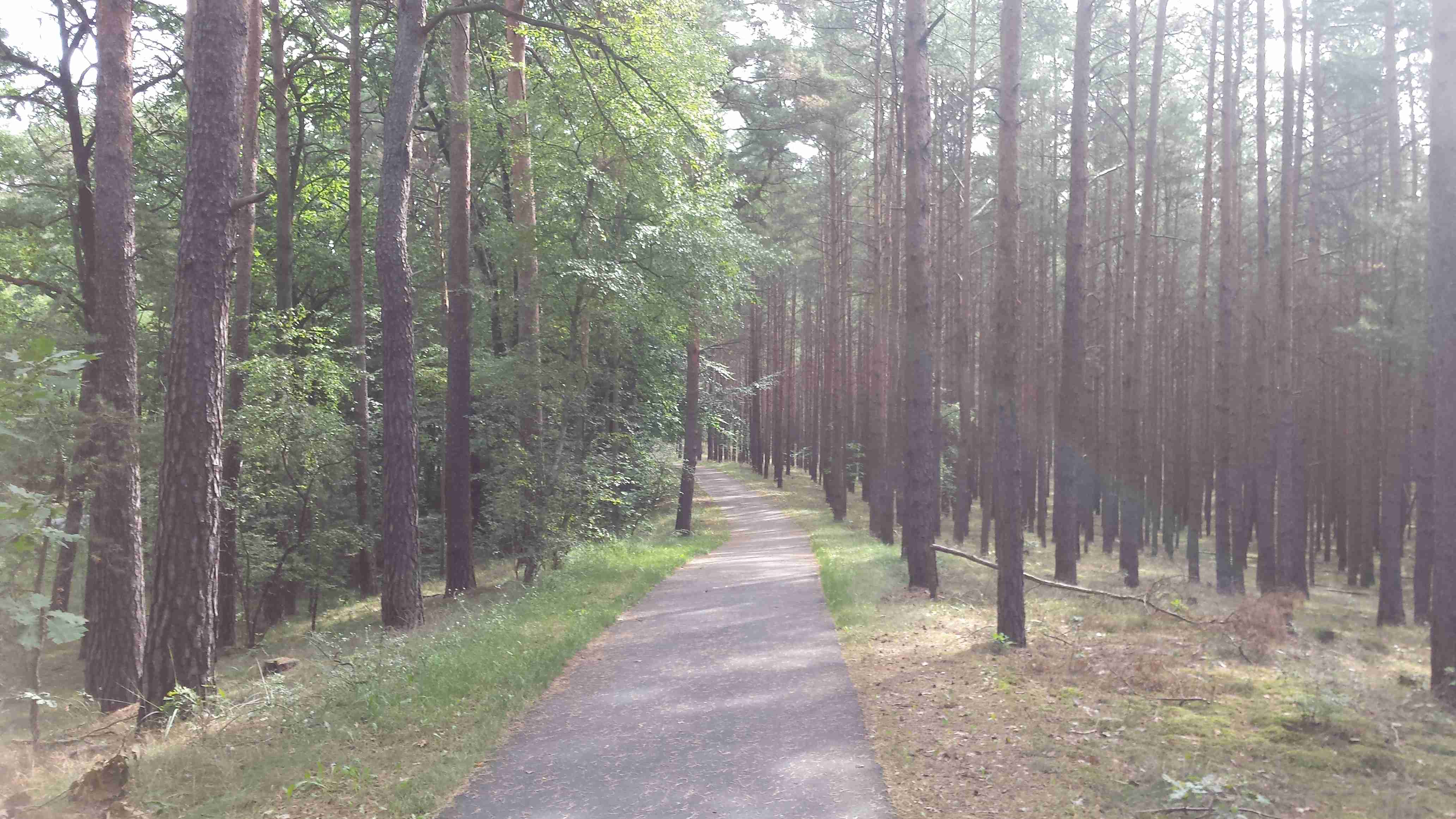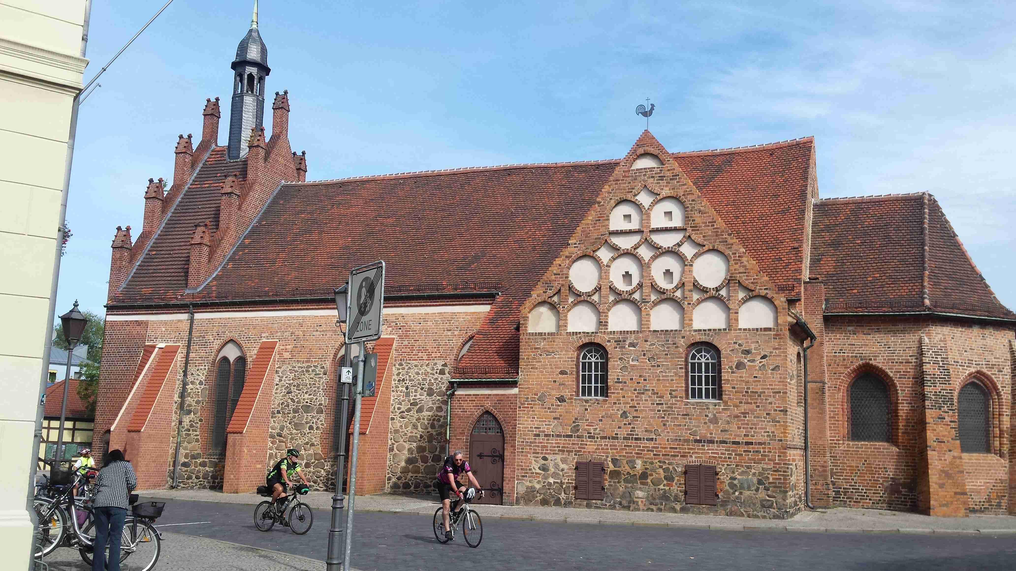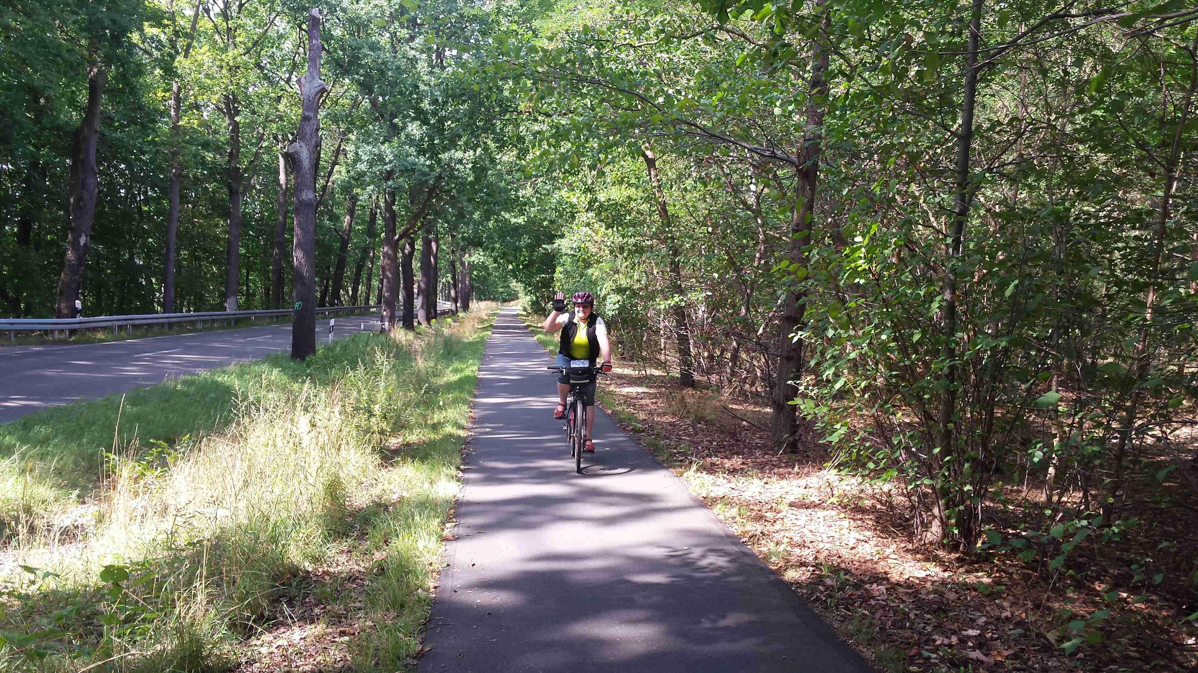 Poslední den jsme strávili opět v oblasti Fläming, autobus nás do cca 60 km vzdáleného Luckenwalde vezl něco přes hodinu. K nádraží, kde jsme měli vystupovat, jsme se kvůli rozkopané silnici nedostali, a tak jsme vystoupili o něco dříve a zhruba v půl jedenácté jsme vyráželi na kolo. Nejprve jsme si nafotili centrum a poté jsme zpočátku po S1 a poté po S2 vyjeli z města a kousek za městem jsme se napojili na nám dobře známý okruh RK1 (současně RK5 - viz. mapa Flaeming Skate) Po krásné asfaltce lesem jsme to metelili tak rychle, že jsme v Holbecku zapomněli odbočit doprava, což jsme zjistili až ve Stülpe. Zatočili jsme tedy tady, naštěstí ta zajížďka byl minimální a hned za obcí jsme opět narazili na tu správnou stezku. Projížděli jsme bývalým vojenským prostorem sovětské armády a až do obce Liessen stezka stoupala lesem, poté krátké klesání a kousek prudce do kopce a byli jsme v obci Petkus, kde stál náš autobus coby občerstvovací stanice. Dali jsme si pivo, chvíli si odpočinuli a pokračovali dál. V obci Wahlsdorf jsme opustili okruhovou stezku RK1 a odbočili doleva na na spojku S13, která nás přes Buckow dovedla až do Prensdorfu, kde jsme zatočili doprava, chvíli poseděli ve stínu pod rozložitým stromem a někteří navštívili dřevěný kostelík. Do cíle to bylo již jenom pár kilometrů, autobus čekal v Dahme na stejném místě jako v neděli. Měli jsme dost času, tak jsme zajeli ještě jednou do centra a udělali pár fotek. Poté již nakládání kol dle pozdějšího výstupu, naše kola, protože budeme vystupovat jako první, se nakládala na konec. Najeto necelých 48 km a stejně jako v předešlých dnech to byla paráda. Večer nás na hotelu překvapili večeří formou švédského stolu, jídlo bylo vynikající, tentokrát soudruzi z NDR nikde neudělali chybu.