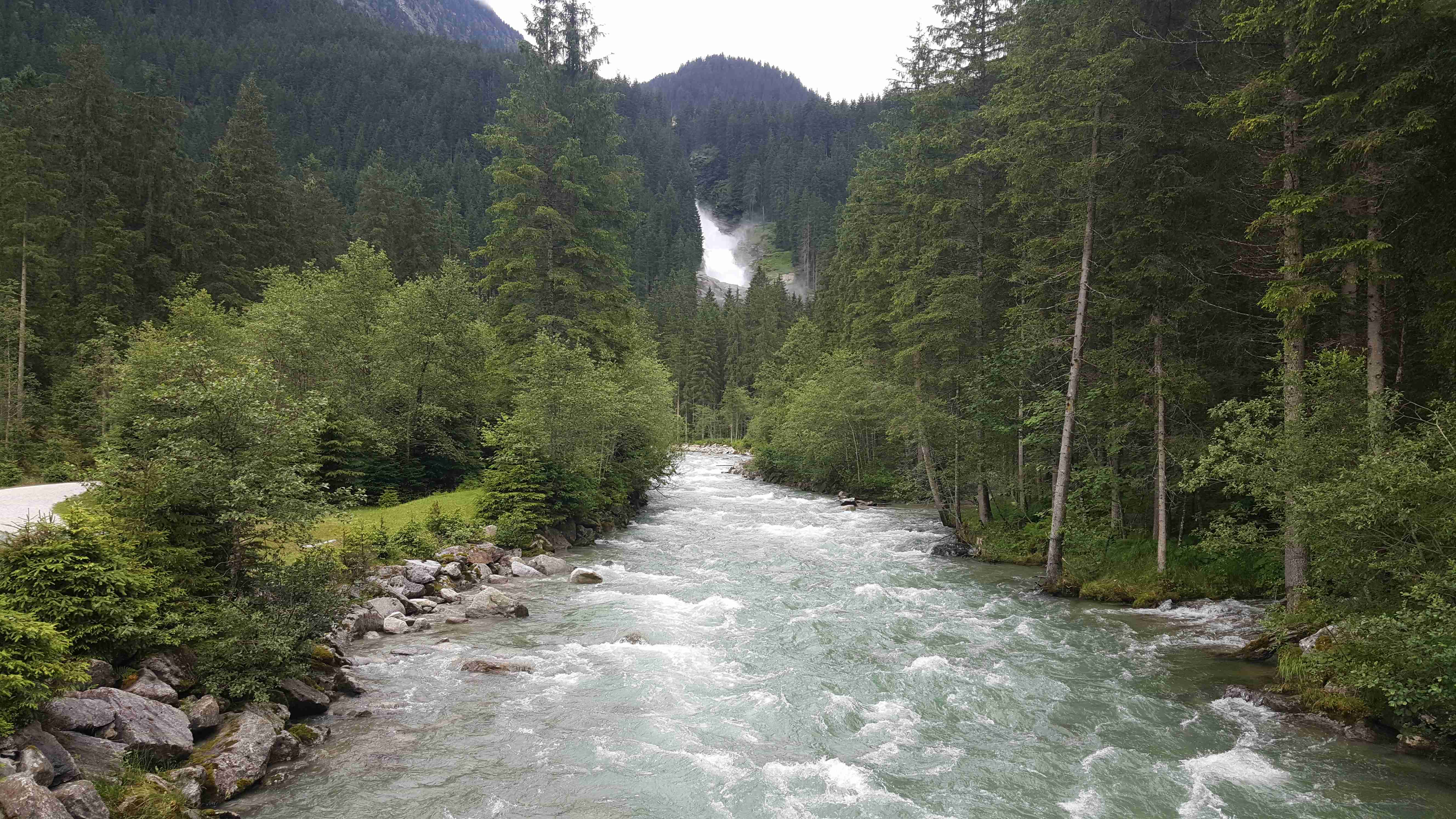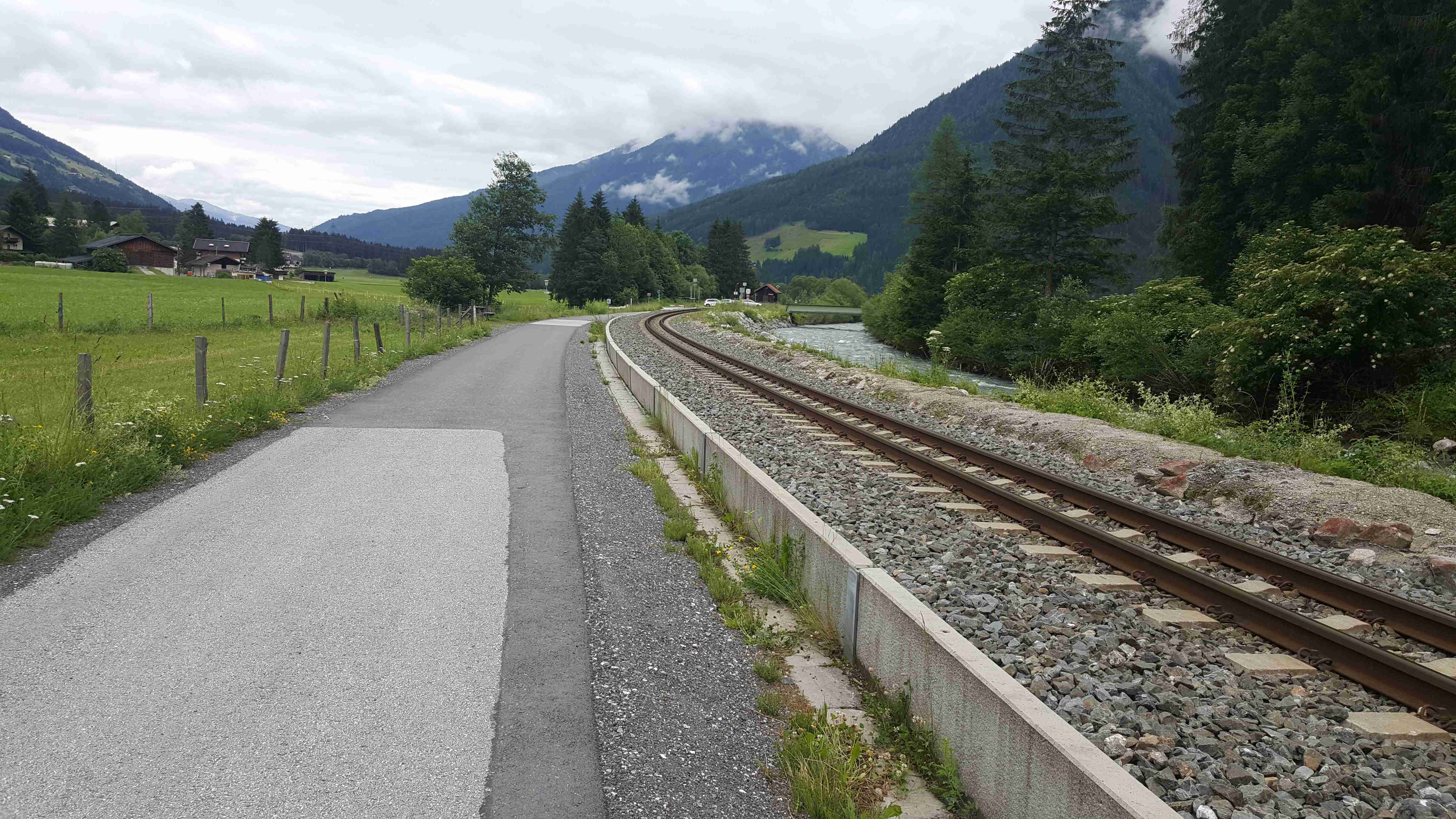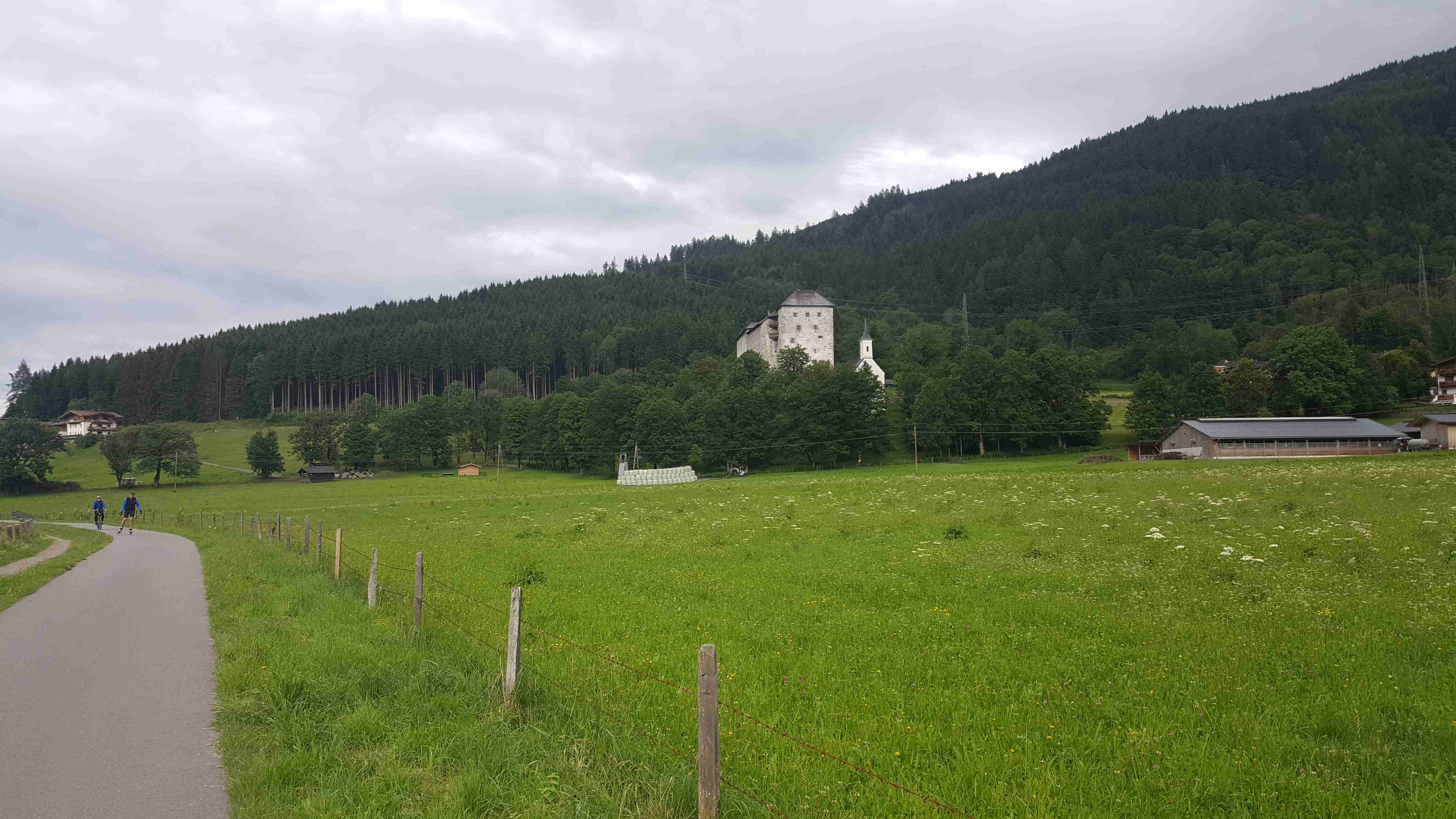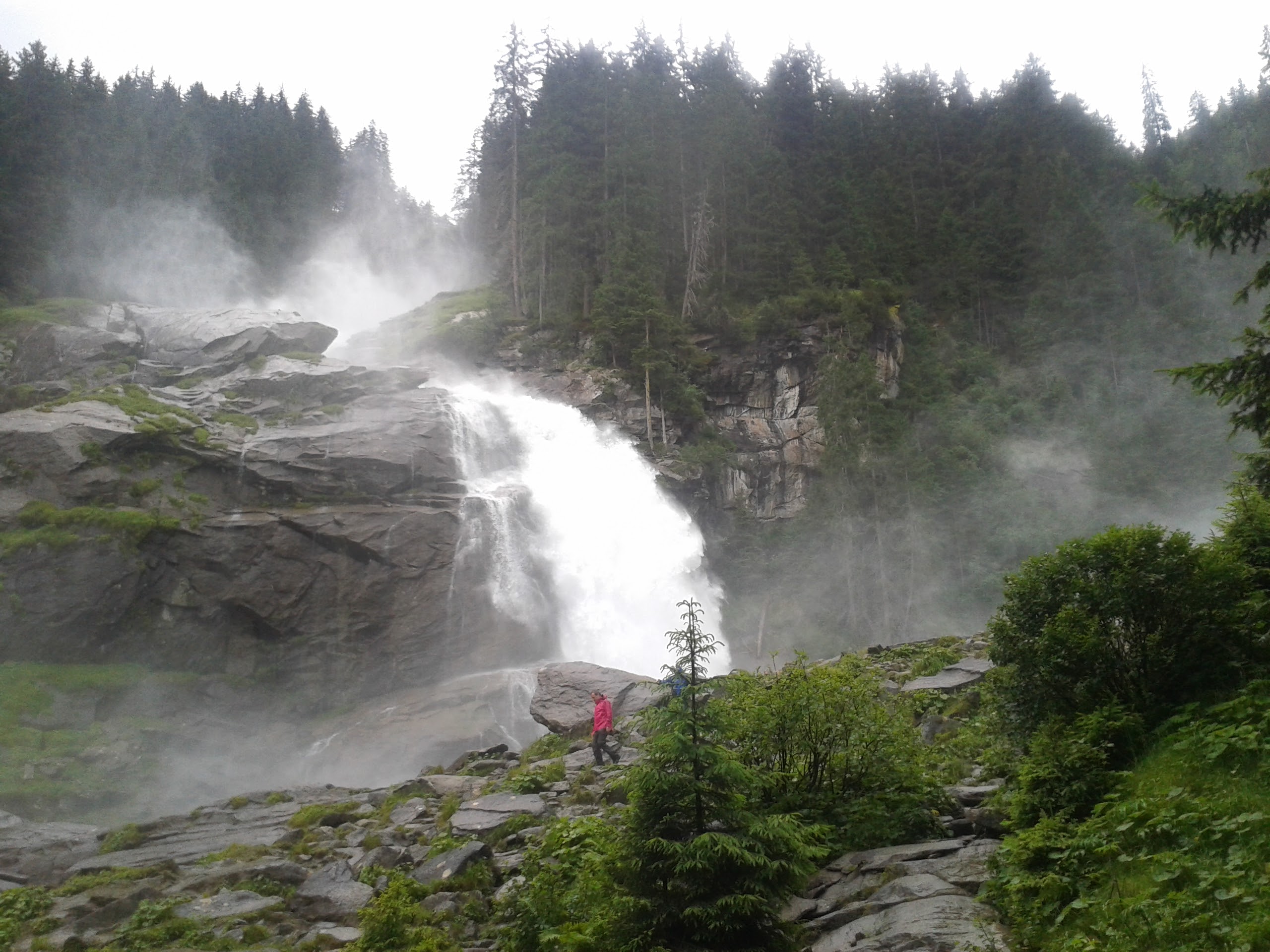 Po snídani jsme se naložili do busu a odjeli směr Krimmlské vodopády. Cestou jsme se ještě zastavili v našem následujícím hotelu, kde Lubor vyzvedl tzv. Sommerkarty, které nás opravňovaly ke spoustě volných vstupů na lanovky, do muzeí, apod. Na parkovišti u vodopádů jsme pak vyložili kola, Lubor udělal stručný briefing a my se vydali na první část našeho putování. Sjeli jsme ke vstupu ke Krimmlským vodopádům, kde jsme hned využili naše Sommerkarty a zdarma jsme mohli jít dál. Nafotili jsme si pouze nejnižší místo vodopádů a vydali se na začátek Tauernské cyklostezky, nacházející se pouze několik set metrů od vodopádu. Ještě je třeba připomenout, že Krimmlské vodopády jsme navštívili a vystoupali celou cestu až nahoru v roce 2002 v rámci poznávacího zájezdu To nejlepší z Alp s dnes již neexistující SK Svobodná cesta z České Lípy. Ale zpátky na trať. Zpočátku cyklostezka klesá lesem podél říčky Krimmler Ache, do které vtékají Krimmleské vodopády. Po vyjetí z lesa se pak říčka vlévá do řeky Salzach, podél které jsme se pohybovali celý zbytek zájezdu. Stezka vede údolím většinou podél řeky, občas se od ní odkloní, aby se po několika kilometrech k ní vrátila. Po 35 km jsme zastavili v městečku Mittersill, kde stál autobus a my jsme si dali alespoň pivo a tyčinku. Po půlhodince odpočinku jsme vyrazili na druhou polovinu. Vždy, když se cyklostezka odklonila od řeky Salzach, tak následovalo stoupání do nějaké obce. Jedna z výjimek byl známý Kaprun, který leží na rovině a kam jsme dojeli asi po 62 km. Za Kaprunem se Tauernská cyklostezka dělí na dvě větve – jedna se stáčí na sever na Zell am See, druhá pokračuje dál na východ podél řeky Salzach a na sever se stáčí až u St. Johan. Obě větve se setkají před Salzburgem a Tauernská cyklostezka pak pokračuje nejprve podél řeky Salzach a posléze podél Innu, když se do něho Salzach vlije, až do Passau, kde se Inn vlévá do Dunaje a cyklostezka končí. Chvíli jsem ladil mapy a náš další postup a nakonec jsem zvolil cestu podél řeky až téměř do Brucku a tam jsme odbočili na sever a po cyklostezce jsme dojeli až k našemu hotelu v Schüttdorfu. Najeto 70 km v podmračeném počasí ideálním pro cyklistiku, ale horším pro fotografování.
