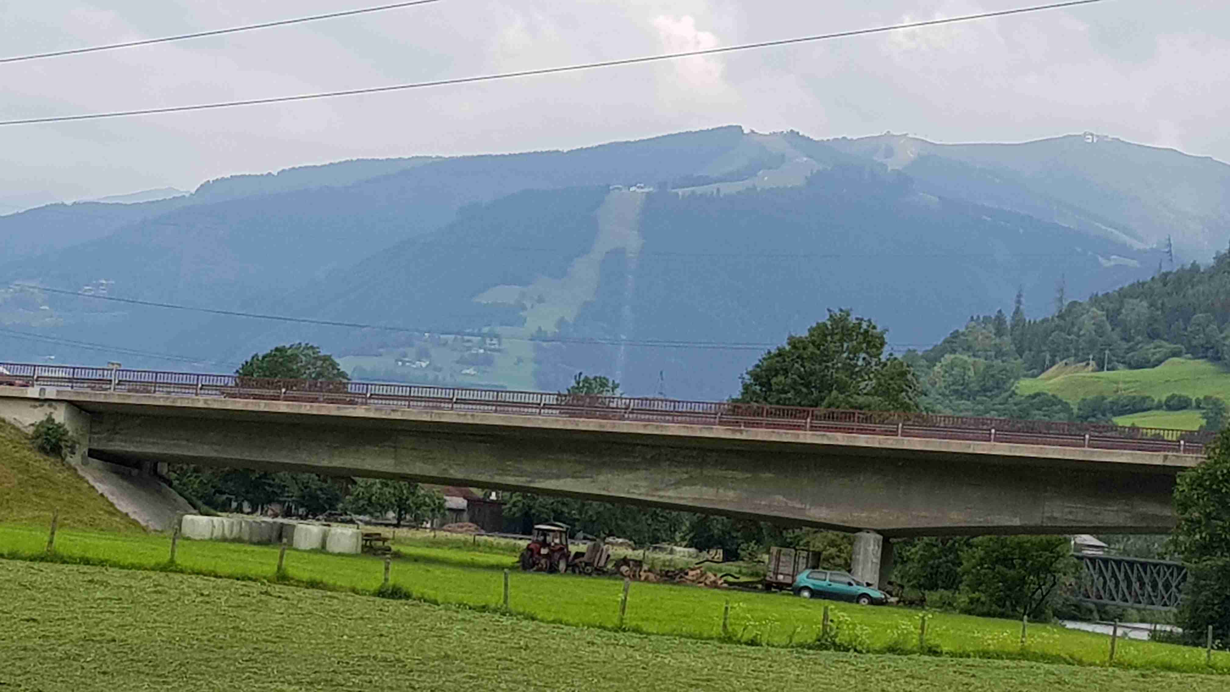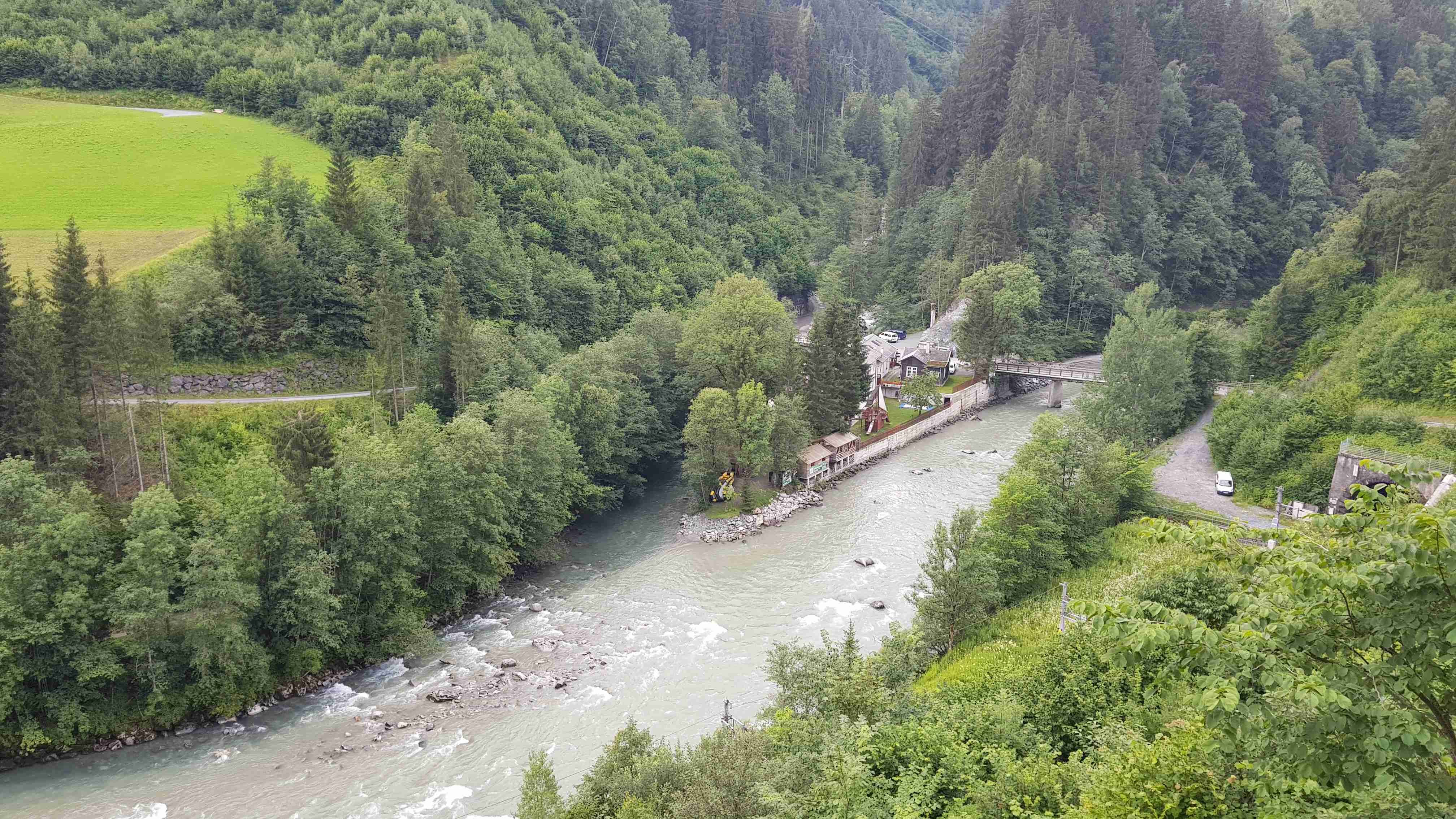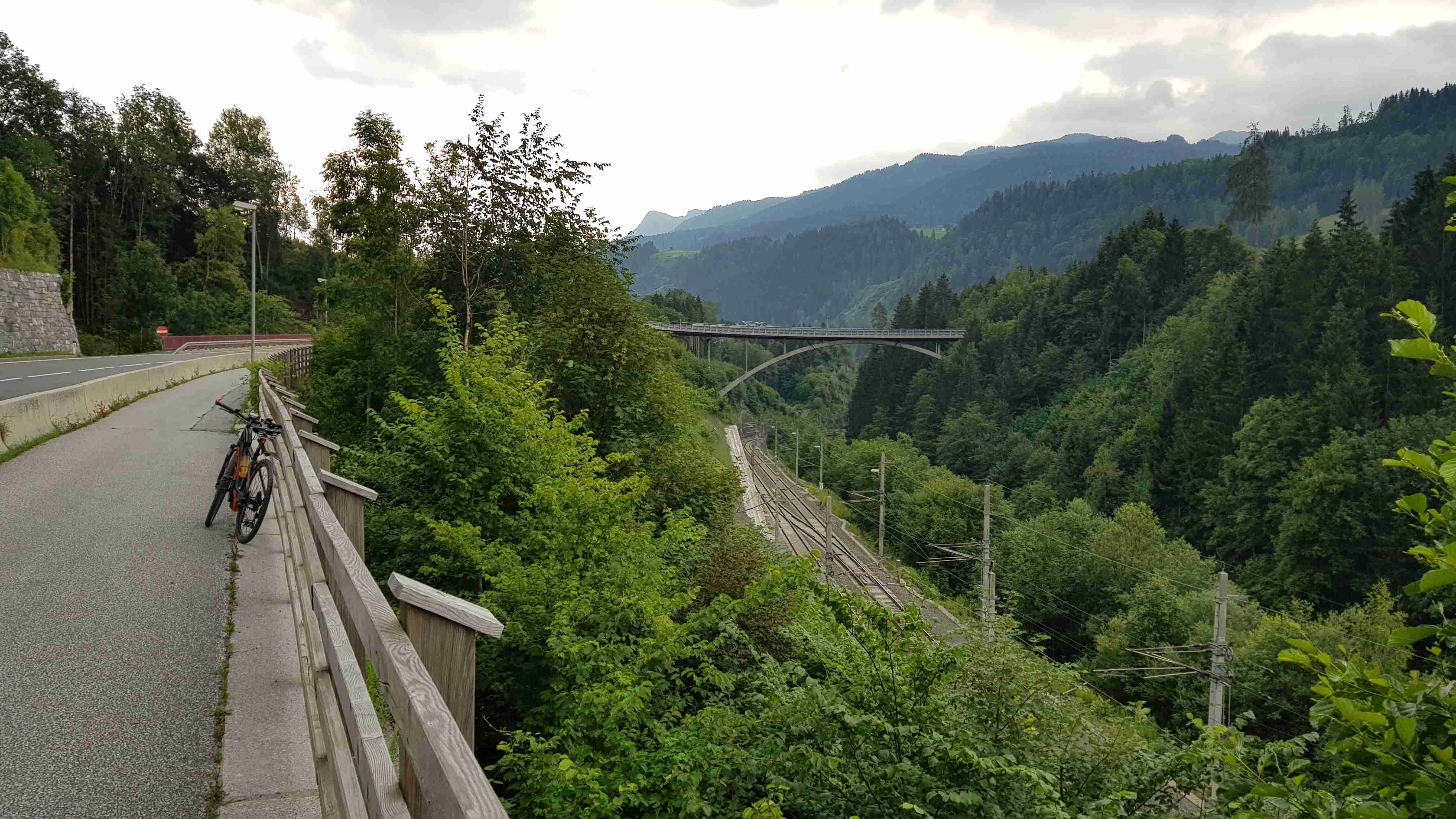 Ráno jsme ukončili náš pobyt v Zell am See, naložili jsme vše do busu a na kolech vyrazili na další etapu. Od penzionu jsme dojeli do Brucku a odtud pořád podél řeky Salzach ve směru toku. Za Taxenbachem jsem odbočil z cyklostezky na soutěsku Kitzlochklamm, prudce dolu, prudce nahoru ke vchodu do soutězky, kam jsem stejně nešel, a pak znovu naopak. Dojel jsem do Lendu, kousek za ním stál náš autobus, tak jsem se v něm nasvačil. Potom prudce nahoru do kopců k elektrárenské nádrži a znovu prudce dolů do Schwarzachu. Pak už jenom podél řeky přes Bischofshofen do Imlau, které je na dohled hradu Werfen, známého z filmu Kam orli nelétají. Cca 66 km, pršet začalo až po mém dojezdu. Ubytování jako minule v penzionu u silnice, .