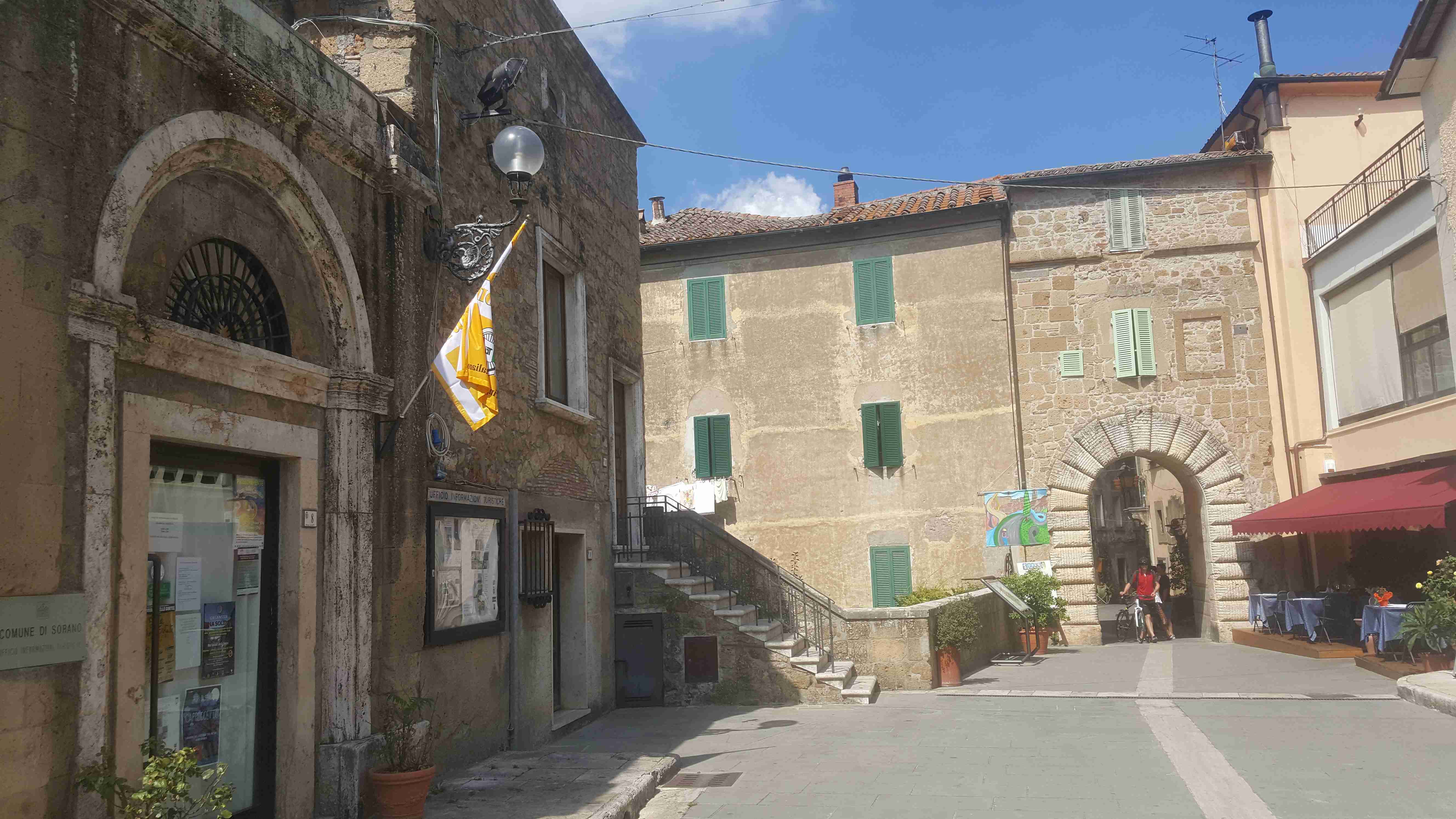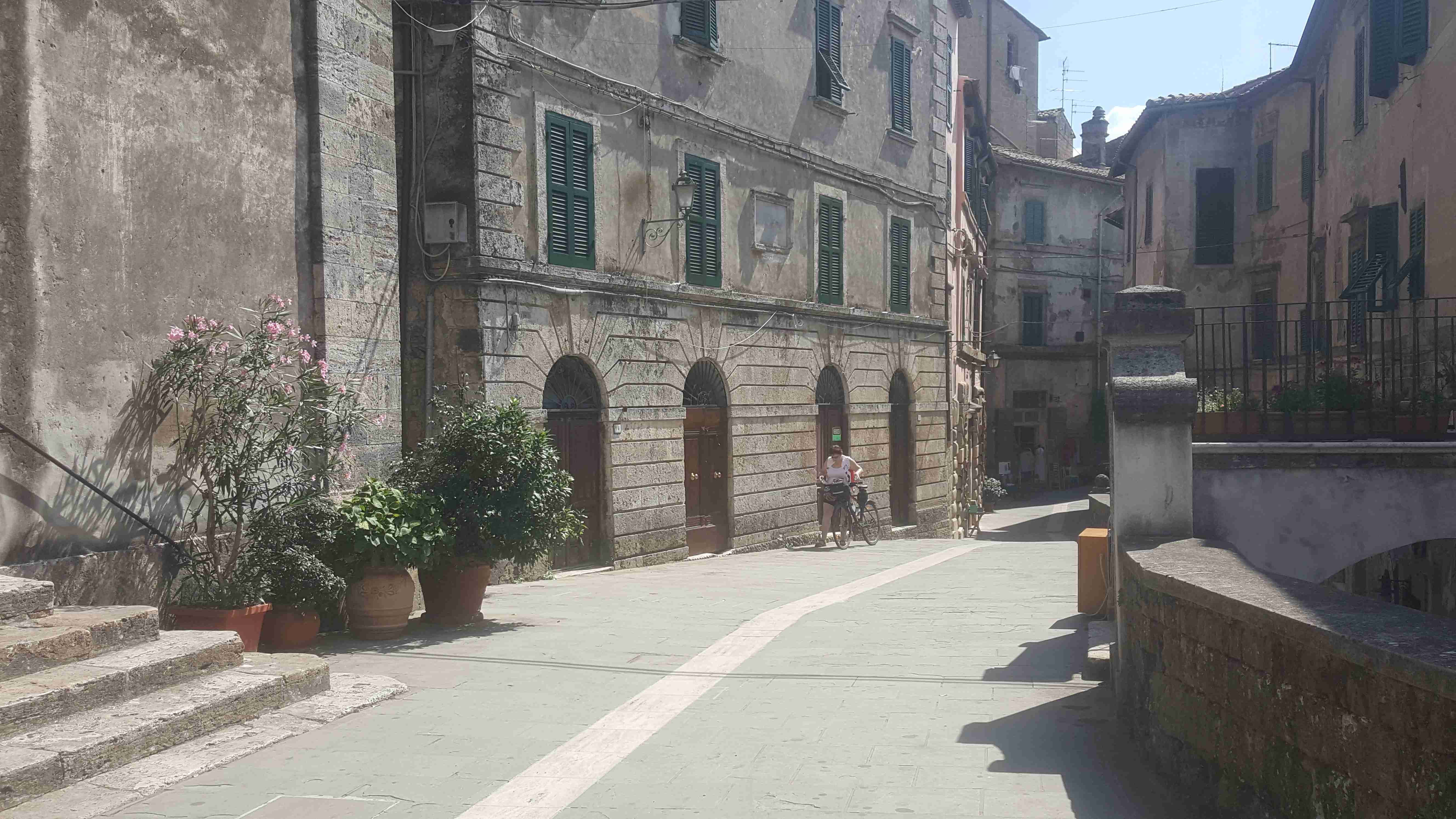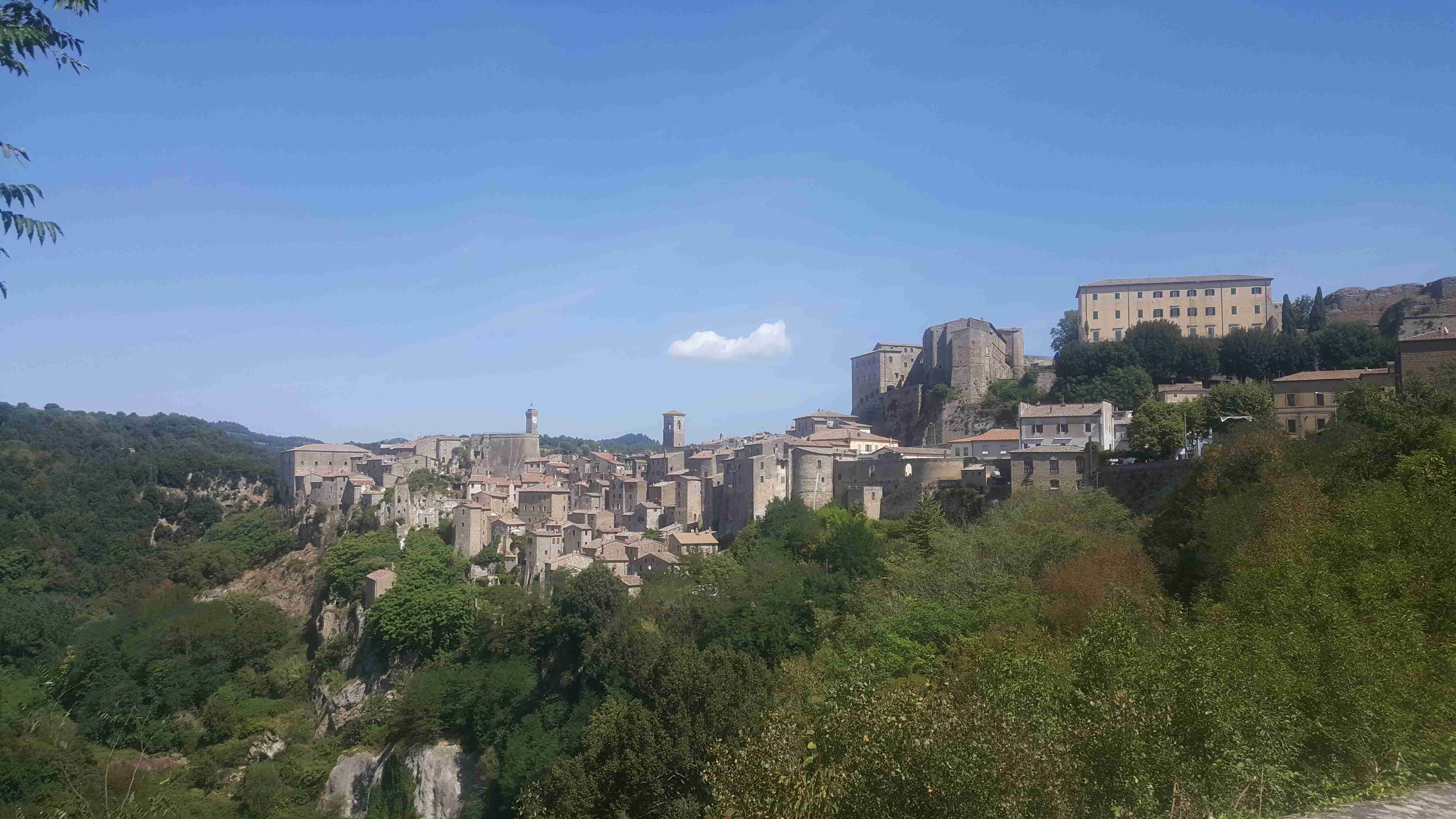 Dnešní etapa nesla název Etruskové, neboť hlavním cílem byla návštěva dvou etruských měst – Sorana a Pitigliana, obě leží na kopci a dostat se do nich bylo pro nás v tom vedru značně vysilující. Vyjížděli jsme na kolech přímo od hotelu a prvních cca 15 km přes Piancastagnaio a Saragiolo bylo spíše do kopce. První zastávka byla v Selveně, kde jsme si dali s brněnskými přáteli malé občerstvení. To jsme již klesali, ale kousek za Selvenou nás čekal další cca 2 km kopec. Dalších zhruba 10 km jsme spíše klesali, ale Sorano leží na kopci, takže znovu makačka v poledním žáru. Sorano jsme si prošli, v hospůdce v průchodu jsme si dali pivo a poté jsme pokračovali – ze Sorana opět dolů, pak dalších 5 km do kopce a opět 5 km z kopce pod Pitigliano, do kterého byl opět kopec jako kráva. Kola jsme odložili na začátku historického centra a šli jsme se kousek projít, koupili jsme si zmrzlinu, která nás však příliš neochladila. Z hradeb jsme si prohlédli zbytek naší cesty – prudký sjezd dolů k řece, po mostě a opět prudký kopec nahoru. Času již nebylo nazbyt a tak jsme raději vyrazili, aby na nás autobus nečekal. Přežili jsme to, ale byla to asi nejnáročnější toskánská etapa.