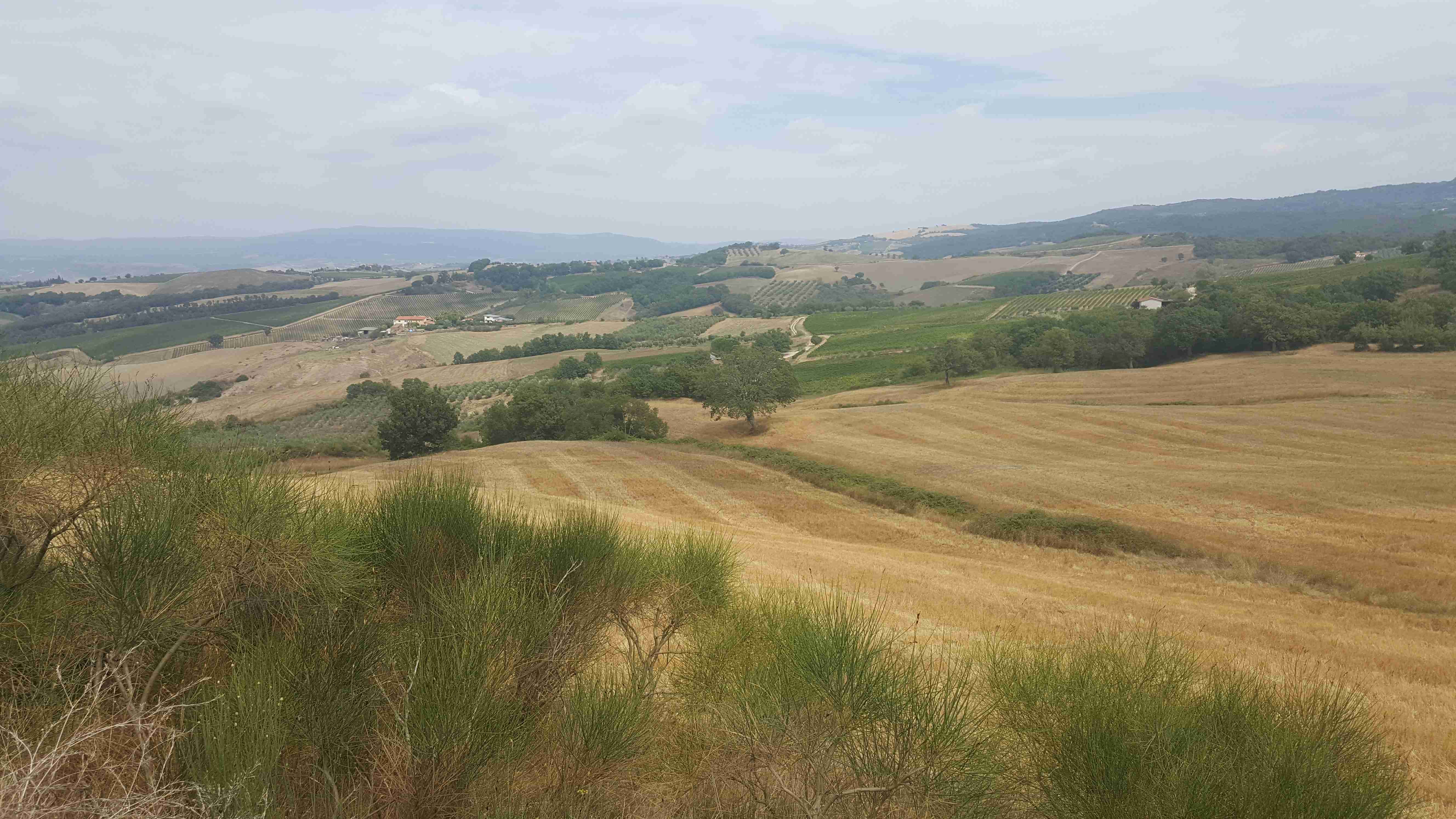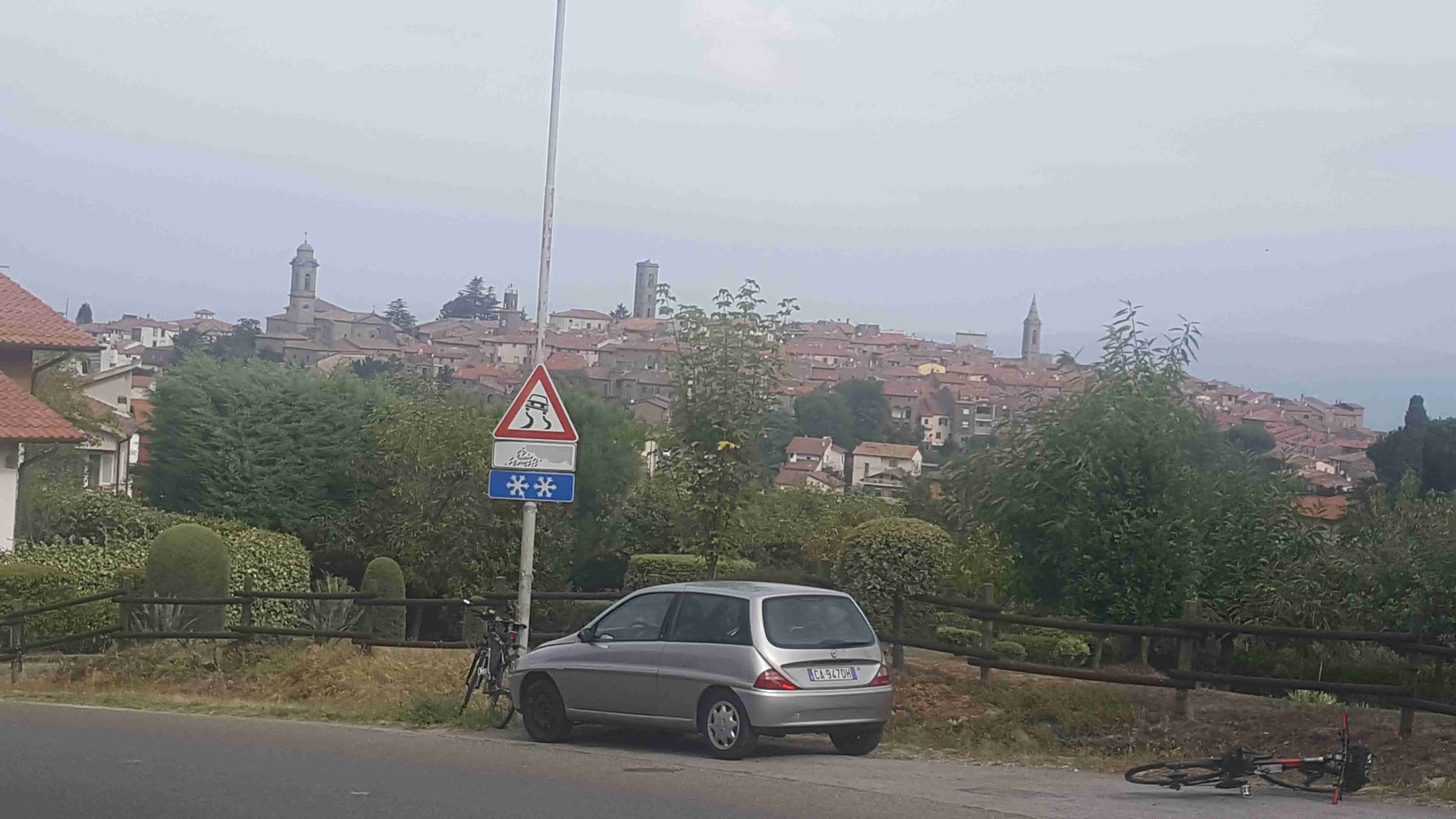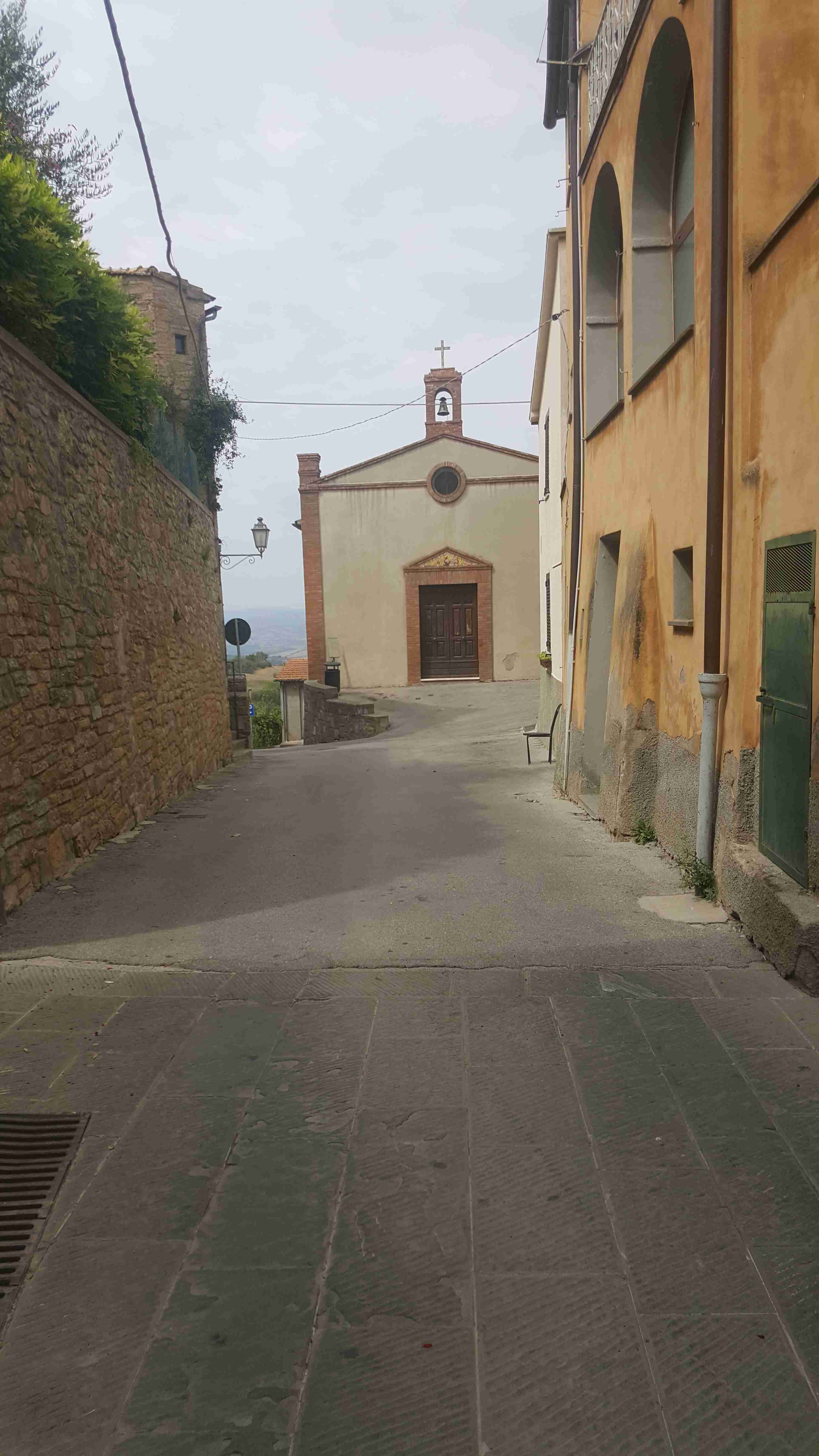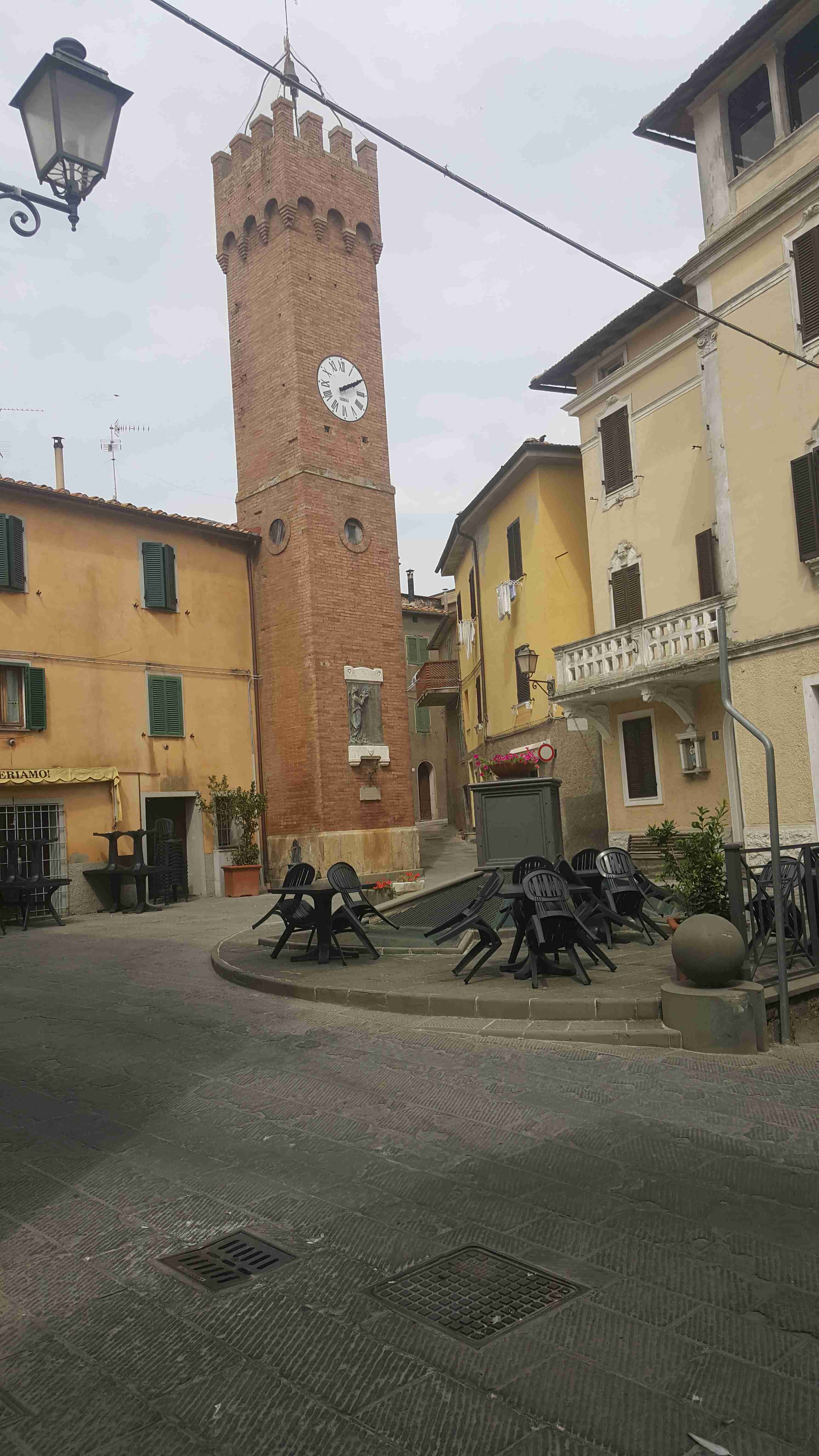 Večer trochu sprchlo, slunce již nemělo takovou sílu, ale o to větší bylo dusno. Autobus nás opět vyvezl na horu Monte Amiata, ale tentokrát nás vysadil po odbočení z hlavní asi o 200 výškových metrů níže. Byl to jakýsi bonus navíc, neboť etapa měla začínat až dole v Castel del Piano, takhle jsme do něj sjeli asi 10 km z kopců. Ve městě bylo vidět, že se tam konaly slavnosti podobné těm v Sieně - Siena je známá každoročním konáním tzv. Palia, tj. koňského dostihu, který se koná na hlavním náměstí Piazza del Campo. Soupeří spolu jezdci z jednotlivých čtvrtí města. Čtvrť, která vyhraje, má poté právo uspořádat bujarý večírek ve čtvrti, která dostih prohrála, a to bez jakýchkoliv postihů. I zde bylo ohrazené náměstí a na zemi byla vrstva písku a všude visely vlajky jednotlivých čtvrtí – kontrád. Město jsme si prošli, nafotili a jeli dál do Arcidossa, kde jsme opět zajeli do centra, udělali pár fotek a pokračovali v cestě. Stejně tak i na poslední zastávce v městečku Cinigiano. Cesta byla relativně v pohodě, pouze před Porronou byl táhlý kopec, na jehož vrcholu byla ještě odbočka do dalšího pořádného stoupáku k zámku, ale to jsem již nedal, raději jsem si snědl tyčinku a počkal na Ivu, která šla nahoru pěšky bez kola. Za Porronou jsme pak najeli na chvíli na hlavní silnici, po pár stech metrech ji opustili a přes potok a přes koleje jsme dojeli k autobusu. Po návratu na hotel jsem dal opět bazén.