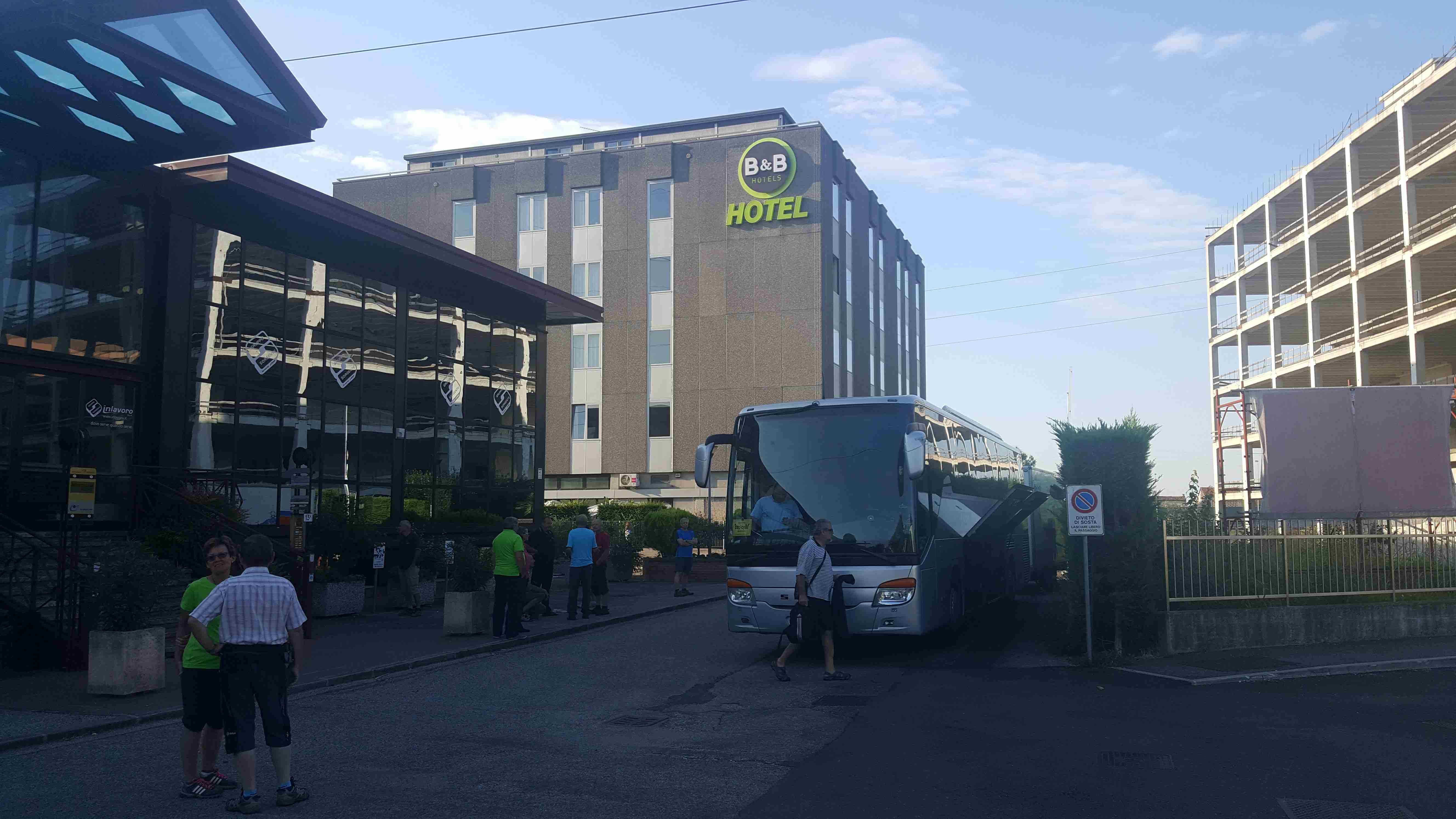 Salvatore, na jehož jihovýchodním konci jsme se ubytovali v hotelu Parco Erosa. Pokoj tentokrát nebyl žádná hitparáda, v podkroví s oknem asi 20 cm od podlahy, ale šlo jenom o přespání, přes den stejně budeme pryč. Tady je k dispozici sférická fotka. Večeře začínala tento den již v 19. 15 (zbylé dny pak vždy v 19.30), dostali jsme na uvítanou skleničku vína. Dlužno podotknout, že večeře byly 4 chodové a velice chutné, snídaně rovněž v pohodě, přesto si někteří stěžovali na malou pestrost, ale nám to bohatě stačilo. U večeří jsme seděli s manžely z Brna, kteří s námi byli vloni v Provence, jedním elektrocyklistou z Ostravy a manžely z Lovosic – pan lékárník a paní zubařka.